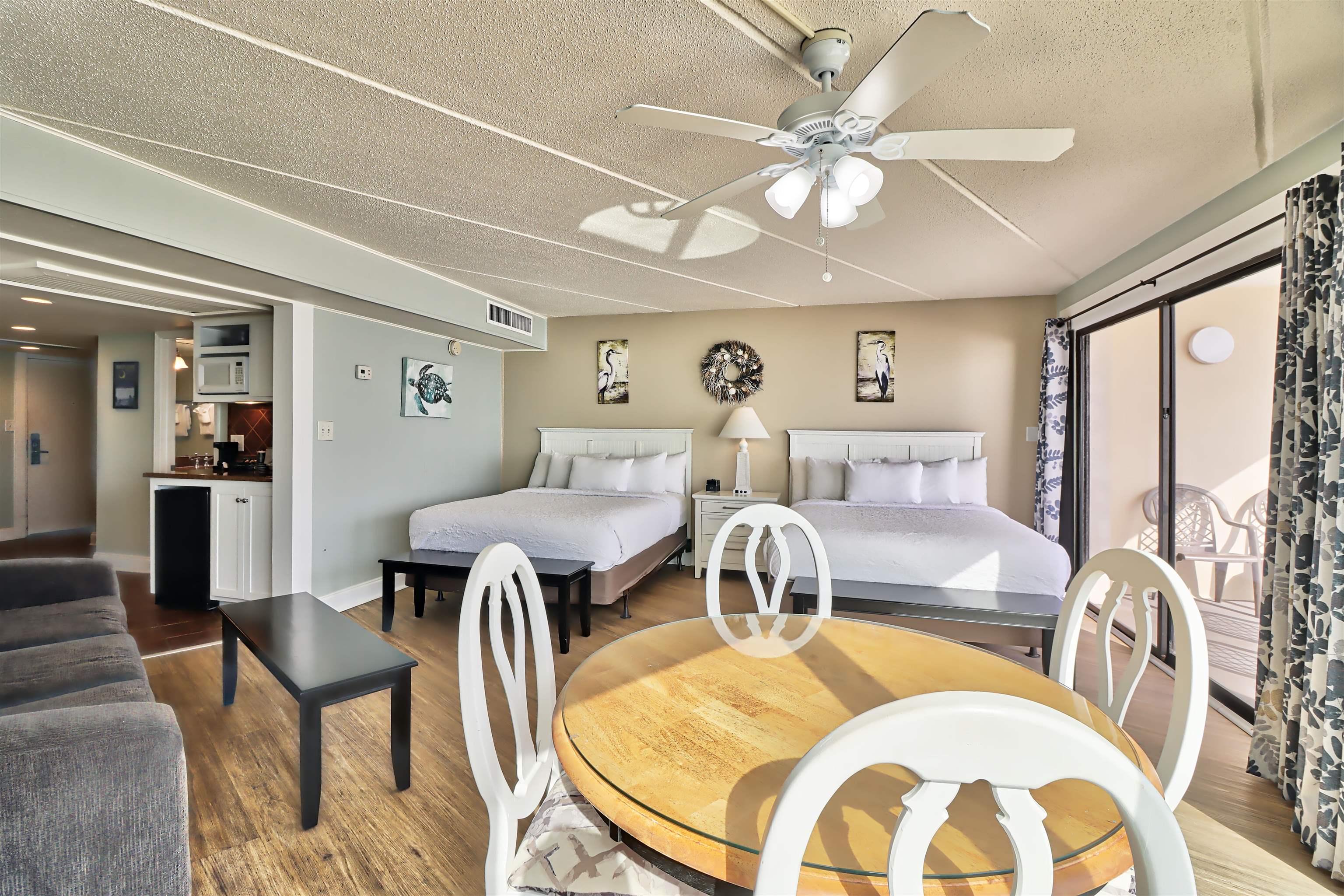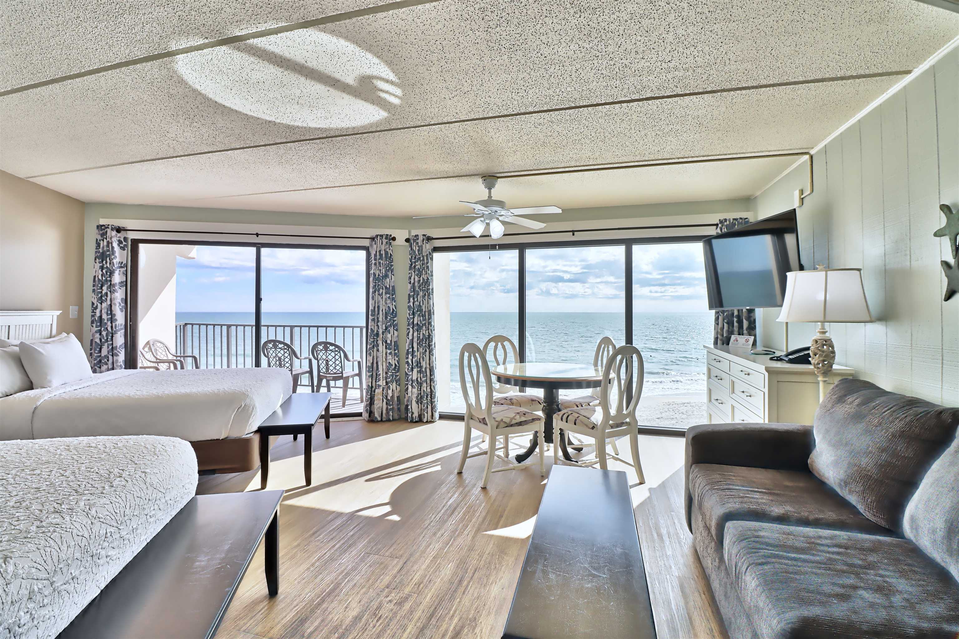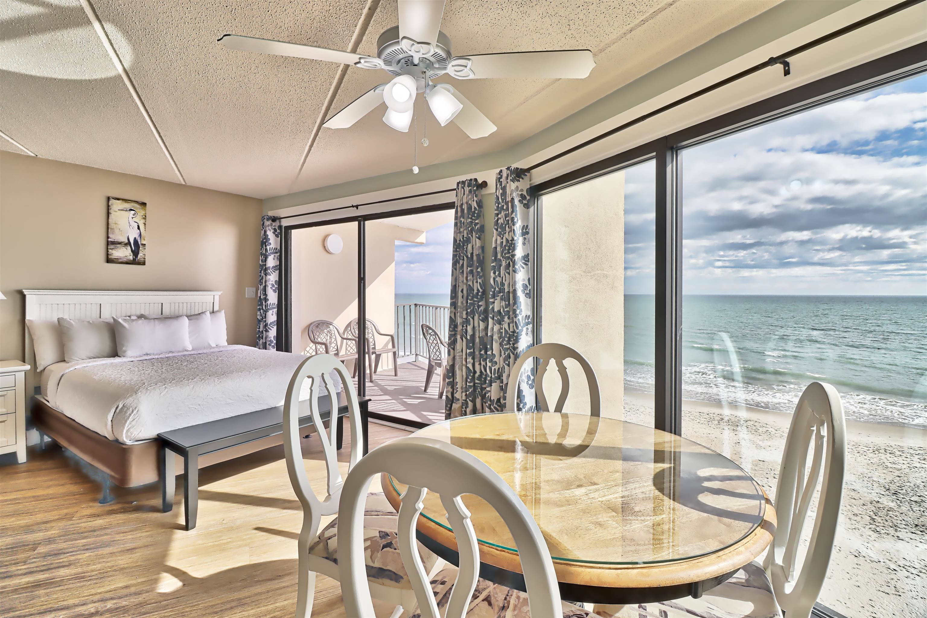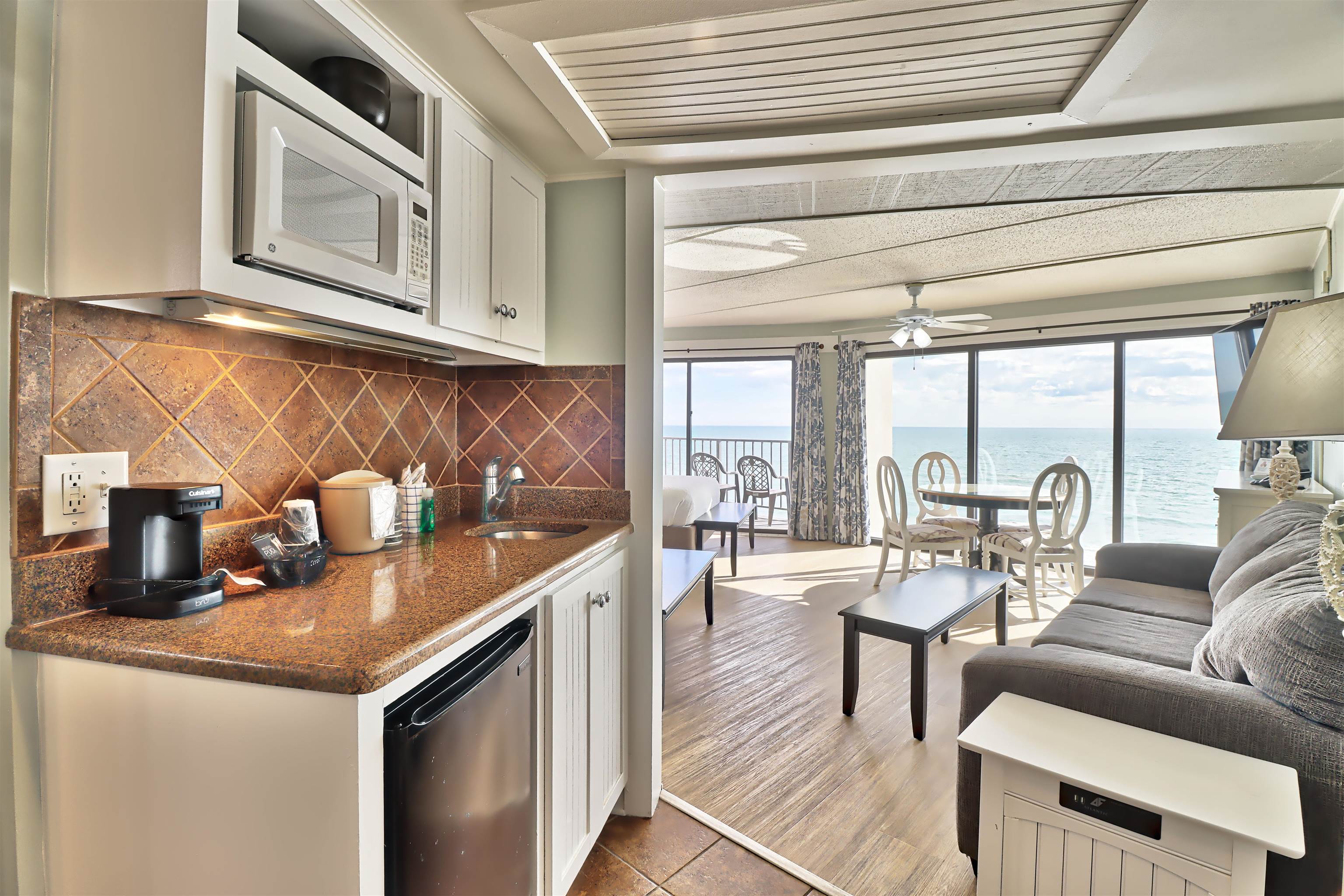 This beautiful condo is one of the most desirable in the Inn. Located in the tower, this is a wedge shaped unit that has more space and incredibly wide views. It is a showplace with a view to die for!! Direct oceanfront condo with wooden & tile floors, drop ceiling, ceiling fan, cabinets, appliances including mini-fridge, furniture, shower and tub and with private balcony. Watch the sunrise over the ocean or play in one of the two oceanfront pools! Relax at the Oceanside bar and restaurant. Exceptional rental income. Come enjoy life on South Litchfield Beach. Square footage is approximate and not guaranteed. Buyer is responsible for verification.