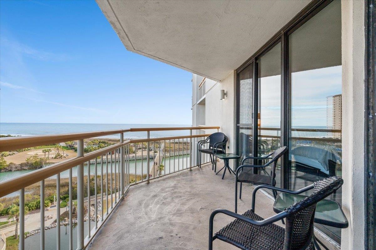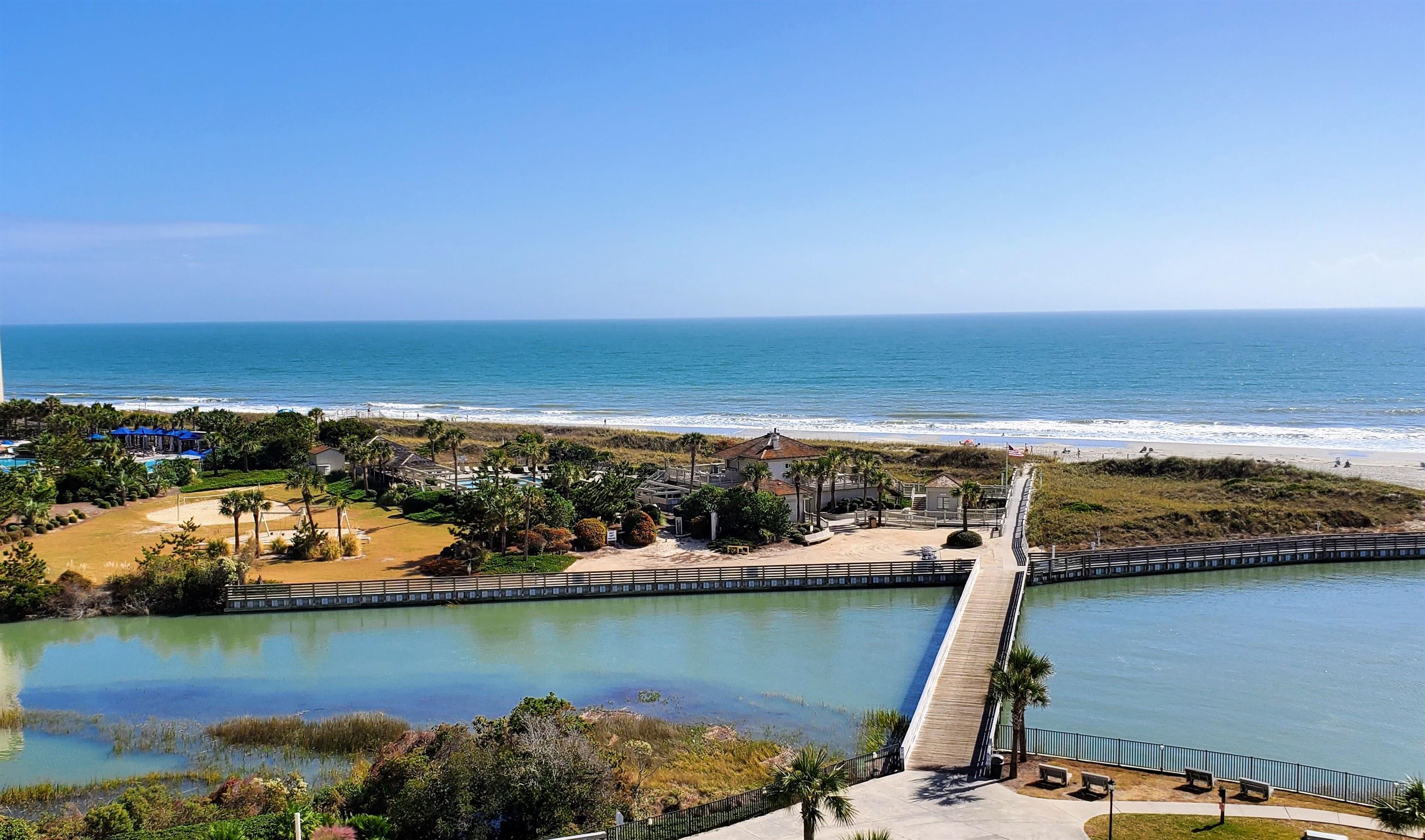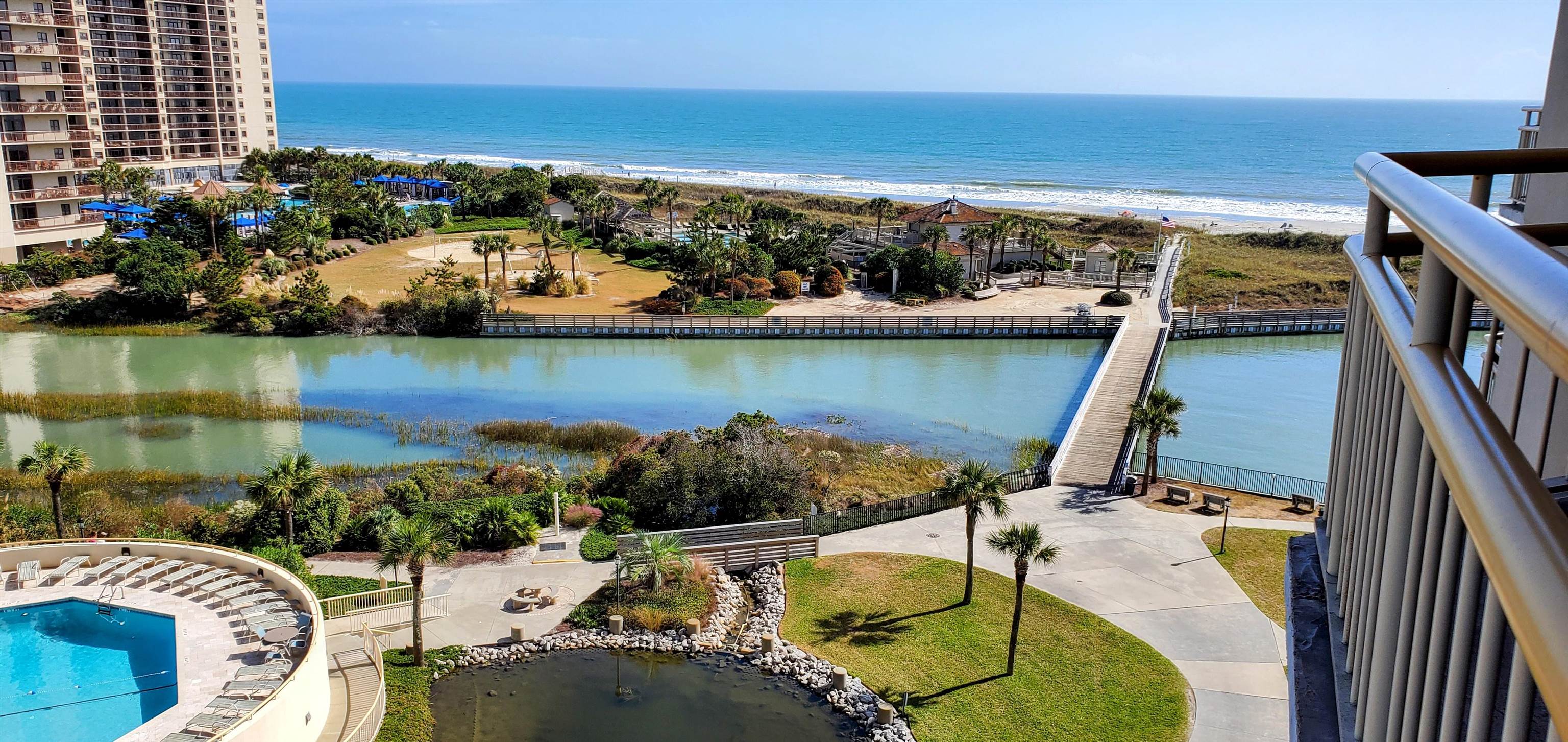 This three bedroom two bath condo on the 7th floor gets great morning sun and offers views of the ocean, surf, beach, Creek and Beach Club. Beautiful views, lots of interest, lovely during the day as well as at night. Always changing wildlife and Creek. During the summer enjoy the Barefoot Landing fireworks from your balcony. The kitchen is large and has an additional bar area, the living room is spacious as is the primary bedroom. This condo comes with a storage locker on the ground level. Ocean Creek has 57-acres of park-like grounds. 24-hour gated security, tennis center, pickleball court, putting green, multiple outdoor pools, and an indoor pool with whirlpool. The community boasts a wonderful oceanfront beach club with a snack bar and grill open in season, sand volleyball court, outdoor pool, playground, lockers, and restrooms. All figs. & sq. ft. approximate.