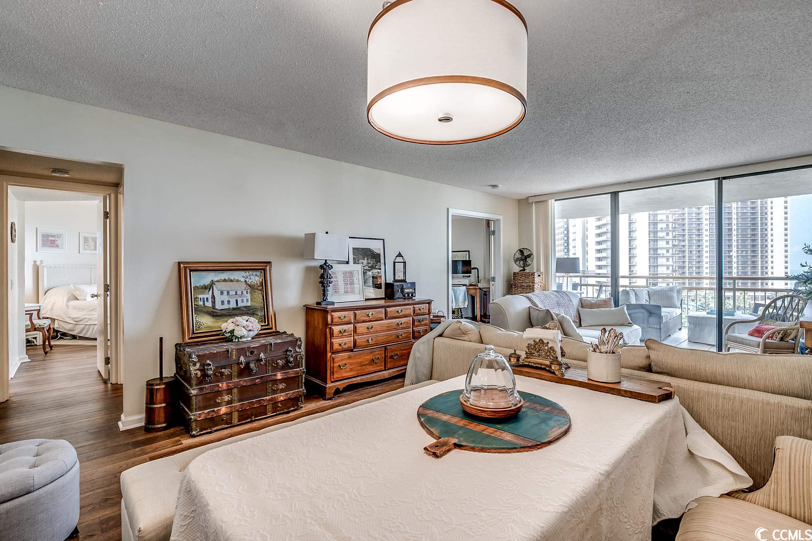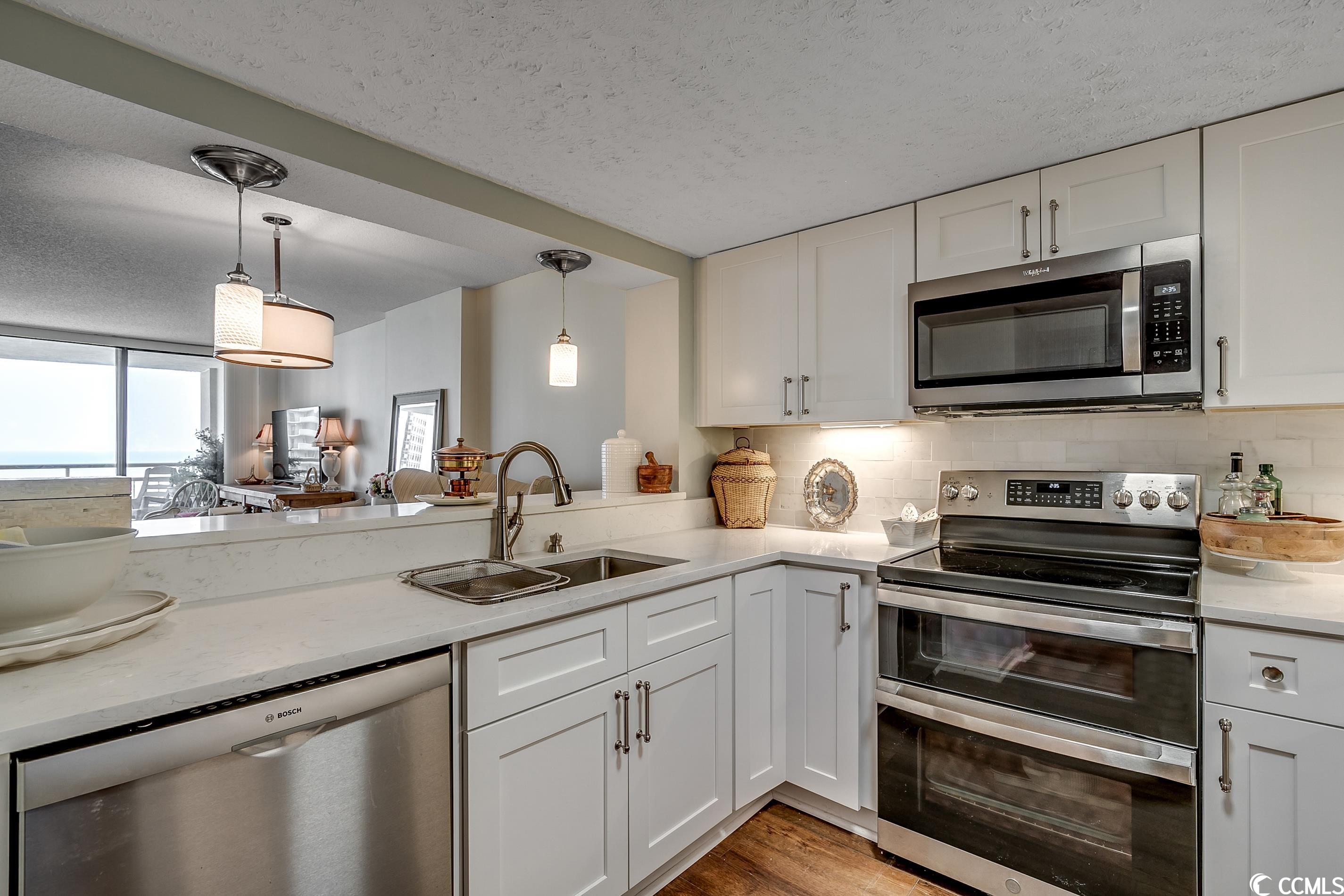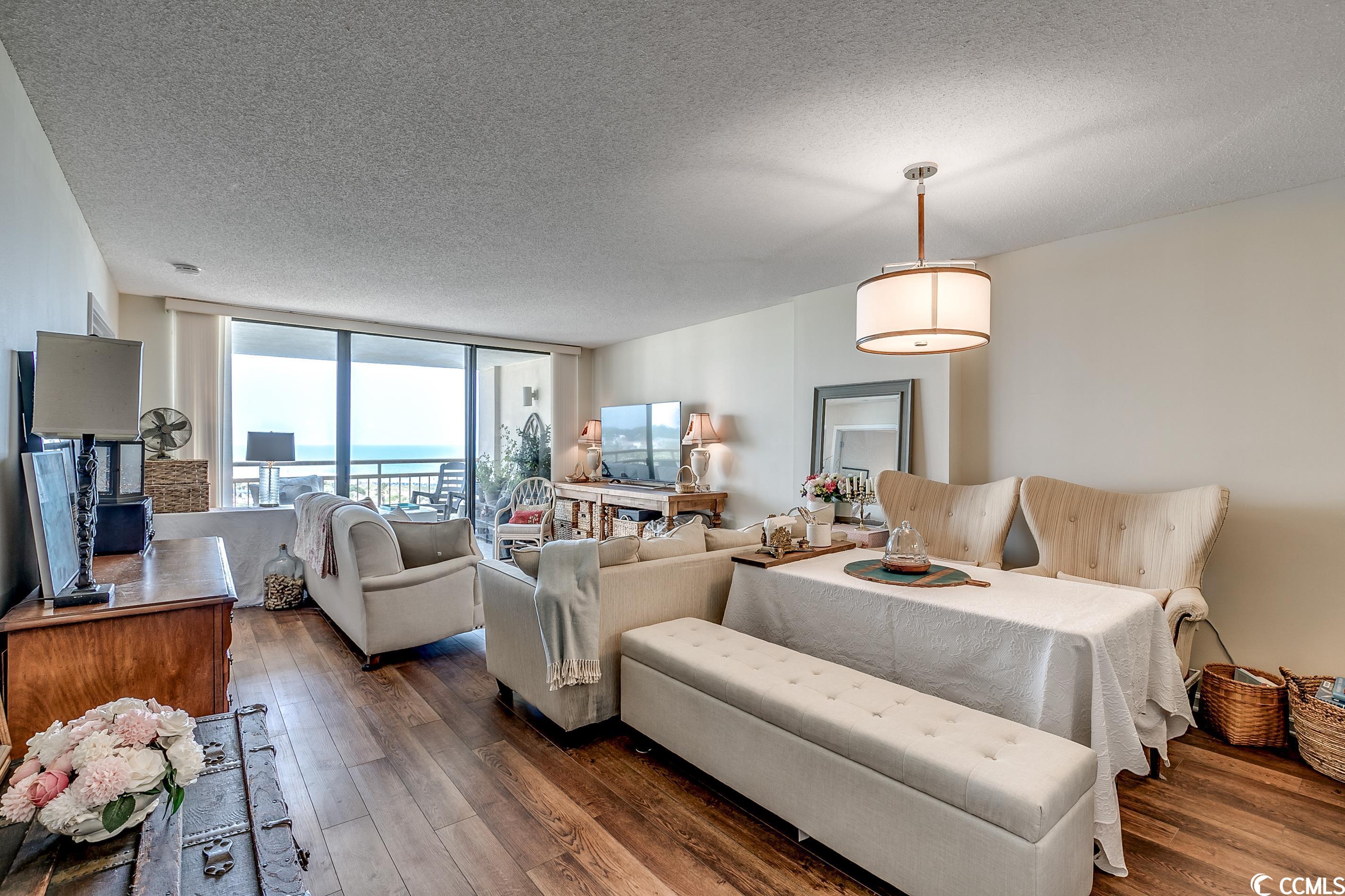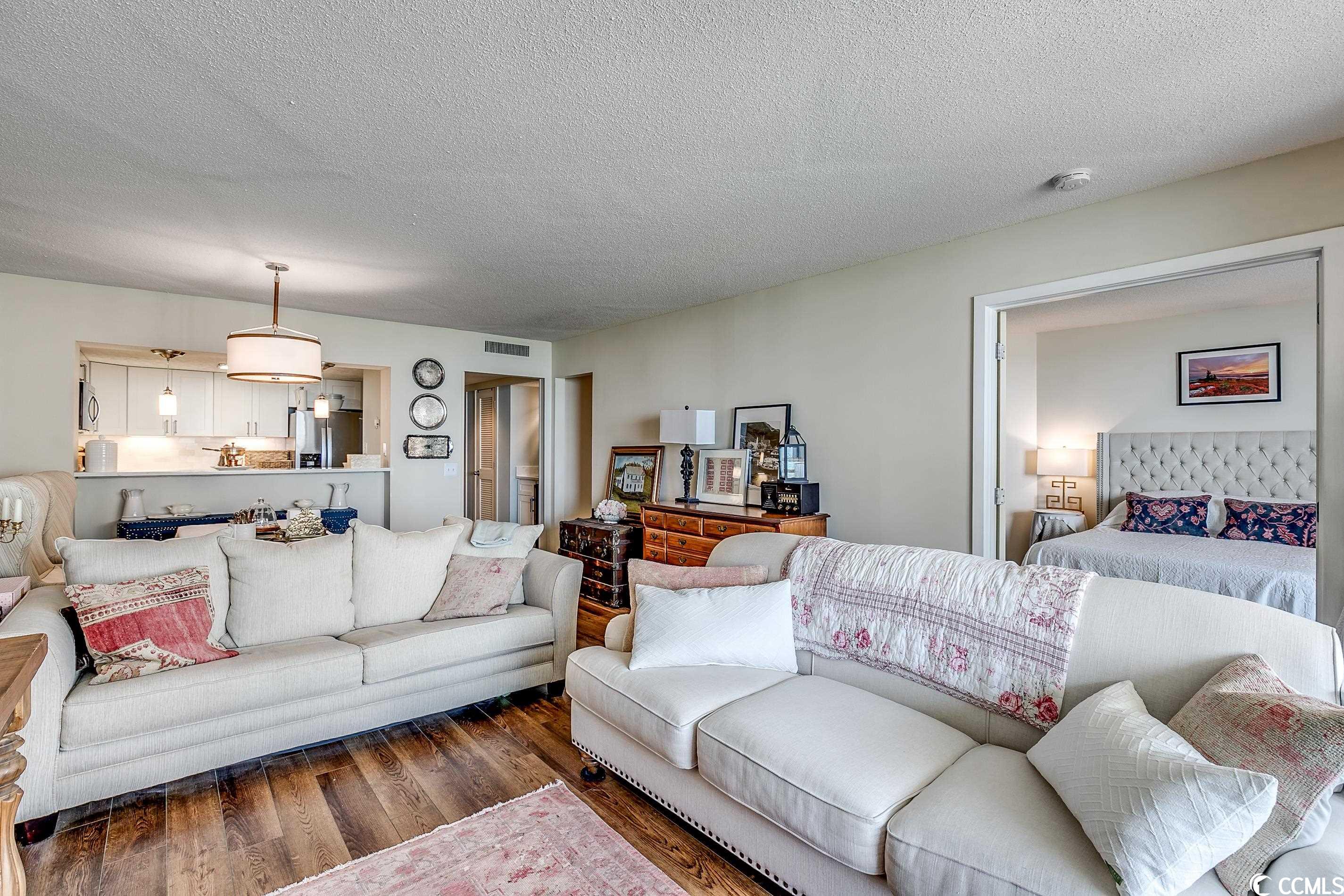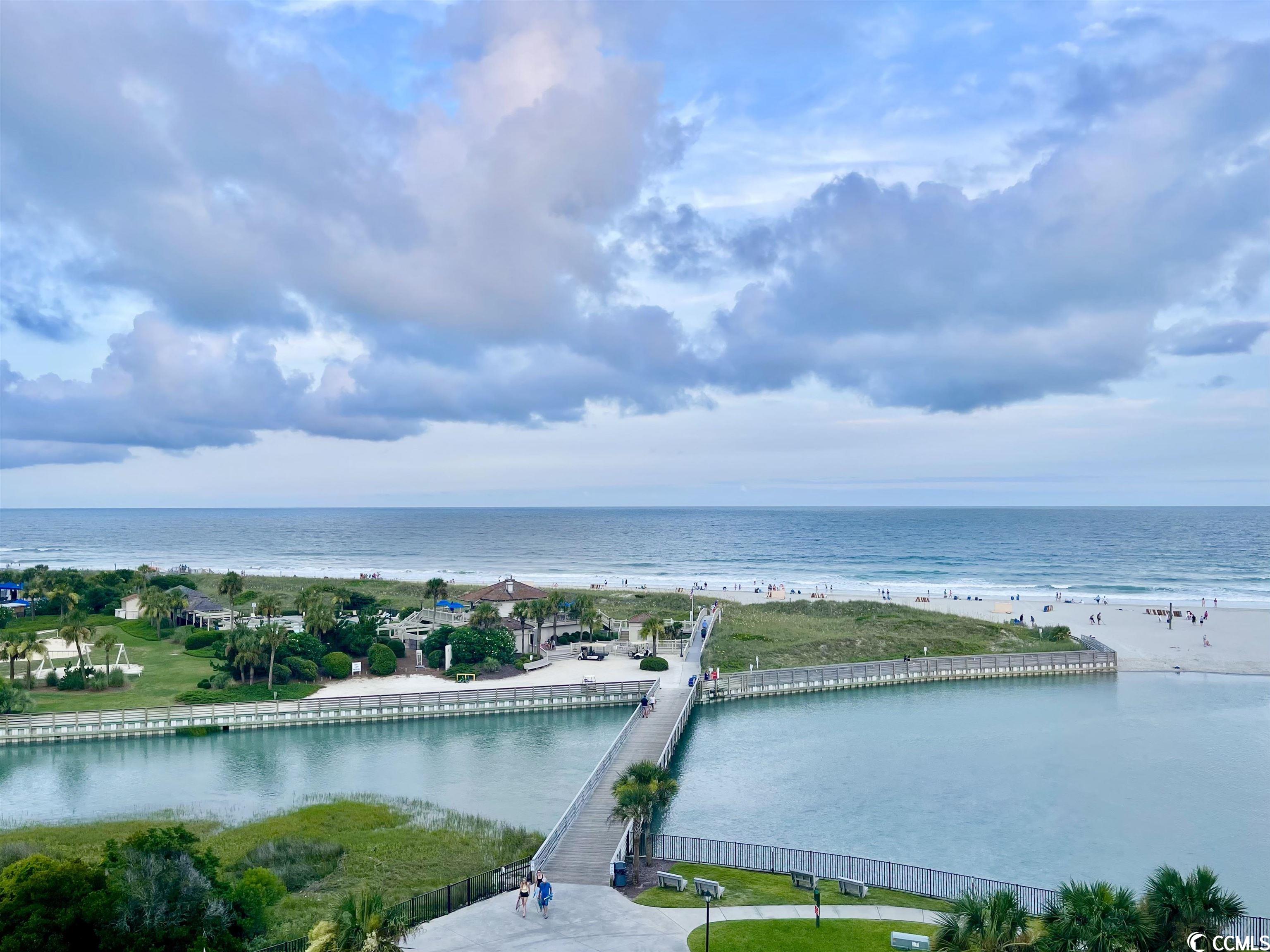 So many amazing upgrades with spectacular views from this completely renovated and updated two bedroom, two bathroom spacious condo in the wonderful Ocean Creek Resort. New cabinets and vanities, quartz countertops in kitchen and bathrooms, stainless steel appliances, Carrara Marble tile backsplash, wine cooler, wet bar, two balconies, luxury vinyl plank flooring throughout, beautifully furnished and decorated, updated fixtures, pantry, full size washer and dryer with cabinets, master closet custom shelving, updated toilets, and a large tiled balcony overlooking the ocean. Ocean Creek in an amazing resort with incredible amenities including pools (indoor and outdoor), 24-hr gated security, tennis center, and a beach club.