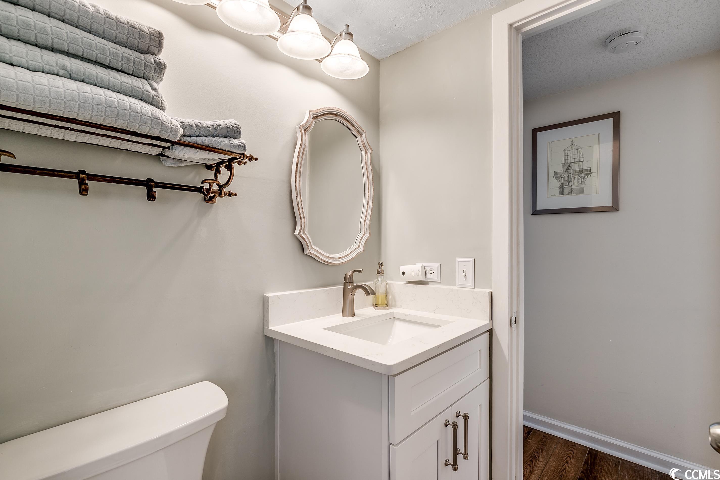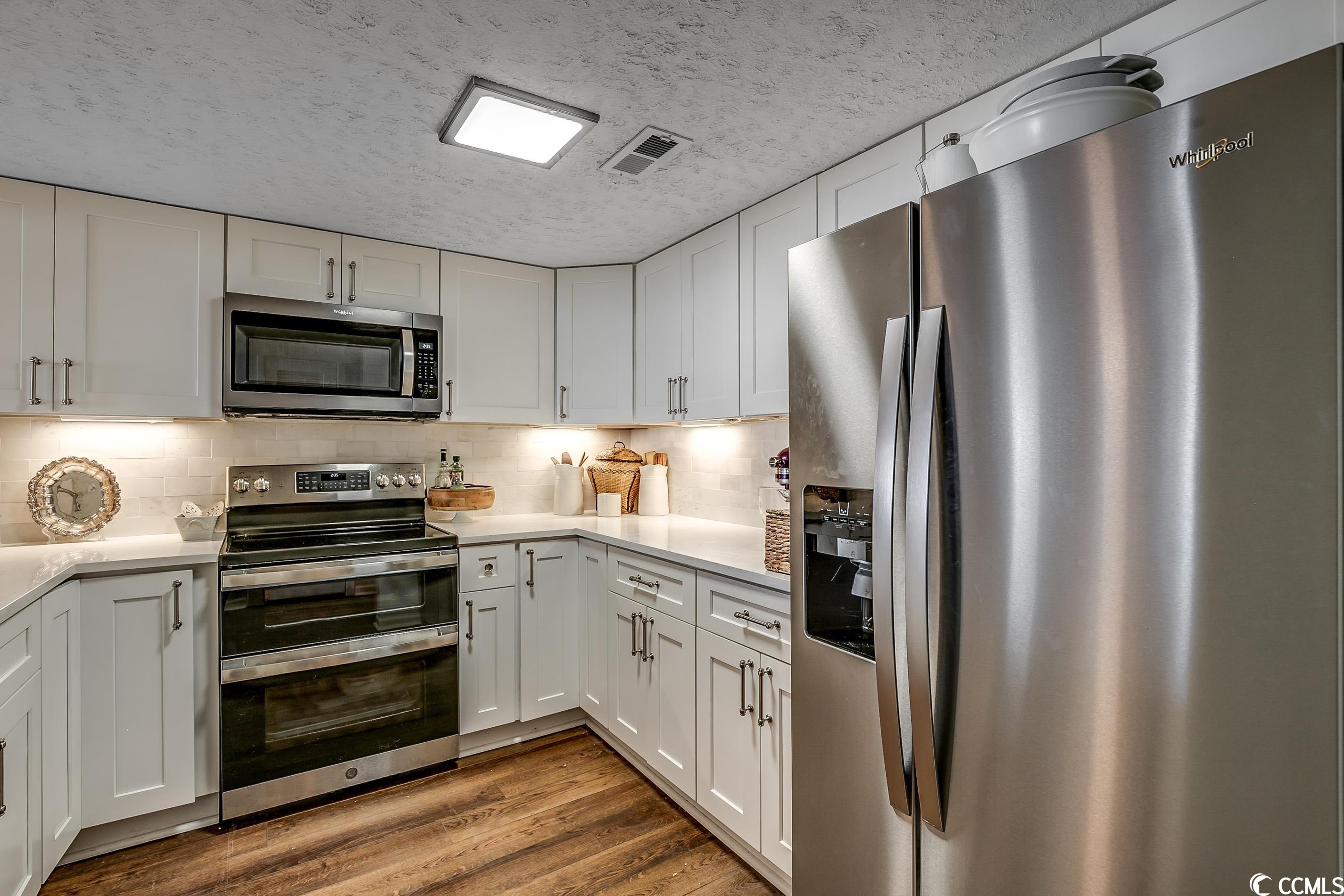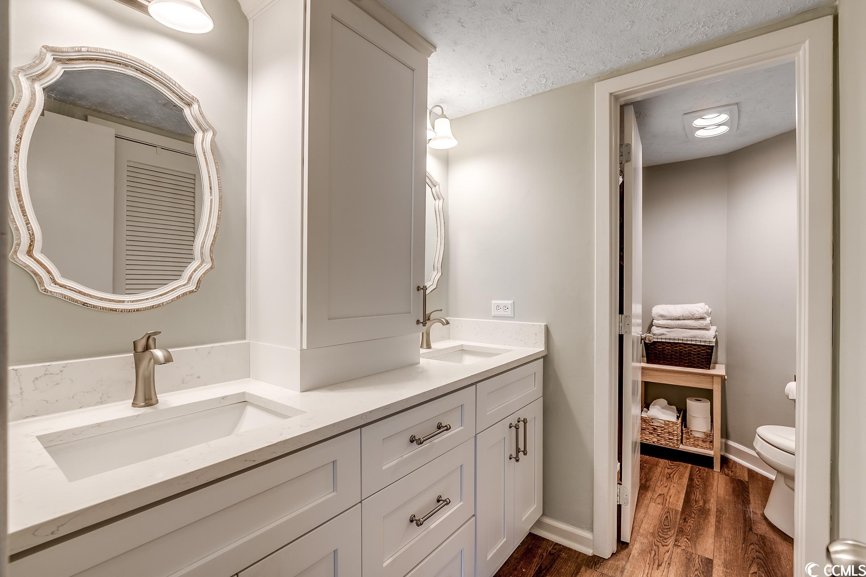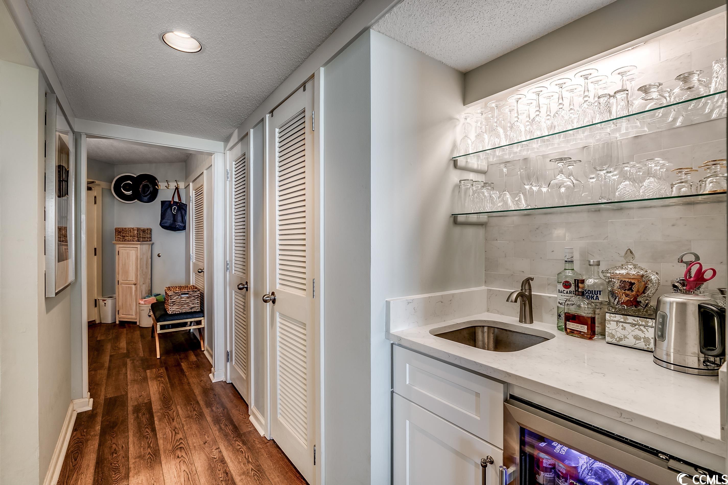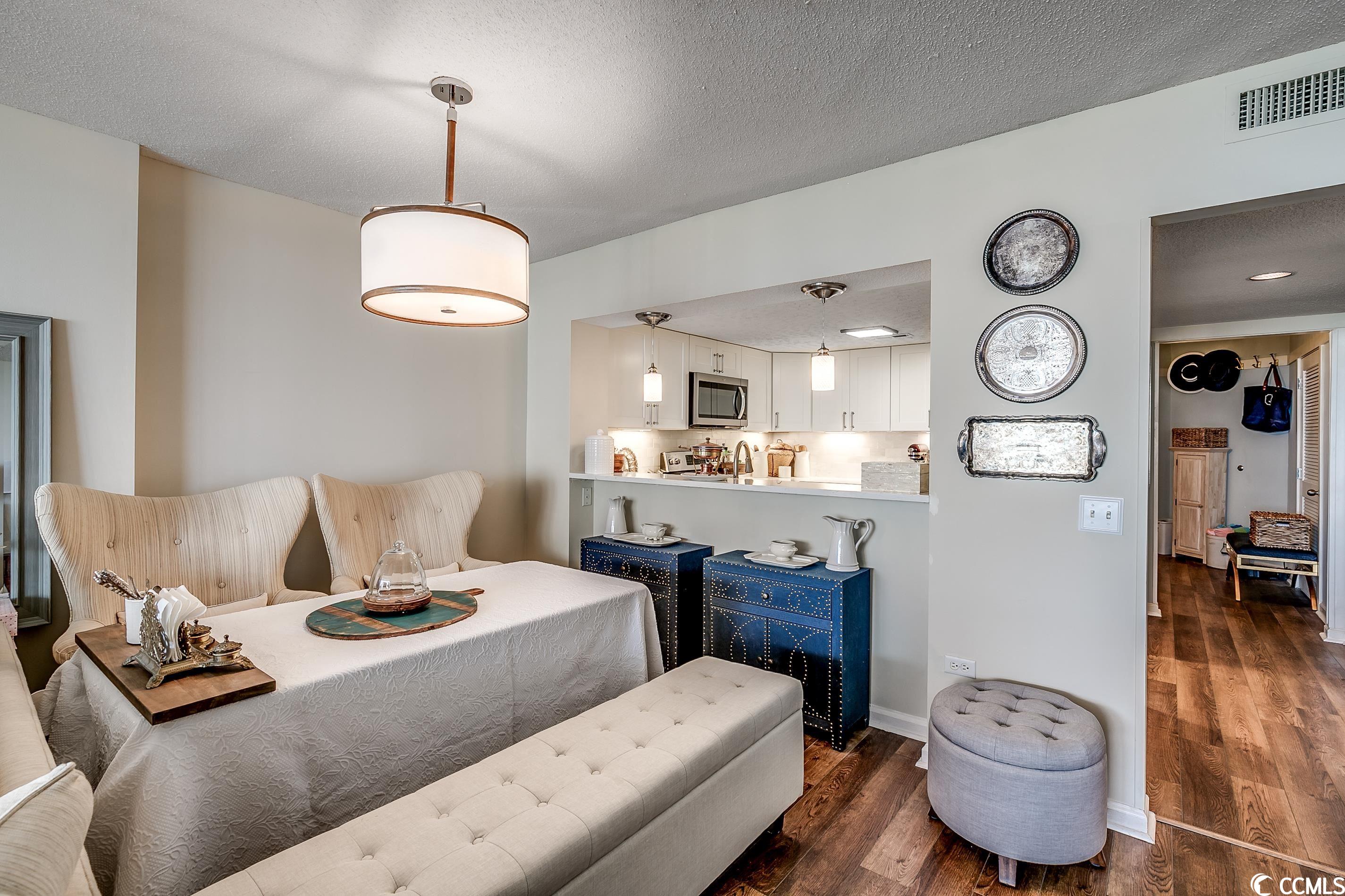 So many amazing upgrades with spectacular views from this completely renovated and updated two bedroom, two bathroom spacious condo in the wonderful Ocean Creek Resort. New cabinets and vanities, quartz countertops in kitchen and bathrooms, stainless steel appliances, Carrara Marble tile backsplash, wine cooler, wet bar, two balconies, luxury vinyl plank flooring throughout, beautifully furnished and decorated, updated fixtures, pantry, full size washer and dryer with cabinets, master closet custom shelving, updated toilets, and a large tiled balcony overlooking the ocean. Ocean Creek in an amazing resort with incredible amenities including pools (indoor and outdoor), 24-hr gated security, tennis center, and a beach club.