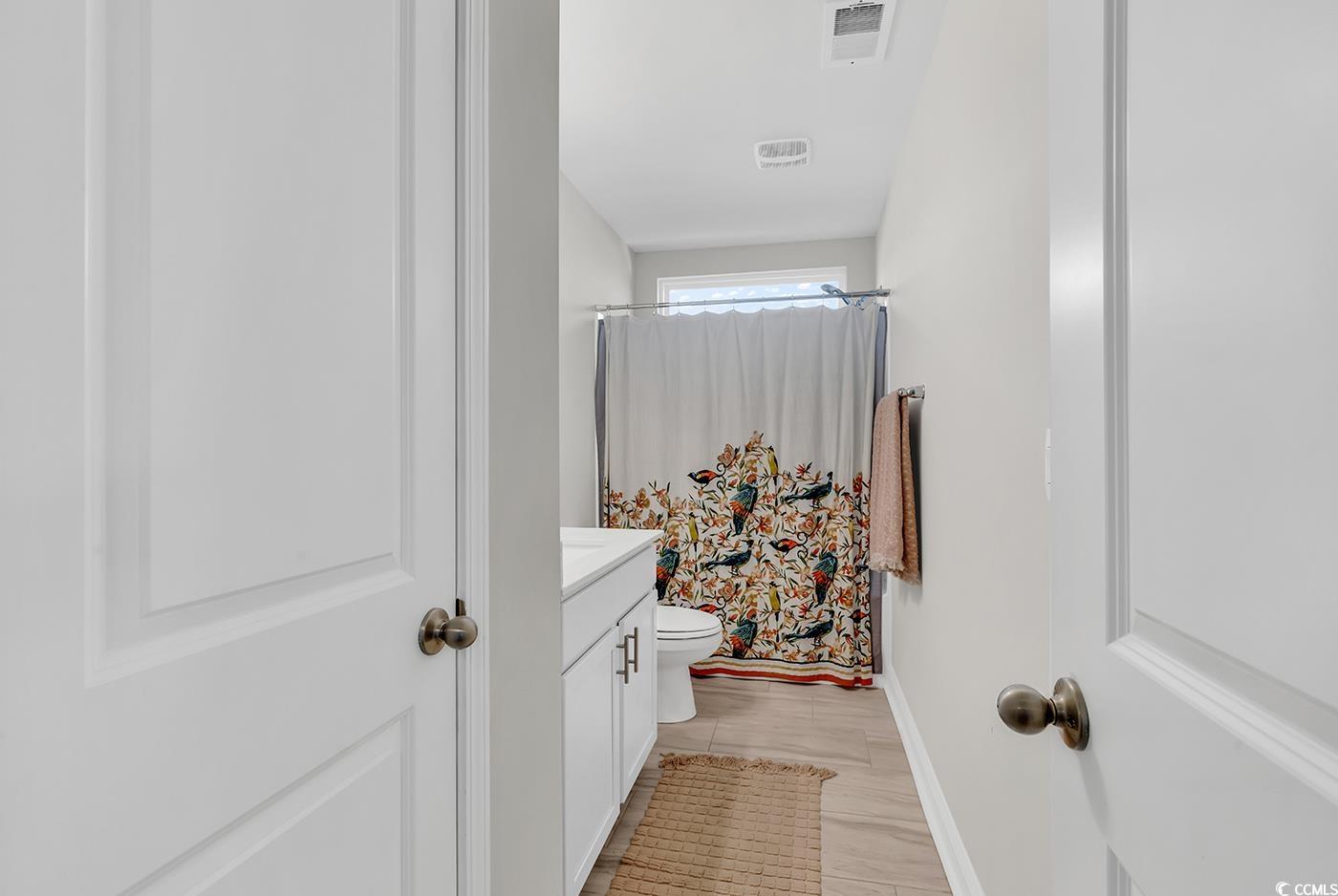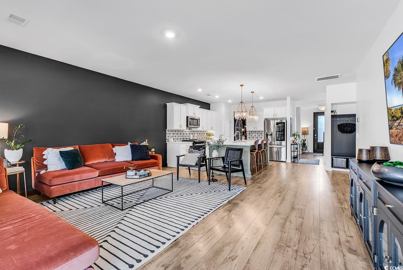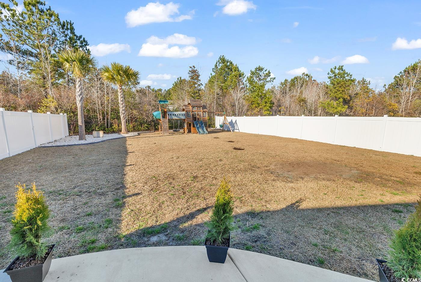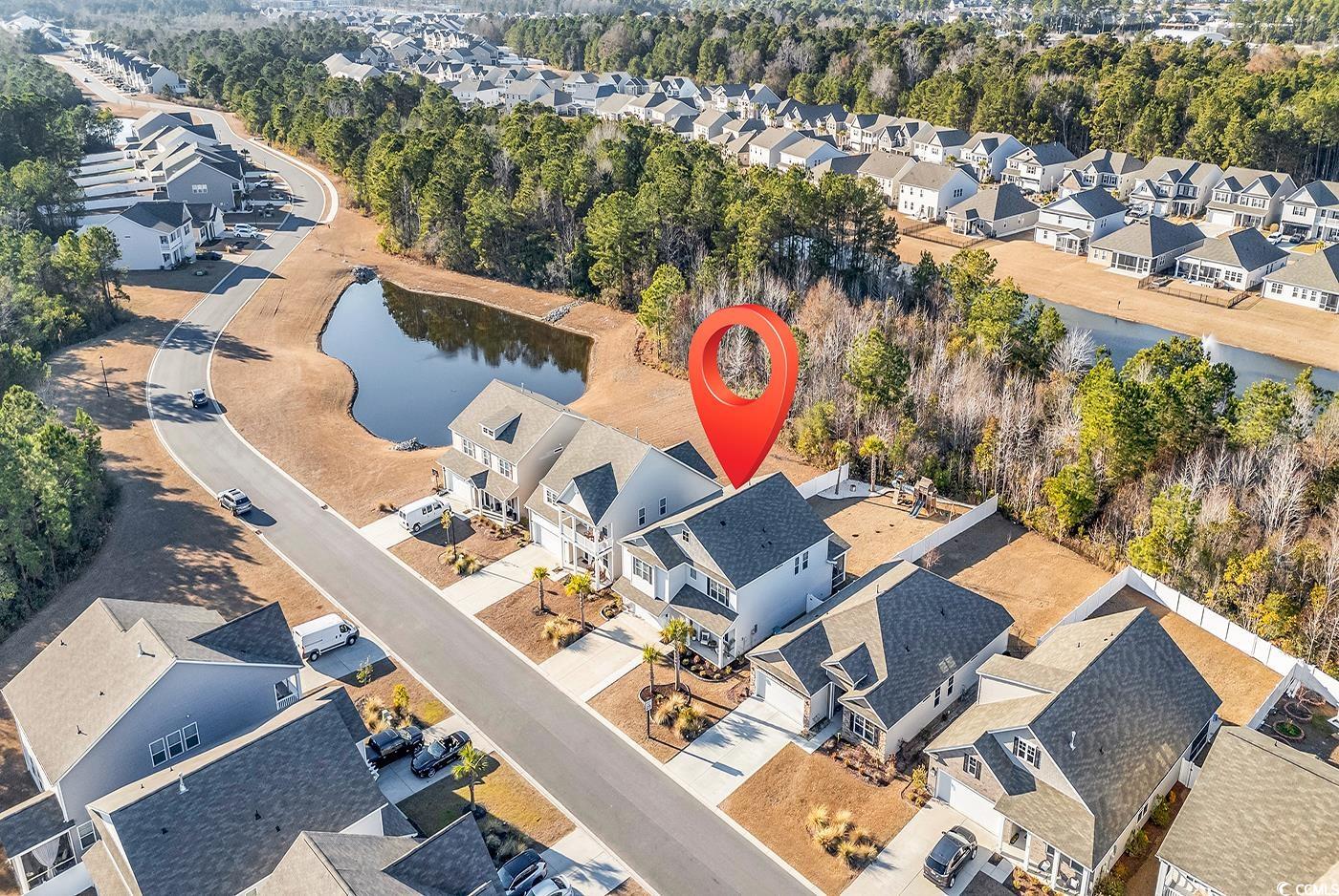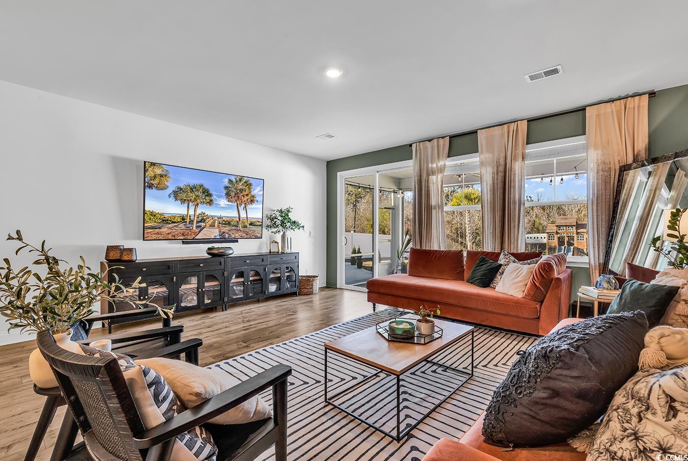 Discover the perfect blend of comfort and elegance in this spacious 5-bedroom, 3.5-bathroom home, nestled in the sought-after The Parks of Carolina Forest. With a private, tree-lined backyard and numerous upgrades, this home is designed for both relaxation and entertainment. Step inside to find a beautifully designed open-concept kitchen, featuring stainless steel appliances, a tiled backsplash, gas range, 36 cabinetry, quartz countertops, and a breakfast bar that flows effortlessly into the expansive living area. Enjoy serene backyard views from this inviting space, or host special occasions in the formal dining room. The main-level living areas boast wide-plank luxury vinyl flooring, offering durability with a modern touch. The first-floor primary suite is a true retreat, featuring a walk-in closet, tiled walk-in shower, private water closet, double vanity sinks, and a linen closet. Upstairs, youll find four additional bedrooms, two full bathrooms, and a large flex spaceideal for a playroom, media room, or home office. This home is situated on a quiet, highly desirable street with a private, wooded backyard. Thoughtful upgrades include a widened driveway, enhanced landscaping with curb edging, rubber mulch, palm trees, and a privacy fence. The entertainment patio, complete with a mounted TV, is perfect for game days or family movie nights. Additional features include a screened-in porch, tankless hot water heater, upgraded smart refrigerator, washer and dryer, and permanent holiday lights for year-round charm. This community has a picturesque setting of ponds, an amazing amenity center, and park of the majestic ""Ten Oaks"" with walking trails to get to the Carolina Forest library. This golf cart friendly community is located in the heart of Carolina Forest, which is close to award winning school systems, major roads such as Hwy 31, shopping and located only 5 miles to the beach. This home has it all and being close to everything else Myrtle Beach and Carolina Forest has to offer is an added plus. Owner is a Licensed SC Realtor.