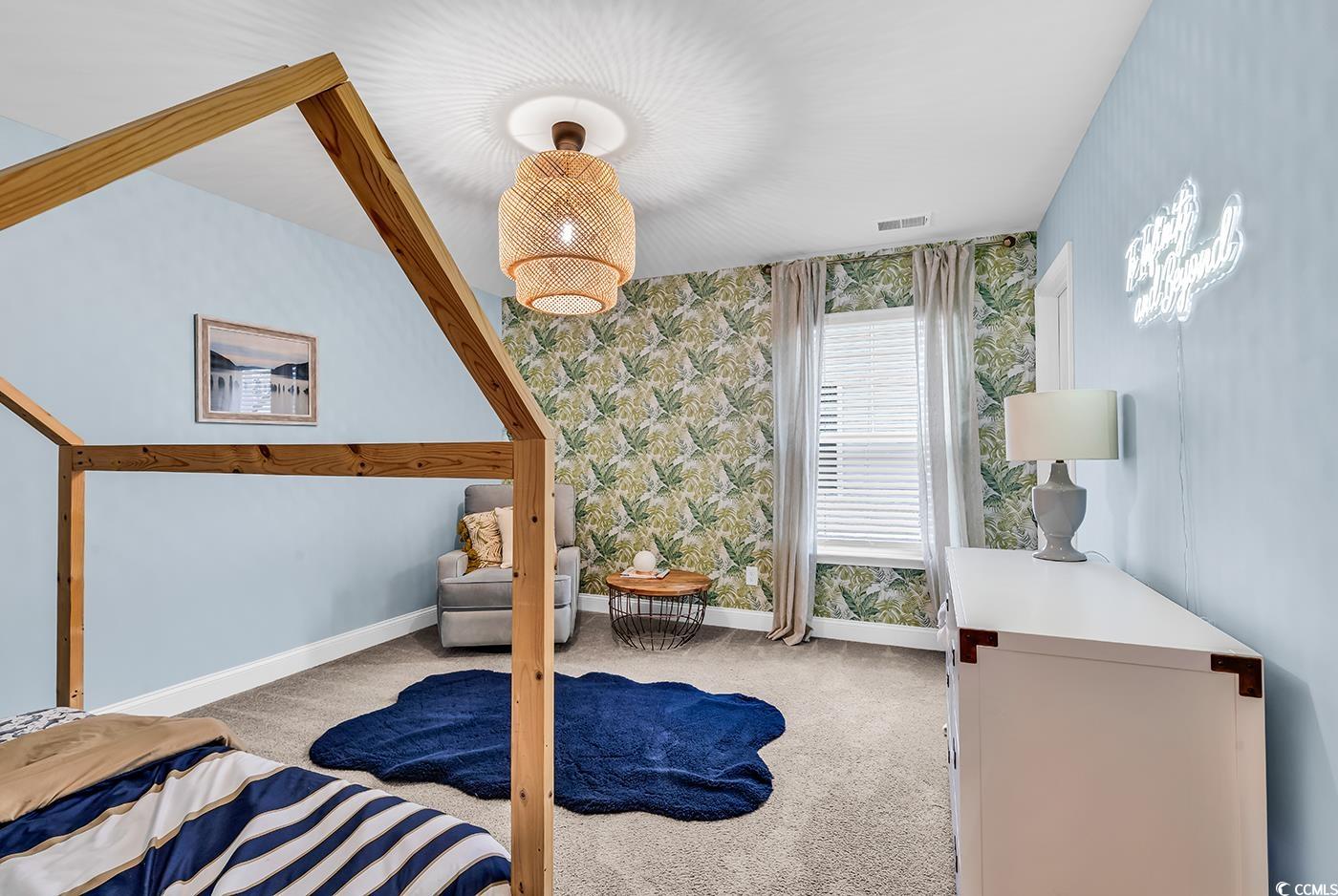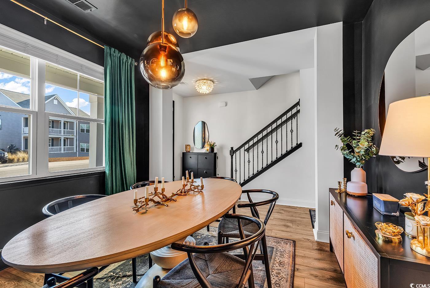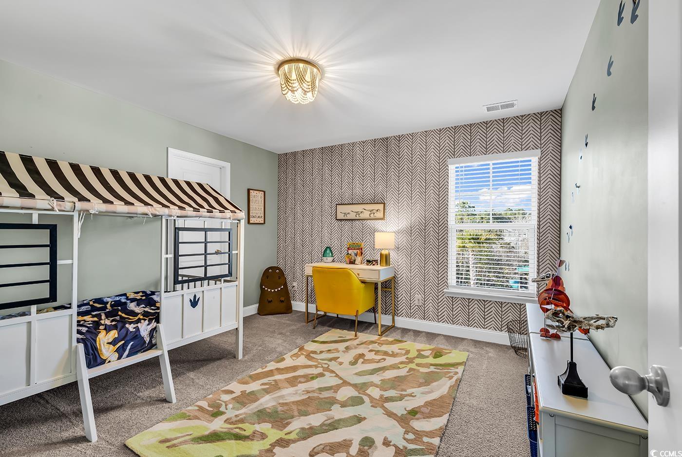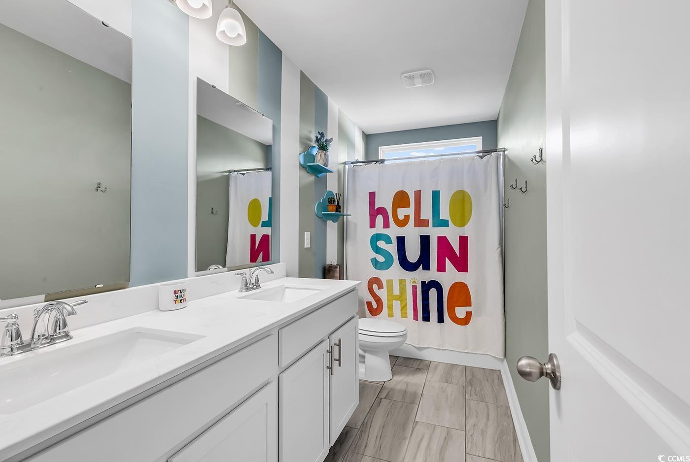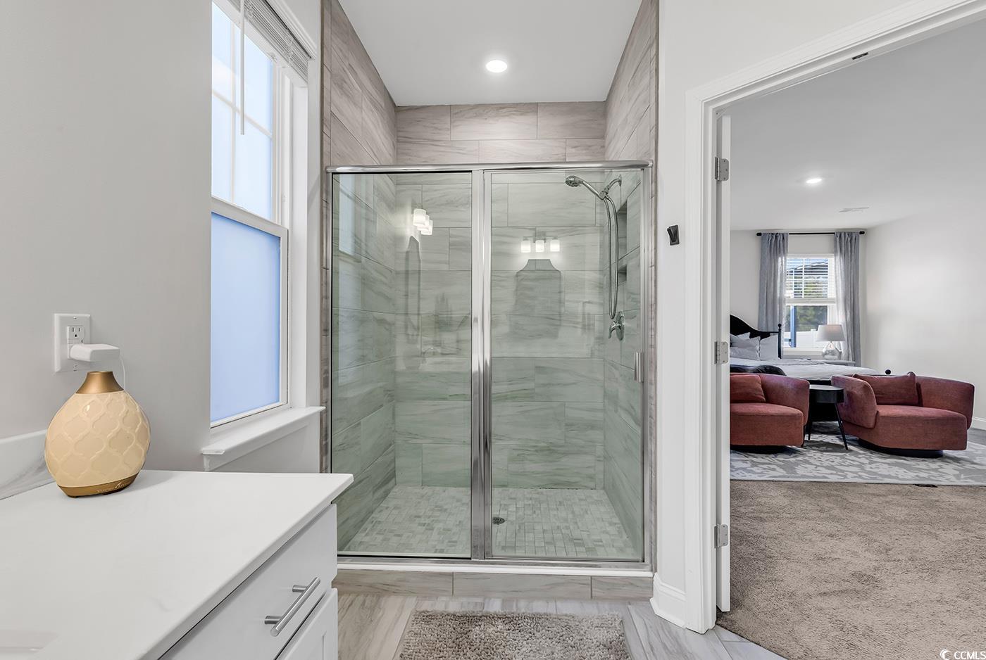 Discover the perfect blend of comfort and elegance in this spacious 5-bedroom, 3.5-bathroom home, nestled in the sought-after The Parks of Carolina Forest. With a private, tree-lined backyard and numerous upgrades, this home is designed for both relaxation and entertainment. Step inside to find a beautifully designed open-concept kitchen, featuring stainless steel appliances, a tiled backsplash, gas range, 36 cabinetry, quartz countertops, and a breakfast bar that flows effortlessly into the expansive living area. Enjoy serene backyard views from this inviting space, or host special occasions in the formal dining room. The main-level living areas boast wide-plank luxury vinyl flooring, offering durability with a modern touch. The first-floor primary suite is a true retreat, featuring a walk-in closet, tiled walk-in shower, private water closet, double vanity sinks, and a linen closet. Upstairs, youll find four additional bedrooms, two full bathrooms, and a large flex spaceideal for a playroom, media room, or home office. This home is situated on a quiet, highly desirable street with a private, wooded backyard. Thoughtful upgrades include a widened driveway, enhanced landscaping with curb edging, rubber mulch, palm trees, and a privacy fence. The entertainment patio, complete with a mounted TV, is perfect for game days or family movie nights. Additional features include a screened-in porch, tankless hot water heater, upgraded smart refrigerator, washer and dryer, and permanent holiday lights for year-round charm. This community has a picturesque setting of ponds, an amazing amenity center, and park of the majestic ""Ten Oaks"" with walking trails to get to the Carolina Forest library. This golf cart friendly community is located in the heart of Carolina Forest, which is close to award winning school systems, major roads such as Hwy 31, shopping and located only 5 miles to the beach. This home has it all and being close to everything else Myrtle Beach and Carolina Forest has to offer is an added plus. Owner is a Licensed SC Realtor.
