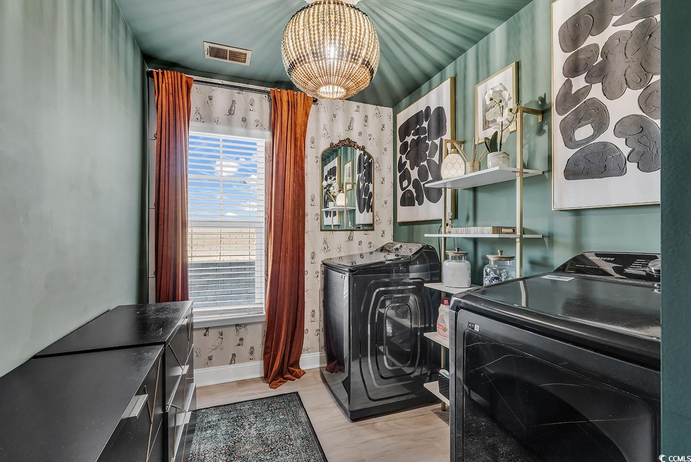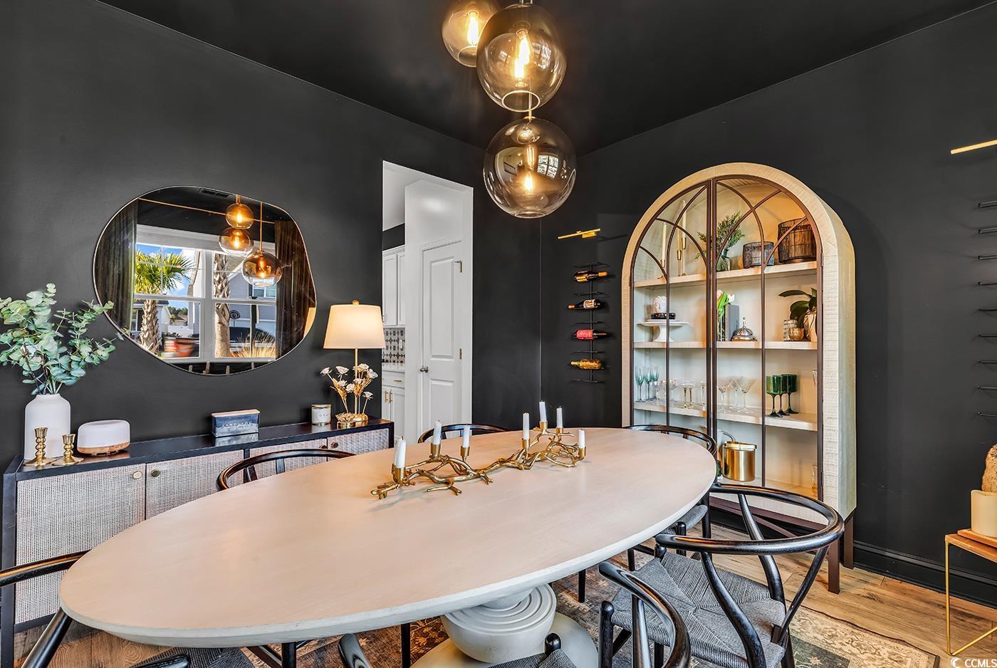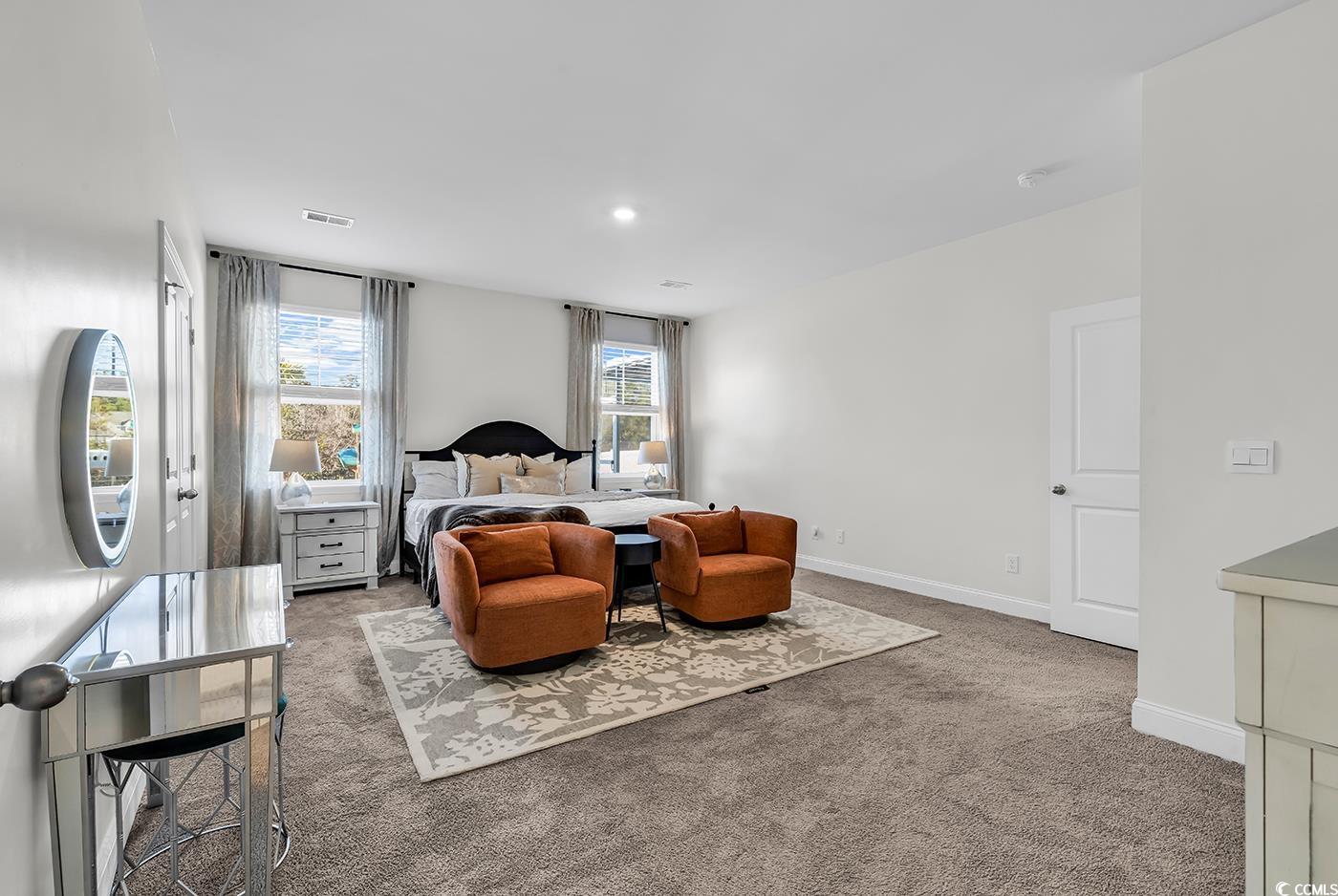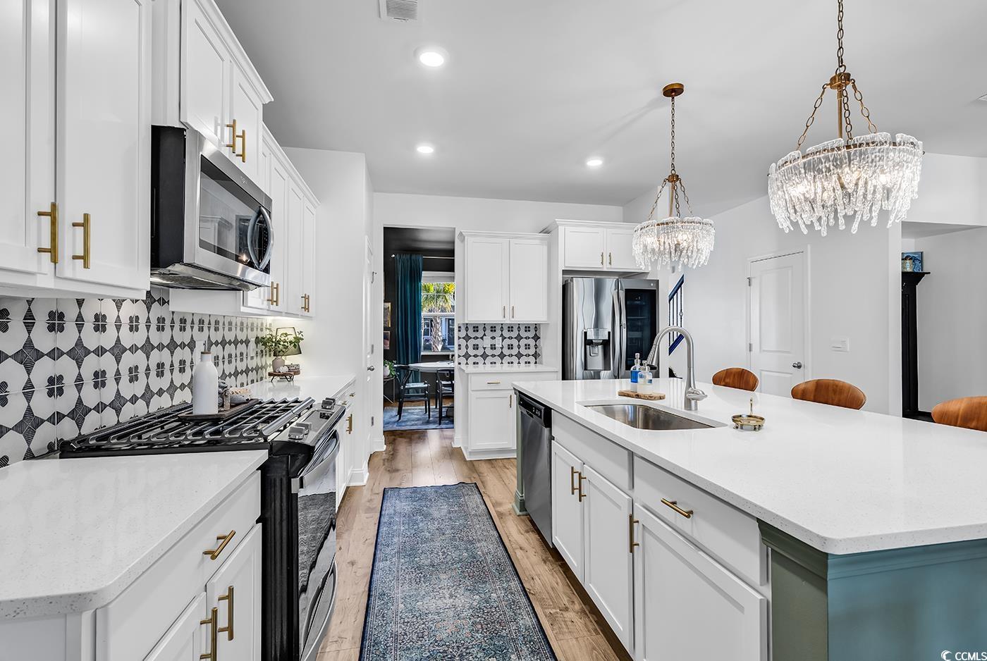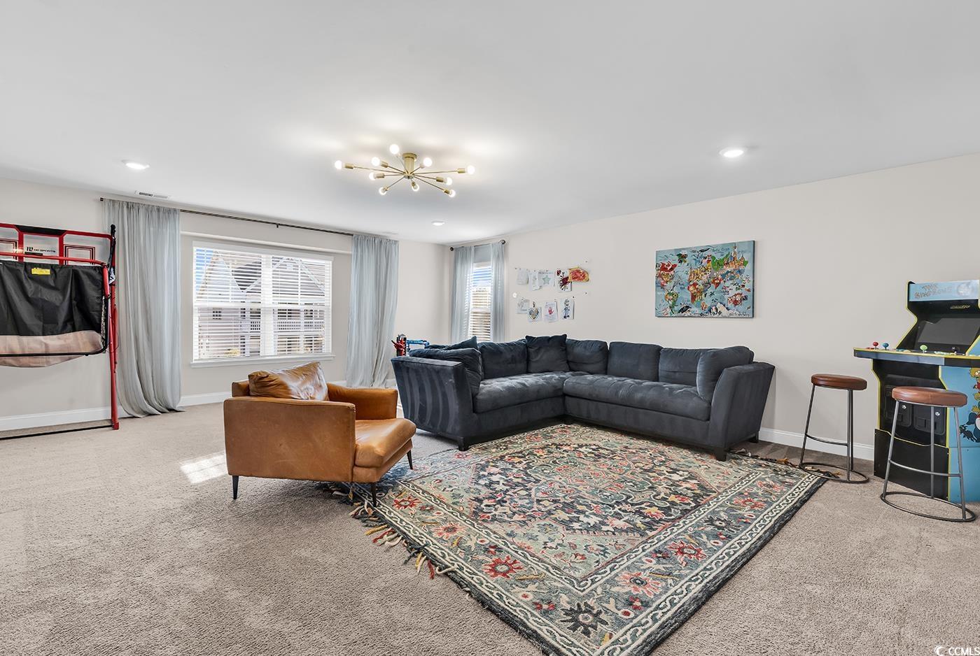 Discover the perfect blend of comfort and elegance in this spacious 5-bedroom, 3.5-bathroom home, nestled in the sought-after The Parks of Carolina Forest. With a private, tree-lined backyard and numerous upgrades, this home is designed for both relaxation and entertainment. Step inside to find a beautifully designed open-concept kitchen, featuring stainless steel appliances, a tiled backsplash, gas range, 36 cabinetry, quartz countertops, and a breakfast bar that flows effortlessly into the expansive living area. Enjoy serene backyard views from this inviting space, or host special occasions in the formal dining room. The main-level living areas boast wide-plank luxury vinyl flooring, offering durability with a modern touch. The first-floor primary suite is a true retreat, featuring a walk-in closet, tiled walk-in shower, private water closet, double vanity sinks, and a linen closet. Upstairs, youll find four additional bedrooms, two full bathrooms, and a large flex spaceideal for a playroom, media room, or home office. This home is situated on a quiet, highly desirable street with a private, wooded backyard. Thoughtful upgrades include a widened driveway, enhanced landscaping with curb edging, rubber mulch, palm trees, and a privacy fence. The entertainment patio, complete with a mounted TV, is perfect for game days or family movie nights. Additional features include a screened-in porch, tankless hot water heater, upgraded smart refrigerator, washer and dryer, and permanent holiday lights for year-round charm. This community has a picturesque setting of ponds, an amazing amenity center, and park of the majestic ""Ten Oaks"" with walking trails to get to the Carolina Forest library. This golf cart friendly community is located in the heart of Carolina Forest, which is close to award winning school systems, major roads such as Hwy 31, shopping and located only 5 miles to the beach. This home has it all and being close to everything else Myrtle Beach and Carolina Forest has to offer is an added plus. Owner is a Licensed SC Realtor.