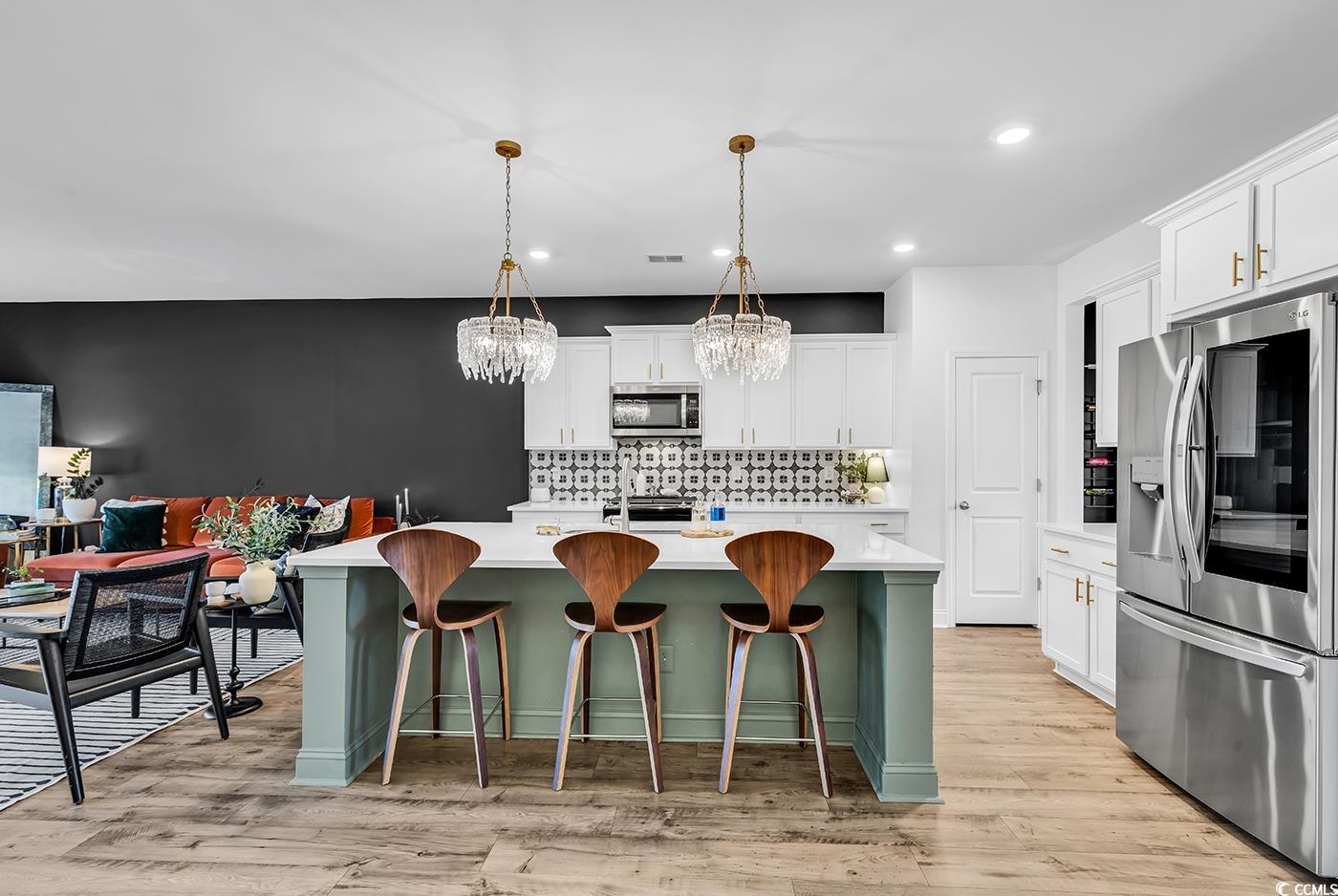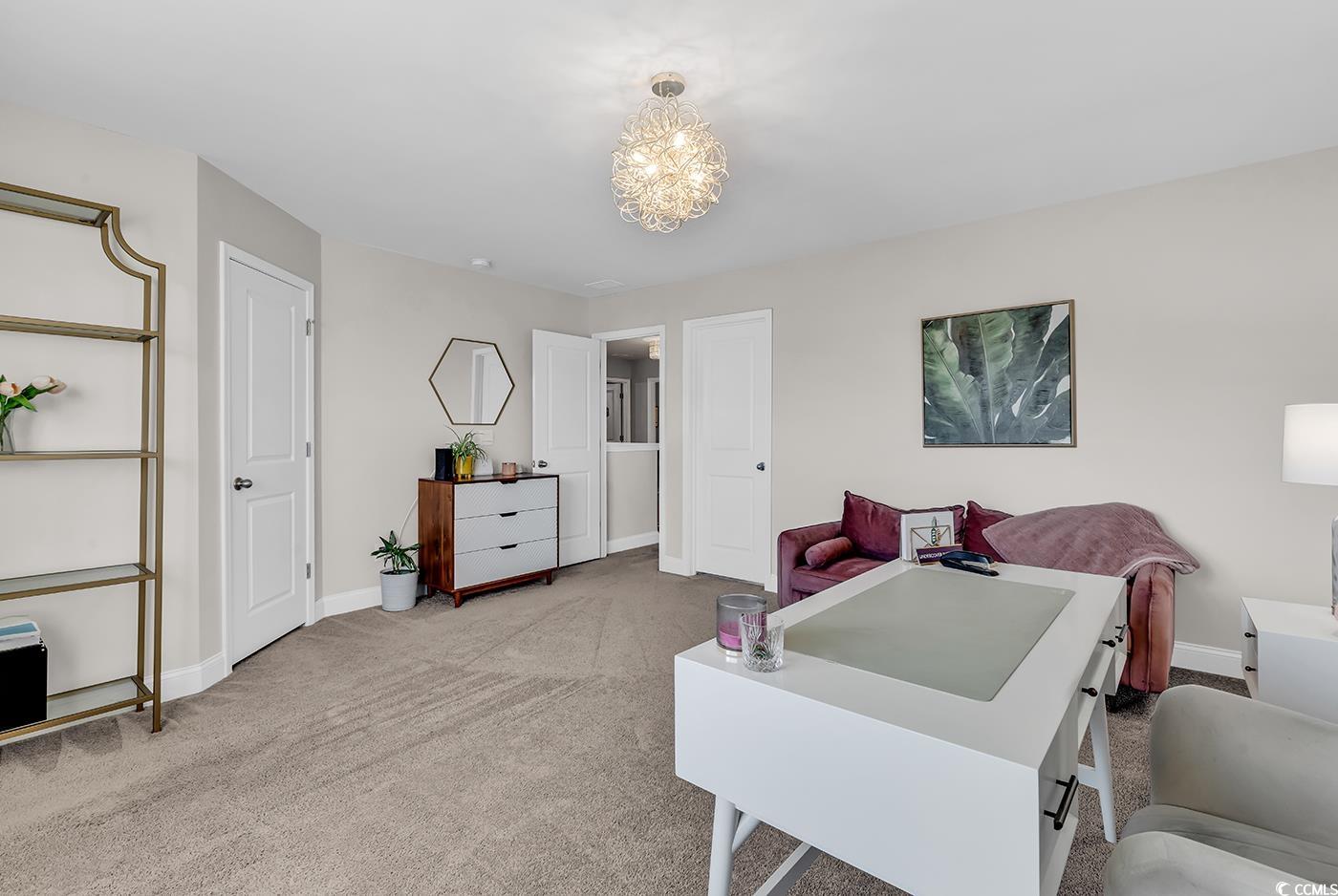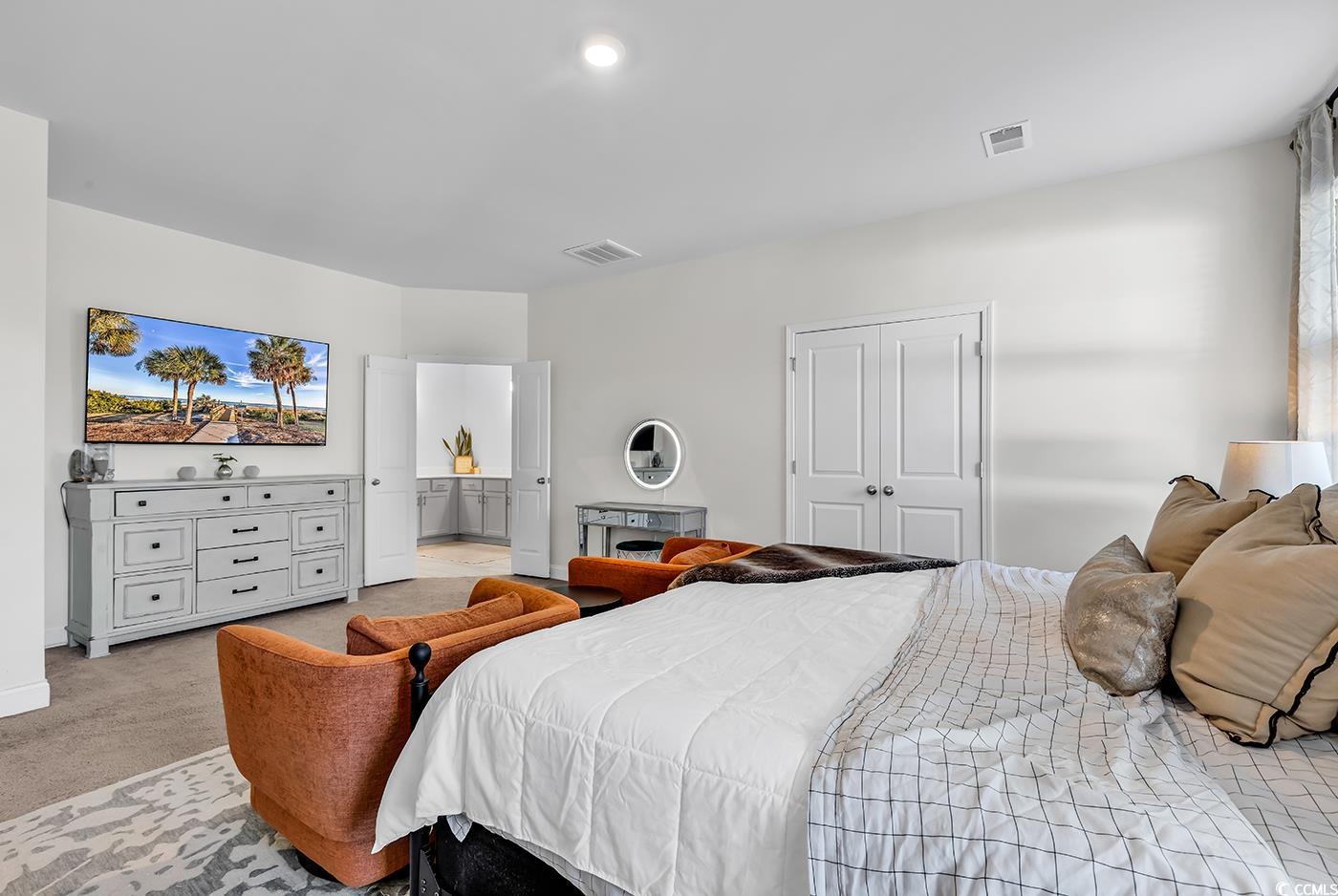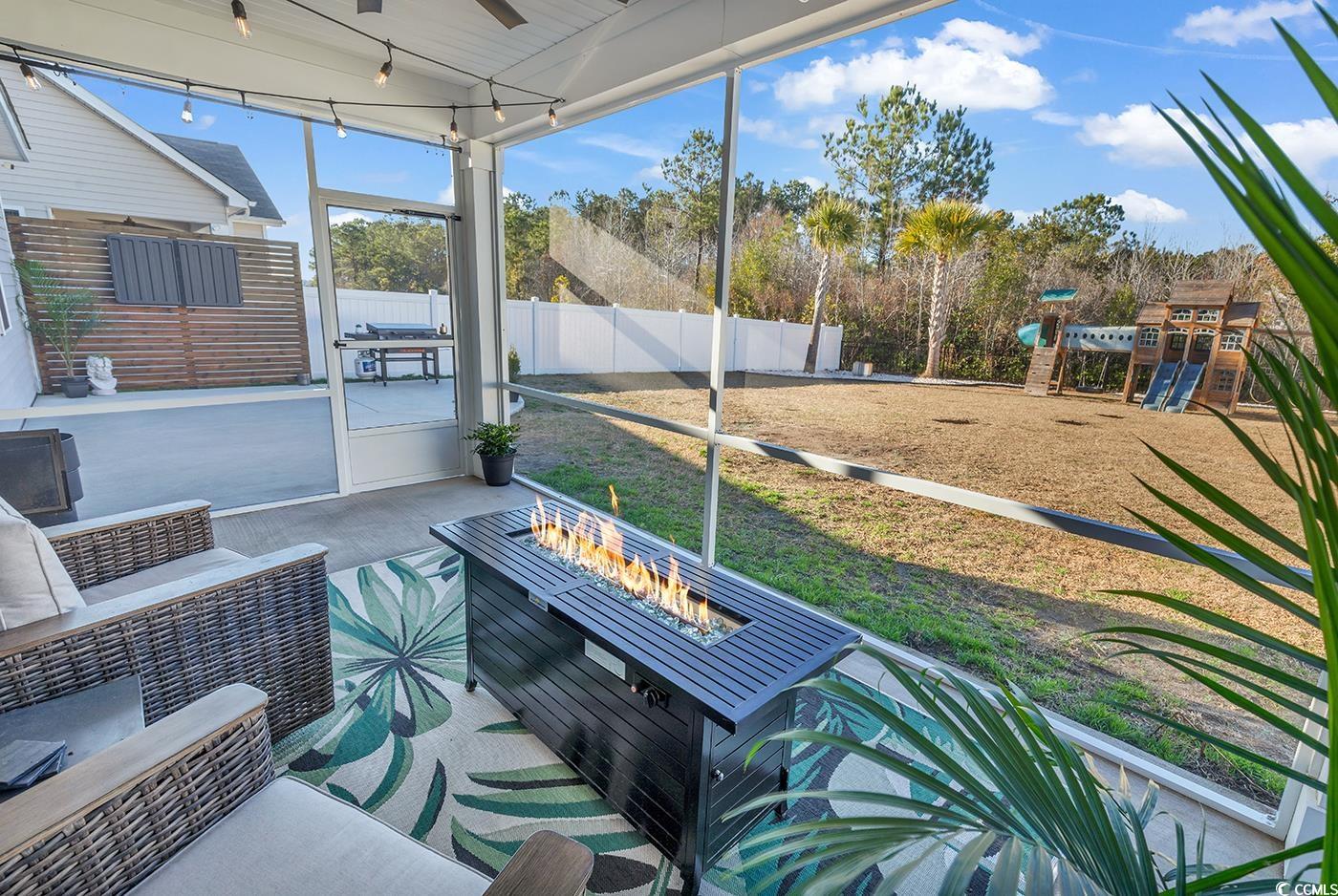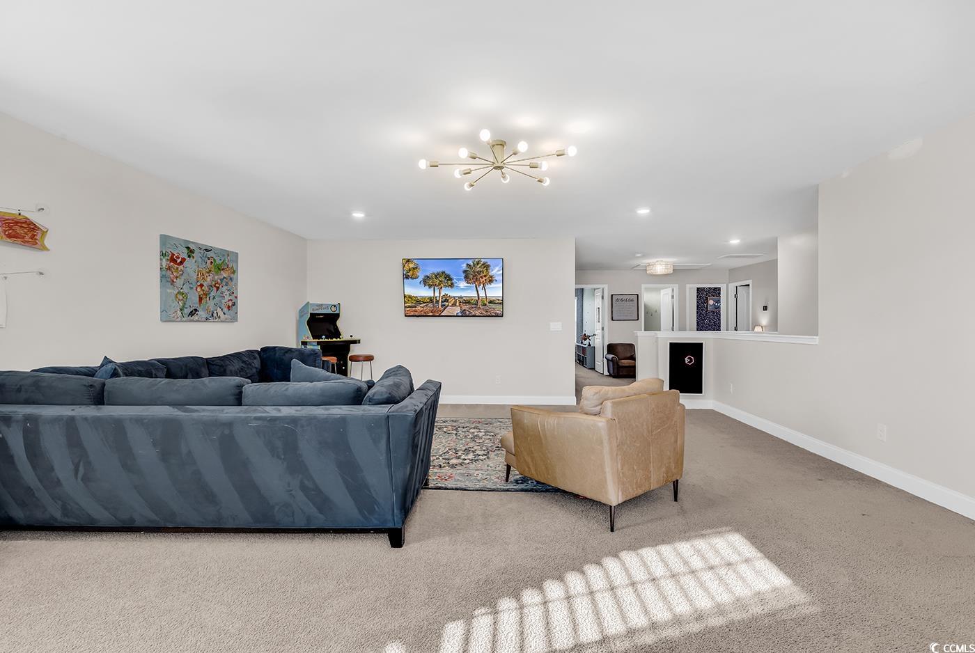 Discover the perfect blend of comfort and elegance in this spacious 5-bedroom, 3.5-bathroom home, nestled in the sought-after The Parks of Carolina Forest. With a private, tree-lined backyard and numerous upgrades, this home is designed for both relaxation and entertainment. Step inside to find a beautifully designed open-concept kitchen, featuring stainless steel appliances, a tiled backsplash, gas range, 36 cabinetry, quartz countertops, and a breakfast bar that flows effortlessly into the expansive living area. Enjoy serene backyard views from this inviting space, or host special occasions in the formal dining room. The main-level living areas boast wide-plank luxury vinyl flooring, offering durability with a modern touch. The first-floor primary suite is a true retreat, featuring a walk-in closet, tiled walk-in shower, private water closet, double vanity sinks, and a linen closet. Upstairs, youll find four additional bedrooms, two full bathrooms, and a large flex spaceideal for a playroom, media room, or home office. This home is situated on a quiet, highly desirable street with a private, wooded backyard. Thoughtful upgrades include a widened driveway, enhanced landscaping with curb edging, rubber mulch, palm trees, and a privacy fence. The entertainment patio, complete with a mounted TV, is perfect for game days or family movie nights. Additional features include a screened-in porch, tankless hot water heater, upgraded smart refrigerator, washer and dryer, and permanent holiday lights for year-round charm. This community has a picturesque setting of ponds, an amazing amenity center, and park of the majestic ""Ten Oaks"" with walking trails to get to the Carolina Forest library. This golf cart friendly community is located in the heart of Carolina Forest, which is close to award winning school systems, major roads such as Hwy 31, shopping and located only 5 miles to the beach. This home has it all and being close to everything else Myrtle Beach and Carolina Forest has to offer is an added plus. Owner is a Licensed SC Realtor.