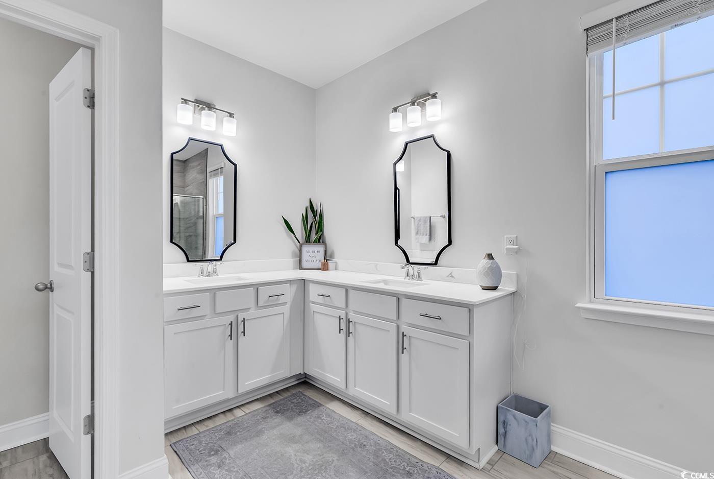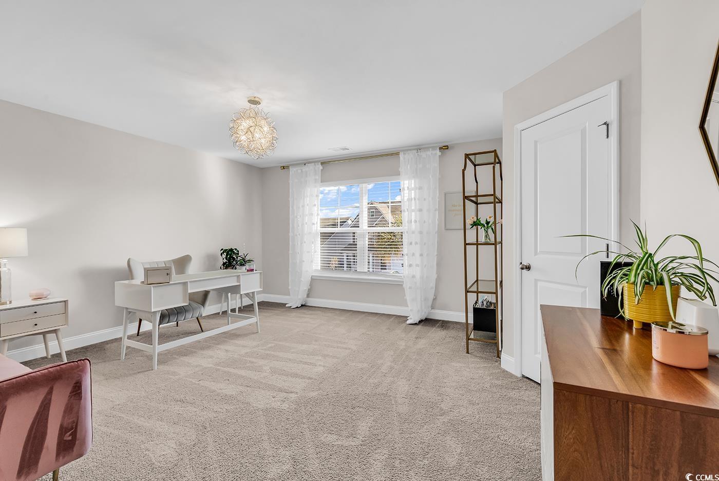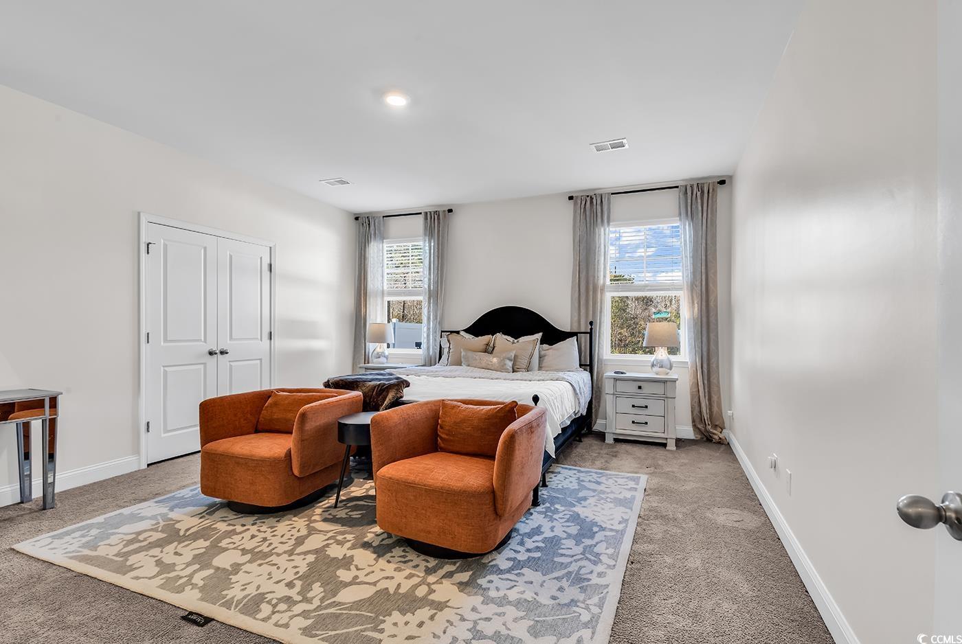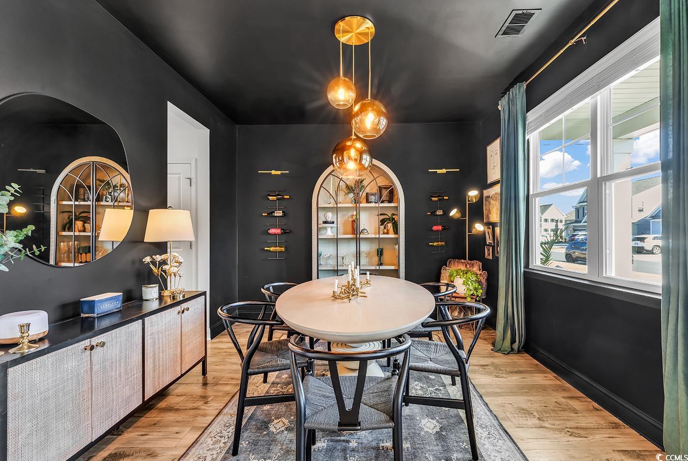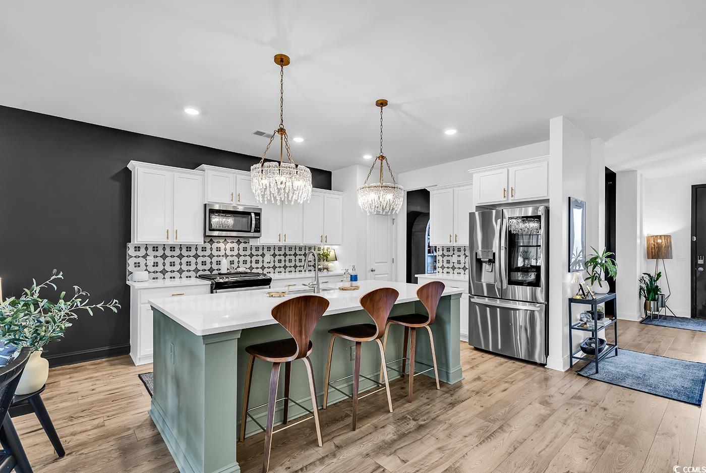 Discover the perfect blend of comfort and elegance in this spacious 5-bedroom, 3.5-bathroom home, nestled in the sought-after The Parks of Carolina Forest. With a private, tree-lined backyard and numerous upgrades, this home is designed for both relaxation and entertainment. Step inside to find a beautifully designed open-concept kitchen, featuring stainless steel appliances, a tiled backsplash, gas range, 36 cabinetry, quartz countertops, and a breakfast bar that flows effortlessly into the expansive living area. Enjoy serene backyard views from this inviting space, or host special occasions in the formal dining room. The main-level living areas boast wide-plank luxury vinyl flooring, offering durability with a modern touch. The first-floor primary suite is a true retreat, featuring a walk-in closet, tiled walk-in shower, private water closet, double vanity sinks, and a linen closet. Upstairs, youll find four additional bedrooms, two full bathrooms, and a large flex spaceideal for a playroom, media room, or home office. This home is situated on a quiet, highly desirable street with a private, wooded backyard. Thoughtful upgrades include a widened driveway, enhanced landscaping with curb edging, rubber mulch, palm trees, and a privacy fence. The entertainment patio, complete with a mounted TV, is perfect for game days or family movie nights. Additional features include a screened-in porch, tankless hot water heater, upgraded smart refrigerator, washer and dryer, and permanent holiday lights for year-round charm. This community has a picturesque setting of ponds, an amazing amenity center, and park of the majestic ""Ten Oaks"" with walking trails to get to the Carolina Forest library. This golf cart friendly community is located in the heart of Carolina Forest, which is close to award winning school systems, major roads such as Hwy 31, shopping and located only 5 miles to the beach. This home has it all and being close to everything else Myrtle Beach and Carolina Forest has to offer is an added plus. Owner is a Licensed SC Realtor.
