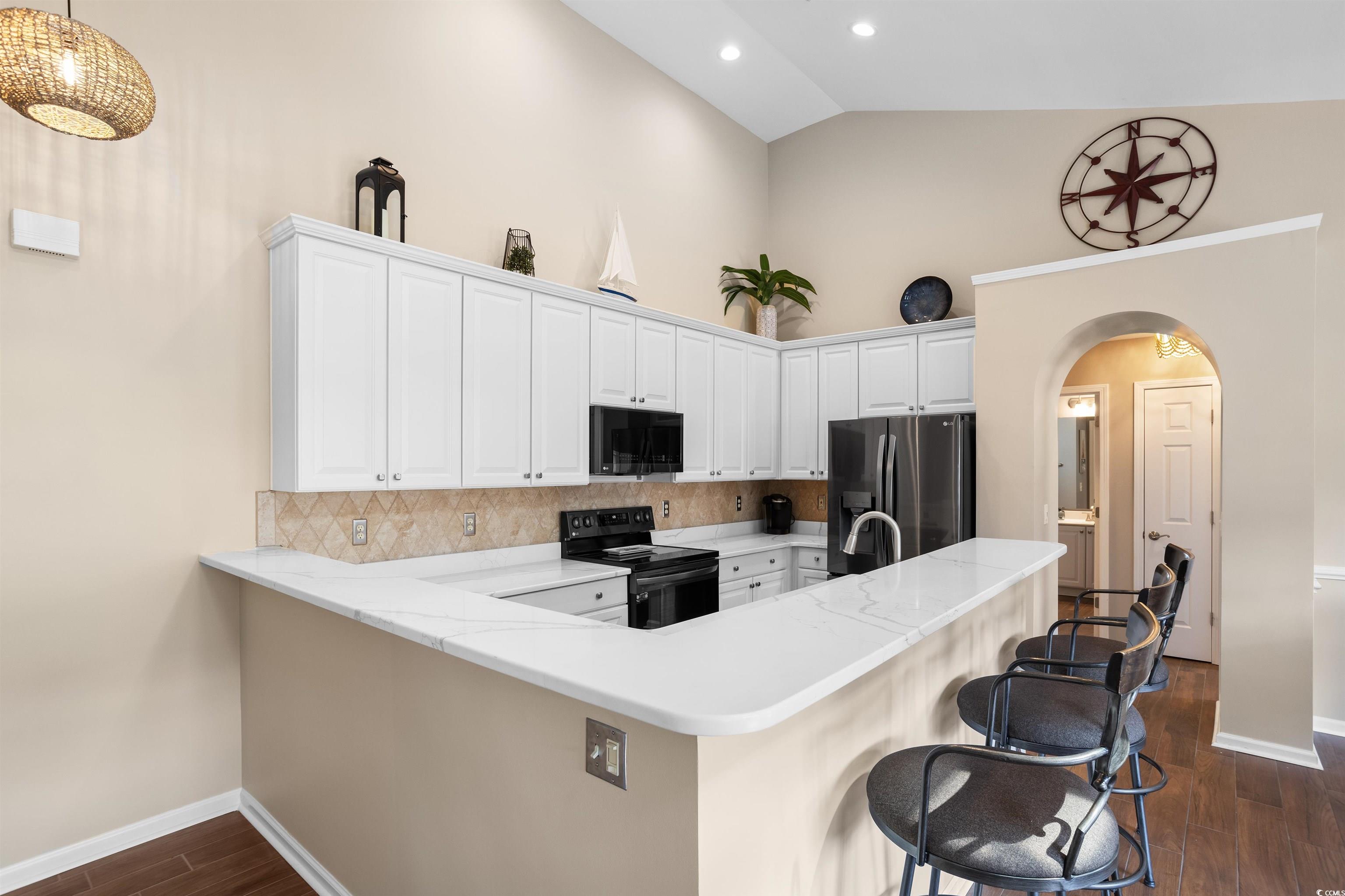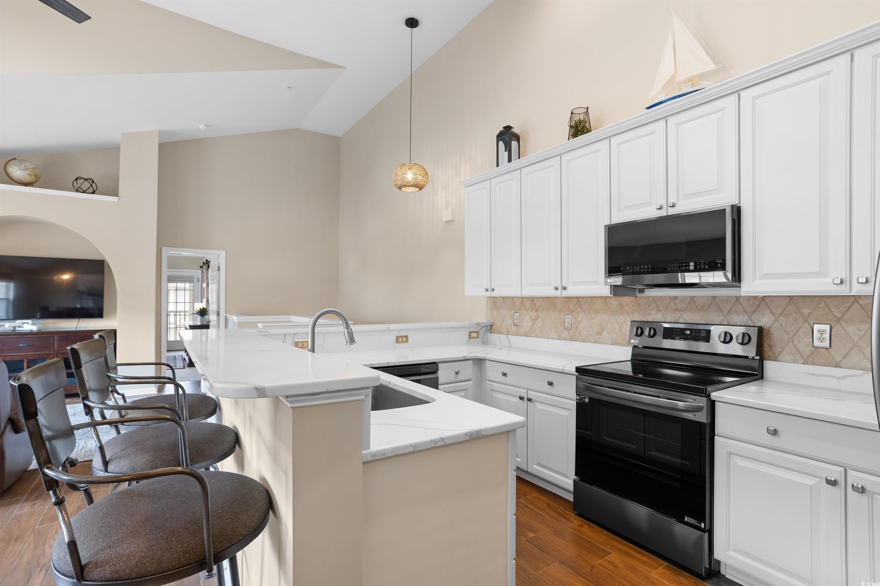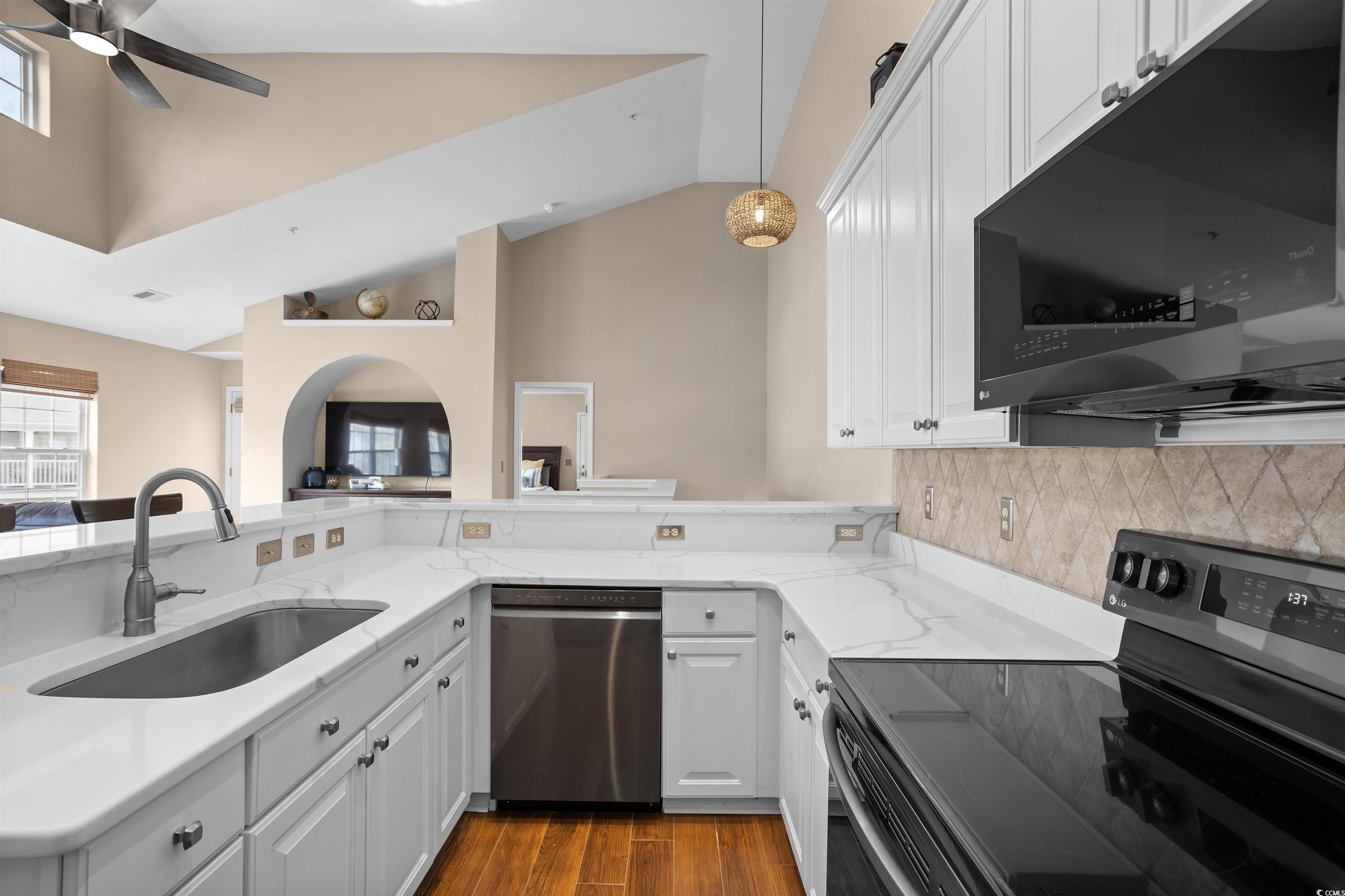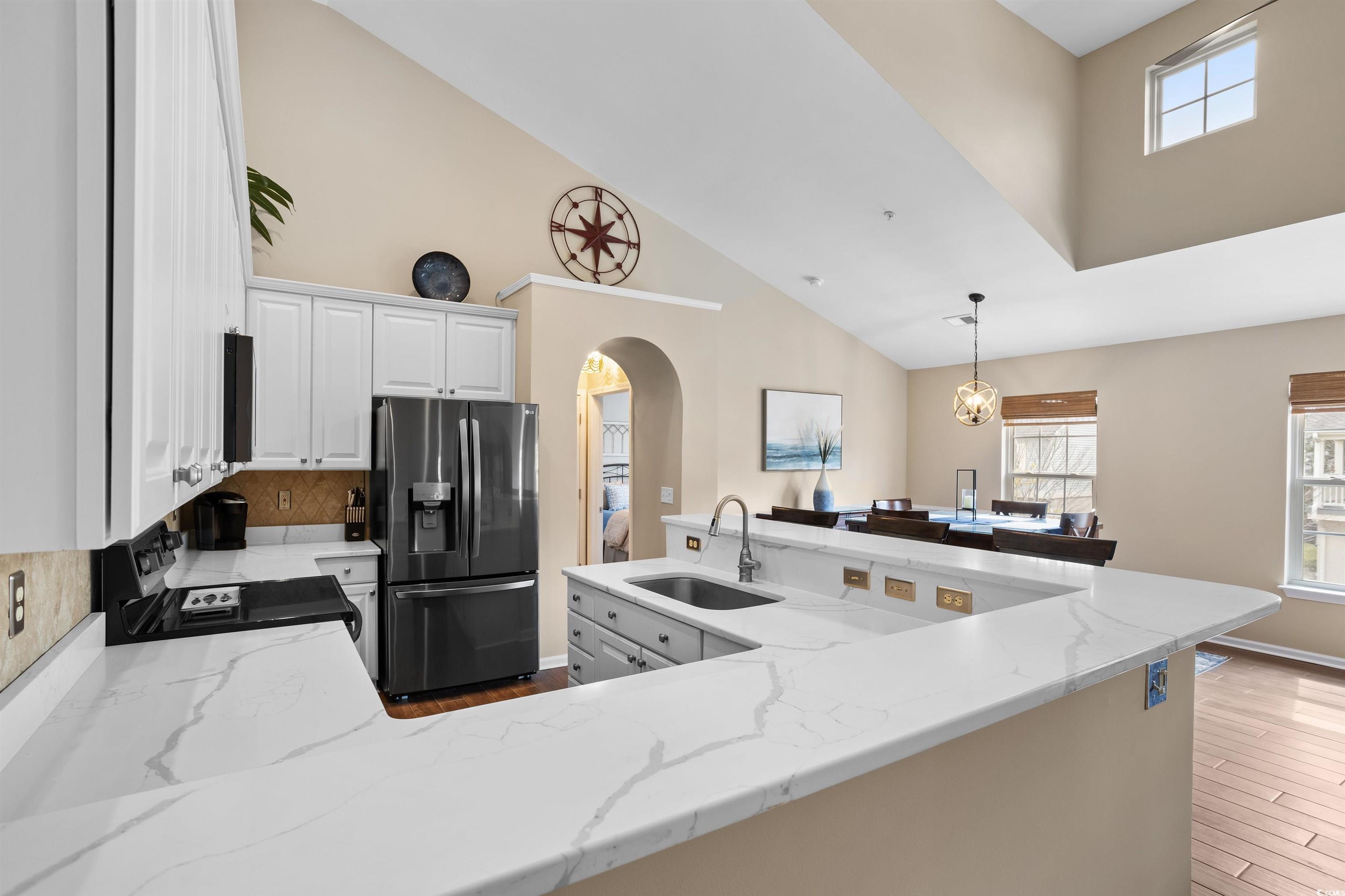 Fully Renovated, FURNISHED & in a Golf Course Community!!! This is a true turnkey property with 2 Bedrooms & 2 Full Bathrooms PLUS Private Garage. Sophisticated, sunny & spacious with vaulted ceilings and designer-chosen details. Brand New Smudge-Proof Black Stainless kitchen appliances (2024), new quartz kitchen counter and large stainless sink (2023), new lighting over dining area and at top of stairs (2024), and hallway fixture (2023). Fresh paint throughout (2024), new TVs (2024), new blinds (2024), large new chair with lighthouse side table (2024), new wood-like ceramic floors in living/kitchen/dining areas plus laundry and both bathrooms (2023). Primary suite upgrades include new barndoor between bedroom and bath (2023), shower glass (2023). Guest bath new shower glass (2023), guest room new ceiling fan (2023). Washer, dryer and refrigerator all convey. New rugs in living and dining areas (2024) PLUS tons more. Don't let this one get away!!! All measurements and square footage are approximate. It is the buyers' responsibility to confirm square footage and HOA information prior to closing.