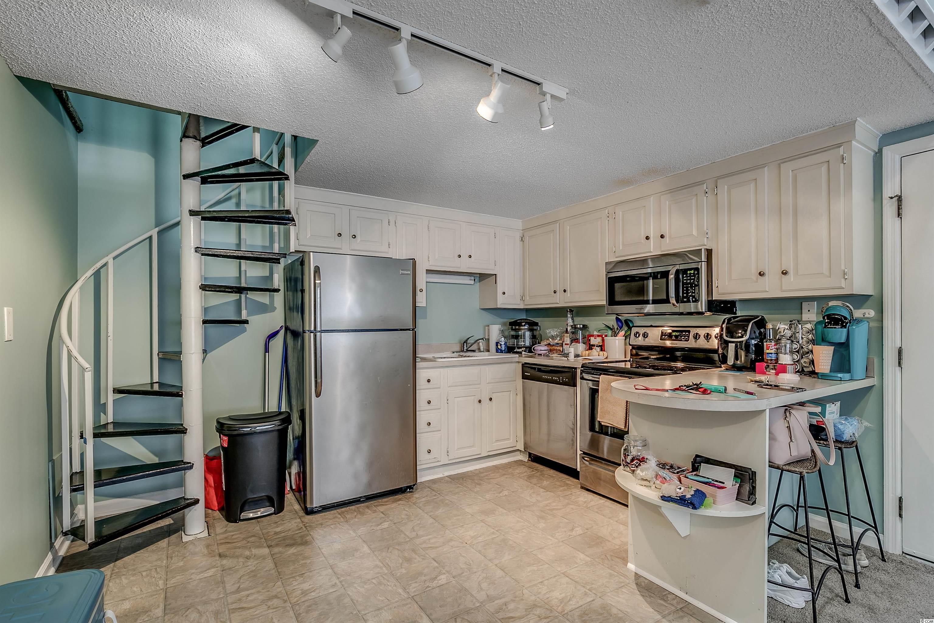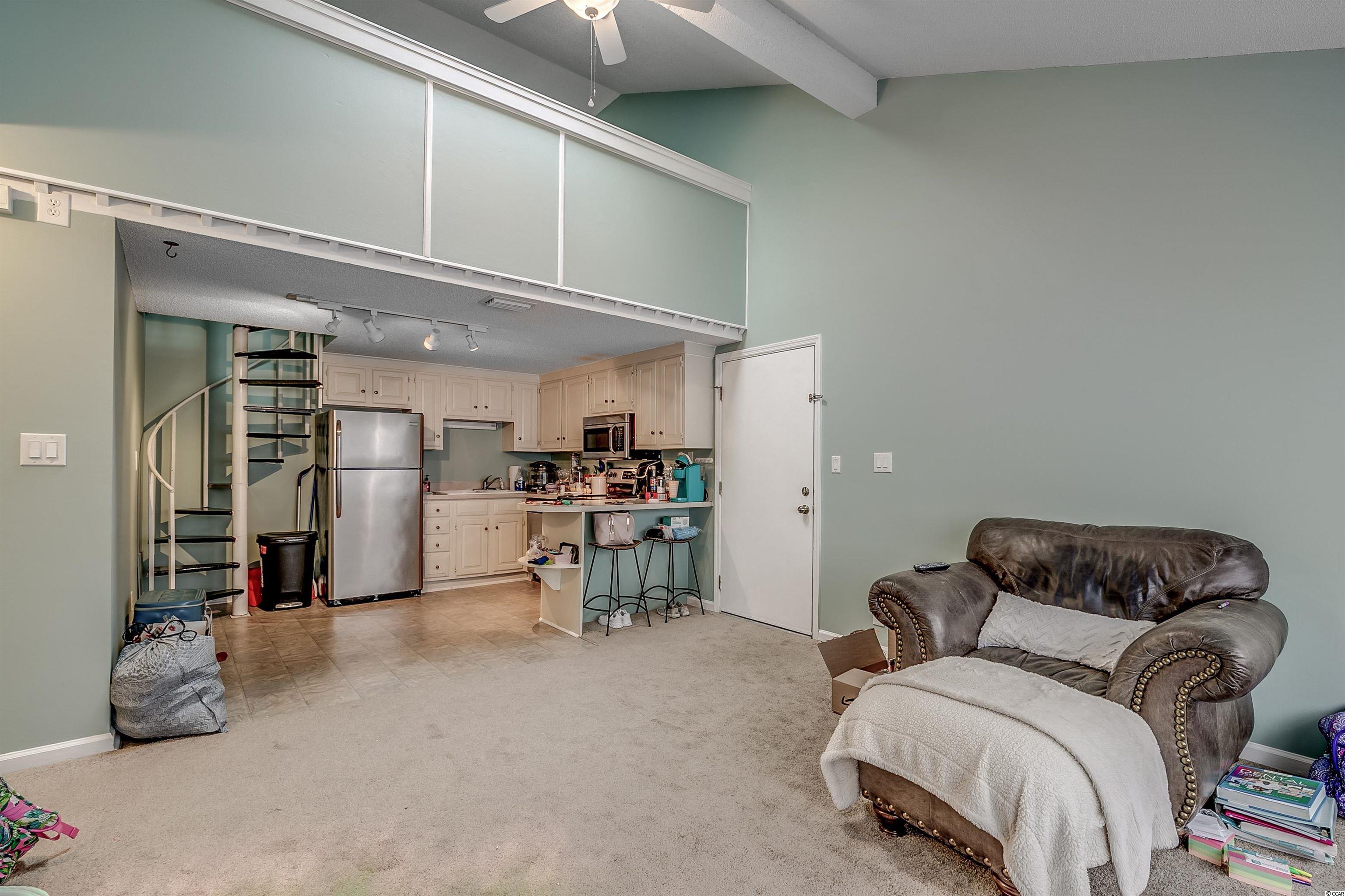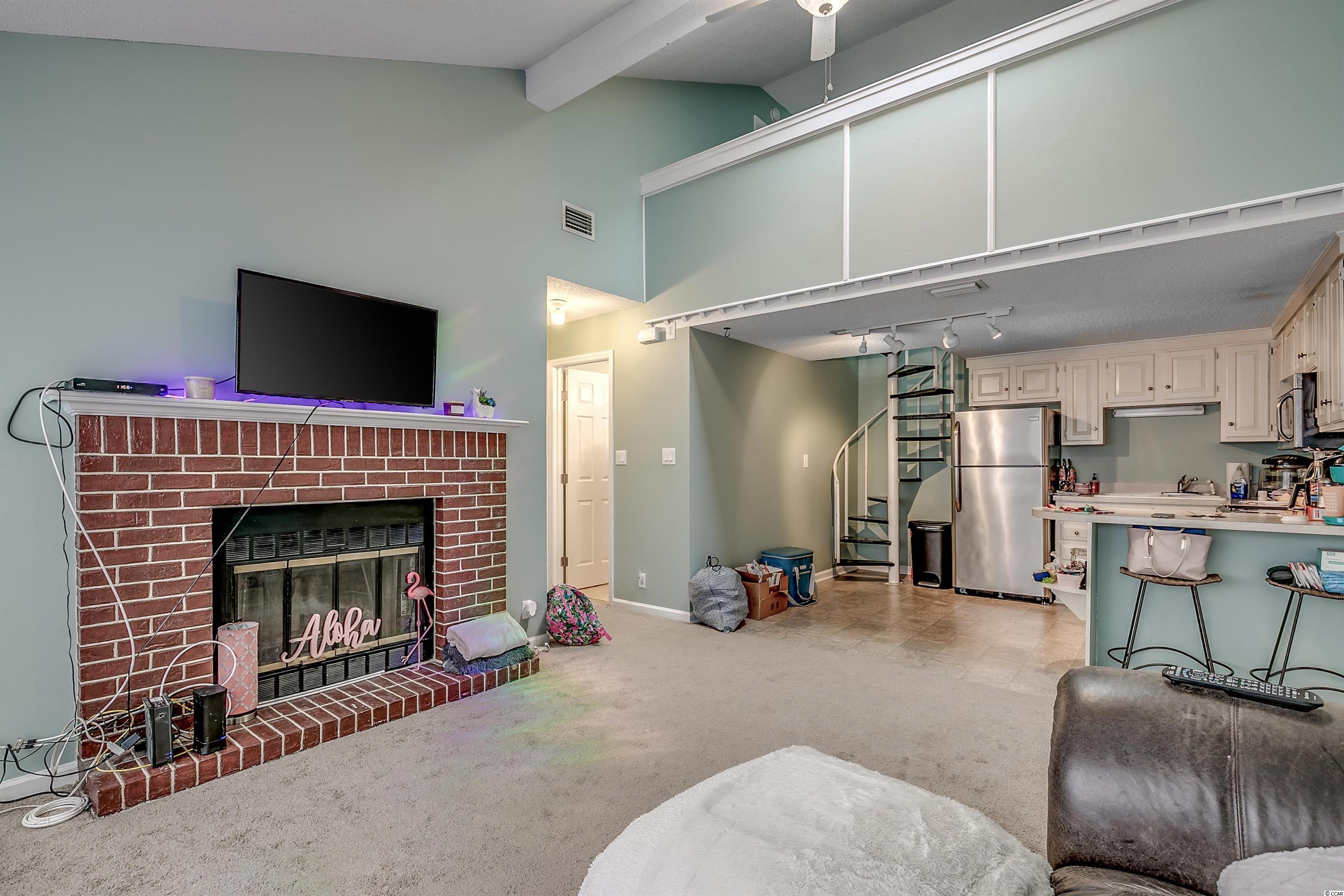 Outstanding location and recently updated! This meticulously cared for unit is perfect for your primary residence, second home or even investment property. Completely turn key and less than a mile from the ocean you'll have everything you need. The open floor plan boasts a fireplace, ceiling fan and bench seating under wall to wall windows letting in tons of natural light. The updated kitchen has stainless steel appliances on vinyl floors with plenty of space in the modern white cabinets. The spacious master bedroom has vaulted ceiling, ceiling fan, a huge walk in closet as well as a private balcony perfect for sipping your morning coffee or watching the sun set after a fun filled day at the beach! The master bath with shower and tub is on the primary level while up the spiral staircase is the second bedroom loft area along with its own private half bathroom. Relax at the community pool or make your way to the beach for fun in the sun. Centrally located, you'll have a blast exploring all the local dining, shopping, and entertainment within reach of your new Myrtle Beach home! Square footage is approximate and not guaranteed. Buyer is responsible for verification.