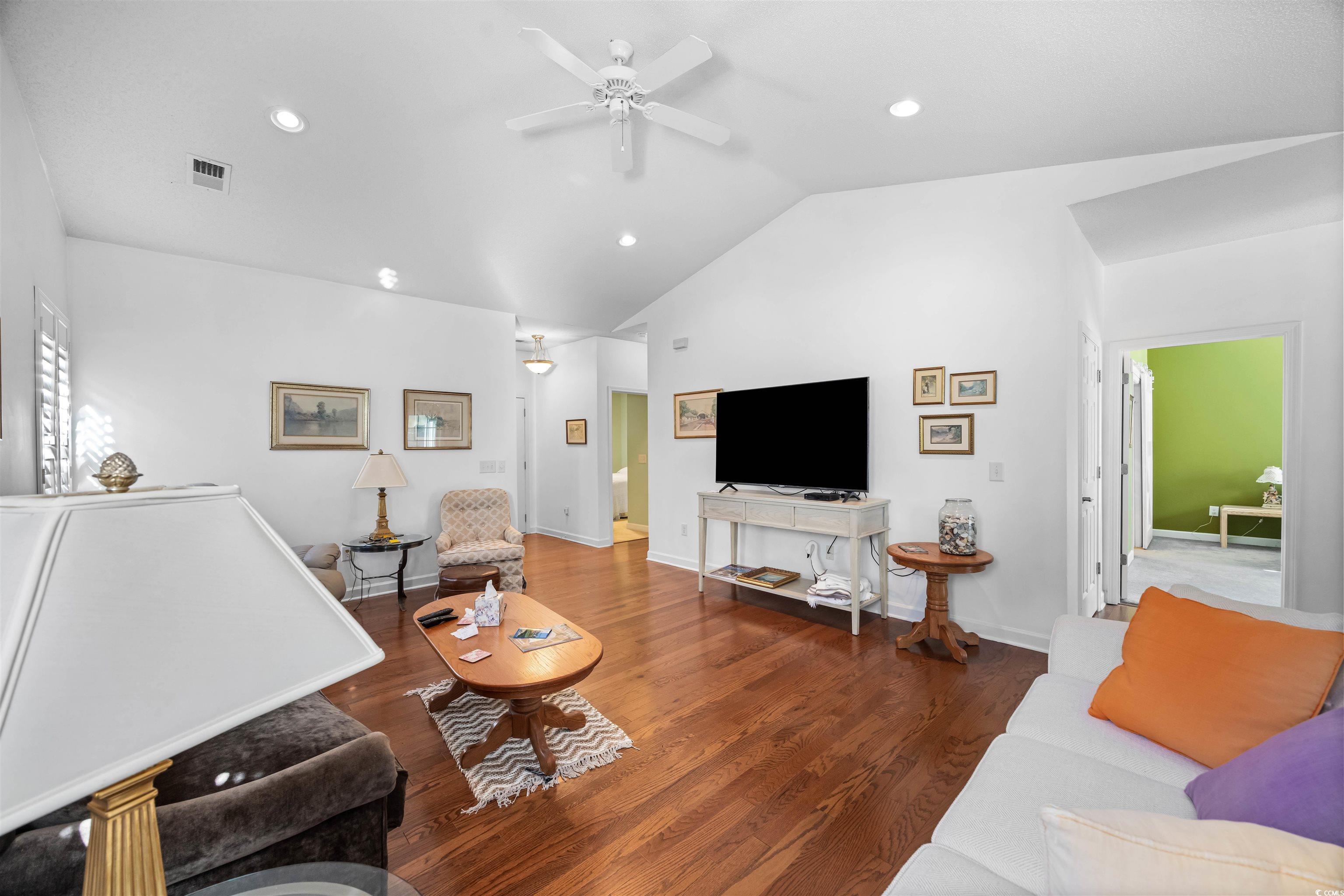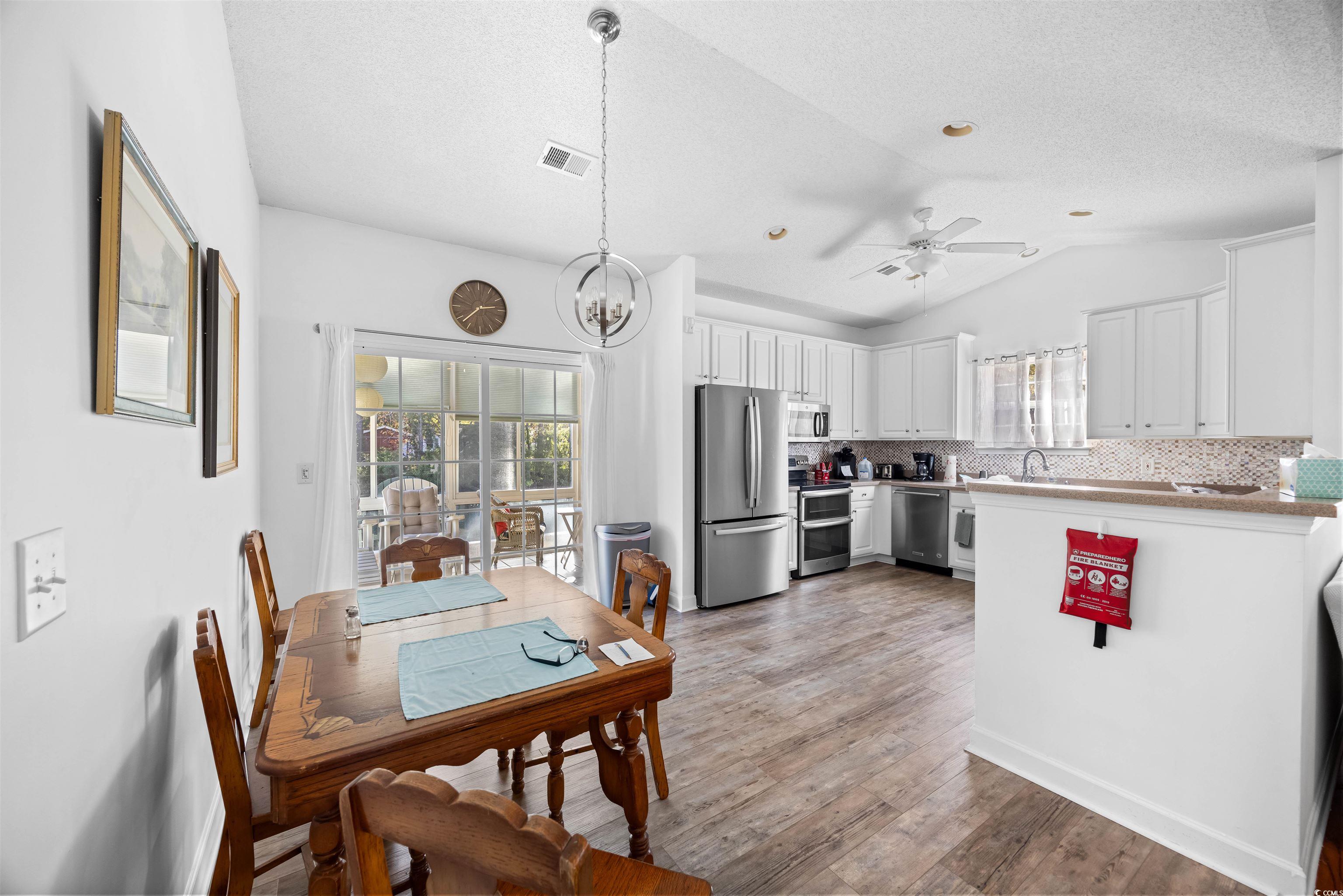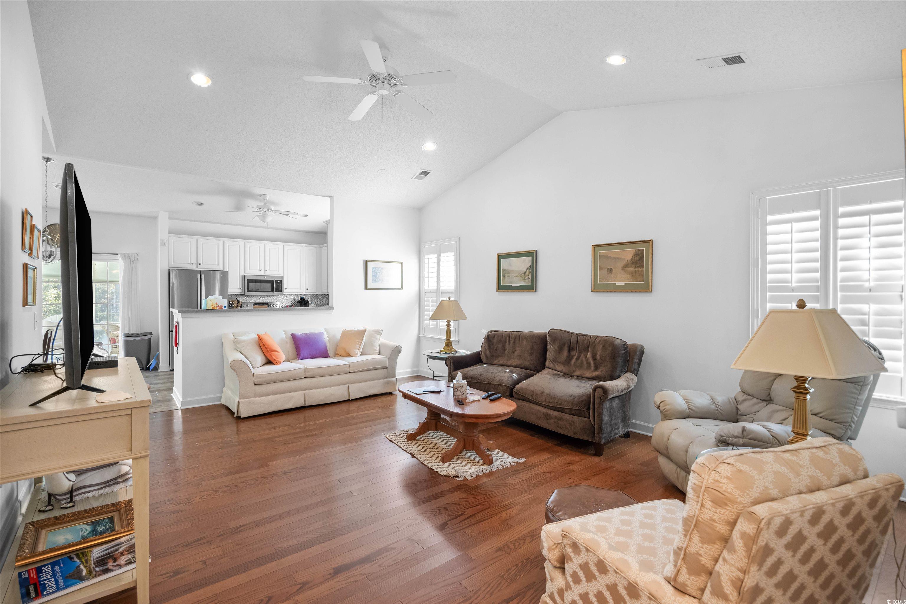 Kings Creek home offers carefree single-level living! Perfect for full-time or second home. Tucked within a quiet paired-ranch subdivision along Kings River Road in Pawleys Island. Enjoy direct access to the Waccamaw Neck Bikeway and close proximity to award-winning golf courses and some of the finest beaches on the east coast. Climate-controlled all-seasons porch and patio boast beautiful lakeside view. Lovely home additionally offers upgrades, open-concept floor plan with vaulted ceiling, three bedrooms, two full baths, and private garage. Community pool is only steps away. New roof installed in 2022. Convenient to schools, medical facilities, shopping, and restaurants.