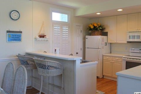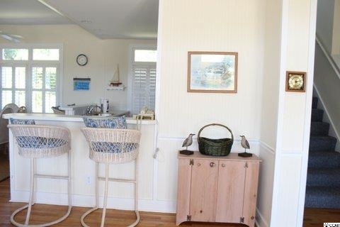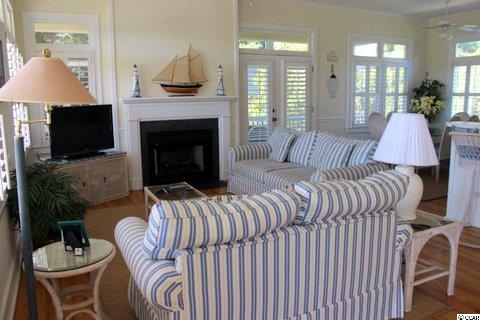 Hardwood floors in living area, Plantation Shutters throughout. New stove and living room furniture. All new TVs. Golf cart will convey. Extra large master bedroom with huge walk-in closet and bath. Has a great front porch overlooking the pool and pond. Also has a screened porch.