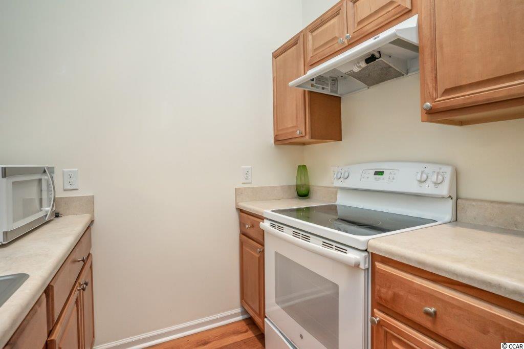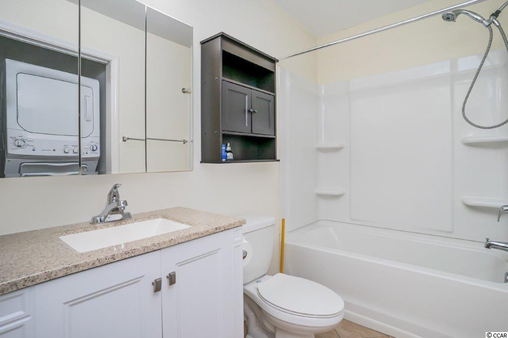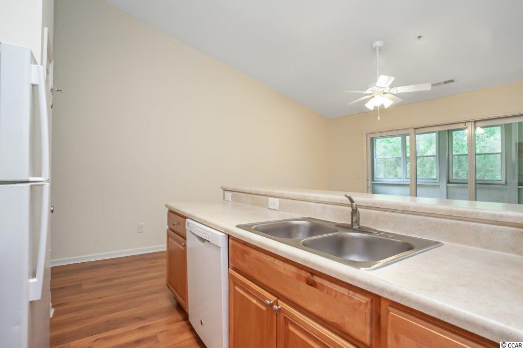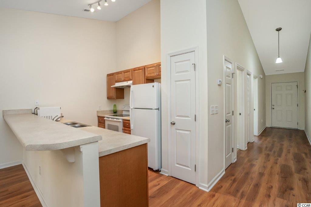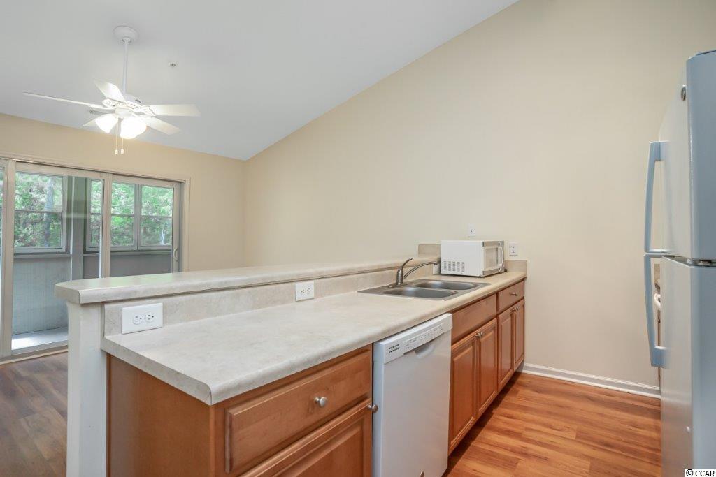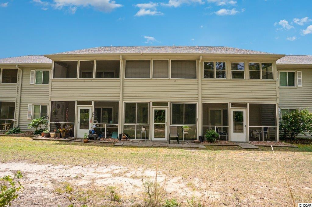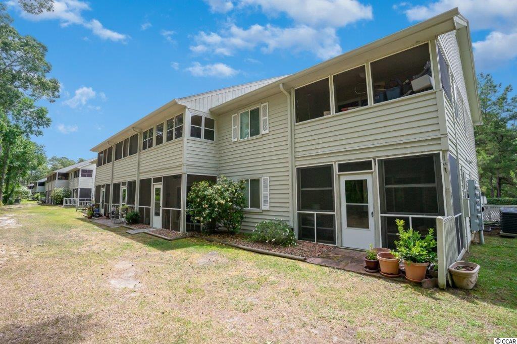 Looking for your dream vacation getaway? This is it! Located in the popular Island Green community, this immaculate 1 bed 1 bath condo has so many great features and is move in ready! Rebuilt from the ground up in 2016 to current building codes after building was destroyed in a fire, the unit was updated with new appliances, HVAC , cabinets , flooring and sprinkler system. Wonderful open floor plan boasts vaulted ceilings throughout that give the unit an open and airy feel, laminate floors in the living room and kitchen and ceiling fans in the living room , bedroom and screen porch. The spacious living room and dining area has direct access to the rear porch and is adjacent to the fully equipped kitchen that boasts abundant cabinet and counter space, double sink, an extended breakfast bar and a pantry. The nice sized bedroom has plenty of closet space and the bath has tile floors, a vanity, tub/shower and wall cabinet for additional storage . There is also a stack washer and dryer in the unit. The expansive screen porch with storm windows overlooks a serene wooded area and is the perfect spot to enjoy your morning coffee or relax with cocktails at the end of the day. HOA dues includes water/ sewer, trash, outdoor pool, landscaping, pest control, Spectrum cable/internet , exterior building insurance, and the community is gated after 7 PM with a security guard . Wonderful location just minutes from shopping, dining, golf , the airport, Market Common, and best of all the beach and everything the Grand Strand has to offer in amusements and entertainment! Perfect as a primary home, private beach retreat and would also be a great investment property as both short and long term rentals are permitted. This is a fantastic opportunity! Don't miss it! Make an appointment today to view this delightful condo!