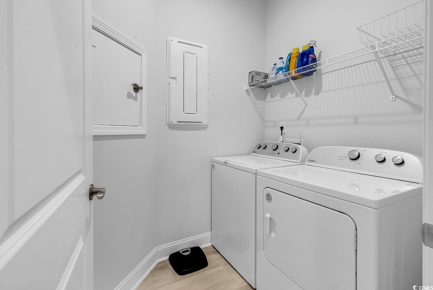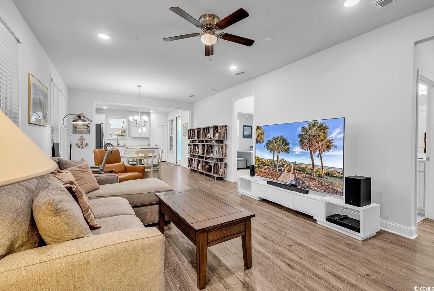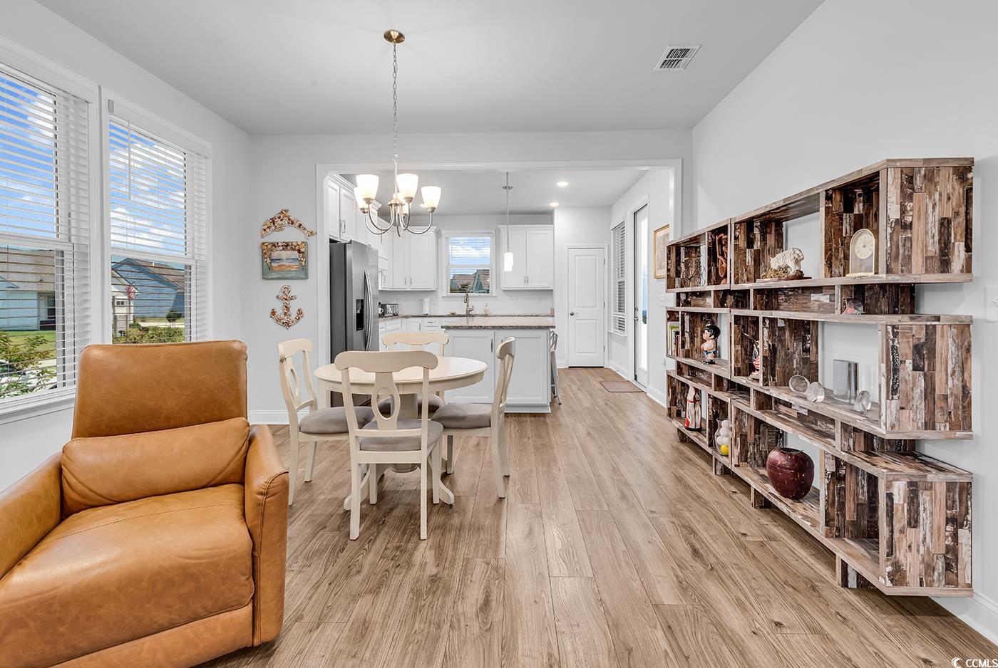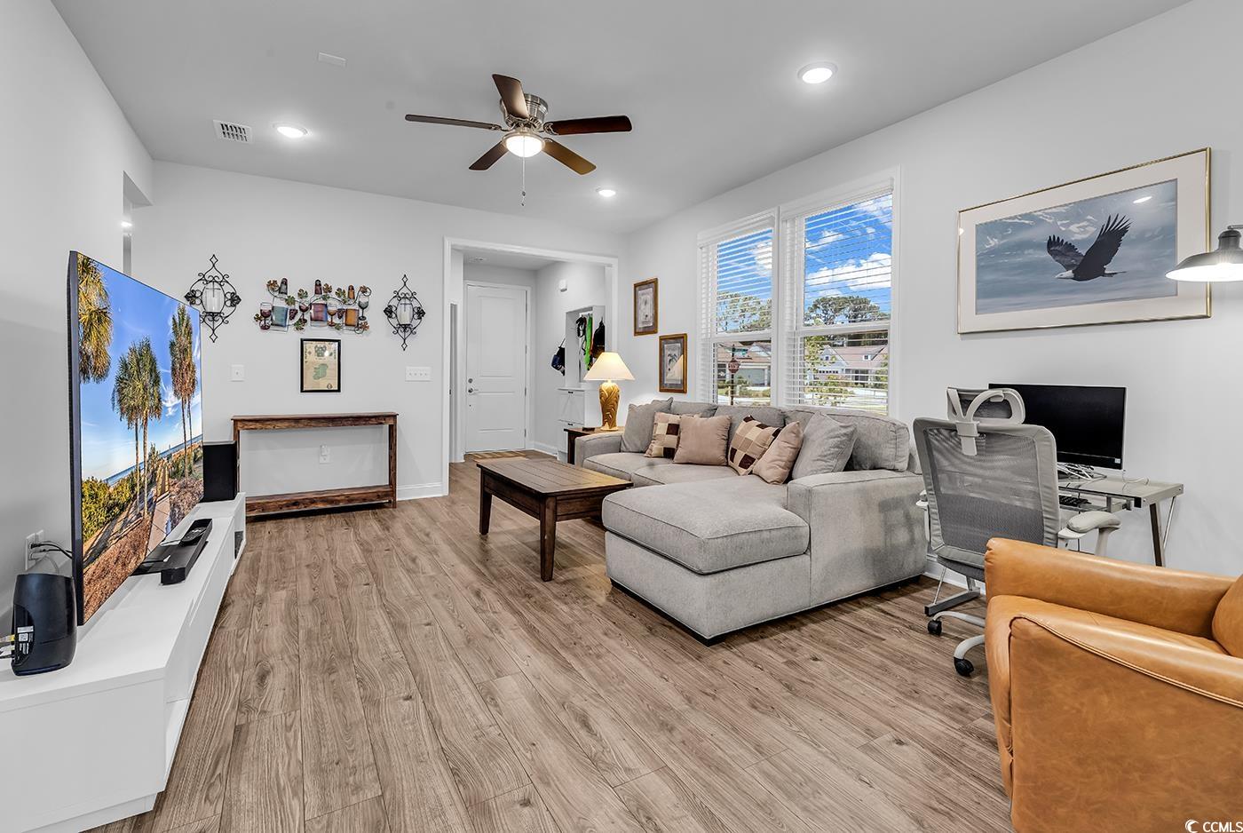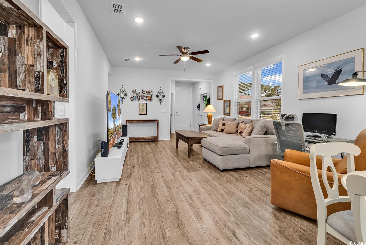 Del Webb North Myrtle Beach -- GREAT OPPORTUNTY!! Don't miss this move in ready home! Welcome to this beautiful Compass model home that is nearly new (just 2 years old).... you will appreciate all the special touches this immaculate home includes and love the location where you can enjoy all the onsite amenities AND golf cart to the beach! Living in the Del Webb North Myrtle Beach community (55+) offers unmatched amenities for resort style living all year long including resort style pool with cabanas, hot tubs and outdoor cooking space, indoor pool, well equipped fitness center, 8 pickleball courts, putting green and Bocce court. This home is situated on a corner lot with tons of windows providing great light throughout the home. The kitchen features, generous fresh white cabinets, plenty of counterspace, stainless steel appliances including built in oven and microwave, gas cooktop and refrigerator (all appliances convey) plus a huge island that is perfect for entertaining or as a casual breakfast bar. Flooring includes easy care Laminate wood floors, ceramic tile in bathrooms and laundry room and cozy carpet in the bedrooms. The den/flex room is ideal for a small office or den or additional spot for guests. Primary bedroom with plenty of light opens to the primary bath with dual sinks and a convenient ceramic tile walk in shower. The walk in closet offers plenty of space for all your clothing and shoes! Great room and bedrooms include quality overhead fans, brushed nickel hardware and upgraded trim throughout. Enjoy relaxing in the screened in patio and with a walking path just outside the back of the home means an easy walk to enjoy all of the amenities. This home does include less than 2 year old Whirlpool appliances; all kitchen appliances and washer and dryer come with a pre paid 5 year warranty -with 3 years remaining for new owners. In addition the windows have been professionally tinted to repel harsh sunlight and yet still allow light in. The garage features an epoxied floor, shelving units that remain and a pull down attic with storage. An electronic screen door in the garage provides privacy and air ventilation in more moderate weather. There is an irrigation system as well as a tankless hot water heater. The HOA includes landscaping yard care, all amenities, High Speed WIFI and cable plus a full time Lifestyle Director who coordinates a full calendar of activities, clubs, classes, parties and events. You'll feel like your on vacation when you live here! Just minutes to the beach with easy golf cart access. Be sure to check out this home soon as it is ready for new owners to enjoy all this community has to offer.