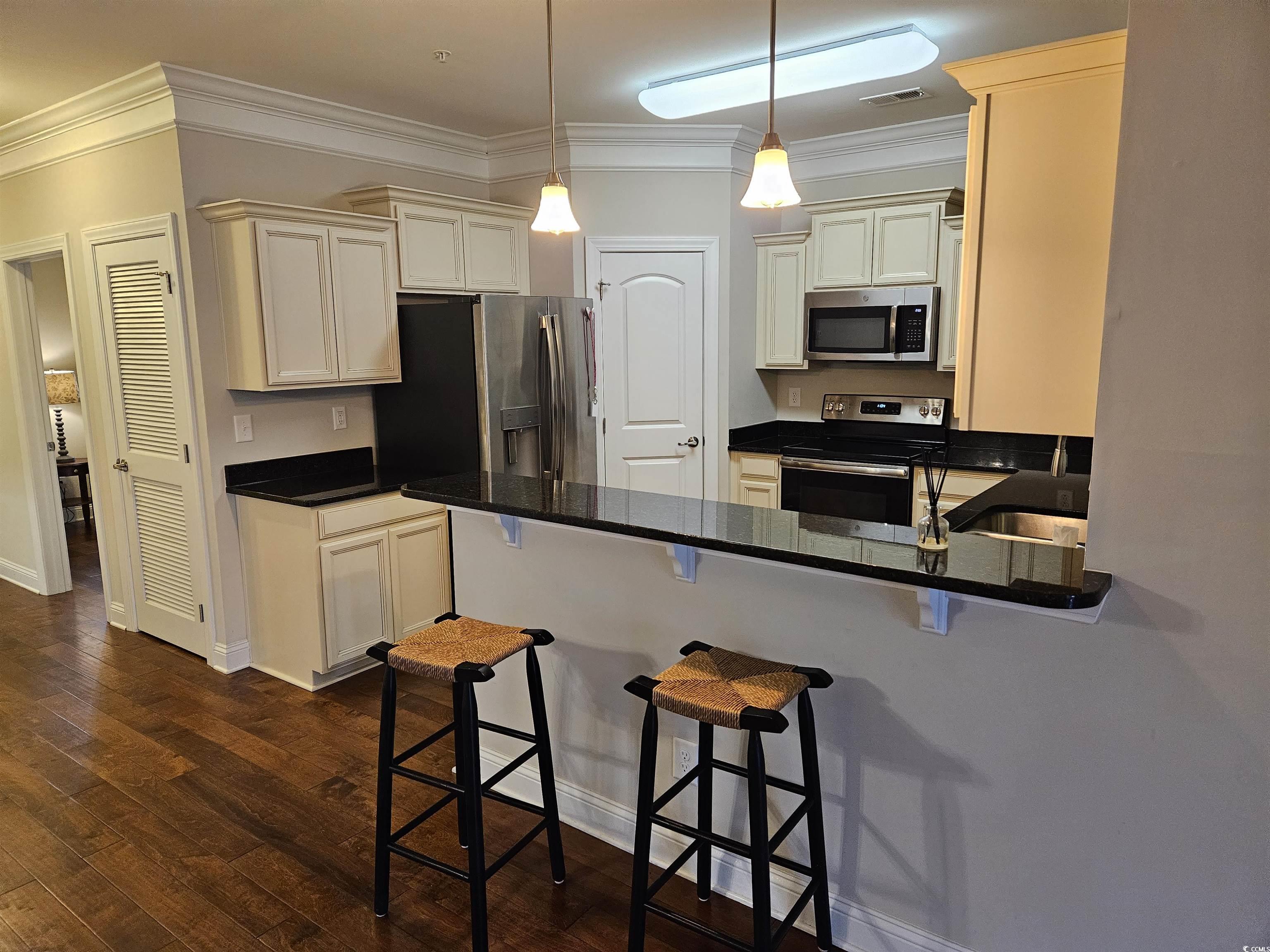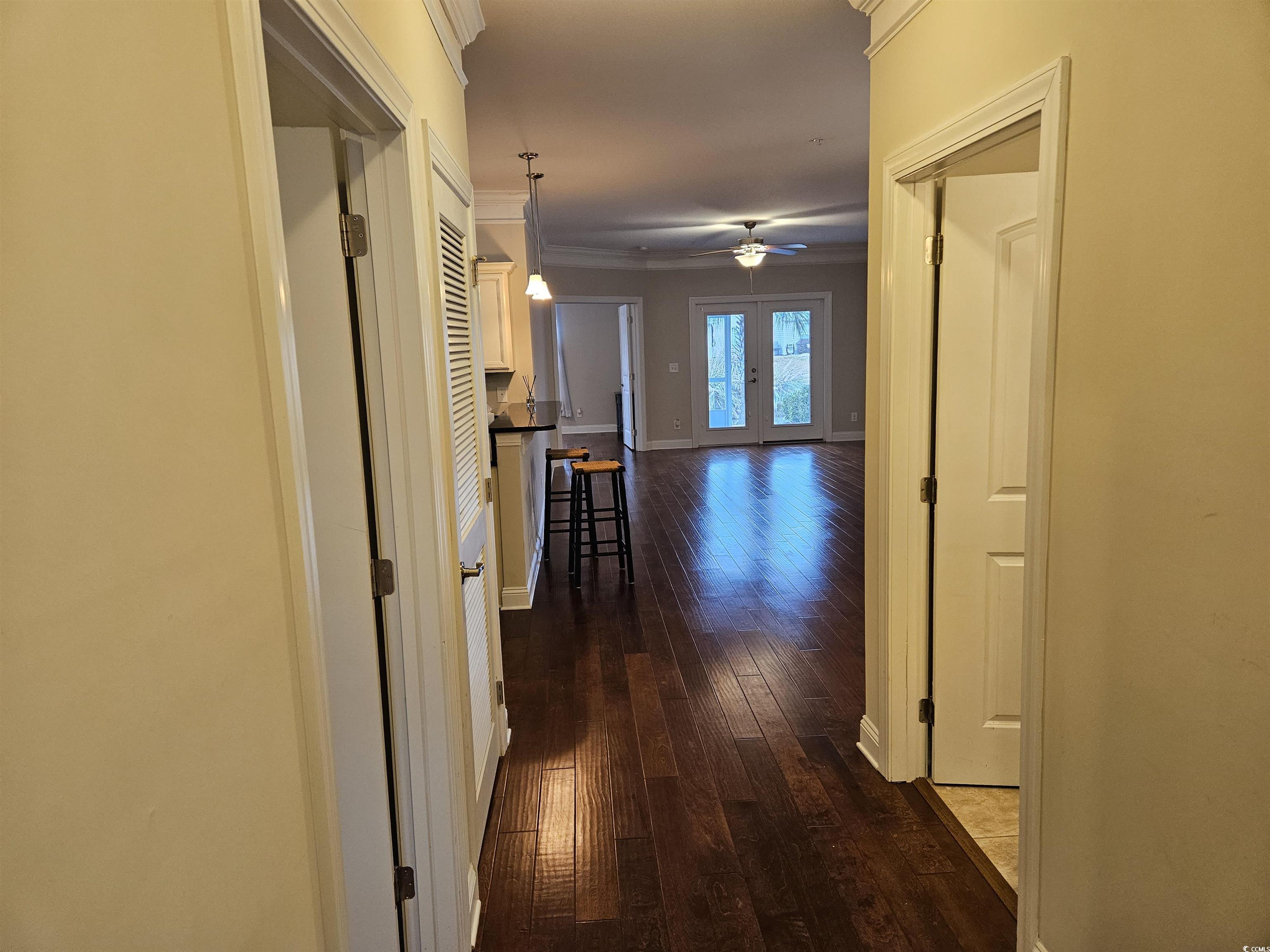 Located in one of the most successful condo developments in the Myrtle Beach area, this first floor interior unit is a 2 bedroom 2 bathroom beautiful condo in the very popular Queens Harbour Development! This unit offers a spacious kitchen with walk-in pantry, outside storage, split bedroom floor plan with a double-door entry to the Master Suite, 9' smooth ceilings and a screen porch and patio. The amenity package includes a resort style swimming pool with club house, conveniently located picnic areas with grills and an oversized ELEVATOR to all floors. Move in ready ugrades include hardwood flooring, granite kitchen tops, tile baths, crown molding french door refrig, and washer dryer Virtual tour is a model replica of builders model.