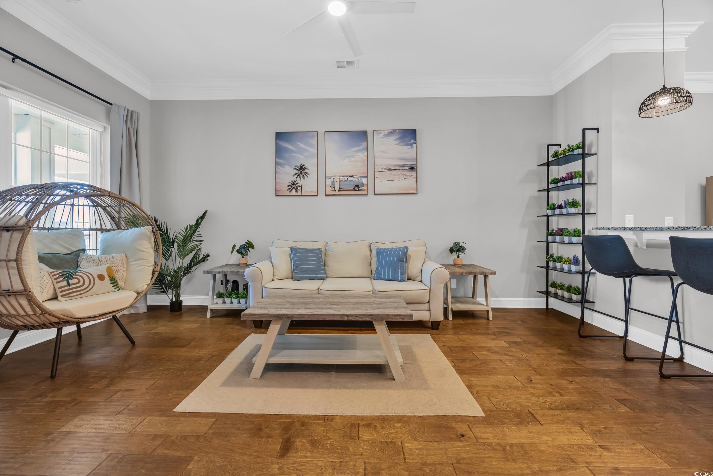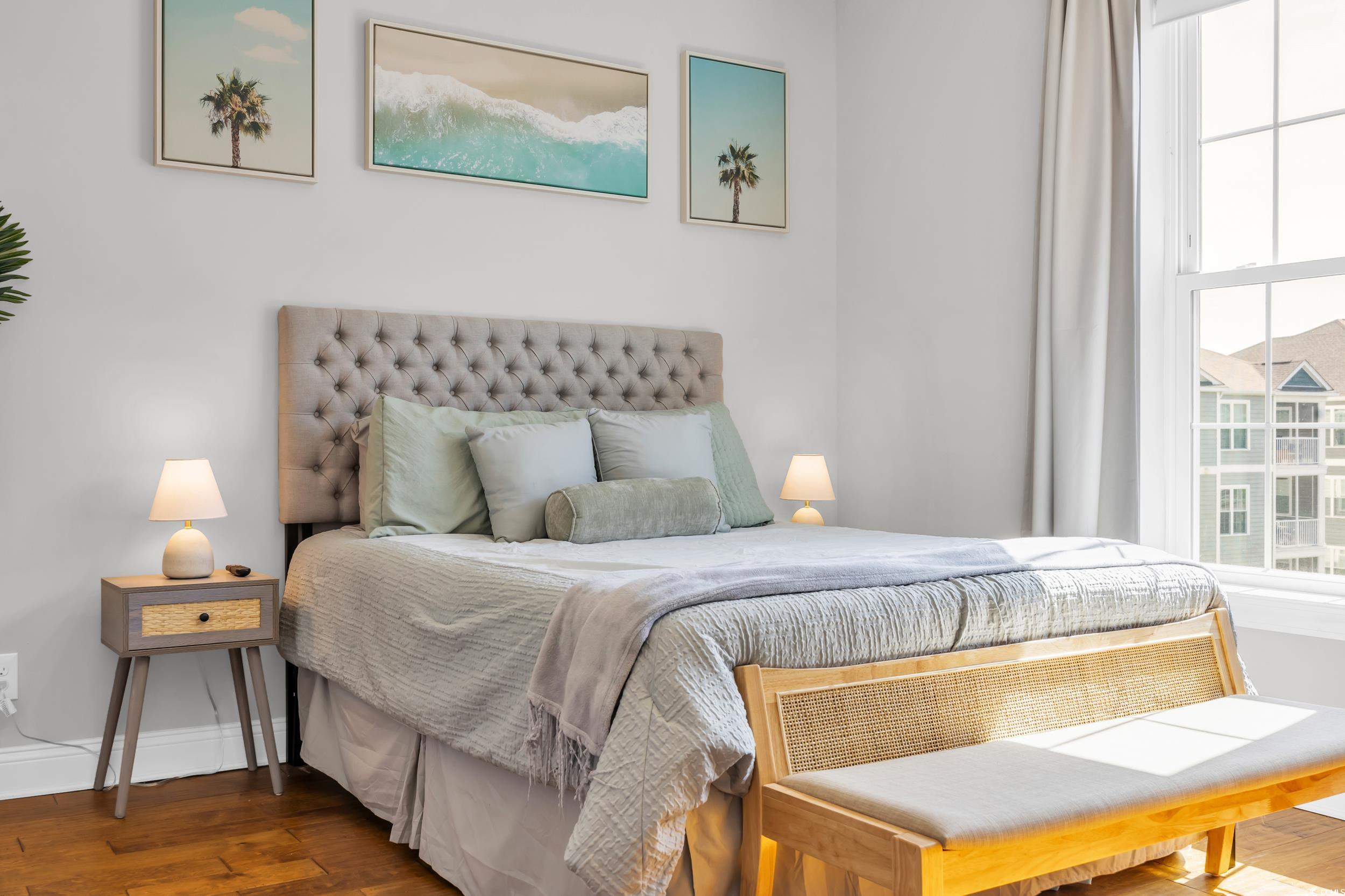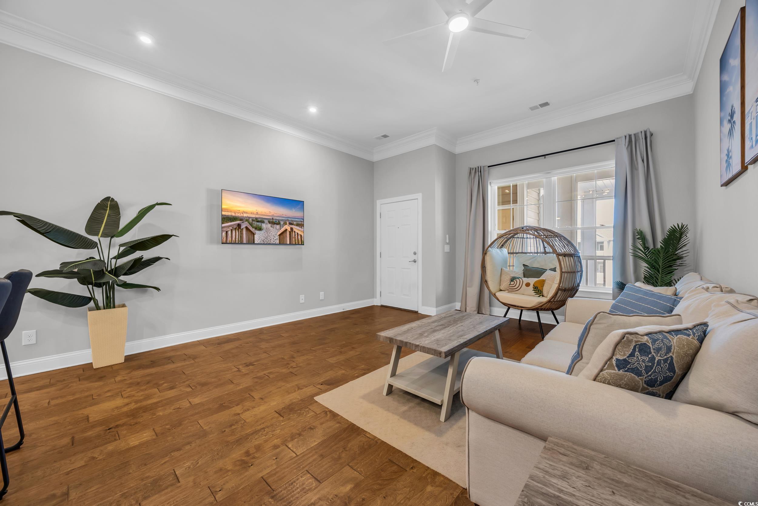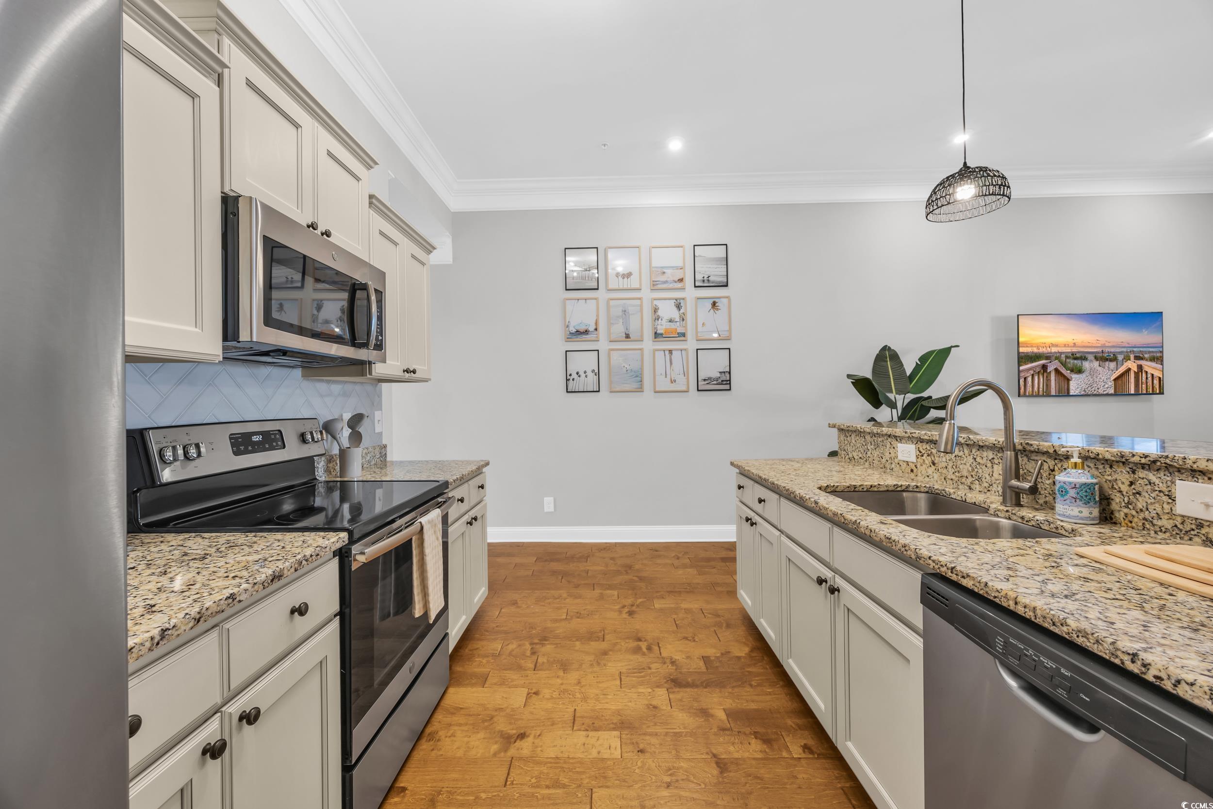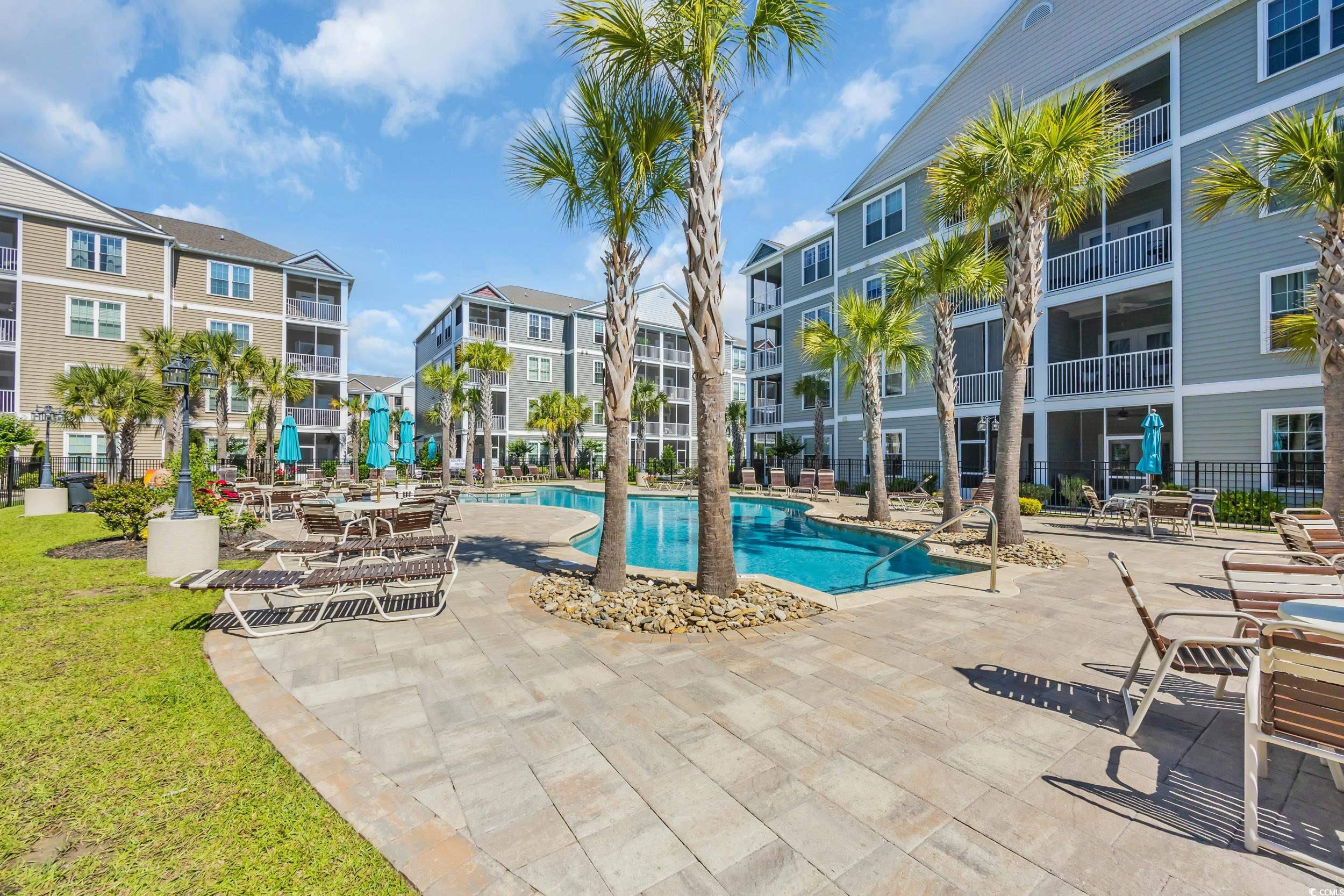 Welcome to this beautifully maintained 1-bedroom, 1-bath condo nestled in the desirable Queens Harbor II community in Surfside Beach. Located on the 4th floor just steps from the elevator, this unit offers both convenience and comfort. Step inside to a spacious living room with 10 ft ceilingsperfect for relaxing or entertaining. The rest of the unit offers 9 ft ceilings throughout. The kitchen features charming cream cabinetry, stainless steel appliances, granite countertops, a updated herringbone ceramic tile backsplash, and a bar-height counter for casual dining. A convenient pantry adds great storage space. Down the hallway, youll find a full bathroom complete with a tub/shower combo and a tucked-away washer and dryer for ease and efficiency. The primary bedroom offers ample space for a desk, reading nook, or additional furniture. This bedroom also overlooks the gorgeous community pool area. Recent updates include modern LED light fixtures and a nest thermastat. Residents enjoy access to the pool and recreational facilities, all within a peaceful, well-kept community close to dining, shopping, and just minutes from the beach. Whether youre looking for a primary residence, vacation getaway, or a smart investment opportunitythis immaculate condo checks all the boxes. Dont miss your chance to own a piece of Surfside Beachschedule your private showing today!