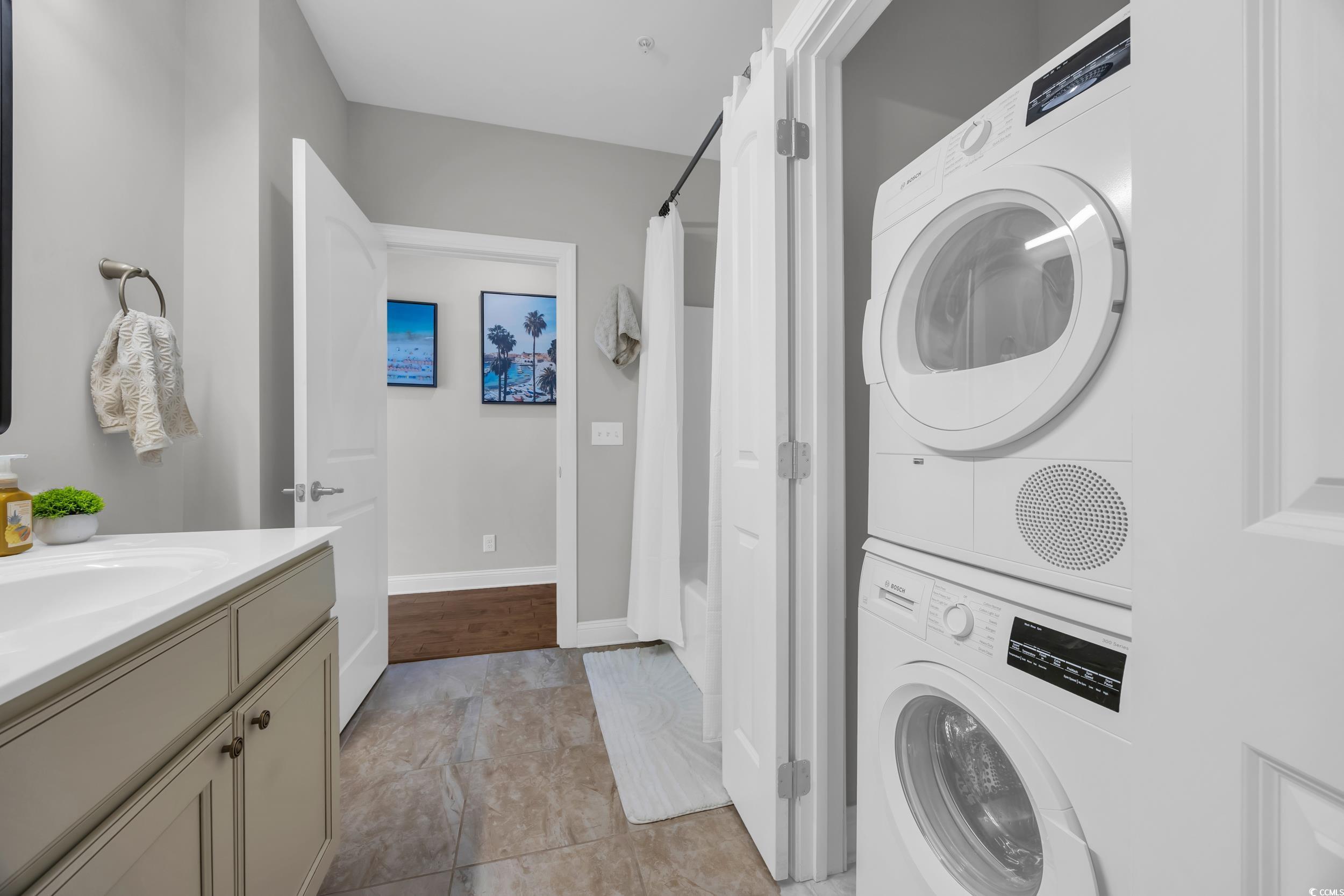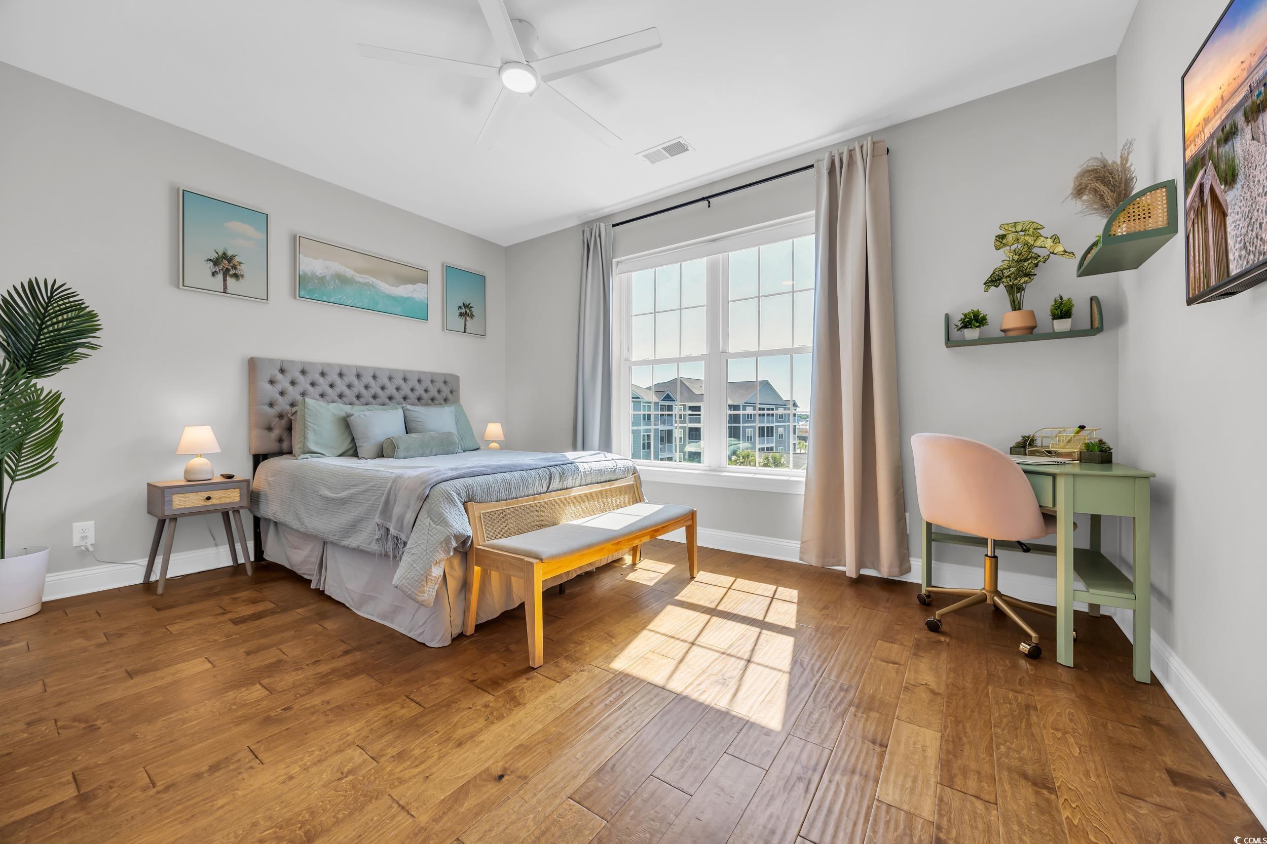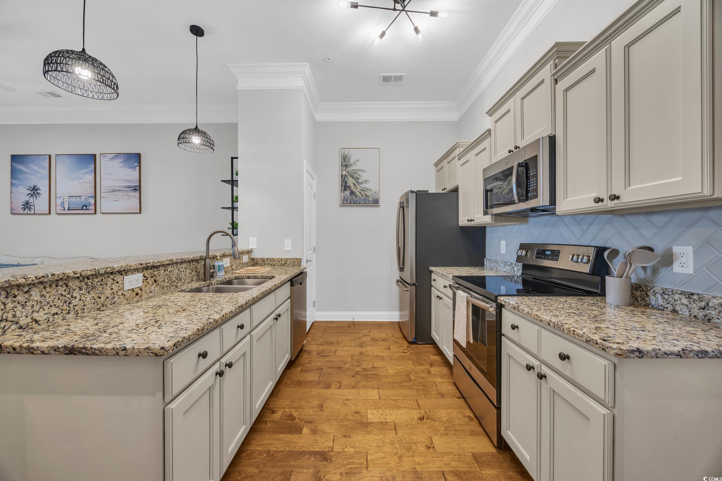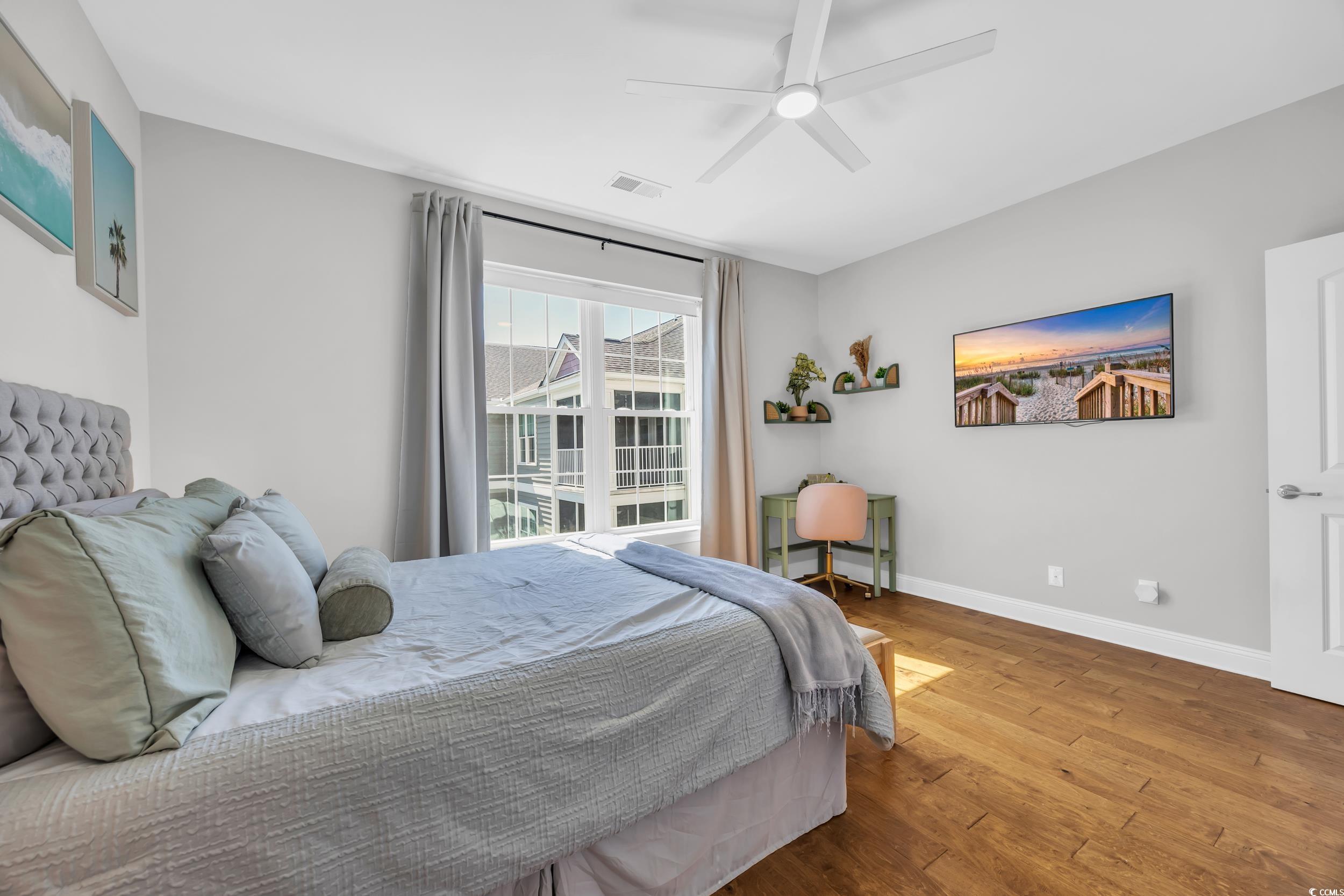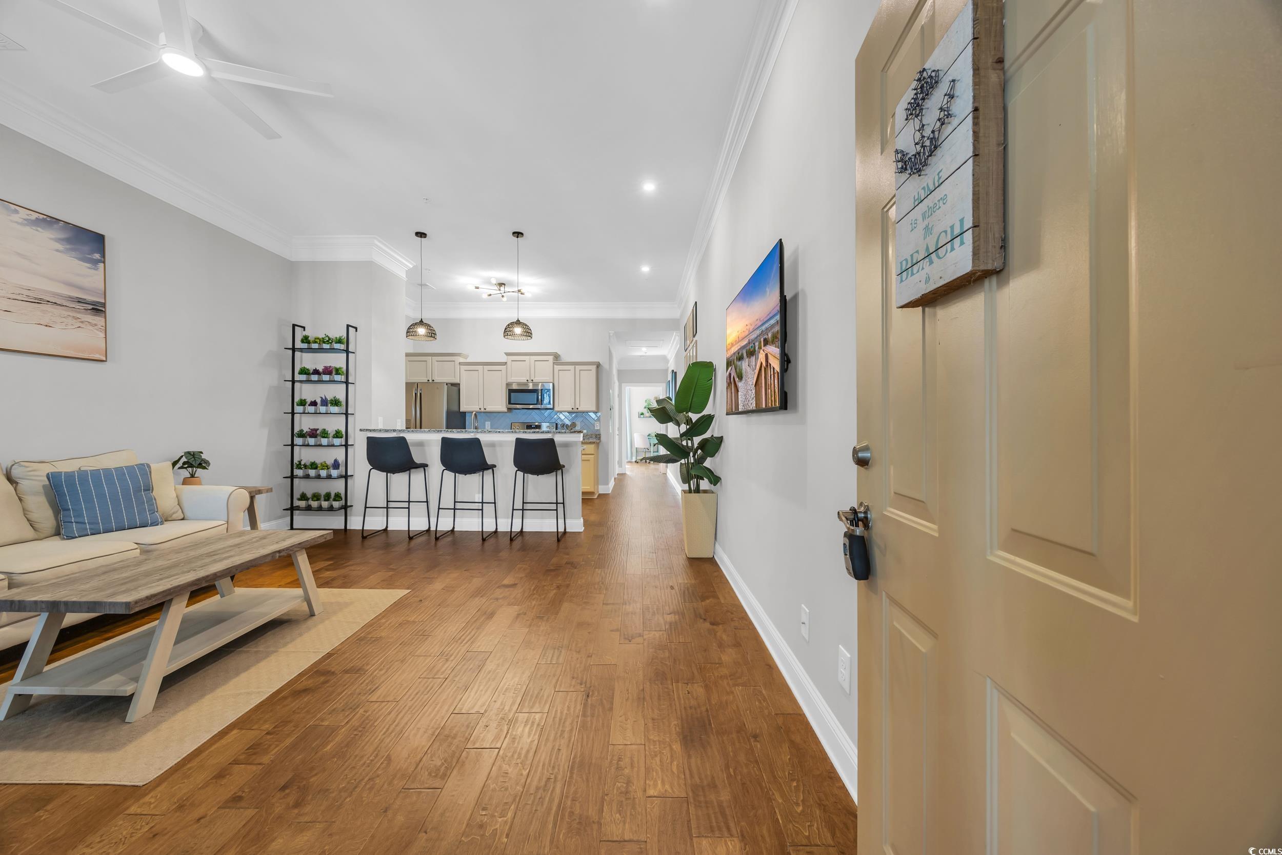 Welcome to this beautifully maintained 1-bedroom, 1-bath condo nestled in the desirable Queens Harbor II community in Surfside Beach. Located on the 4th floor just steps from the elevator, this unit offers both convenience and comfort. Step inside to a spacious living room with 10 ft ceilingsperfect for relaxing or entertaining. The rest of the unit offers 9 ft ceilings throughout. The kitchen features charming cream cabinetry, stainless steel appliances, granite countertops, a updated herringbone ceramic tile backsplash, and a bar-height counter for casual dining. A convenient pantry adds great storage space. Down the hallway, youll find a full bathroom complete with a tub/shower combo and a tucked-away washer and dryer for ease and efficiency. The primary bedroom offers ample space for a desk, reading nook, or additional furniture. This bedroom also overlooks the gorgeous community pool area. Recent updates include modern LED light fixtures and a nest thermastat. Residents enjoy access to the pool and recreational facilities, all within a peaceful, well-kept community close to dining, shopping, and just minutes from the beach. Whether youre looking for a primary residence, vacation getaway, or a smart investment opportunitythis immaculate condo checks all the boxes. Dont miss your chance to own a piece of Surfside Beachschedule your private showing today!
