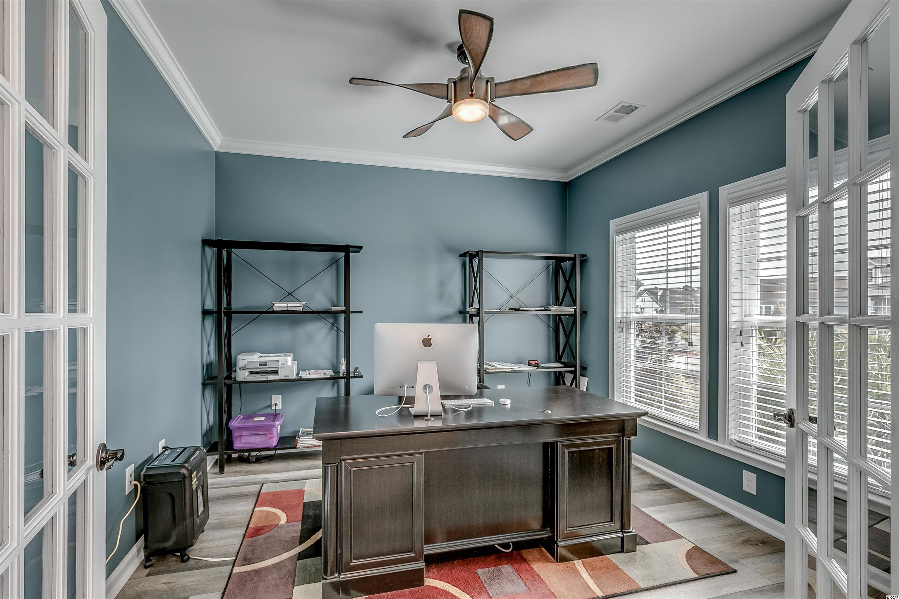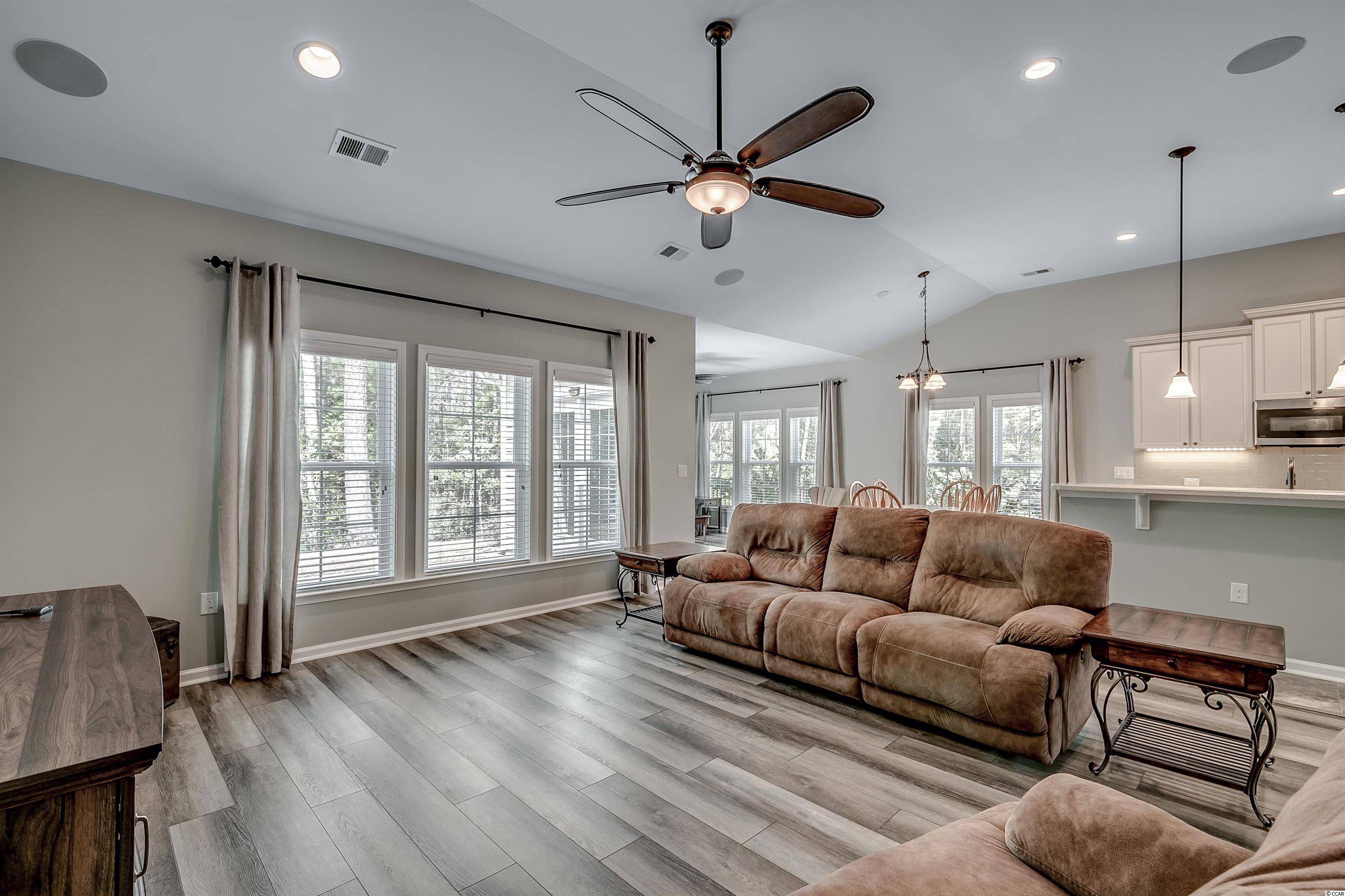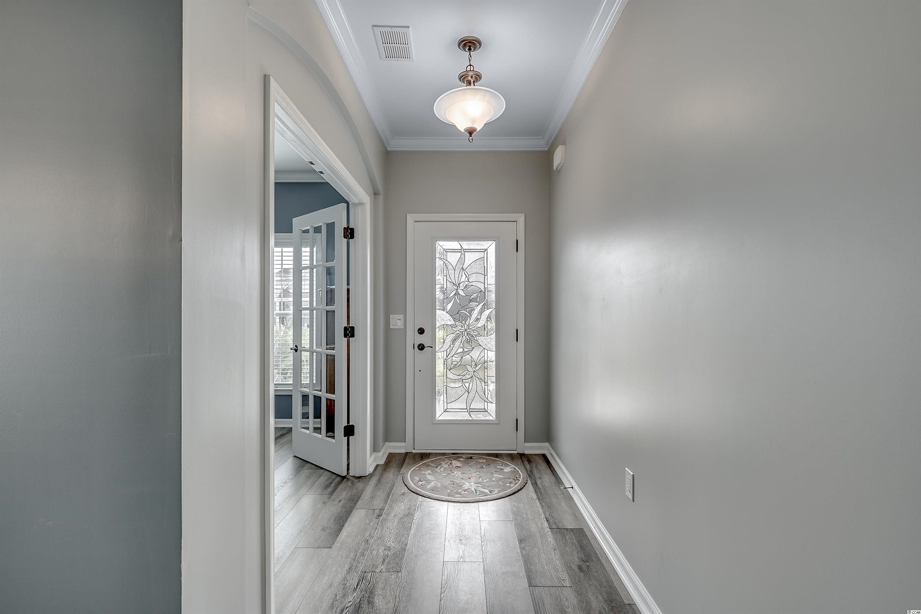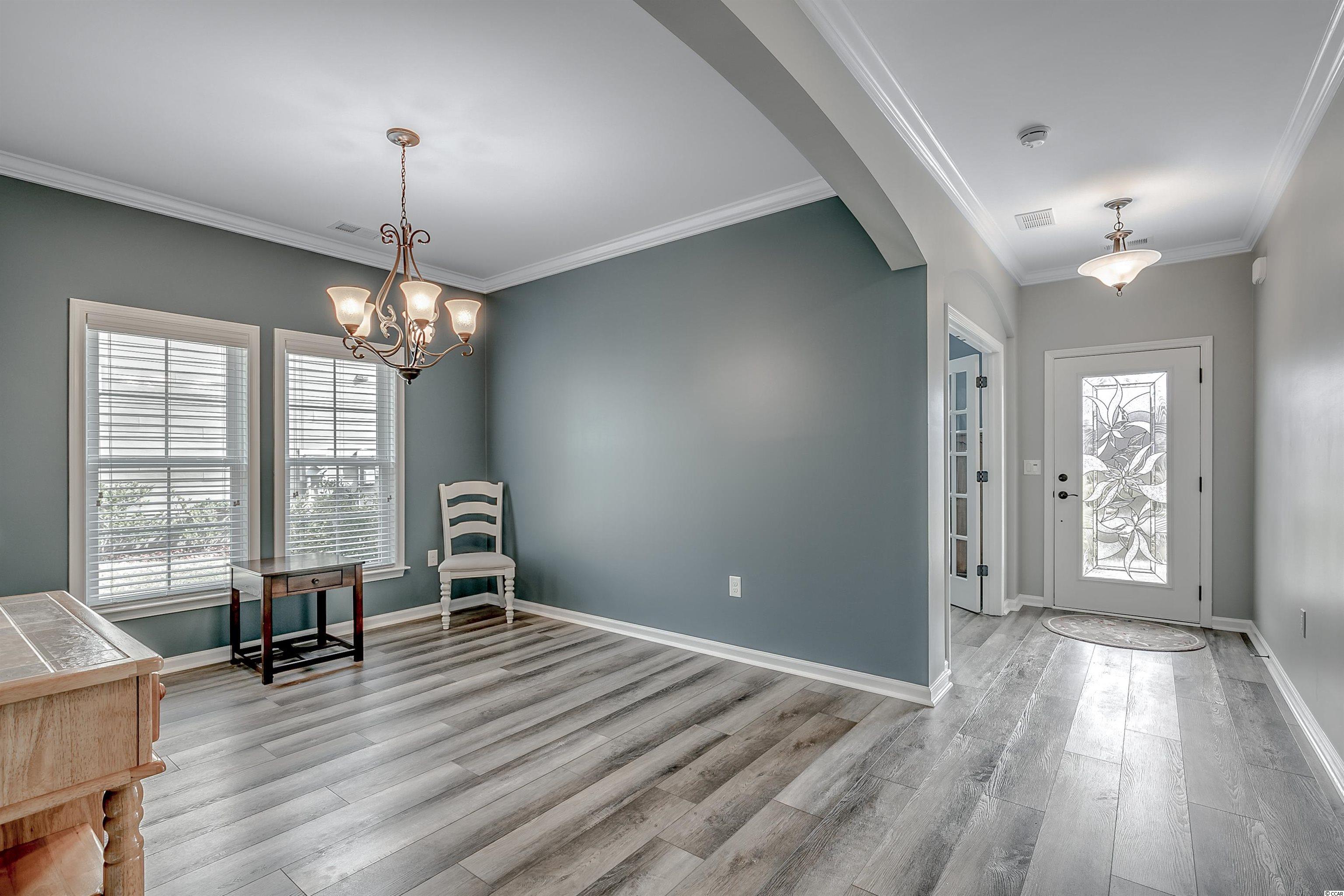 This charming brick front home with front porch allows you to enjoy visiting with neighbors or spend time taking in the natural setting and wildlife of the partially fenced back yard with huge patio for grilling and entertaining. 3 bedrooms, two baths plus office, formal dining and sunroom all on one level with lots of updates! New lighting, decorative front door, ceiling fans, new LVP flooring as well as tile, fresh paint, washer and dryer, central vacuum, ceiling speakers, new dishwasher, hurricane windows and natural gas cooking, heat and hot water add value here. No Carpet! Vaulted ceilings enhance the open, airy feel while crown molding in the foyer, office, dining room and hallways, wooden shelving for pantry and closets ,corain kitchen counters, backsplash and rollout shelves compliment the kitchen with its custom cabinets ,stainless appliances and decorative backsplash. A tile walk in shower, double sinks, corian countertops, garden tub and walk in closet make the owner's suite with crown molding a fabulous retreat. Windsor Plantation is a well maintained, gated neighborhood which is convenient to shopping ,restaurants, Surfside beaches , medical facilities , events at Market Common and dining in the Marshwalk in Murrells Inlet. The neighborhood offers a clubhouse and pool , is built out and well maintained so construction is complete. Numerous challenging golf courses and entertainment within minutes to make this home a great choice for your next move.