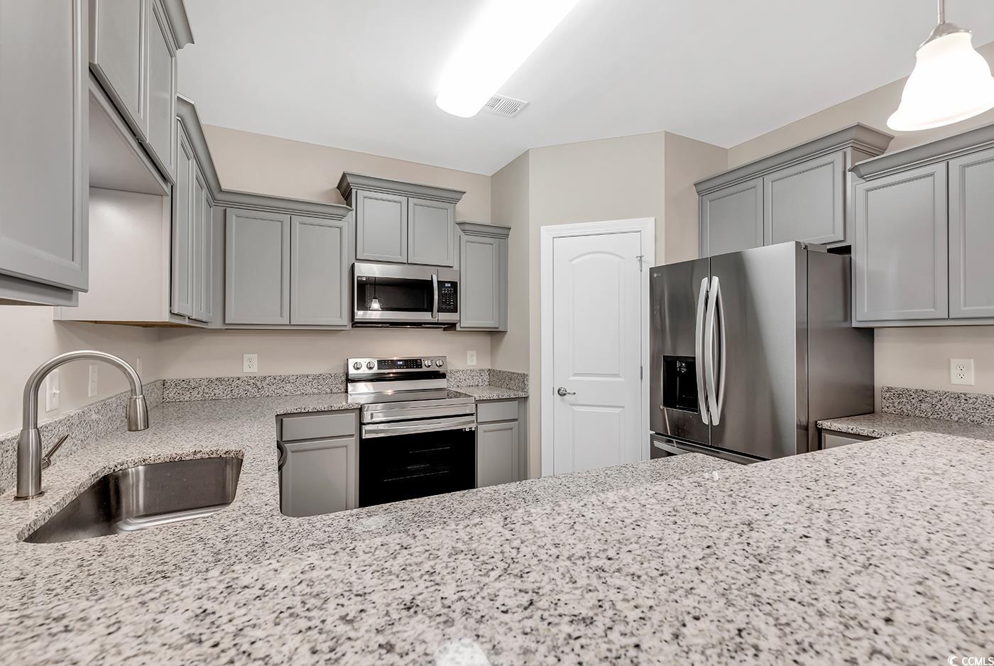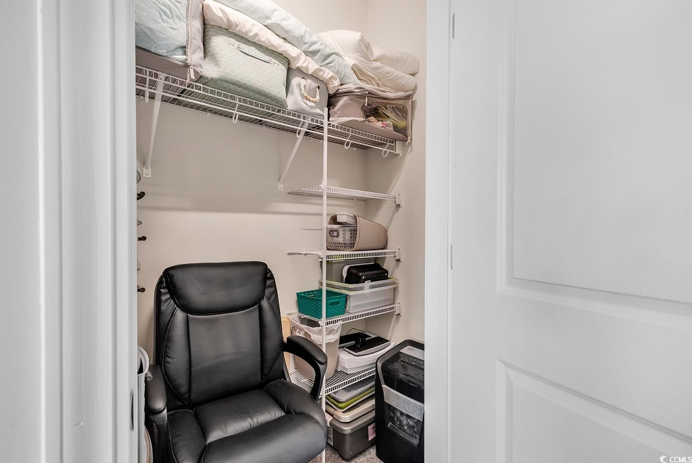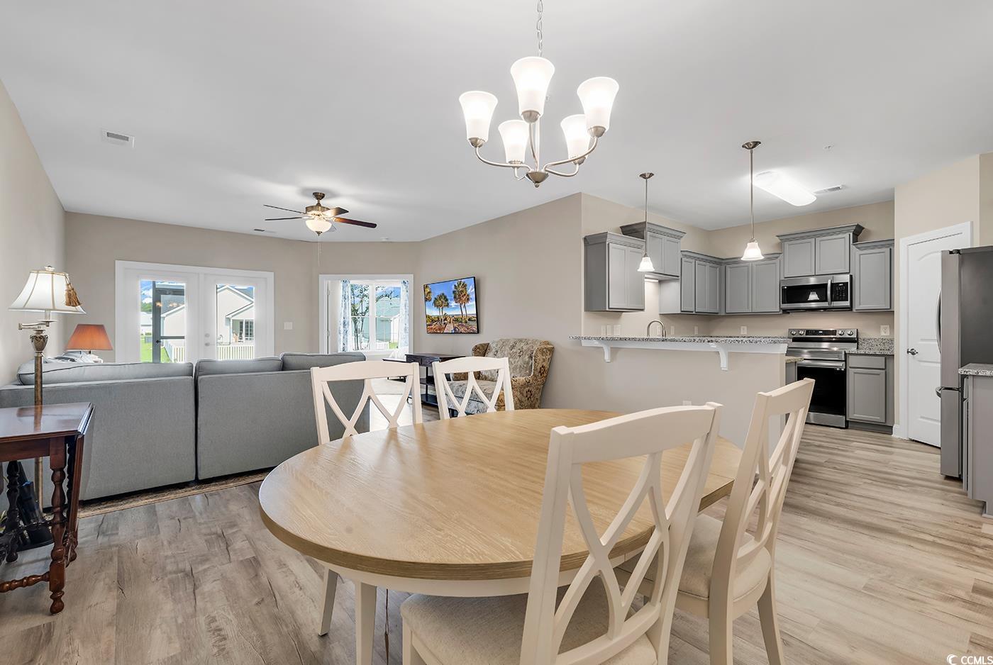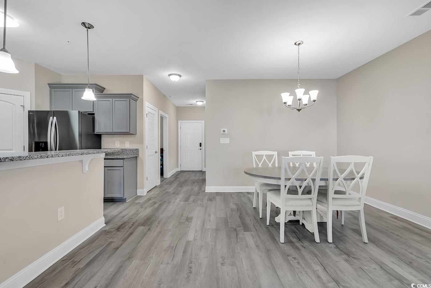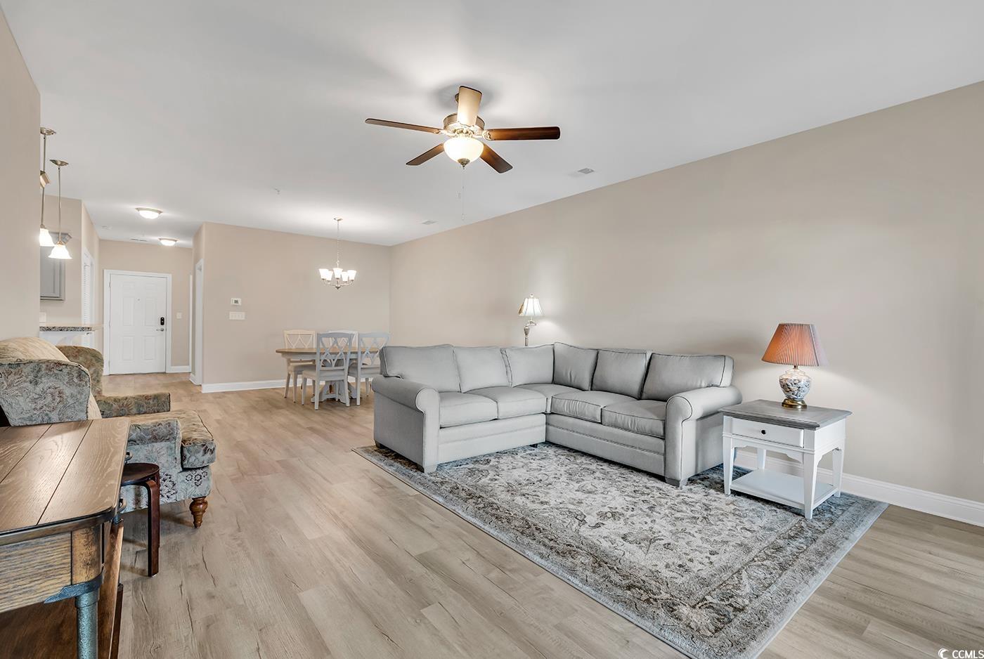 This beautifully appointed 2 bedroom, 2 bath ground floor home is immaculate and in almost new condition. The open living space features luxury vinyl planking, while light neutral tones create a warm and inviting atmosphere. The modern kitchen boasts stainless steel appliances, granite countertops, a breakfast bar, more than ample pantry space and fully trimmed cabinetry, ideal for both everyday living and entertaining. The primary bedroom is accessed through elegant princess doors and offers a serene retreat with plush carpeting for added comfort. Ensuring privacy, the guest bedroom is separated from the primary bedroom and has a guest bath just across the hallway. The spacious laundry room has extra shelving and a folding area. Step through the back door to the screened porch where you are sure to enjoy peaceful views of the pond or sunbathe on the patio. Additionally just outside of the front door an exterior storage area is perfect for luggage, beach chairs and coolers. Resort-style amenities, including a community pool, grill area, and clubhouse make this the perfect spot to call home. Located just a short drive from the stunning blue waters of the Atlantic Ocean and white sandy beaches, this home is close to golf courses, watersports, shops, dining, entertainment, Market Common, and the Murrells Inlet Marsh Walk. Come find your own place in the sun today!