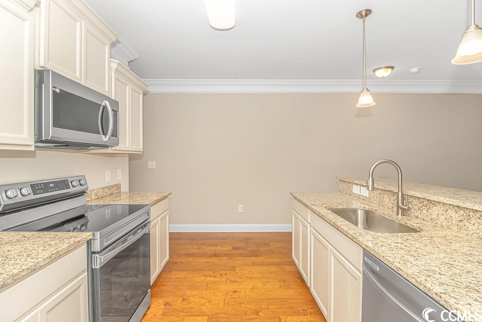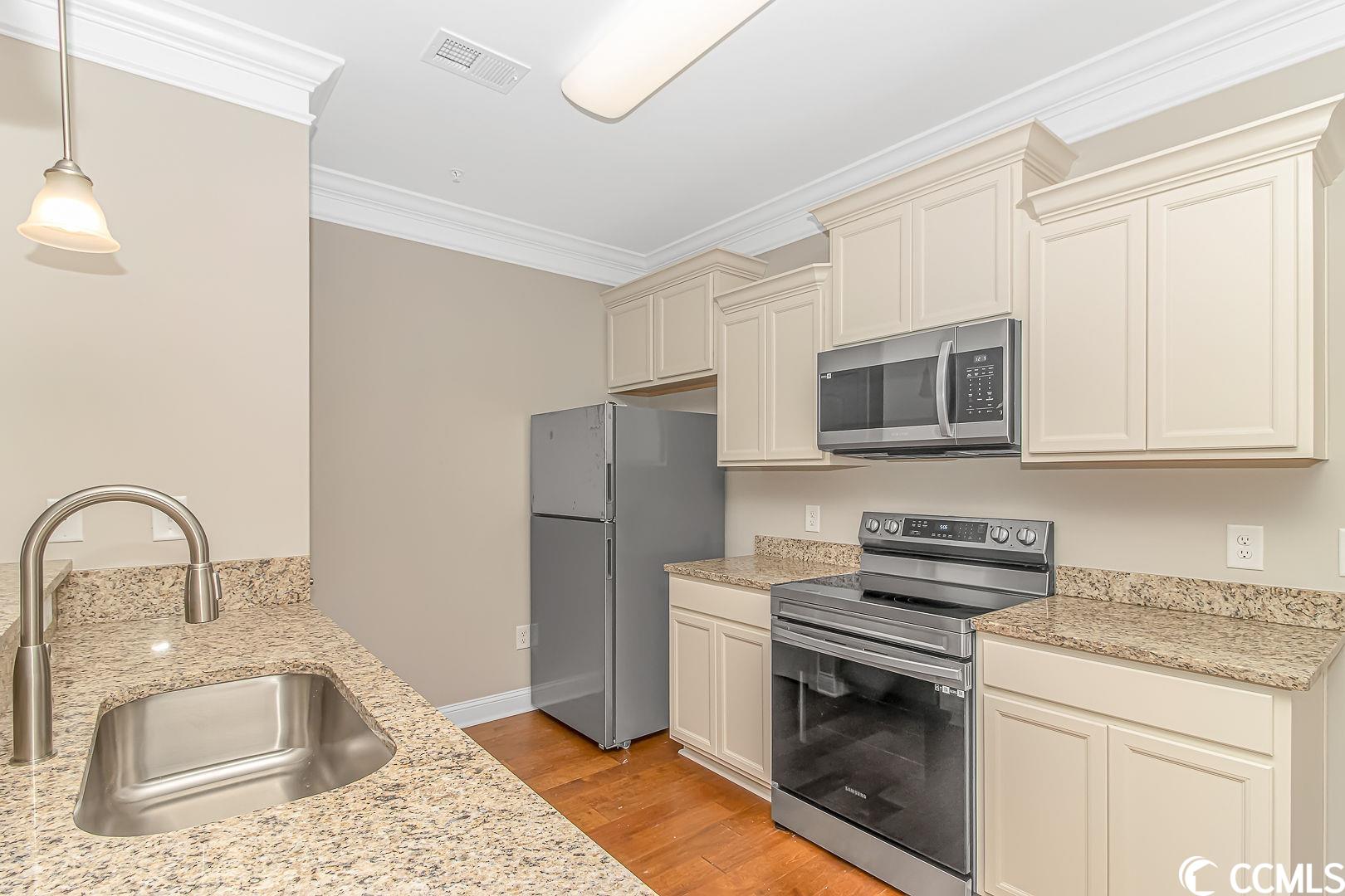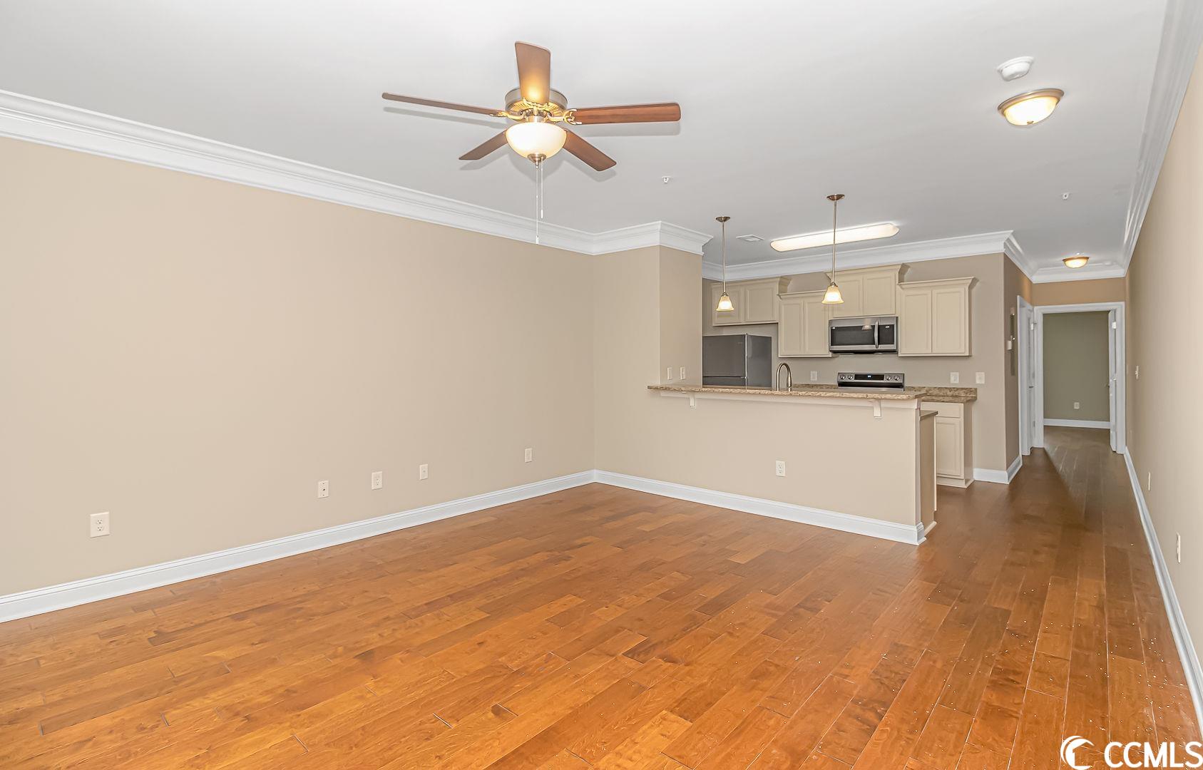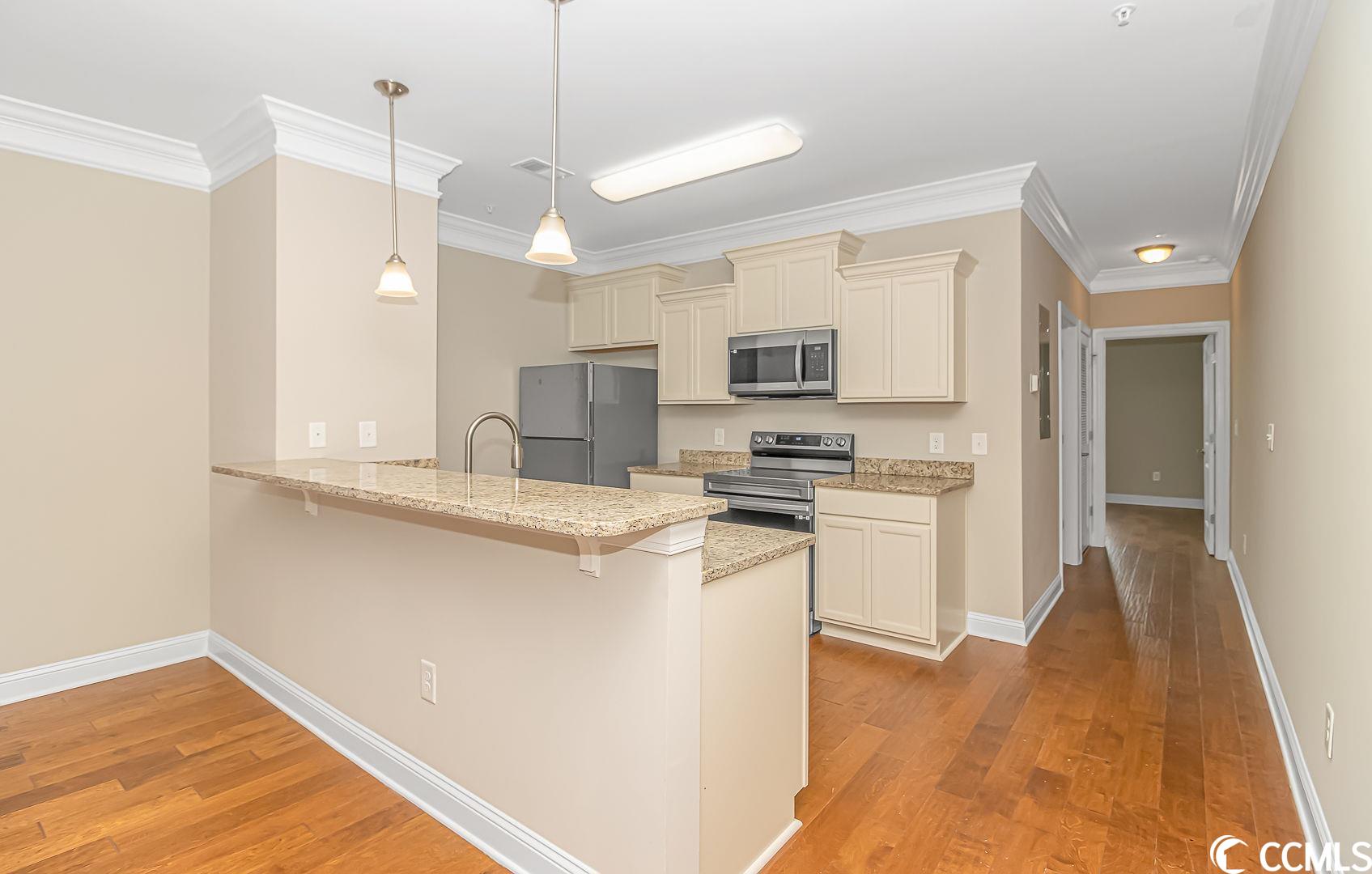 EXCELLENT LOCATION & MOVE IN READY! Welcome home to this one bedroom, one bath condo, located in the highly sought after Villages at Queens Harbour II. This brand new unit has a great open floorplan with 9ft ceilings, tons of upgrades, plus the building has detached storage, and an elevator! Walk in to a spacious living/dining area with gorgeous crown molding and a ceiling fan, head over to the large kitchen complete with upgraded cabinets, granite countertops, a breakfast bar, stainless steel appliances, and a pantry. The bedroom features a large double door closet and double windows letting in lots of natural light. The bathroom has a large shower with built in seat, linen closet, washer/dryer hook-ups, and vanity with solid surface countertop. Amenities include a large resort style swimming pool with a generous sized club house, outdoor grills for BBQ and a large covered picnic area. The Queens Harbour development is located off of Bypass 17 making it very convenient to near lots of restaurants, shops, entertainment and medical facilities. Best of all, the gorgeous beach is only a 3 mile drive away! Come see this one today before its gone!