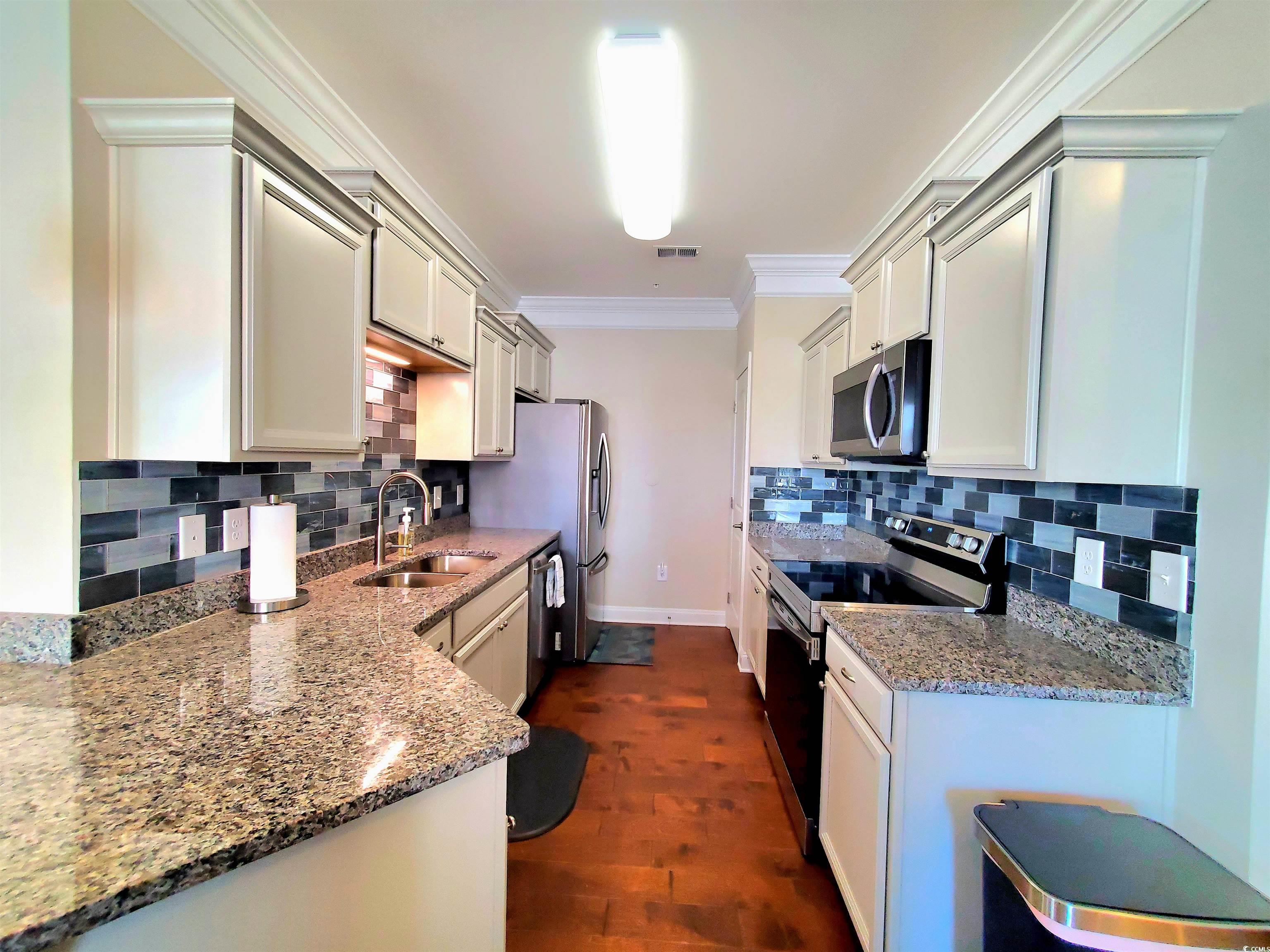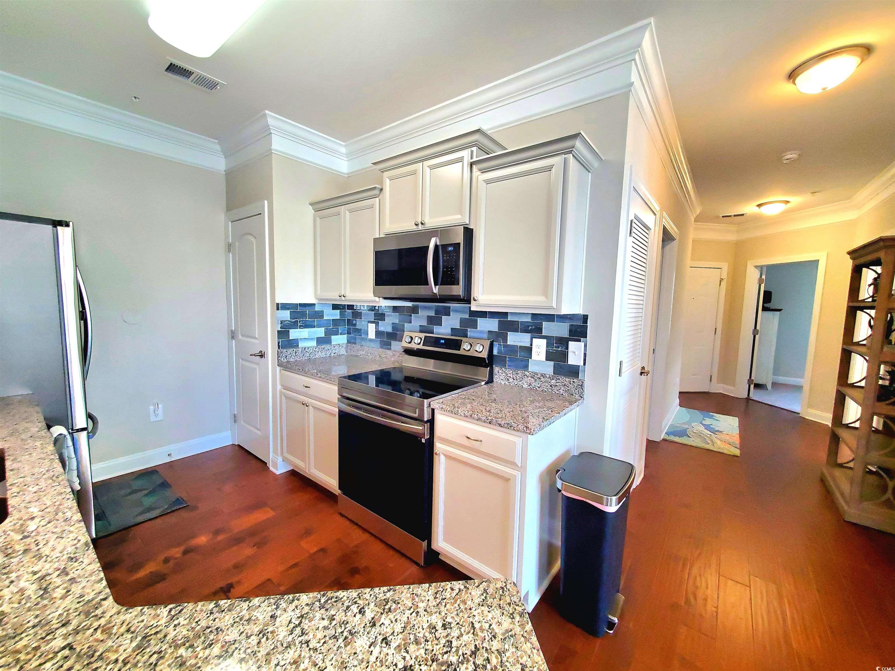 10 Minutes to the Beach. This Mint Condition 3 Bedroom, 2 Bathroom, 2nd Floor, End Unit Condo is located in One of the Best Desired Communities with Sparkling Lakes, Resort-Style Pool, Clubhouse with Library, and Covered BBQ Area. Restuarants and Coffee Shop are just across the road for your convenience. This Home at The Village at Queens Harbour II is Only 2 Years Old. The Owners have Only been here 8 Times in 2 Years. Everything is Brand New and in Excellent Condition. It still even has the New Smell. Split Bedroom Floor Plan. Master Suite with Double Doors to the Great Room. 9 Foot Ceiling and Double Crown Molding are throughout the Home. Plenty of Sunshine Coming through the Windows. Bedrooms have Blackout Blinds. Tomahawk Hardwood Floors Flow from Foyer, Entry Hall, Kitchen, Dining Area, and Great Room. Dana Cove Tile (18x18) is Located in Both Bathrooms and Laundry Room. Yes, Washer and Dryer are Included. The Bedrooms have Upgraded Padding and Carpet. Caladonia Granite Countertops in the Kitchen with Harbor Cabinets and Newly Installed Backsplash. Plenty of Storage. Stainless Steel Appliances and Pantry. This Home is Being Sold Without Furniture but Open to a Complete Package Deal. All Furniture is of Great Quality as well. Screened Porch (10x8). Shopping, Restaurants, Golf, and Hospital are Very Close as well. Yes, there is an Elevator and Outside Storage side by side.