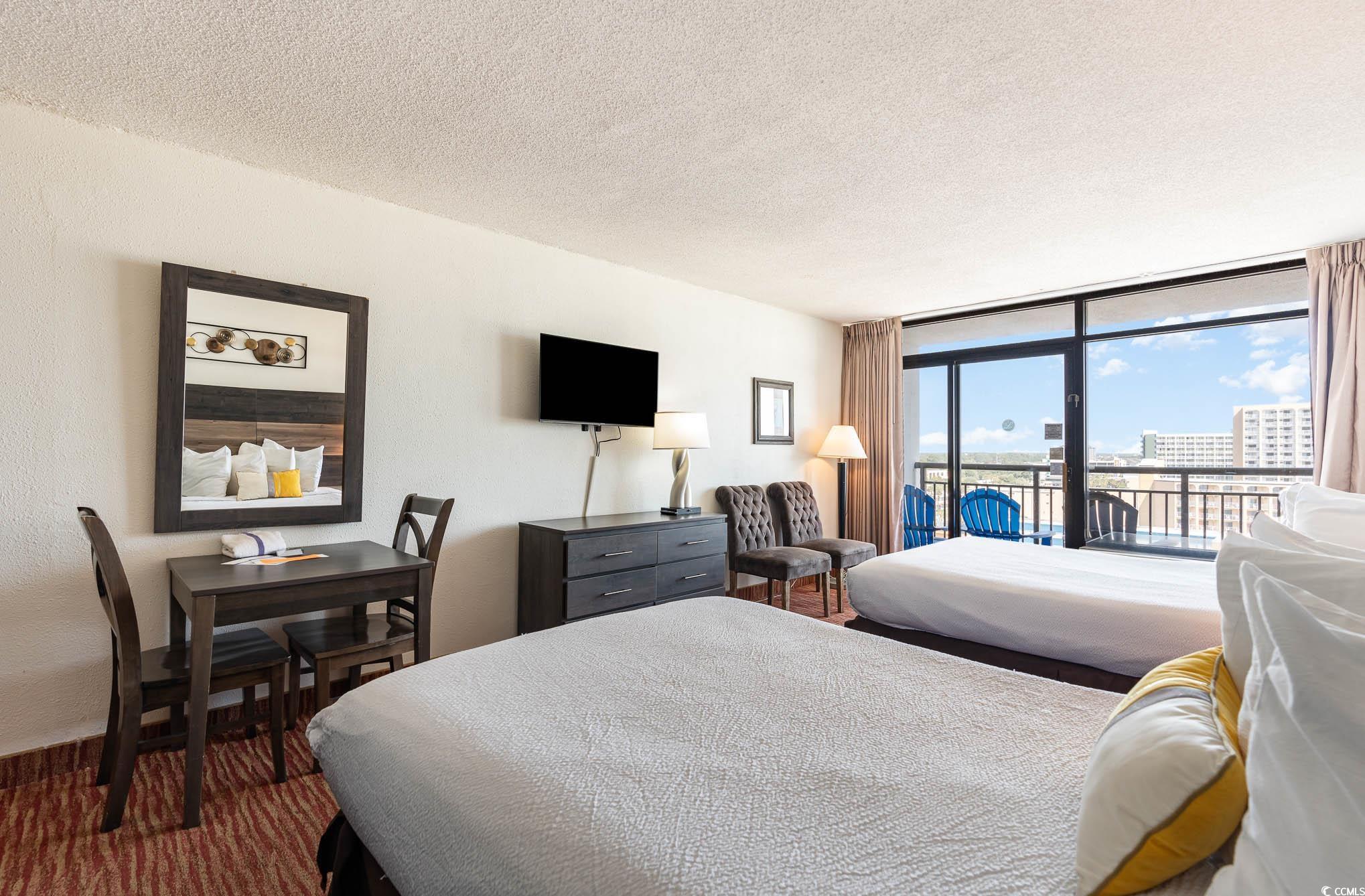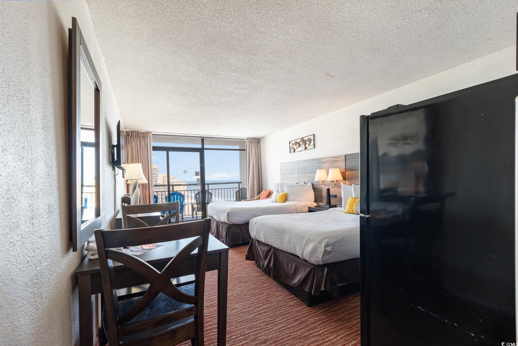 Welcome to this exquisitely appointed, fully furnished efficiency unit at the prestigious Landmark Resort. Every detail of this amazing retreat has been meticulously curated to offer the utmost in comfort and style. This unit boasts two queen-size beds with plush bedding, complemented by an upgraded, state-of-the-art flatscreen TV. The kitchenette is outfitted with modern appliances and is ideal for preparing a quick breakfast, snack, or lunch. Freshly painted walls and new dining chairs surround a table perfect for 2. As you step out onto the private 11th-floor balcony, you'll be captivated by breathtaking, unobstructed views of the endless horizon, where miles and miles of pristine beach go as far as the eye can see. The Landmark Resort is renowned for offering the very best in world-class amenities. Indulge in the luxury of indoor and outdoor pools, take a leisurely float along the lazy river, maintain your active lifestyle at the state-of-the-art exercise room, and take advantage of the convenience of onsite laundry facilities. Savor delectable cuisine at the resort's exquisite dining options. Whether you seek a lavish vacation getaway or a lucrative investment opportunity, this unit promises both. The chance to own a slice of this unparalleled luxury won't last long. Schedule your exclusive showing today and experience the epitome of coastal opulence at the Landmark Resort.