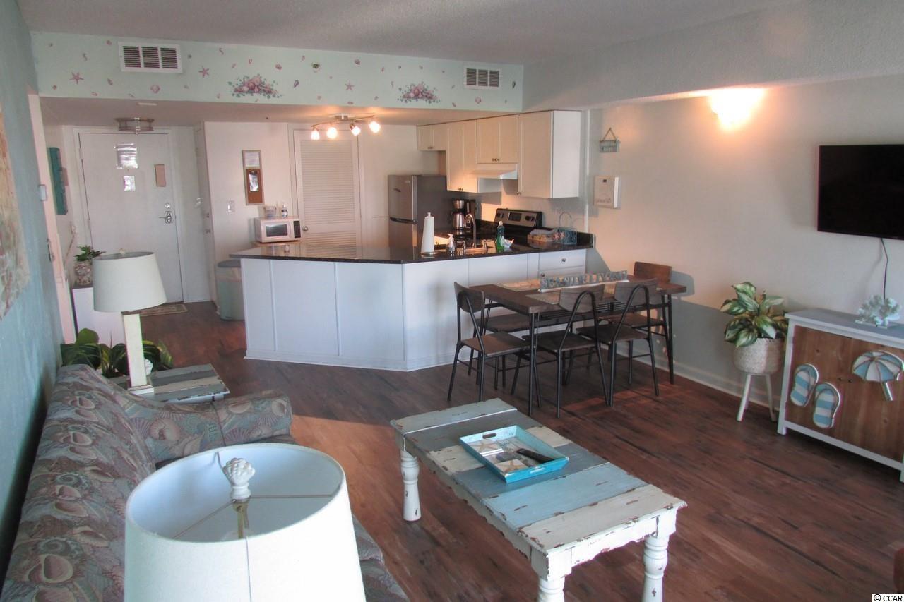 One of the lowest priced 2 bed 2 bath units in an Ocean front building in all of Myrtle Beach and it is MAGNIFICENT. It's on the desired south side of the building and above the hotel next door. I.e. It has a Great view. The Resort boast a Steam Room, Sauna, an exercise gym, an On Site restaurant and bar. A pool that you can swim in and out of the building in. along with 3 outdoor hot tubs another outdoor pool and indoor hot tub on the penthouse and a putting green for the golfer in the family. Close to all of the entertainment and dining and its right on the beach. If you have children bring them. There is a new sport called try to catch the segals on the beach. They never catch any but everybody wins