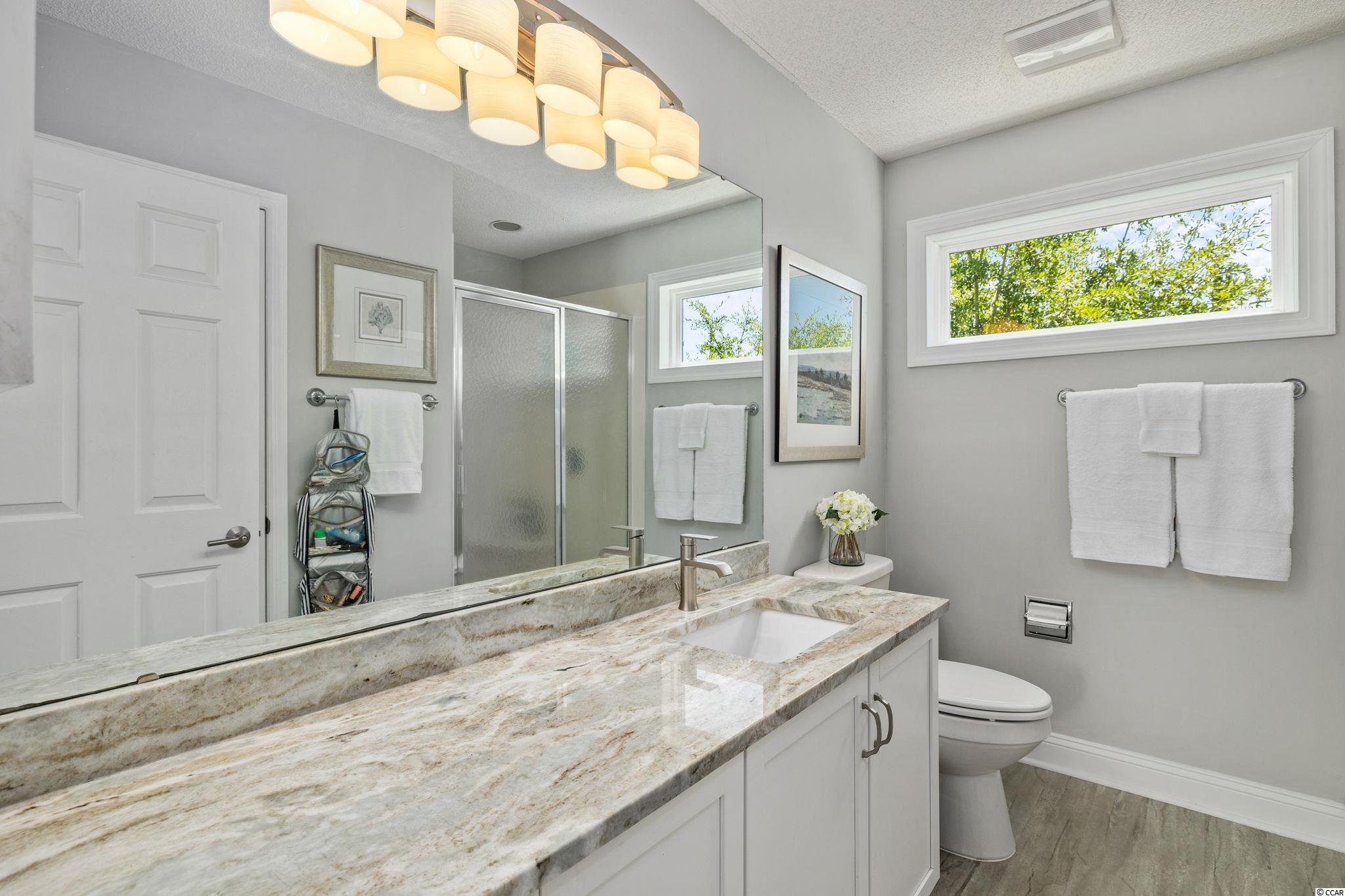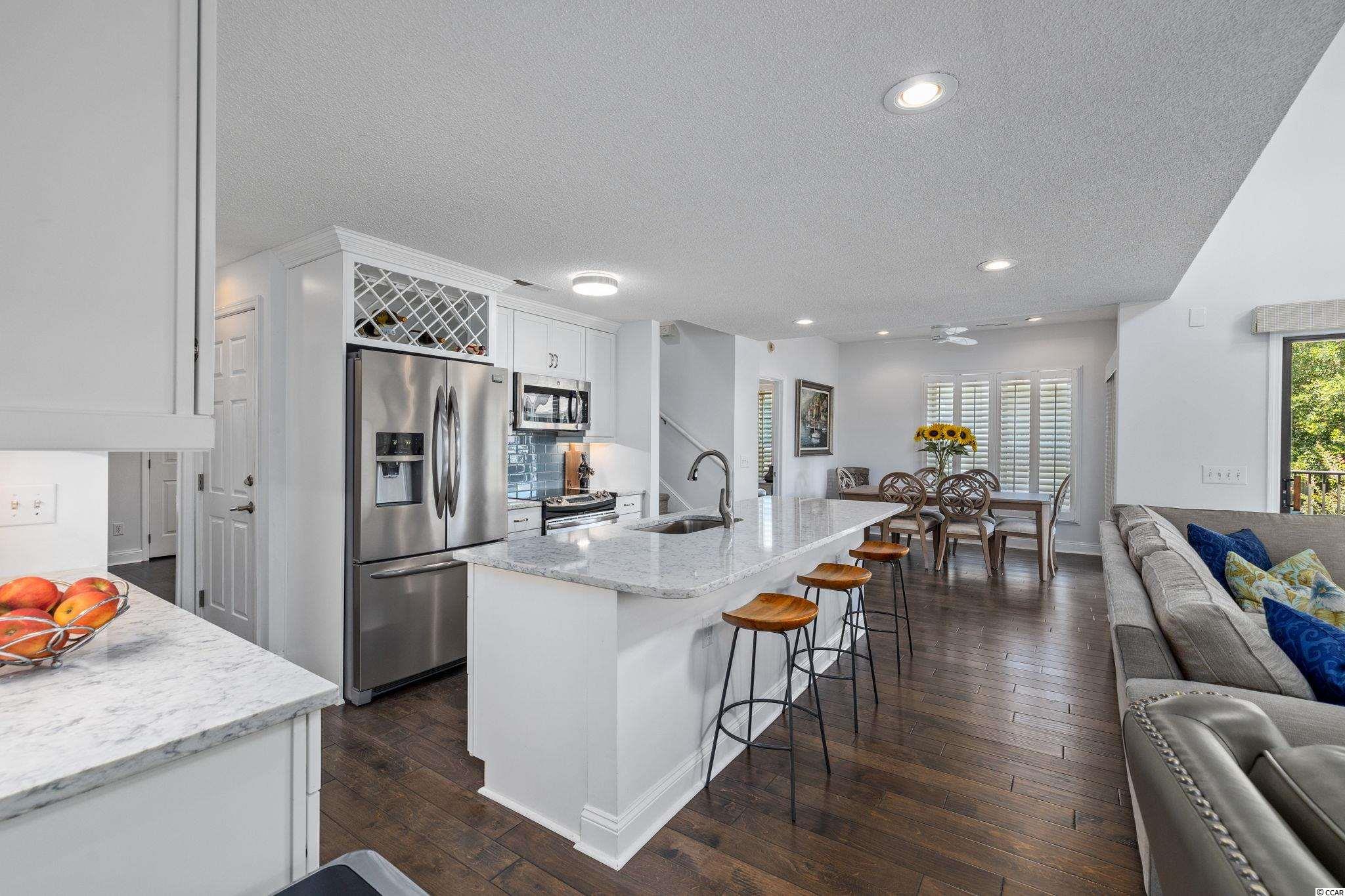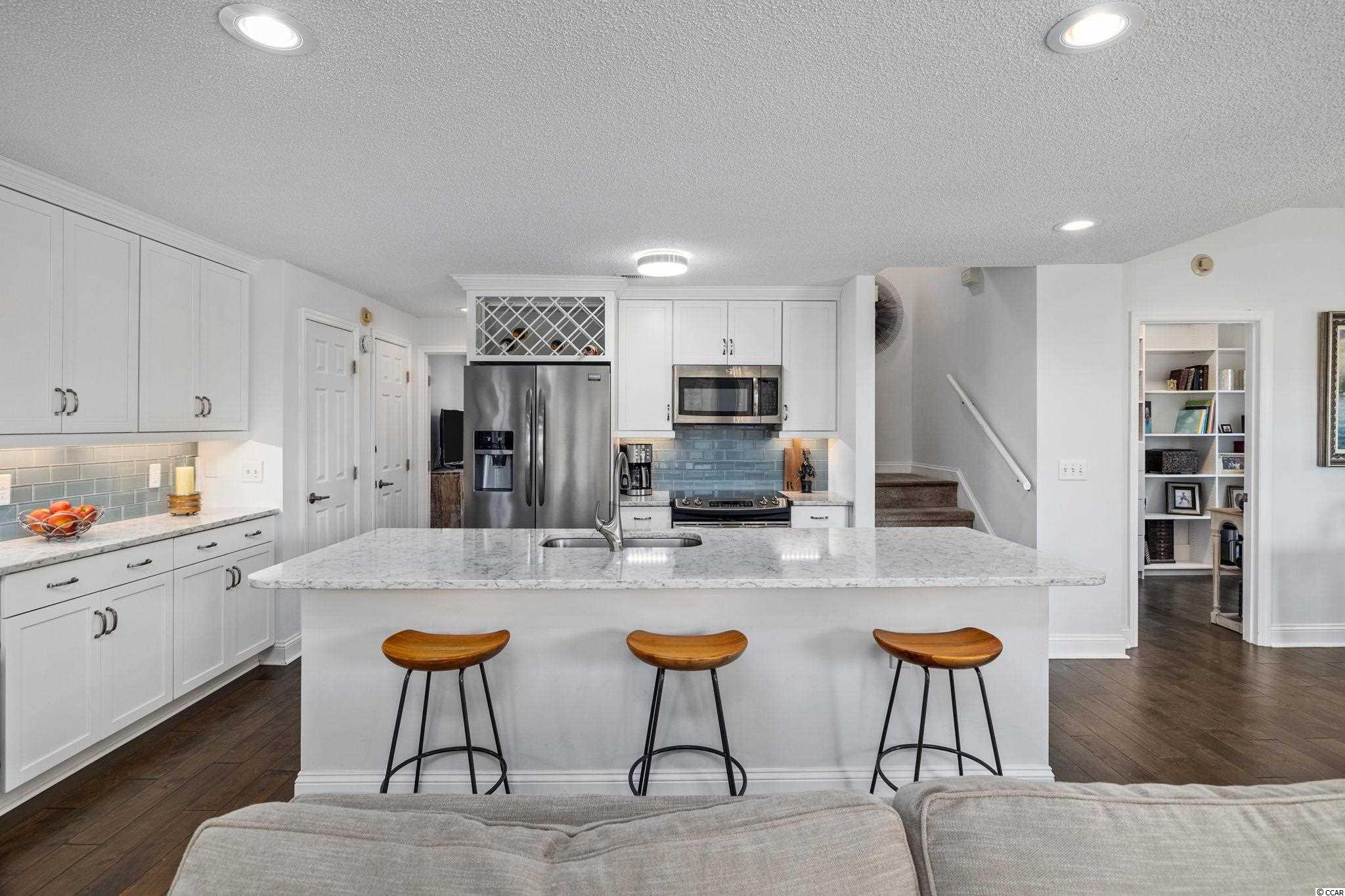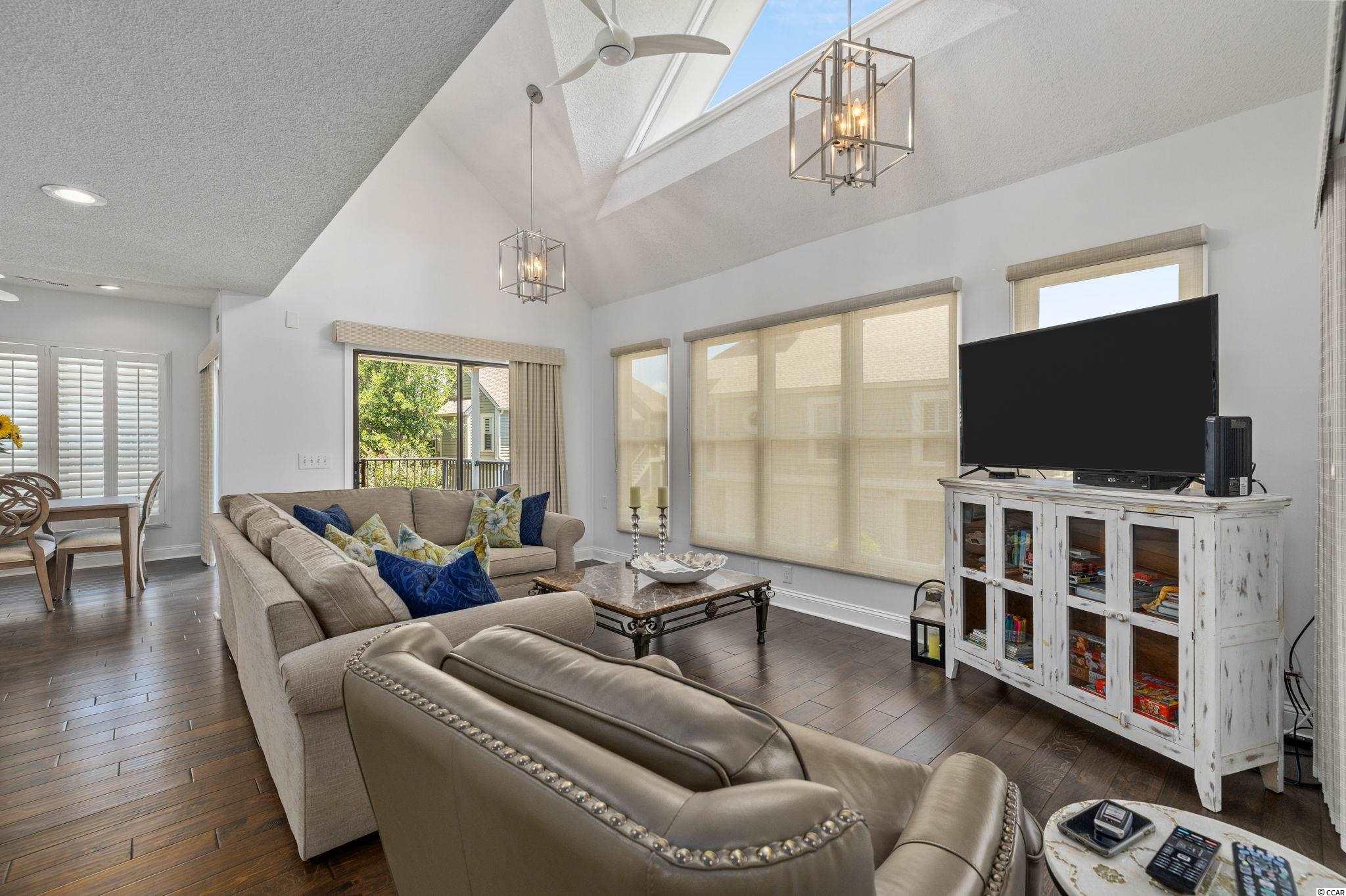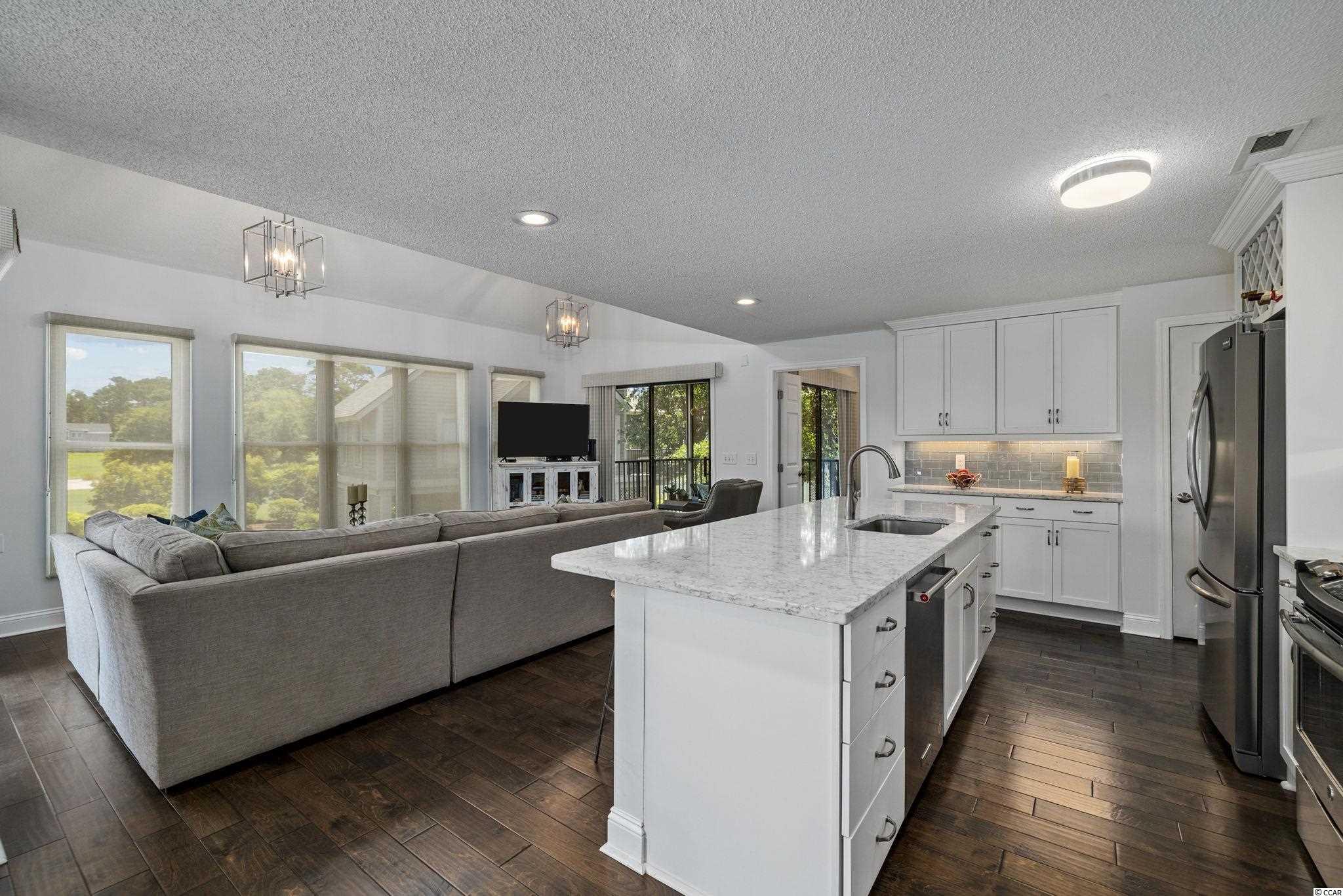 Harbor Loft is an Intracoastal Waterway community located within the gates of Tidewater Plantation. This raised 3 bedroom, 2 and one half bath home has been tastefully updated and offers some of the Grand Strands best amenities. The floor plan consists of 2 master bedrooms, one of which has it's own balcony, a third bedroom with half bathroom, and an office/flex space. Updates include quartz countertops, custom cabinetry with soft close and undermount lighting, stainless steel appliances, engineered hardwood floors, plantation shutters, custom blinds, high end lighting fixtures, custom closet shelving, new roof and other custom features that you will not find in other Harbor Loft homes. These homes offer carefree living with great outdoor spaces. Enjoy views of the waterway and golf course from the top floor sundeck or sit in the shade of the screened porch or the open air and sunshine of the third and fourth deck. The ground level offers covered space that can be used for parking, storage, or entertaining and covered access to the upper level. The concrete has been epoxy treated for ease cleaning and gives a great finished look. Tidewater Plantation is a gated community with security that offers access to pools, tennis courts, an oceanfront cabana, fitness center, day dock, clubhouse and a golf course.