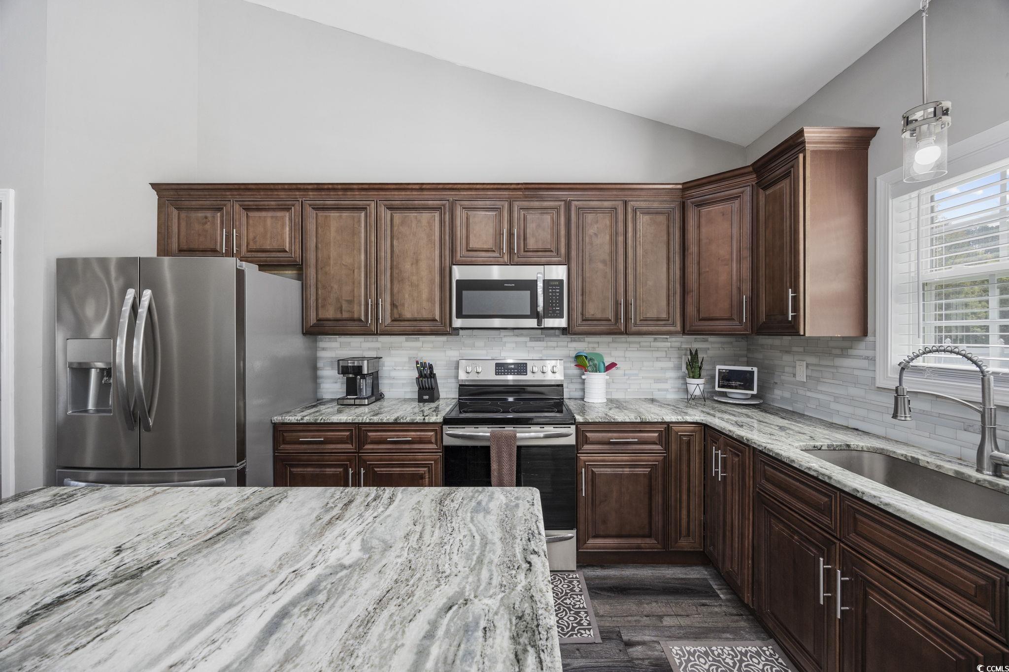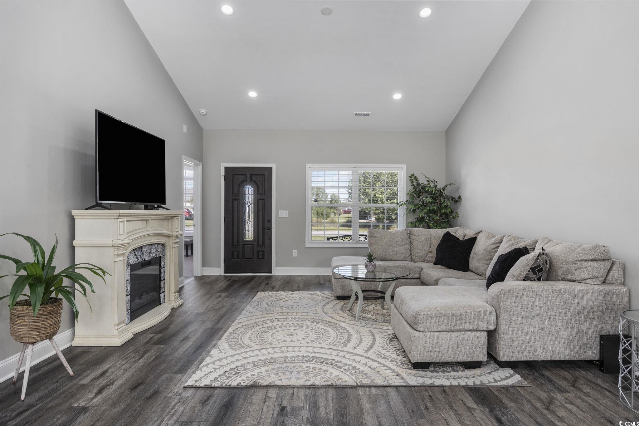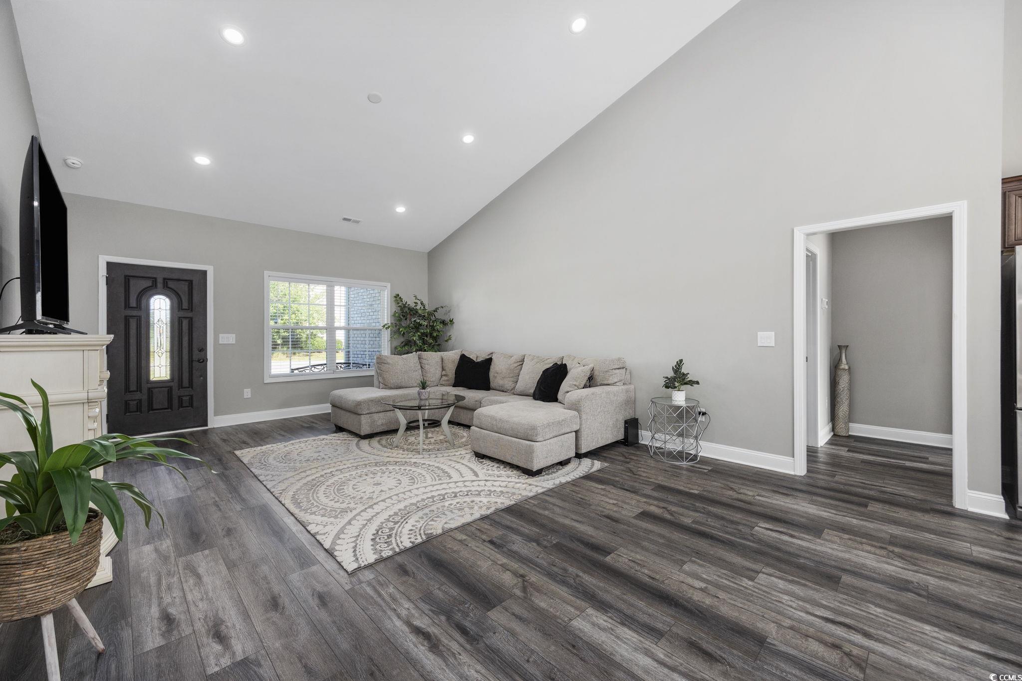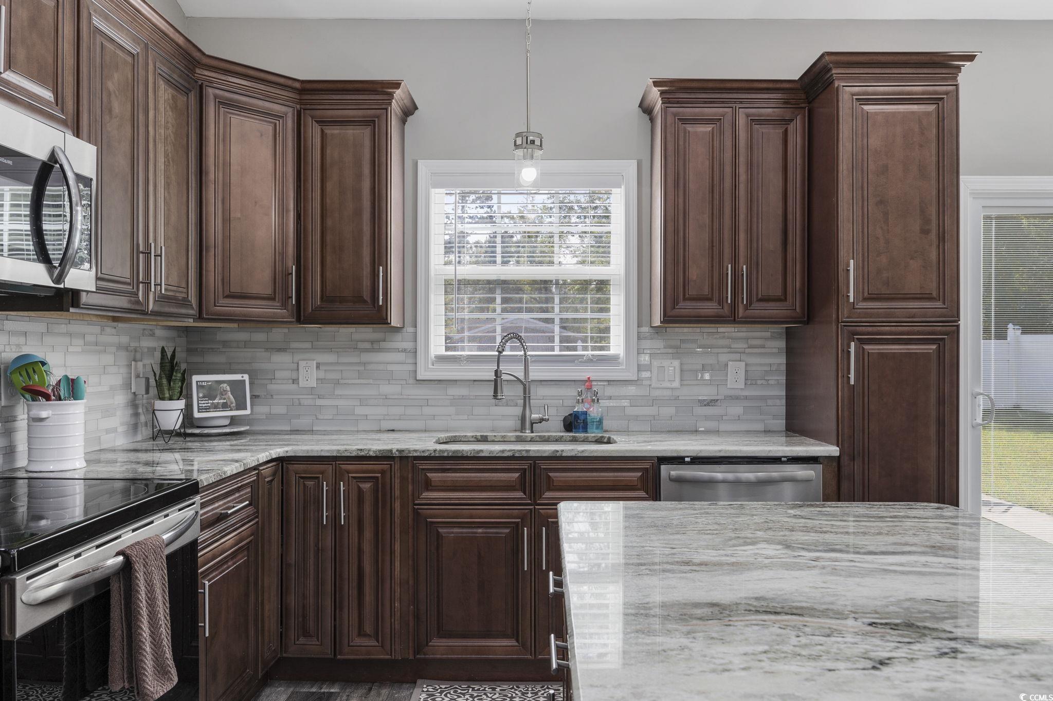 This barely lived-in/like new CUSTOM BUILT home (2022) has plenty of space, single-level living, FENCED yard, and ideal location. The Summit is a small, well-kept community, with LOW HOA fees, located 4 miles from Historic Downtown Conway and less than 20 miles to the beach. The home features custom queen-size Riviera brick front and foundation surround and Cambridge Beaded Premium Vinyl Siding replicating the natural beauty of painted wood without the upkeep and is further complemented by a charming front porch and decorative front door. Southern elegance with a modern vibe is the theme of this home. Inside, you are welcomed into a huge living area with 15 foot ceiling, which is open to the kitchen and dining area. The kitchen has solid wood, soft-close cabinets and drawers, premium granite counters, stainless steel appliances (dishwasher has never been used), and glass tile backsplash. Split bedroom plan with the primary bedroom on one side of the home and three bedrooms on the other. The primary suite has a large walk-in closet, tray ceiling, and the adjoining bathroom has double sink vanity, granite counters, linen closet, soft-close cabinets and drawers, and a walk-in shower. The other three bedrooms are spacious and have ample closet space. Guest bath has a shower/tub combo and granite counters. If you are not already in love, you will be when you check out this backyard. Dreams of a firepit, pergola, or pool? You can have them all in this large, private, fenced backyard. Bedrooms and living area are wired for ceiling fans. Blinds and appliances convey. Two-car smart garage. Some bedrooms photos are virtually staged. Tour this lovely home today!