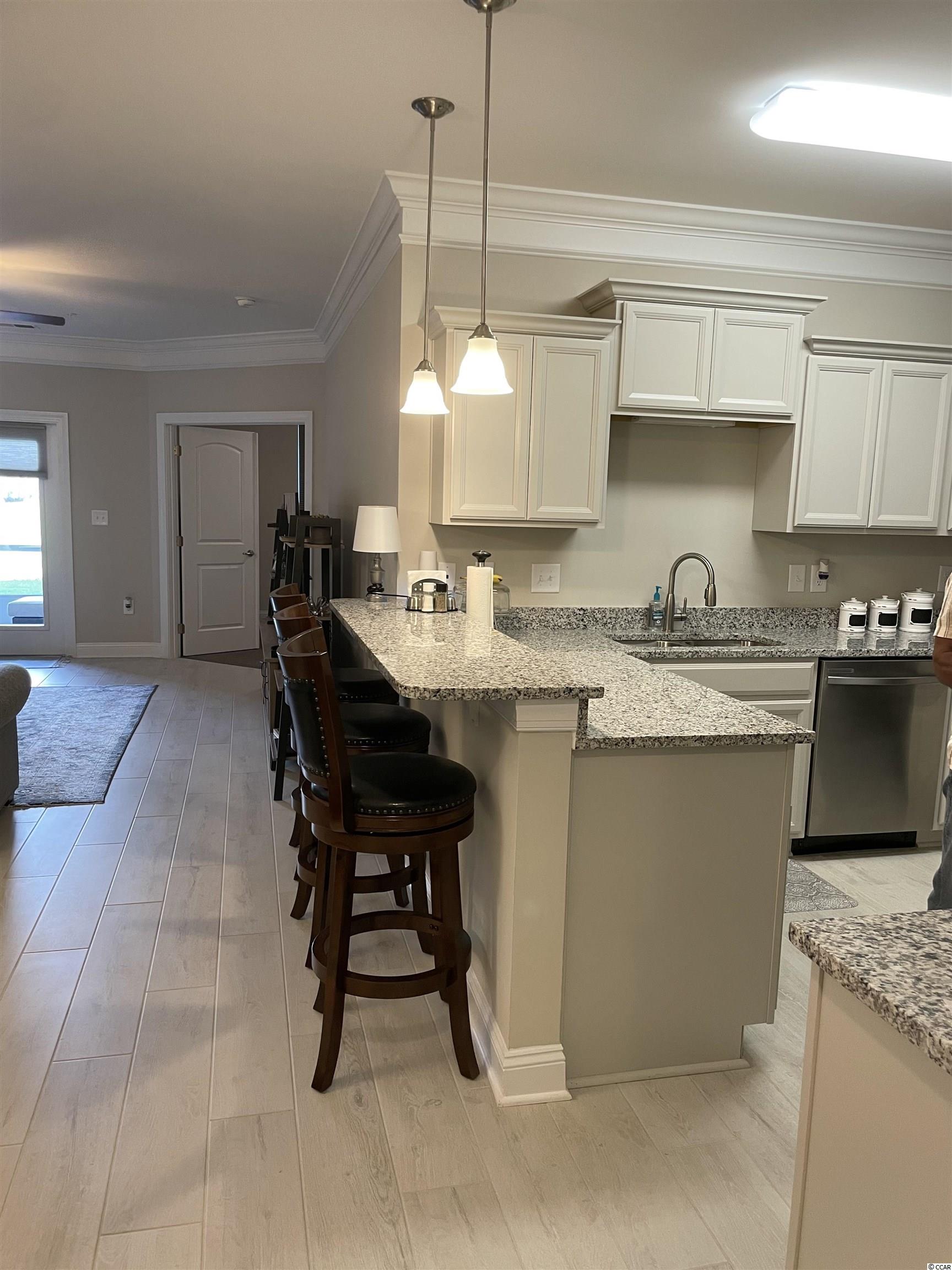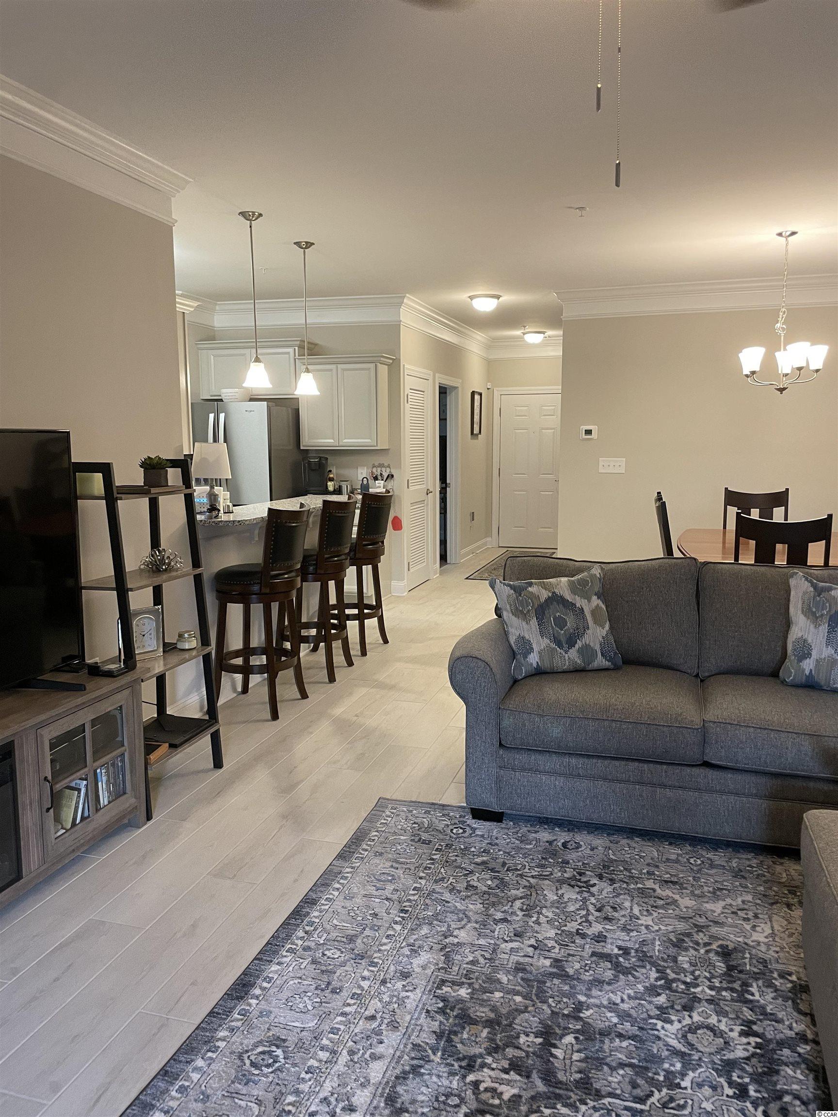 Barely used 1st floor beautiful 2 bedrooms, 2 bathrooms located in the very popular Queens Harbour in Myrtle Beach area. Building has an oversized ELEVATOR to all floors, outside storage, split bedroom floor plan with entry to the Master Suite from the Family Room, 9' ceilings and a screen porch. Beautiful tile flooring throughout the living area along with crown molding and granite kitchen countertops.The location is superb with shopping, dining and recreation steps away. The amenity package includes a resort style swimming pool with a club house and conveniently located picnic areas with barbecue grills. Close to Surfside Beach, Myrtle Beach State Park, Airport and Coastal Grand Mall. This unit is immaculate and a must see! Call your agent today. This unit will not last long.