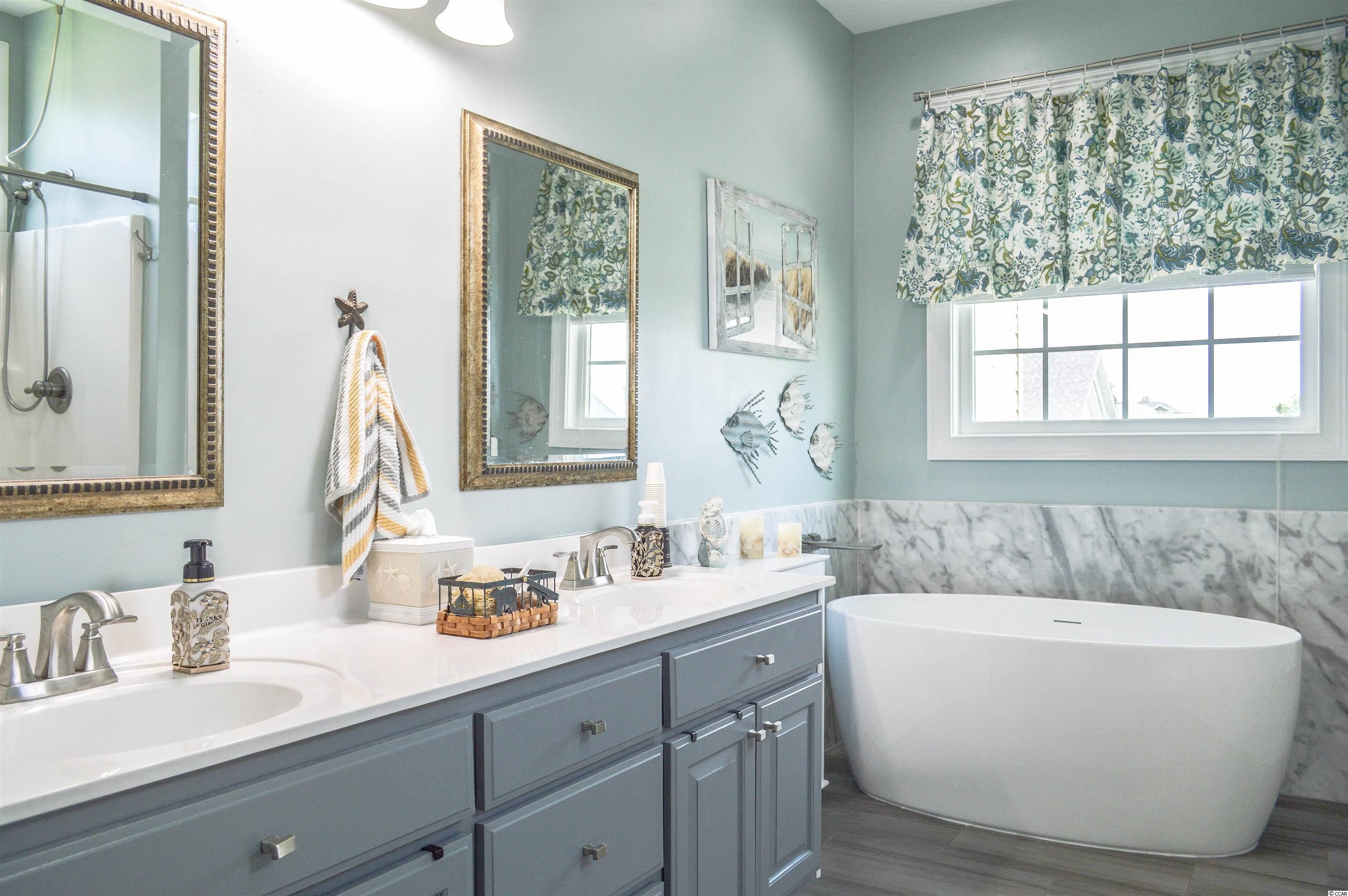 PRIME CUSTOM 4 bedroom 3.5 bathroom traditional home with tons of UPGRADES throughout. Located in the popular Conway community of Bucksville Oaks - close to major highway access, shopping, dining, and a short drive to the downtown Riverwalk and CCU/HGTC. One of the biggest homes in the neighborhood sitting on a spacious corner lot with beautiful manicured landscaping and directly across the street from the community pool & clubhouse. Home features a huge front covered porch and back screened-in porch (both with overhead ceiling fans), patio area, fenced in backyard overlooking the community lake/pond, and a side load 2 car garage (finished floor & new door springs) with huge driveway for ample parking. This home also comes equipped with gutters, irrigation system, security lights on each corner of the house including the garage entrance and a monitored security system with cameras, smoke detectors, and locks. Walking through the front door you enter into a spacious foyer area with the staircase on the right leading to the second floor where you will find two large bedrooms and a full bathroom. Both bedrooms offer plenty of closet space, overhead ceiling fans, and carpet flooring. One of the bedrooms offers an office nook area and access to tons of floored attic space for convenient storage. Full bathroom upstairs features a single sink bowl vanity, walk-in shower, and ceramic tile flooring. Heading back downstairs, this home offers a split bedroom floorplan with two master suites on the first floor. First master suite is to the left just off the foyer and features crown molding, overhead ceiling fan, deep long closet and bathroom en-suite with a walk-in tiled shower and single sink bowl vanity with lots of counter space. Off the hallway there is a half bathroom for guests before entering into the main living area of the home. First thing you notice is the amount of natural light coming through the space from the back windows illuminating the floorplan. Huge living room offers a tray ceiling, new overhead ceiling fan, recessed lighting and door access to the screened-in porch. Upgraded luxury kitchen features a full set of stainless steel appliances including a new range/double oven & dishwasher, new garbage disposal, 42"" cabinets, upgraded pendant drop lights above breakfast bar, window above the sink and solid surface countertops that continues to the backsplash. Just off the kitchen there is a large formal dining room area, door access to the attached 2 car garage, back screened-in patio, and separate laundry/utility room with overhead storage shelves, deep utility sink, and washer/dryer connections. Second master bedroom suite is on the right side of the home just off the living room and features a tray ceiling, new overhead fan, 2 walk-in closets, and a remodeled en-suite bathroom that comes equipped with a double sink bowl vanity, walk-in shower, linen closet, and freestanding deep luxury tub. This home must be seen to be appreciated - so many more upgrades like new plantation style shutters all along the front of the home, water filtration system, HVAC with updated thermostats/UV light and laminate wood flooring throughout most of the first floor. This prime upgraded home is priced to sell - schedule your private showing today before this one is sold!