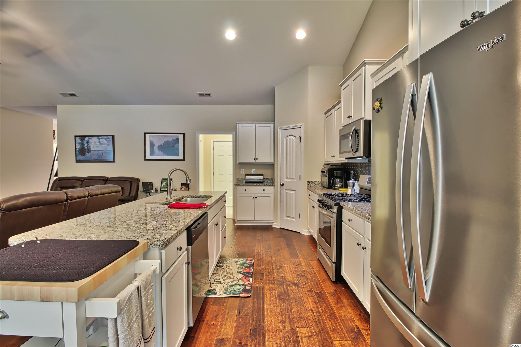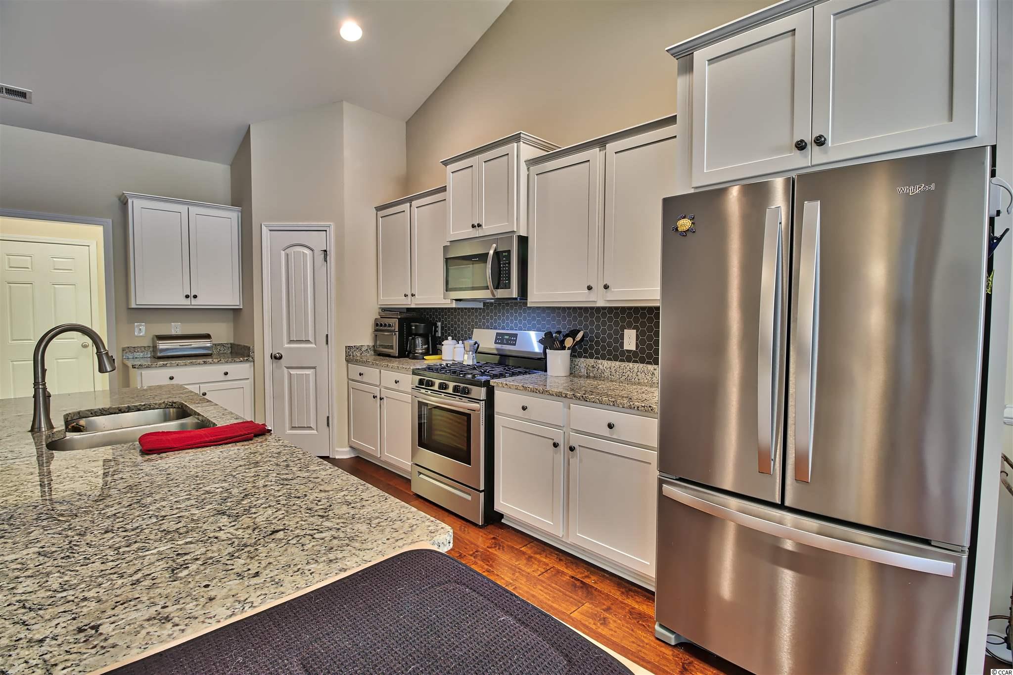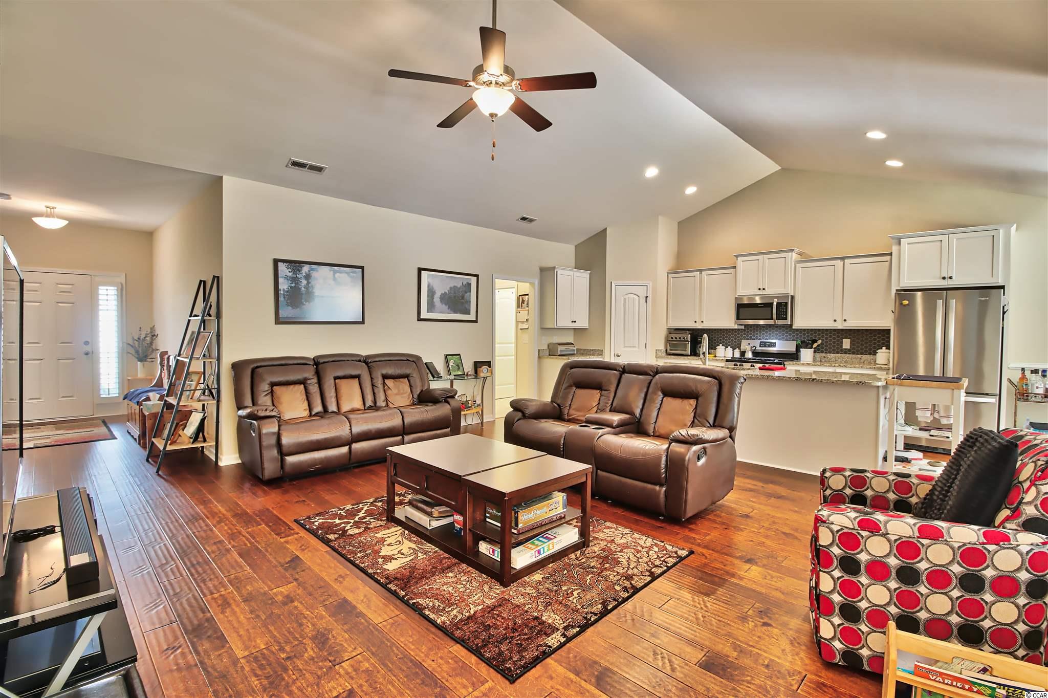 This is a beautiful 3-bedroom 2 bath home built in 2018 and is located in desirable Rivertown Row, which is a Natural Gas community. This home has an abundance of features that you will fall in love with especially the Kitchen which features an 83 granite island, a large pantry, vaulted ceilings and pull-out drawers in all lower cabinets for easy access. The Washer Dryer has its own room and you have a great Flex space, a 98 x 56 room that can be the office, the pet palace or just storage The cathedral Kitchen, Great Room and Dining area are one space which makes it terrific for entertaining your guests or just hanging out with family. Other interior features include plantation shutters throughout, Wood type flooring in Great Room, Dining and Kitchen, Ceramic tile in baths, a super-sized linen closet in Master Bath and carpet in Bedrooms. You also have storage above the garage with pull down stairs. Exterior features include a beautiful corner, tree lined .22 acre lot with a vinyl fence for privacy. The screen porch and the oversized patio creates a great space for those outside gatherings. And lets not forget the isprinkler system to keep your lawn nice and green. This home certainly has that tucked away feel yet it is just minutes from shopping and restaurants. Historic downtown Conway, located on the Waccamaw River, has a fabulous Riverwalk and also has an abundance of shops and restaurants to choose from.. Plus a short drive brings you to Myrtle Beach to enjoy all that it has to offer. Book your appointment today, this one wont last long.
