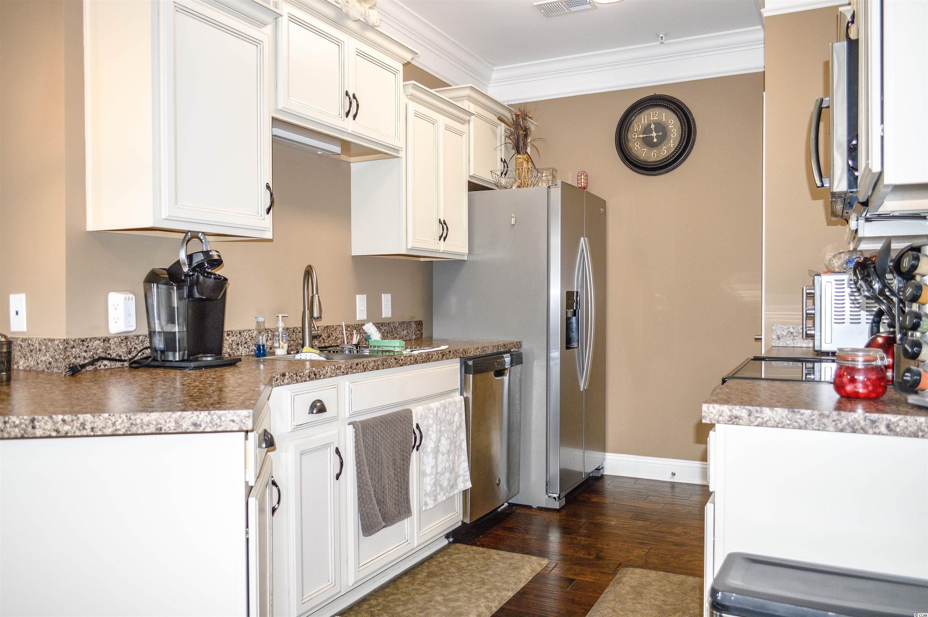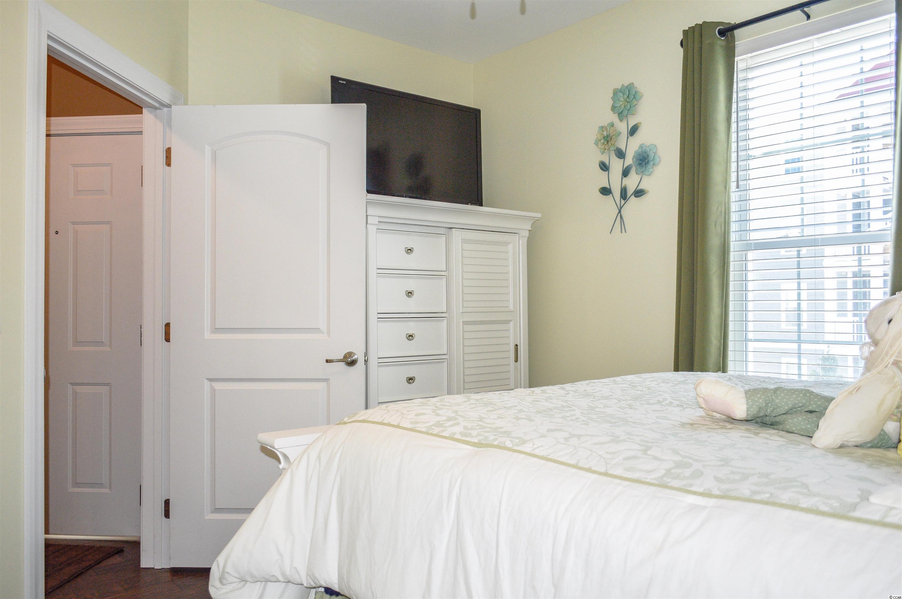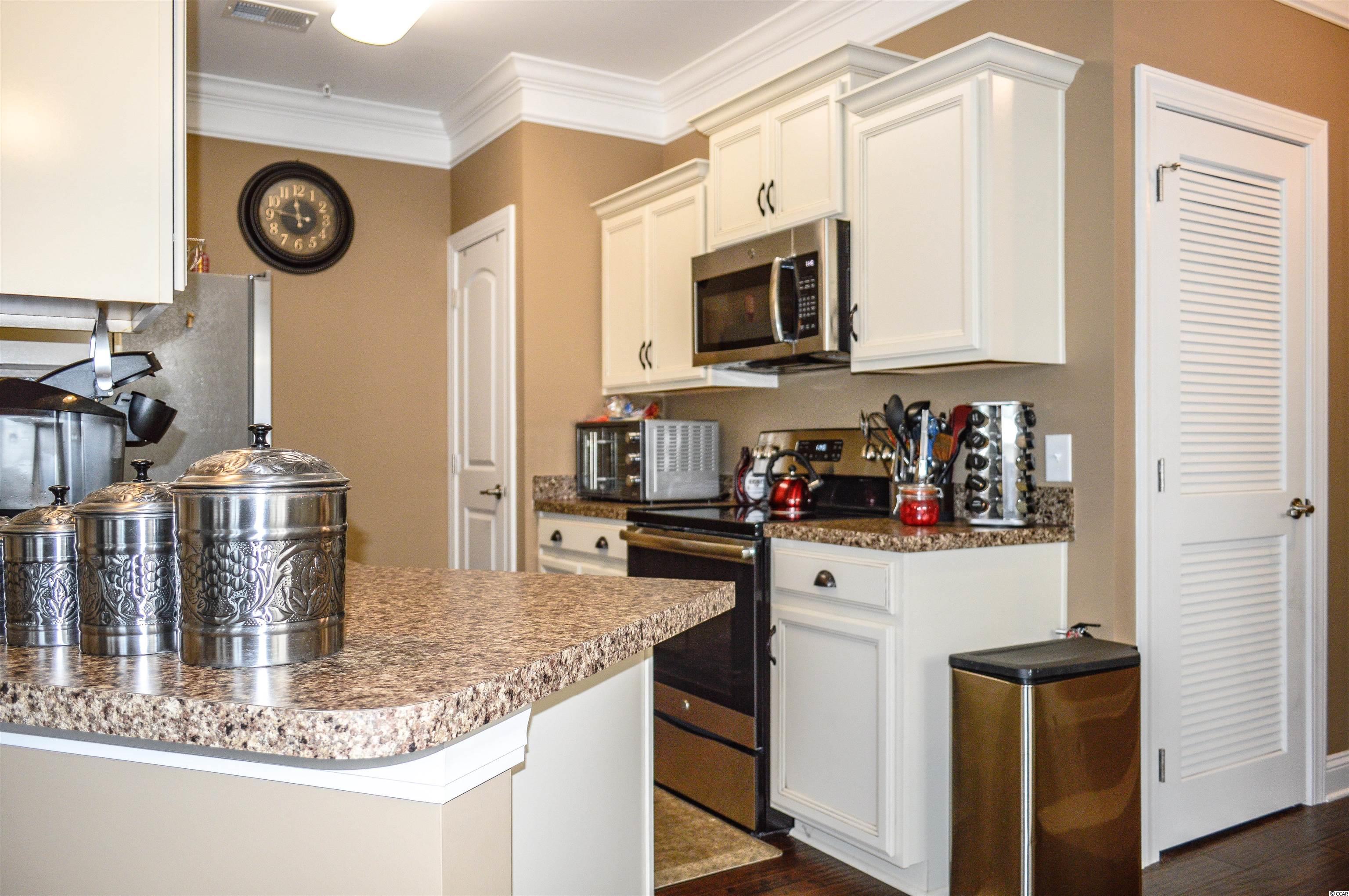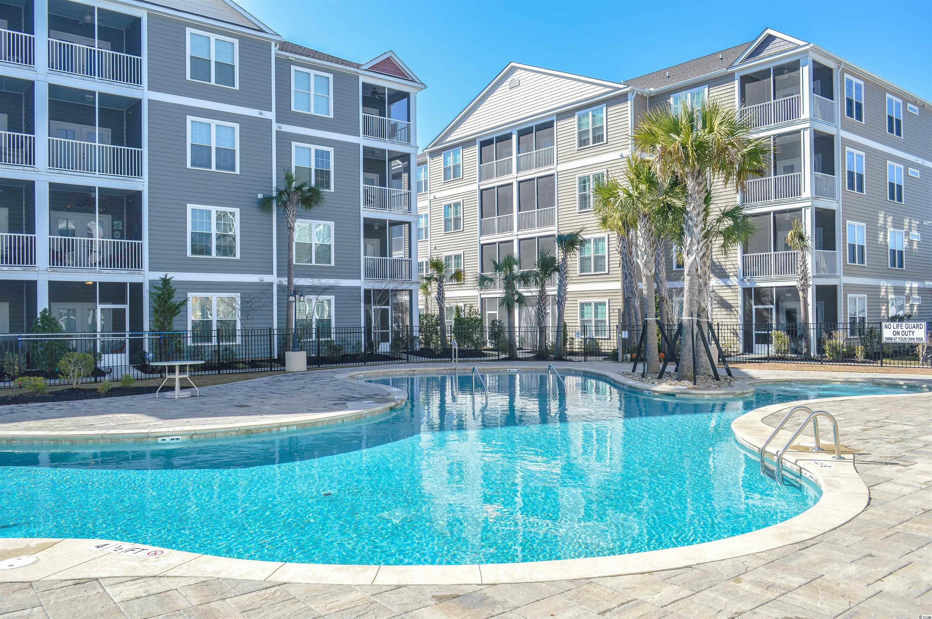 PRIME 3 bedroom 2 bathroom end-unit sold partially furnished in The Villages at Queen Harbour! Unit has been meticulously maintained/upgraded by current owners and is practically brand new (2.2 years old). LOCATION, LOCATION, LOCATION. The Villages at Queen Harbour is close to major highway access, a plethora of shopping/dining options, and a short drive to Market Commons, Coastal Grand Mall, Myrtle Beach Airport, Murrells Inlet, and the beach! On-site amenities include a beautiful community clubhouse with outdoor resort style pool & picnic areas with built-in barbecues. Monthly HOA includes basic cable, interior water/sewer, pest control (monthly sprays), elevator service, pool service, landscaping, trash, and building insurance. Unit is located on the second floor in building 189 which features an elevator and attached private storage closet (with built-in shelves) in the hallway. One of the main differences between the end-units and interior units are the large side windows (hurricane proof) which bring in tons of natural light and brightens the floorplan. Walking through the front door (storm door) you enter into a spacious foyer with the first of three bedrooms off to the right and the second bedroom off the hallway to the right (split bedroom floorplan with master bedroom at the back of the unit). Both bedrooms feature plenty of closet/storage space and overhead ceiling fans. Full bathroom off hallway is equipped with a single sink bowl vanity and tub/shower combo. Laundry/utility closet features built-in overhead storage shelves and washer/dryer connections. Open concept floorplan is highly functional with the dining room just off the living room across from the spacious galley style kitchen which boasts a full set of stainless steel appliances, plenty of upgraded cabinet space, pantry, and a small breakfast bar. Large living room features an overhead ceiling fan and door access to the private screened-in back porch. Just off the living room through the double doors is the master suite complete with overhead ceiling fan and two large closets. Master bathroom en-suite offers a double vanity with a single sink and walk-in shower. Dont forget about the upgrades like crown molding in the living room, hallway, and kitchen as well as wood flooring throughout (except bathrooms). Being sold partially furnished including: blinds, window coverings, bunkbed set with attached stairs, dining room table with 6 chairs, rugs in the dining room & living room, and a luxury sectional leather couch & high end living room hutch/entertainment center. This unit must be seen to be appreciated - schedule your private showing today!