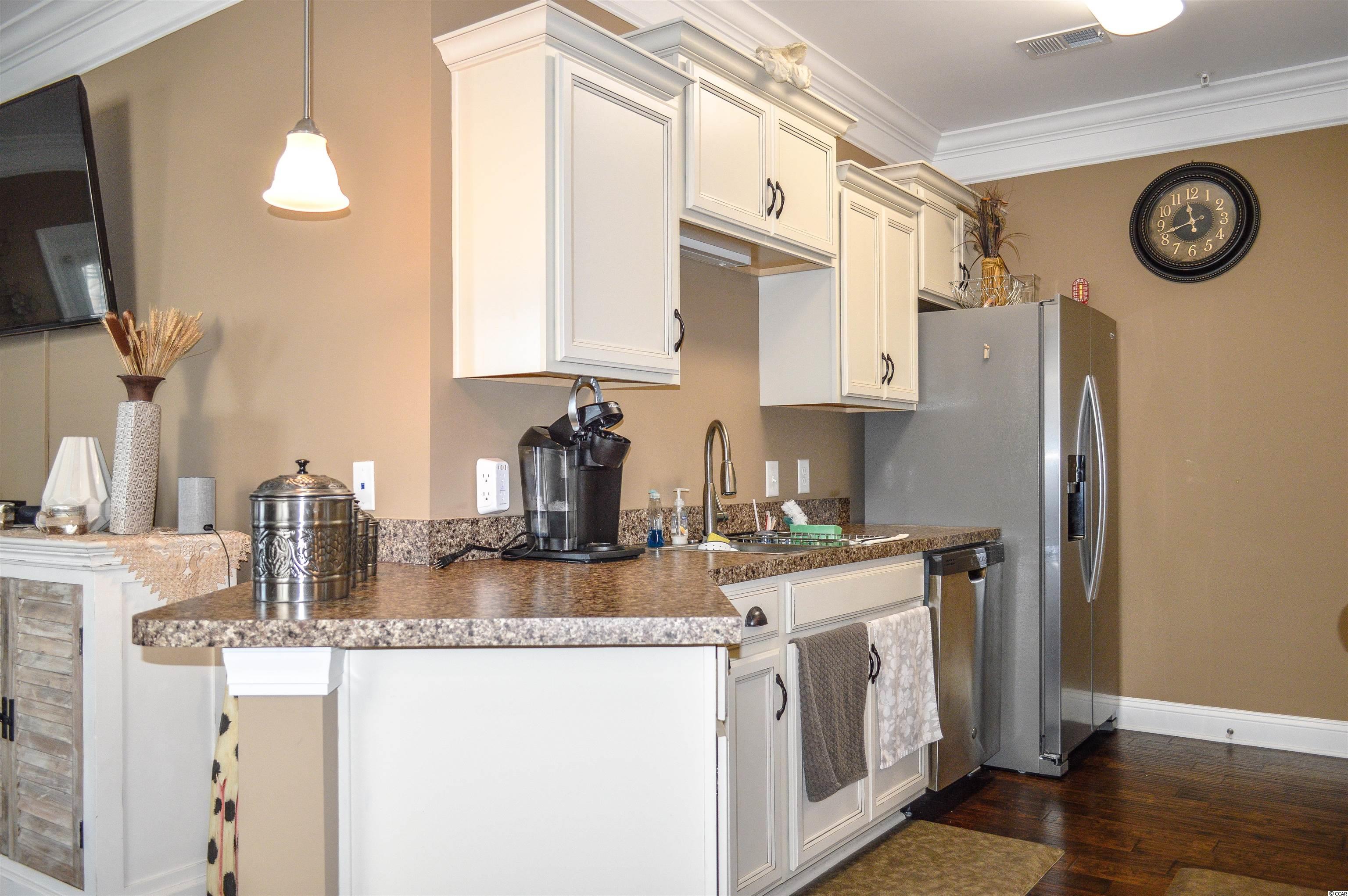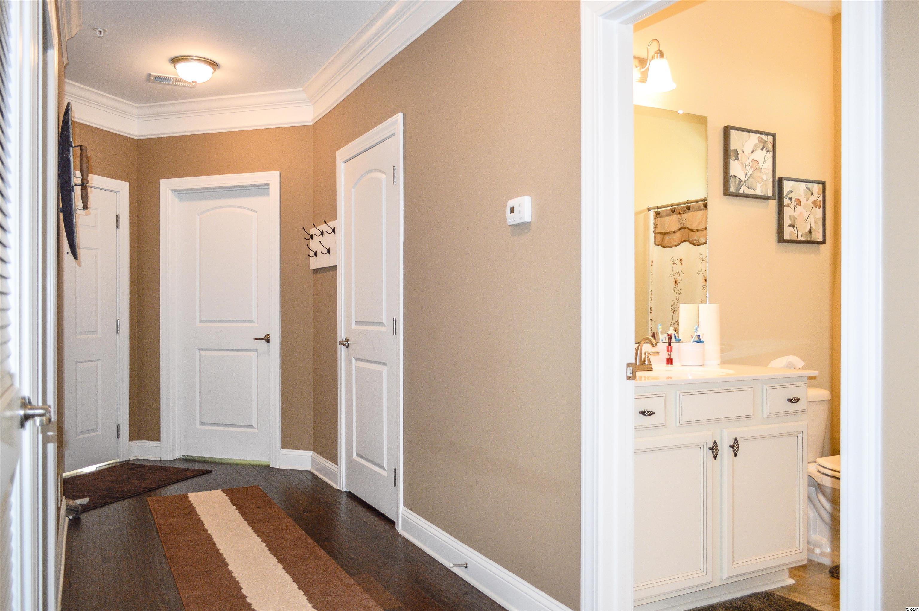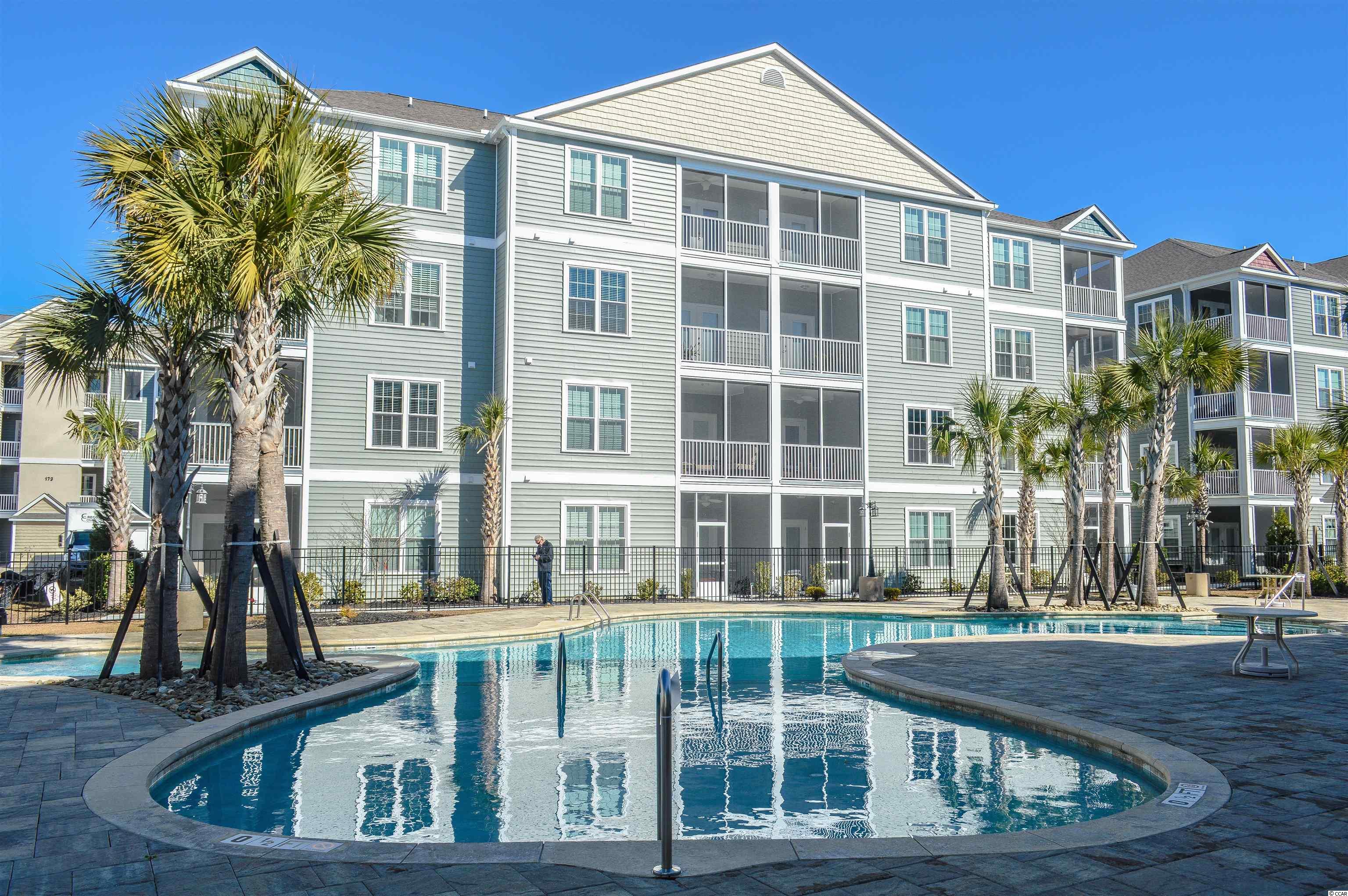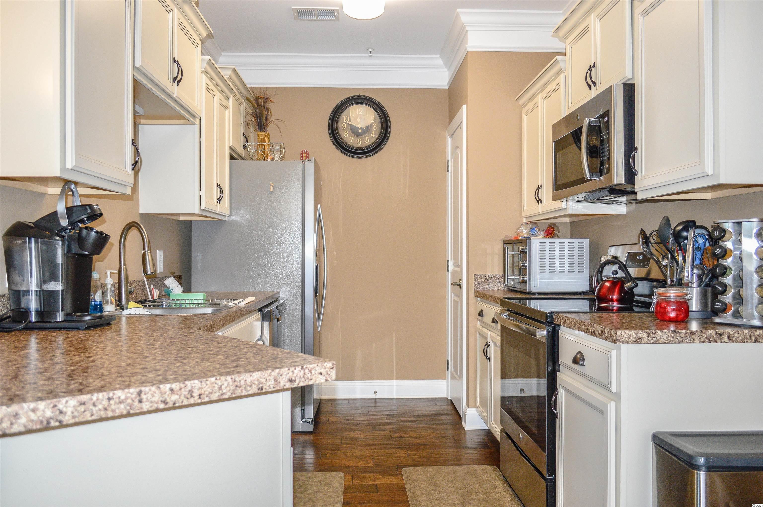 PRIME 3 bedroom 2 bathroom end-unit sold partially furnished in The Villages at Queen Harbour! Unit has been meticulously maintained/upgraded by current owners and is practically brand new (2.2 years old). LOCATION, LOCATION, LOCATION. The Villages at Queen Harbour is close to major highway access, a plethora of shopping/dining options, and a short drive to Market Commons, Coastal Grand Mall, Myrtle Beach Airport, Murrells Inlet, and the beach! On-site amenities include a beautiful community clubhouse with outdoor resort style pool & picnic areas with built-in barbecues. Monthly HOA includes basic cable, interior water/sewer, pest control (monthly sprays), elevator service, pool service, landscaping, trash, and building insurance. Unit is located on the second floor in building 189 which features an elevator and attached private storage closet (with built-in shelves) in the hallway. One of the main differences between the end-units and interior units are the large side windows (hurricane proof) which bring in tons of natural light and brightens the floorplan. Walking through the front door (storm door) you enter into a spacious foyer with the first of three bedrooms off to the right and the second bedroom off the hallway to the right (split bedroom floorplan with master bedroom at the back of the unit). Both bedrooms feature plenty of closet/storage space and overhead ceiling fans. Full bathroom off hallway is equipped with a single sink bowl vanity and tub/shower combo. Laundry/utility closet features built-in overhead storage shelves and washer/dryer connections. Open concept floorplan is highly functional with the dining room just off the living room across from the spacious galley style kitchen which boasts a full set of stainless steel appliances, plenty of upgraded cabinet space, pantry, and a small breakfast bar. Large living room features an overhead ceiling fan and door access to the private screened-in back porch. Just off the living room through the double doors is the master suite complete with overhead ceiling fan and two large closets. Master bathroom en-suite offers a double vanity with a single sink and walk-in shower. Dont forget about the upgrades like crown molding in the living room, hallway, and kitchen as well as wood flooring throughout (except bathrooms). Being sold partially furnished including: blinds, window coverings, bunkbed set with attached stairs, dining room table with 6 chairs, rugs in the dining room & living room, and a luxury sectional leather couch & high end living room hutch/entertainment center. This unit must be seen to be appreciated - schedule your private showing today!