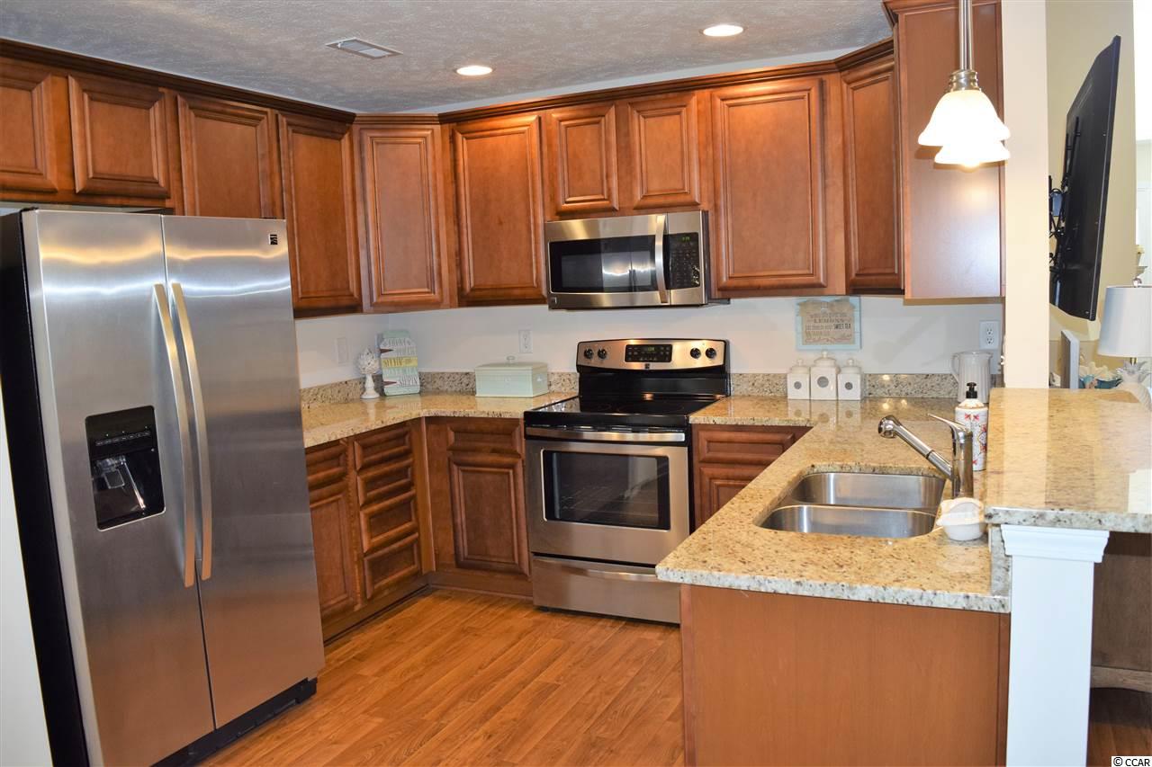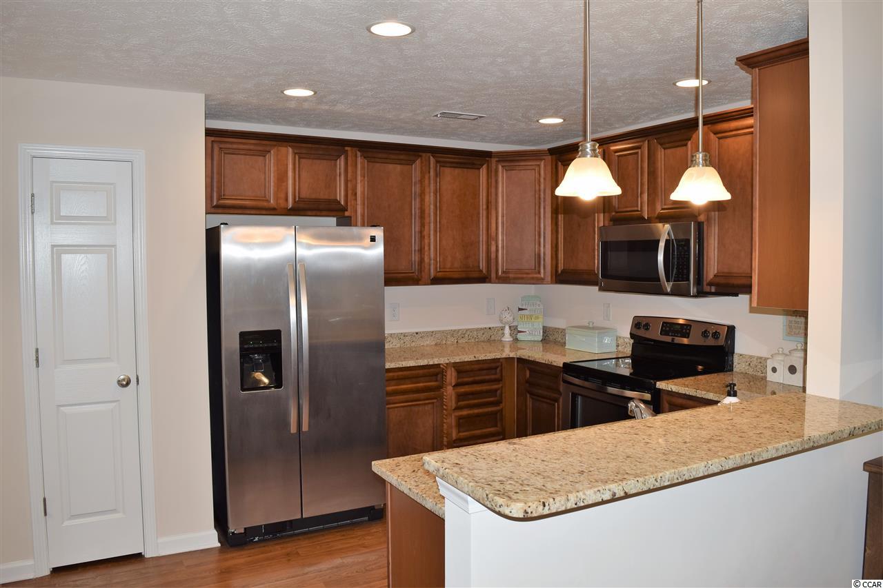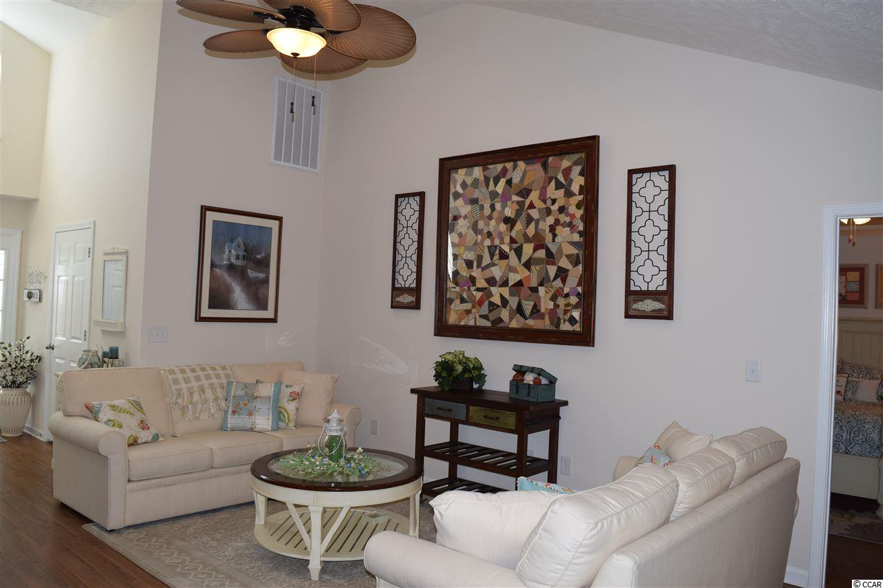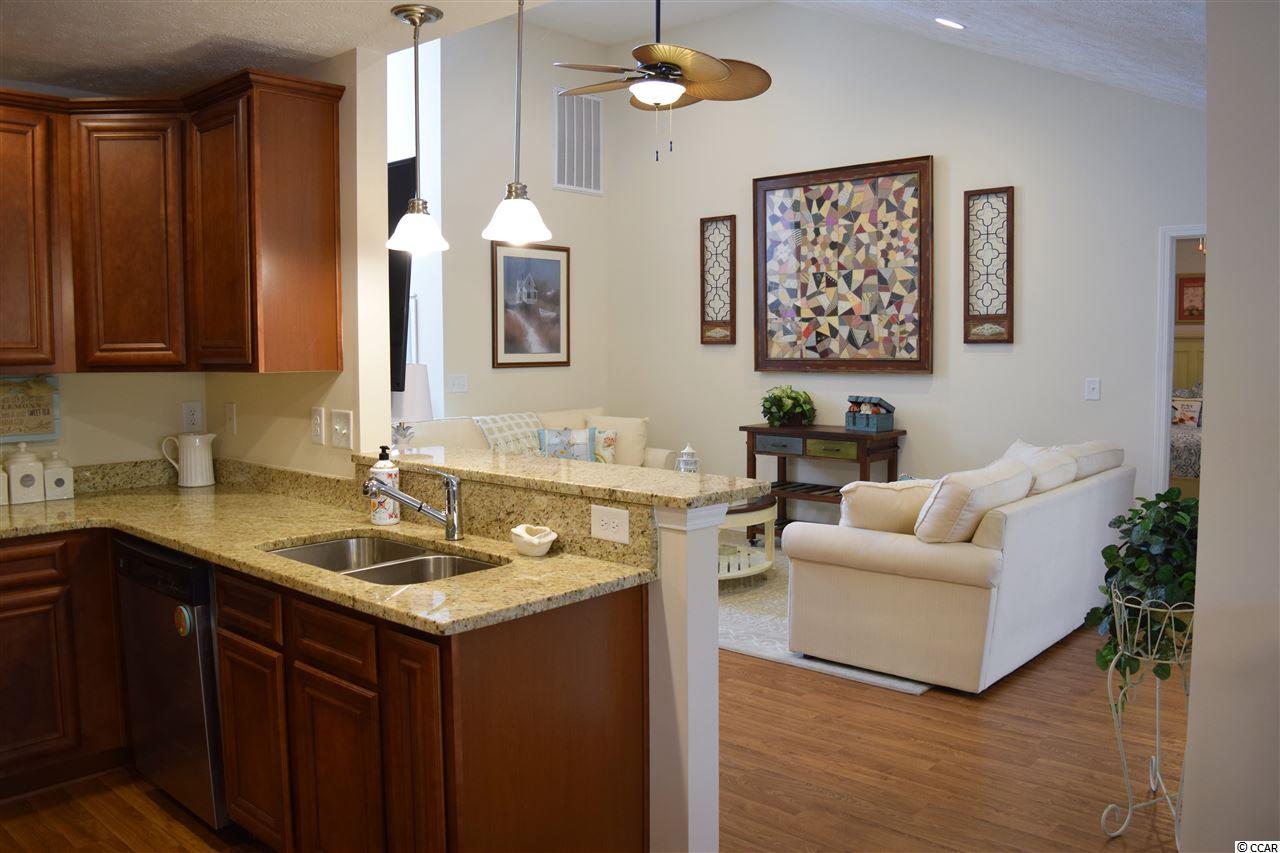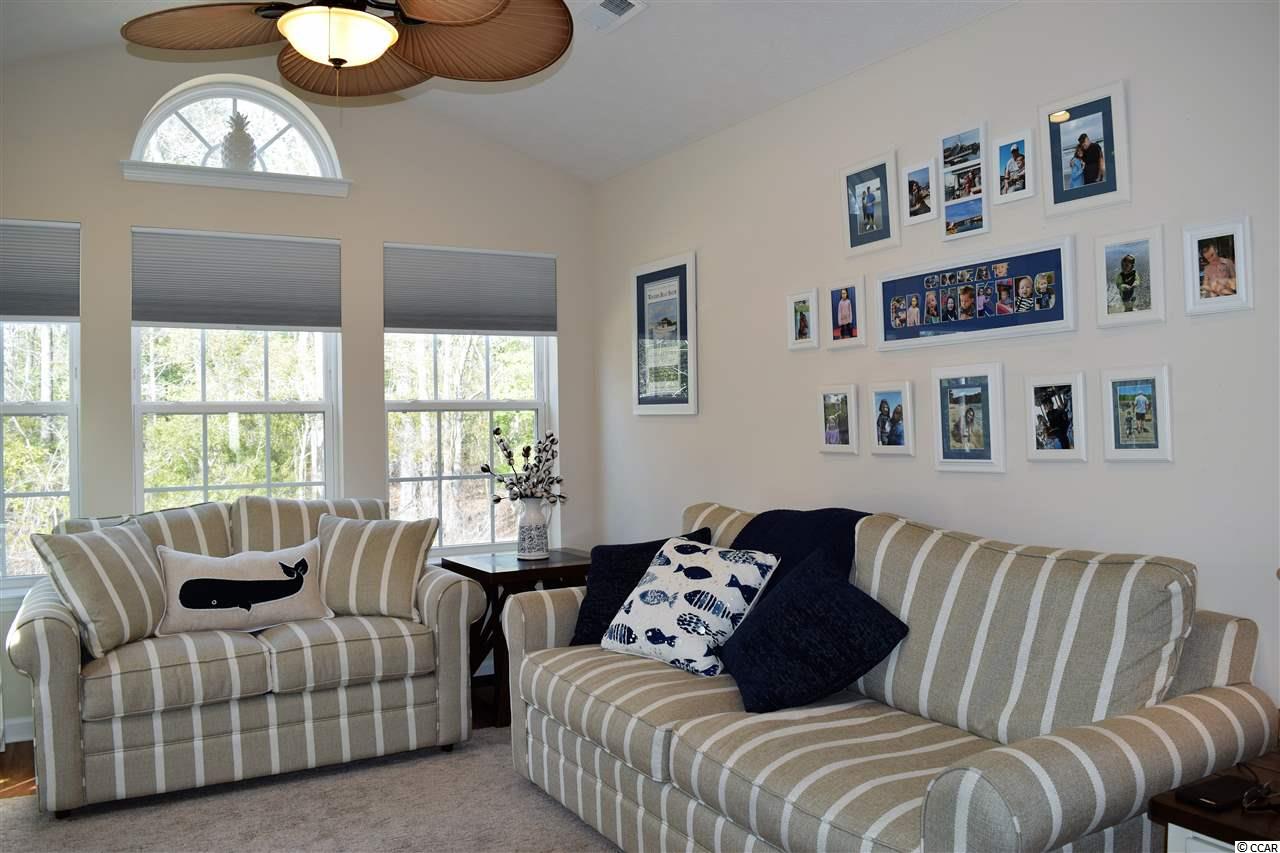Better than brand new open floor plan home just minutes to the beach. This immaculate home feels super spacious and boasts a large Carolina room in addition to three bedrooms and two baths. The family room has vaulted ceilings and opens to the lovely vaulted Carolina room that overlooks the large back yard with woods behind. The kitchen has been beautifully upgraded with maple glazed cabinets, granite, and stainless steel appliances. The dining room has a bay window to enjoy the view and ample room for a big table, hutch and buffet. The kitchen has granite counters, stainless steel appliances, upgraded cabinets and a pantry. The master suite has a big walk in closet, tray ceiling and an ensuite bath with a garden tub, linen closet and special features such as a custom mirror and comfort height toilet. The front bedroom has a vaulted ceiling and palladium window. The third bedroom has a big closet. Both bedrooms were enlarged 2' in width and 1' in length during construction. The laundry room has a big linen closet. The lighting throughout the home has been upgraded with recessed lighting, nice ceiling fans, and exterior motion lights. The garage has attic stairs and a side door. The back patio is 10 x 14. This beautiful home has it all and a great location just minutes to the ocean, shopping, dining and recreation at the Market Common, good schools, and all the fun of the Grand Strand. There is also a nice community pool. This is the home for you!
