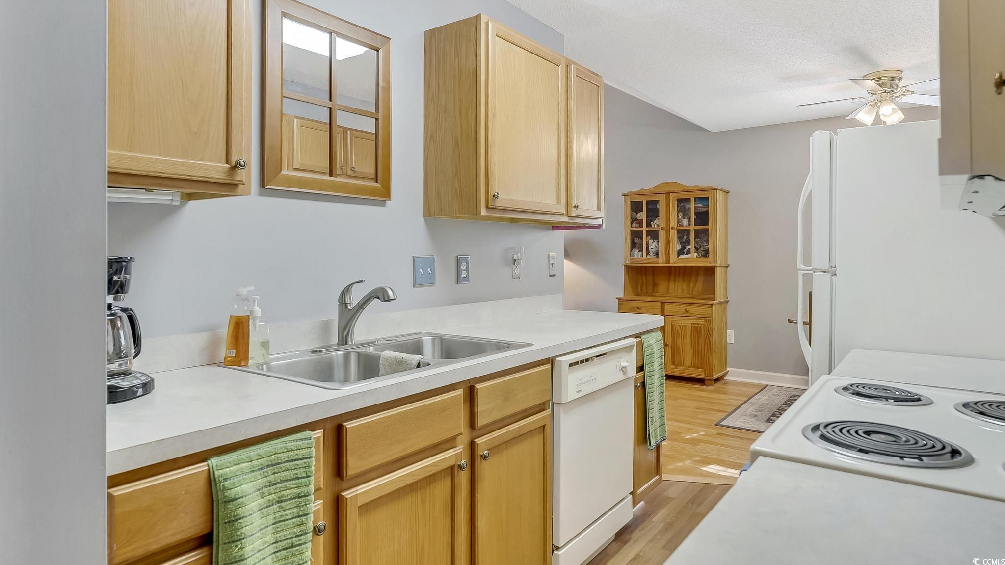 NEW ROOF AND GUTTERS! TRANSFERABLE ROOF WARRANTY. Charming 3-bedroom, 2-bathroom single-level home nestled in the desirable golf course community of Colonial Place. This inviting residence features vaulted ceilings in the spacious living room, creating an airy and open atmosphere. Immerse yourself in the warmth of the home with beautiful hardwood floors extending through the living room, dining area, and hallway. The primary suite is a retreat in itself, boasting a tray ceiling and an attached bathroom complete with a convenient walk-in shower. The galley kitchen is both functional and stylish, seamlessly connecting to the dining area for easy meal preparation and entertaining. Slide open the glass doors from the dining area to reveal a delightful screen porch, providing a perfect spot for relaxation and enjoying the outdoors. The porch conveniently leads to a back patio, ideal for hosting gatherings or simply basking in the fresh air. Plantation shutters throughout the home add a touch of elegance. With an attached one-car garage, parking is a breeze, ensuring convenience for your daily routine. Additionally, the large attic is a great place for storage. Take advantage of the community pool for leisurely afternoons or entertaining friends and family. This home not only offers comfort and functionality but also provides easy access to major highways, the beach, restaurants, entertainment, and medical facilities, making it a prime location for a well-rounded lifestyle. Don't miss the opportunity to make this Colonial Place residence your dream home! Square footage is approximate and not guaranteed. Buyer responsible for verification.