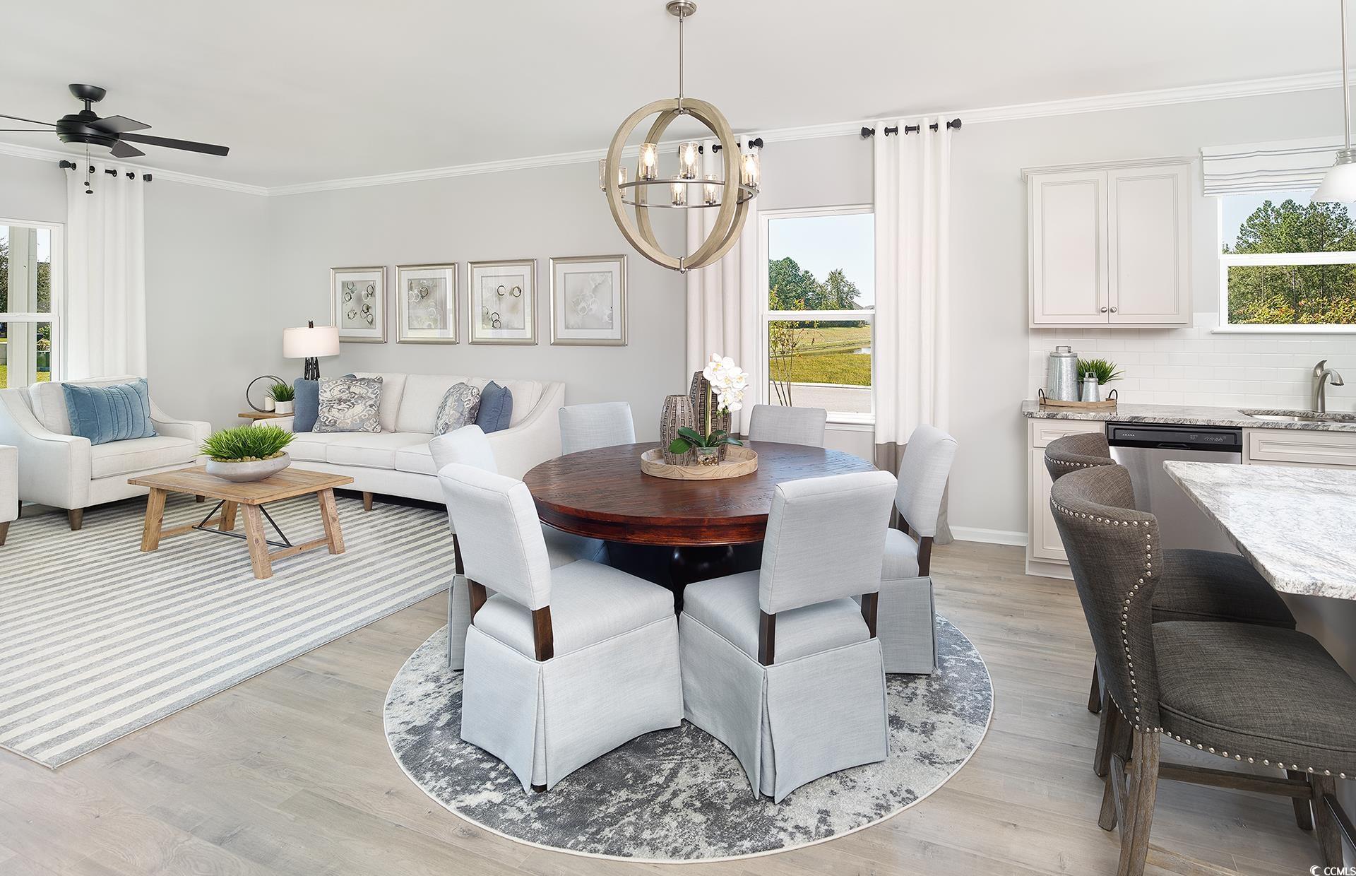 COMMUNITY CLOSE OUT- ONLY 4 HOMES LEFT -Eagle Run is the place to be! Close to the beach and features great amenities within the community! This lovely floor plan is the Morgan at 1,702 sq ft with a gorgeous back yard view of mature trees and over-looking Crow Creek Golf Course- The home features vinyl siding, brick finish and an amazing front porch. It has three bedrooms, two bathrooms, and a large, versatile flex room! An added screened-in lanai and extended patio grace the home so you can enjoy the beautiful southern weather! Your kitchen is a space you'll enjoy spending time in because of the functional space and upgrades: enhanced layout, quartz countertops, subway tile backsplash, black fixtures & hardware, stainless-steel electric appliances, and large island. There is an open concept floor plan, and added window in the gathering room, that creates a bright, flowing space for you to enjoy. Upgraded trim and LVP flooring has been installed through the main areas of the house, and you'll love the upgraded tile in the bathrooms and laundry room. Bedrooms are carpet to make the space extra cozy. In your owner suite, the tray ceiling with crown molding and LVP flooring adds a luxurious touch! Your owner's bath features a dual vanity and walk-in shower with tile surround. With a plethora of upgrades, like interior and exterior lighting, enhanced trim, crown molding, chairs and squares, all appliances, window blinds, and more, there is so much you'll love about this home! Complete with garage door opener and sink, a full yard irrigation system, full sod and landscaping! Just bring your personal property/furniture and you are good to go! The community has great amenities, including a 2200 sq ft +/- salt water pool, 2 pickleball courts, a wood burning fire pit by the water, and a pavilion with restrooms for your use. Pulte is an esteemed builder who stands behind their homes with an industry leading in-house warranty for up to 10 yrs at no extra cost. With so many amazing features and perks of owning a Pulte home, make this one yours! Eagle Run is located within 30 minutes of 60 golf courses, 10 minutes from multiple beautiful beaches and 5-10 minutes from all your shopping needs.