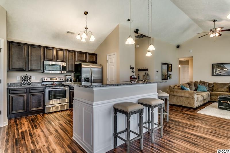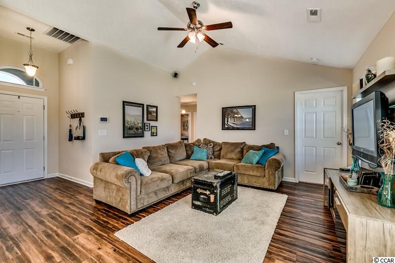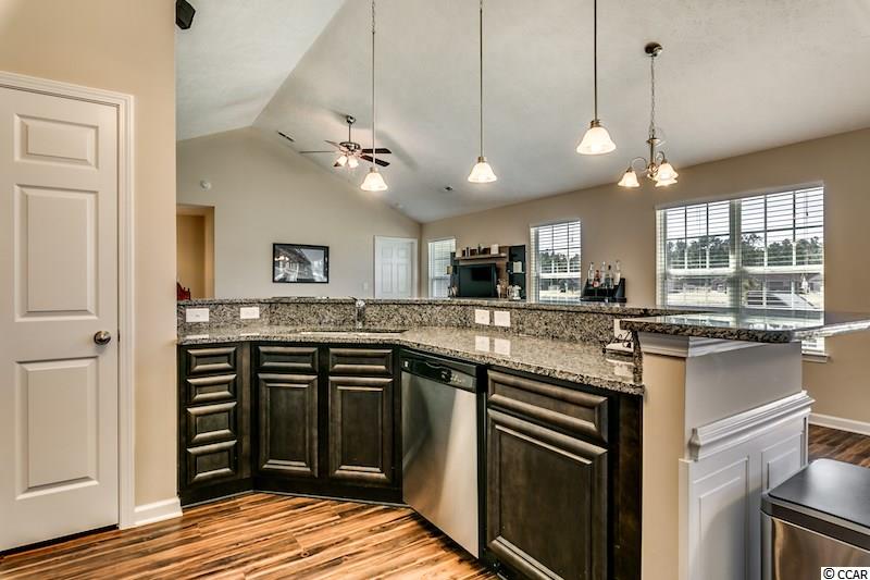 The view from this natural light-filled residence must be experienced first-hand! Located in Myrtle Beach's Highland Park community, this neighborhood is intentionally selected by those seeking a more peaceful lifestyle while not sacrificing the convenience of all Myrtle Beach has to offer. The open-concept design, abundant natural light, and cathedral ceilings create an impressive feel. The floor plan showcases three bedrooms and two full baths, with plenty of room for sleep, relaxing and entertaining, and storage. The master bedroom, complete with a walk-in closet and ensuite bath, ensures a private space to enjoy the backyard view. Rest easy knowing that this home is generously equipped with thoughtful upgrades, including old growth pine floors, large fenced back yard, stainless steel appliances, New Caledonia granite countertops, and elevated bathroom vanities. In addition, the garage was customized by increasing the door height to accommodate oversized vehicles. The custom-built pergola is just the icing on the cake. The HVAC system was upgraded and includes UV light to protect against bacteria, mold, and allergies. Enjoy the additional benefits of an award-winning school district, low HOA, and the almost-completed community pool. Easy access to Market Common, shopping, dining, entertainment, the airport, and the beach. Square footage is approximate and not guaranteed. Buyer is responsible for verification. From the Sellers, ""What I Love About This Home:"" One of our favorite things about this house is the view from our patio. The sun sets over the pond and looks beautiful on the water. We enjoy unwinding in the evenings by sitting out under the pergola and watching the sun go down. In the summer evenings we can hear crickets and frogs by the lake. Ducks, swans, herons, and geese make appearances on the lake at different times throughout the year and are beautiful to watch. Fortunately, the fence keeps them at a distance so we don't have to clean up after them! We really like the location of this home. It is a close drive to the beach and easy access to highways, but far enough in a wooded area that we don't hear traffic or feel congested. The neighborhood is quiet and the neighbors are friendly here. Furthermore, a pool is being built for the community and is nearly completed. We were especially pleased to find that our home was well protected from the tropical storms last year and recent hurricane that passed through the area. The yard slopes down on all sides so that even during flooding, water didn't get near our home. We didn't suffer damage from the wind either.