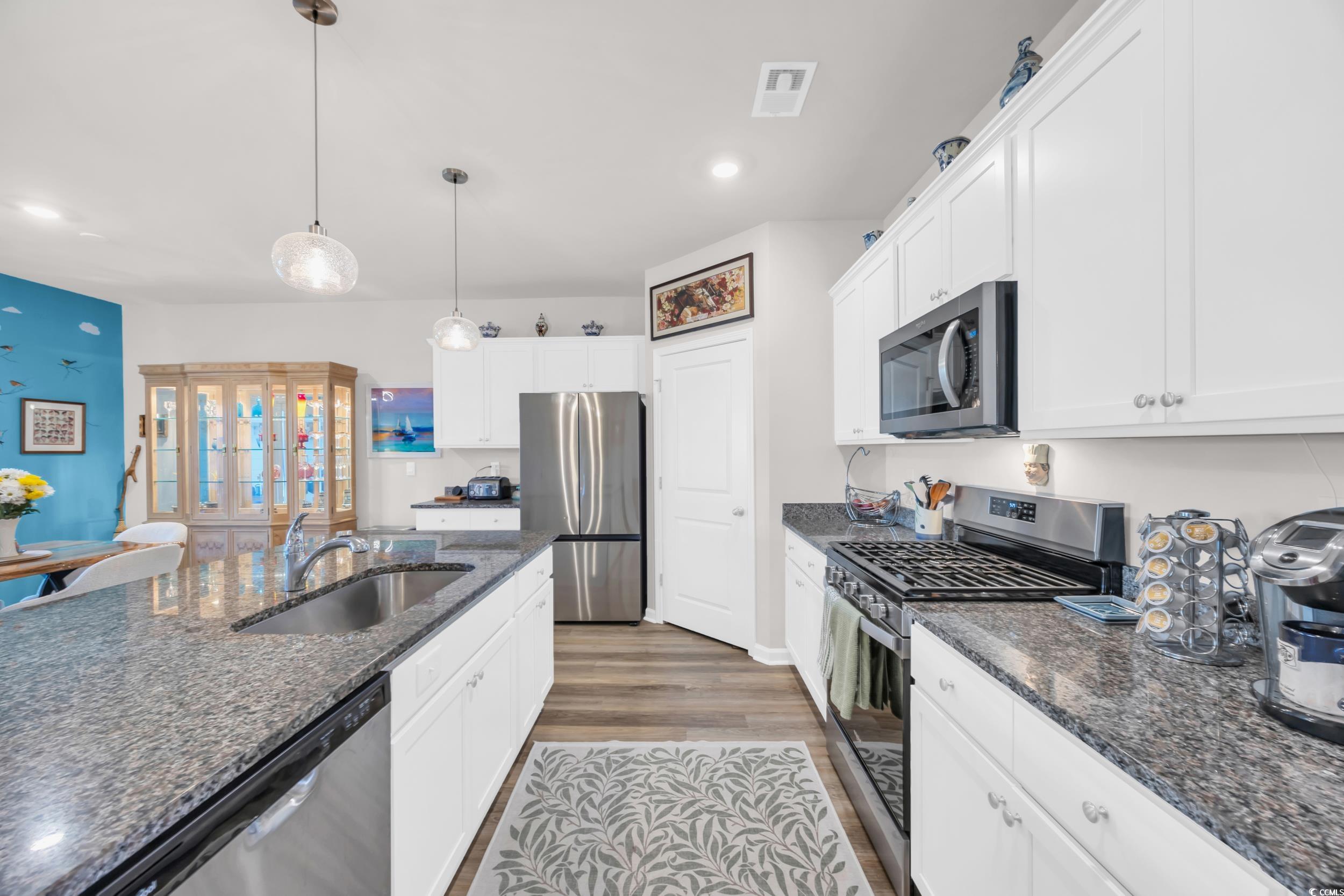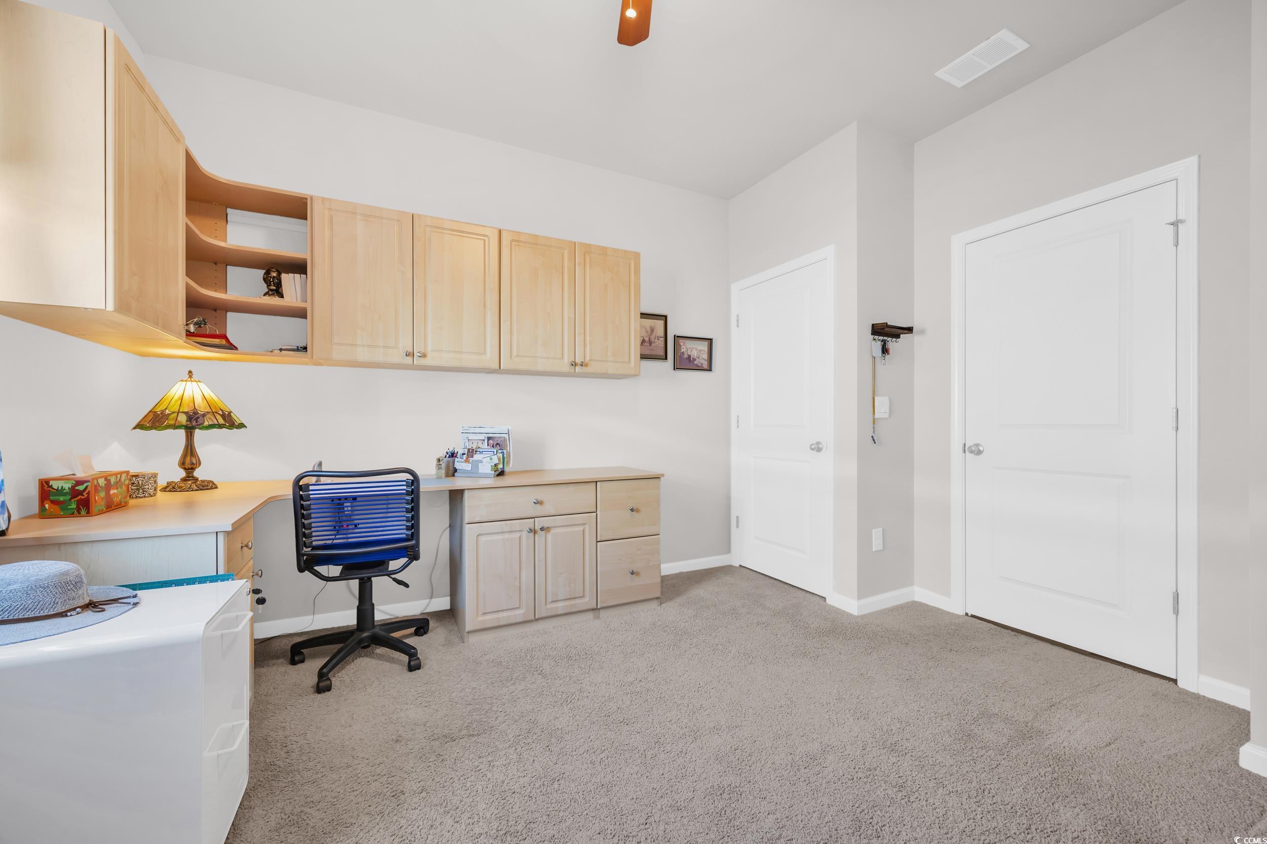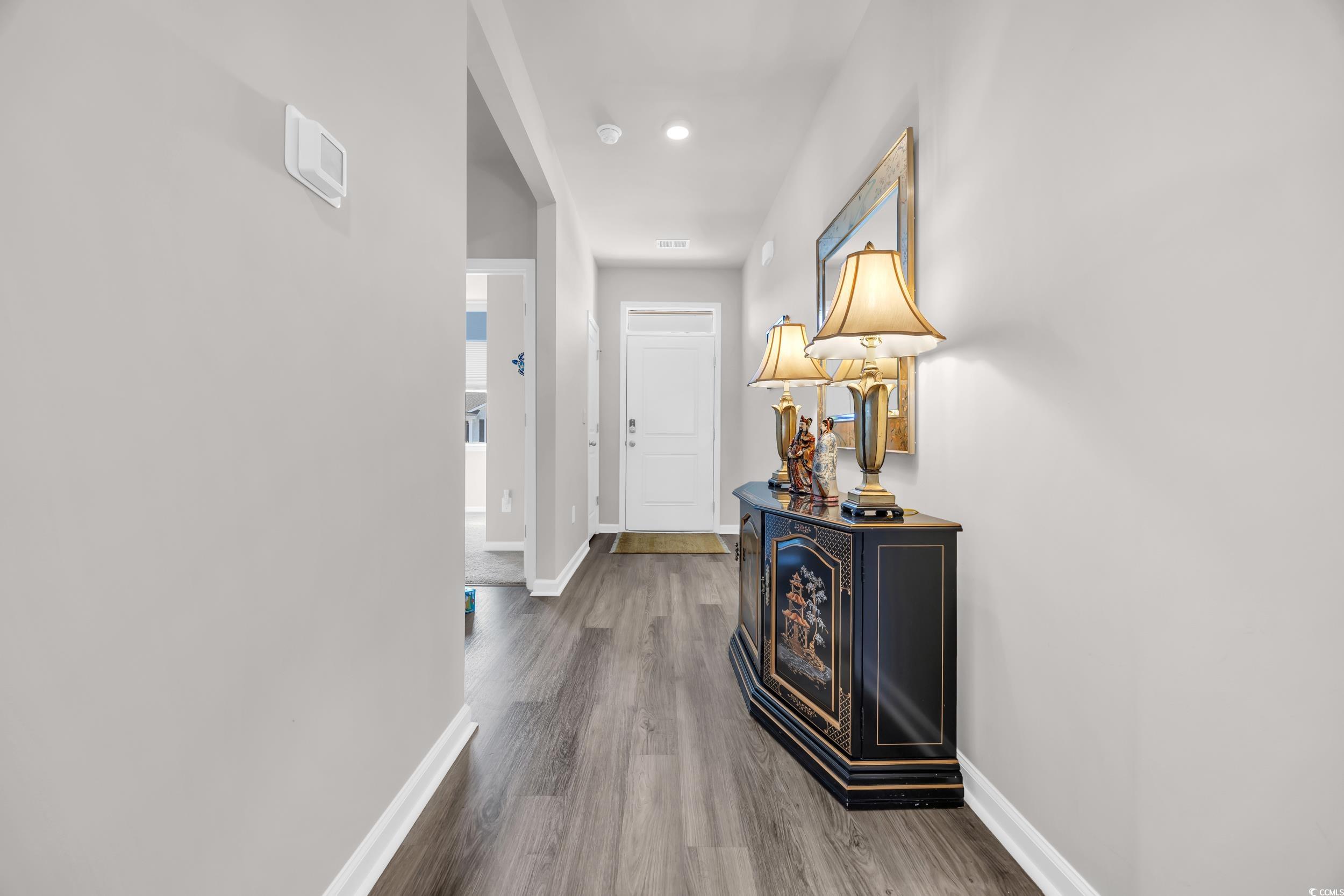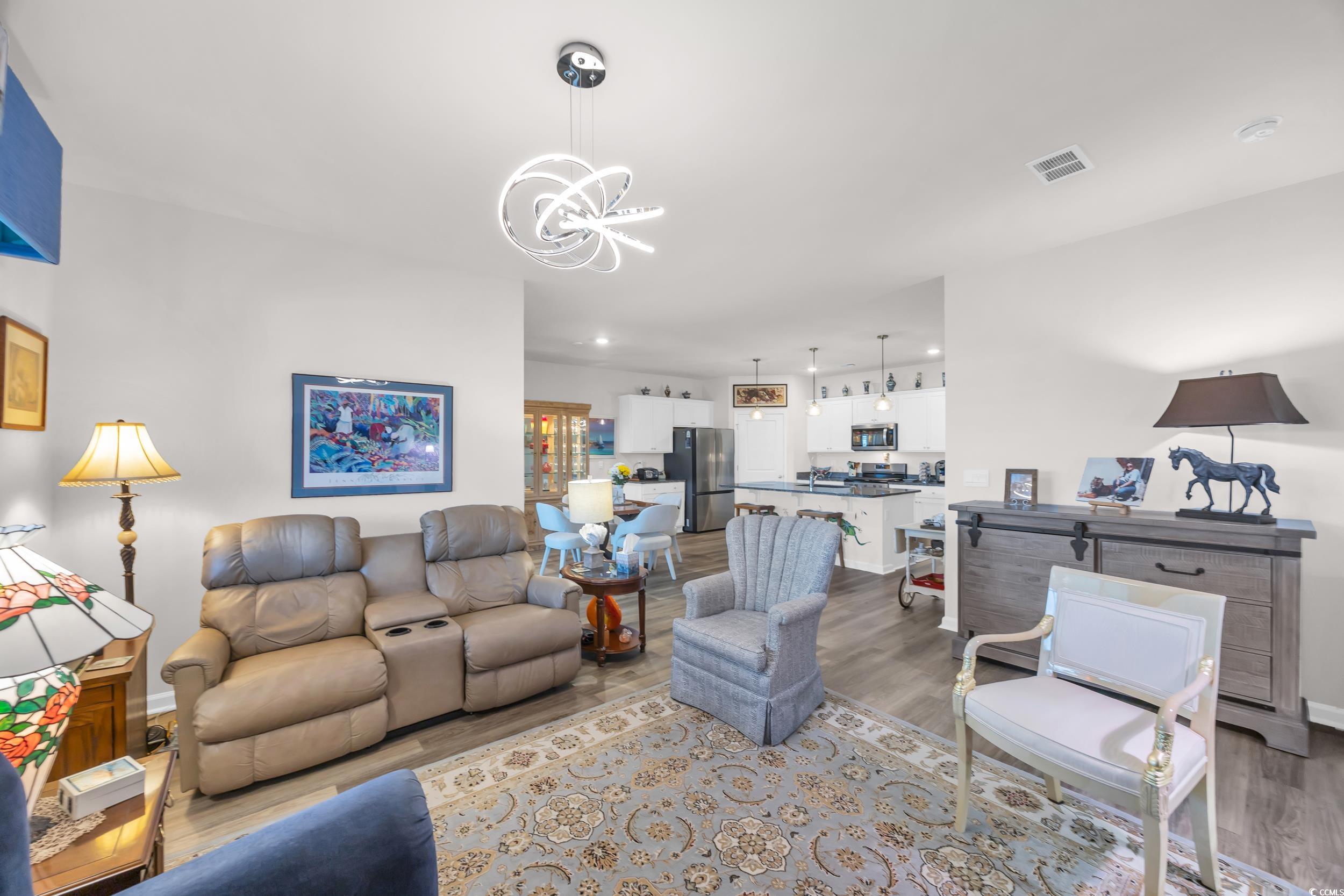 Step inside your Immaculate Four-Bedroom, Two-Bath Smart Home and experience the perfect blend of comfort, style, and convenience! If you are an organization enthusiast, this home has been thoughtfully designed with luxury storage upgrades and functionality in mind. You will find upgraded closets with custom cabinetry and built-ins, strategically placed shelving throughout, and a well appointed kitchen featuring glide-out drawers for effortless access. Every detail was planned to keep your home beautifully organized and clutter-free. Primary suite features a custom designed closet and frameless touchscreen lighted vanity mirror. Work from home in style! The Fourth Bedroom is designed as a functional home office, featuring a custom built-in desk and cabinets. The open light filled living areas flow seamlessly into your 3-season room with floor to ceiling Flex Vinyl windows offering peaceful views of your serene landscaped back yard overlooking green space. Garage includes pre-wired EV hook up as well as an electric elevator lift for your attic storage. Hurricane protection panel system for all doors and windows included. Enjoy a golf cart ride to the sought-after Market Common, close to shopping, dining, and beautiful beaches. Your Someday is Here! Schedule your private showing today!