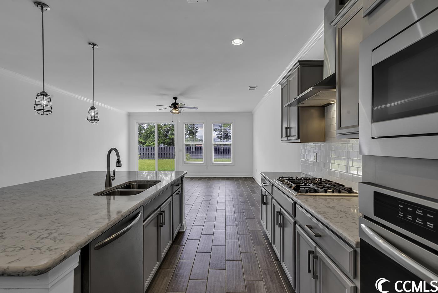 REDUCED FOR QUICK SALE!!! Move-in ready home in the Meridian Subdivision of the Market Common Community. This magnificent home is like-new and very spacious. This is a Tillman floorplan that is a very popular 2 story, open floor plan with a first-floor owner's suite. Beautiful luxury wood-like tile floors throughout the dining room, kitchen, and living room. Huge kitchen with ample counter space and 36"" cabinets and soft-close drawers, quartz counters, nice size pantry, and an oversized counter height working island that overlooks the living room which is perfect for entertaining. Very spacious owner's suite with a massive walk-in closet. Owners bath has double vanity, tile floors and 5 ft. tiled walk-in shower. Off the entry foyer stairs lead up to an amazing bonus room/loft that measures nearly 20' x 20'! 4 large additional bedrooms, laundry room and 2 full baths finish off the upstairs It has over 3,200 square feet of heated space, with two living rooms for your family to spread out in. The list of upgrades is available upon request, including a completely fenced-in yard large enough to have your own private pool. You simply must come and look. It is definitely worth the money. Golf carts are permitted, as are pools and other amenities. Within 15 minutes, you can be at a golf course, a restaurant, a grocery store, a medical facility, and much more. The Myrtle Beach International Airport is only a few minutes away! This location is unbeatable!