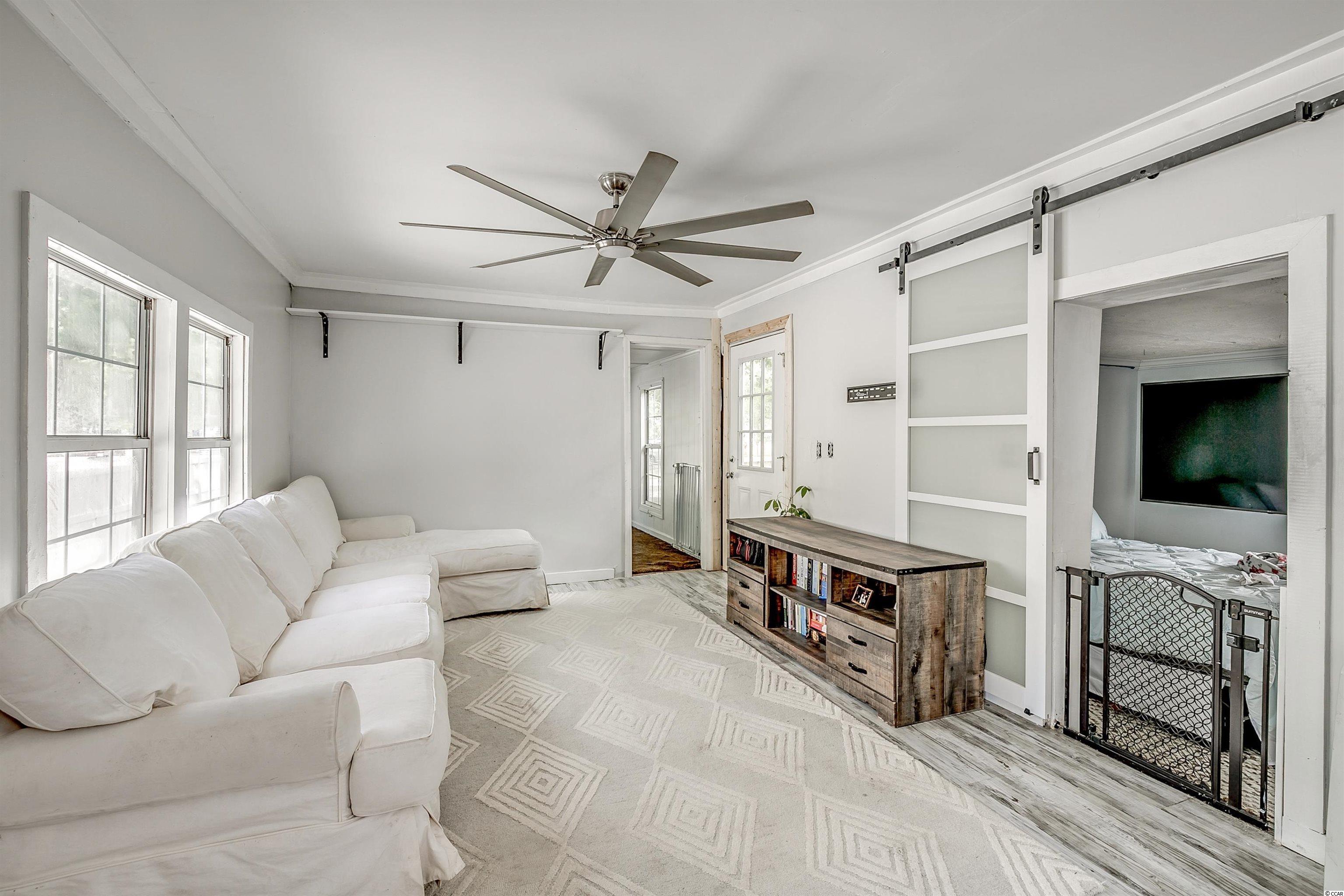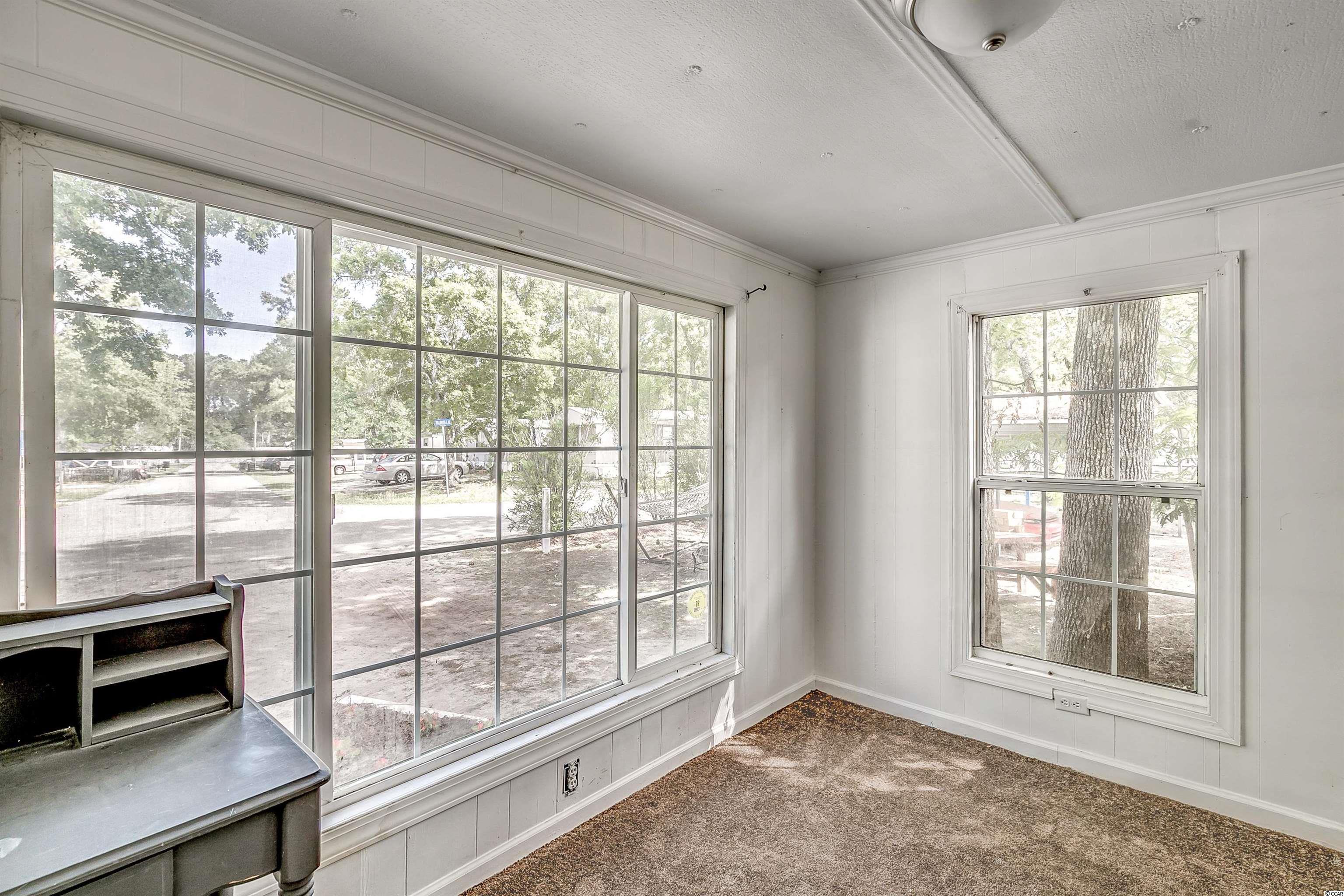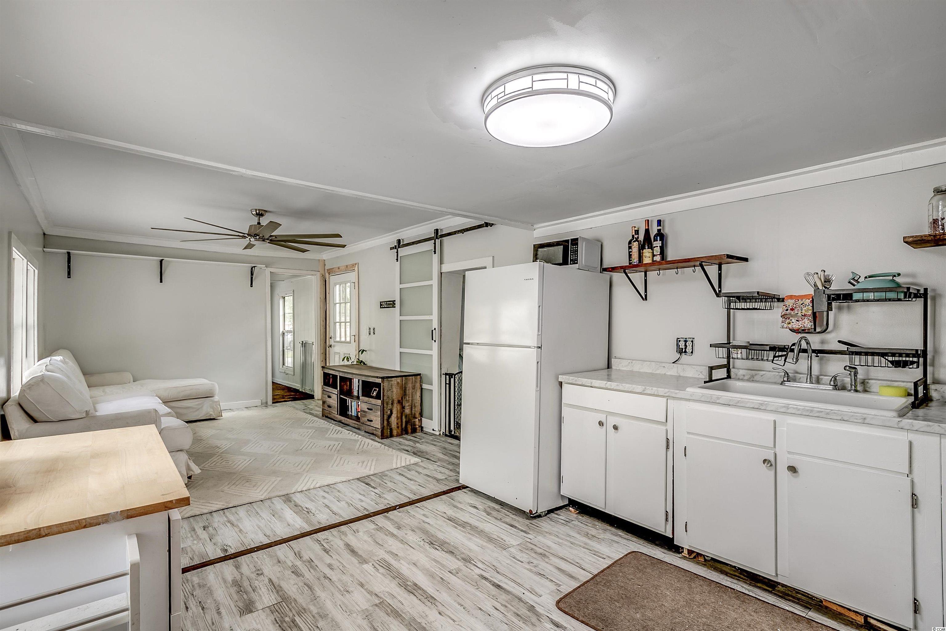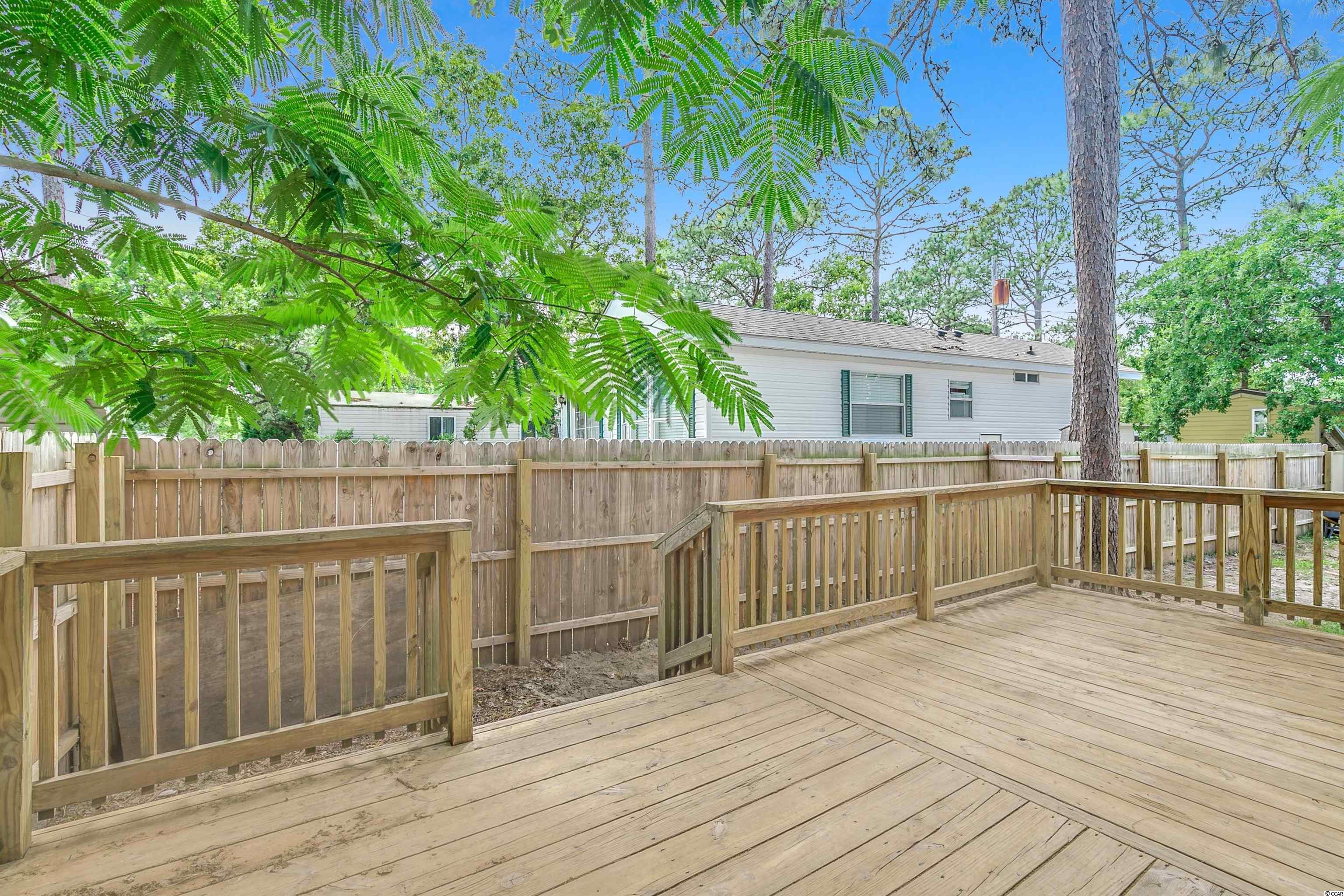 Come ride your golf cart to the beach and Market Common from this lovely home located in Crystal Lake! This spacious open concept provides plenty of room for entertaining, and the kitchen features a movable island along with a pantry! The primary bedroom is quite large with an en-suite bathroom, which has a huge custom tile shower! This beautiful home has a split floor plan with an oversized stainless steel ceiling fan in the living room. The entire home has been freshly painted and a dishwasher was added. This Southern-style kitchen features a farmhouse sink and rustic shelving along with modern countertops. A barn door was recently installed as well. The owners are even offering a home warranty for extra peace of mind. The washer and dryer will convey. The big yard is fenced-in, so it's the perfect place for your furry friends to play. There's also an outdoor storage building where you can store all of your beach necessities. The large front porch is a great place to grill out with your friends. You can even fish, kayak, and paddleboard on the lake! There's a lot of space for you to enjoy your freedom, unlike most condos that are stacked on top of each other. Owners are allowed to have motorcycles, golf carts, and pets! You can also store a boat or an RV in your driveway if it will fit. This neighborhood is conveniently located close to Myrtle Beach State Park, Prestwick Country Club, and Lakewood Elementary. There's even a dog park right down the street! Lot rent includes cable TV with over 100 channels and trash pickup along with recycling. This is a very desirable location, and you don't want to miss out on this one! Schedule your showing today! Square footage is approximate and not guaranteed. Buyer is responsible for verification.