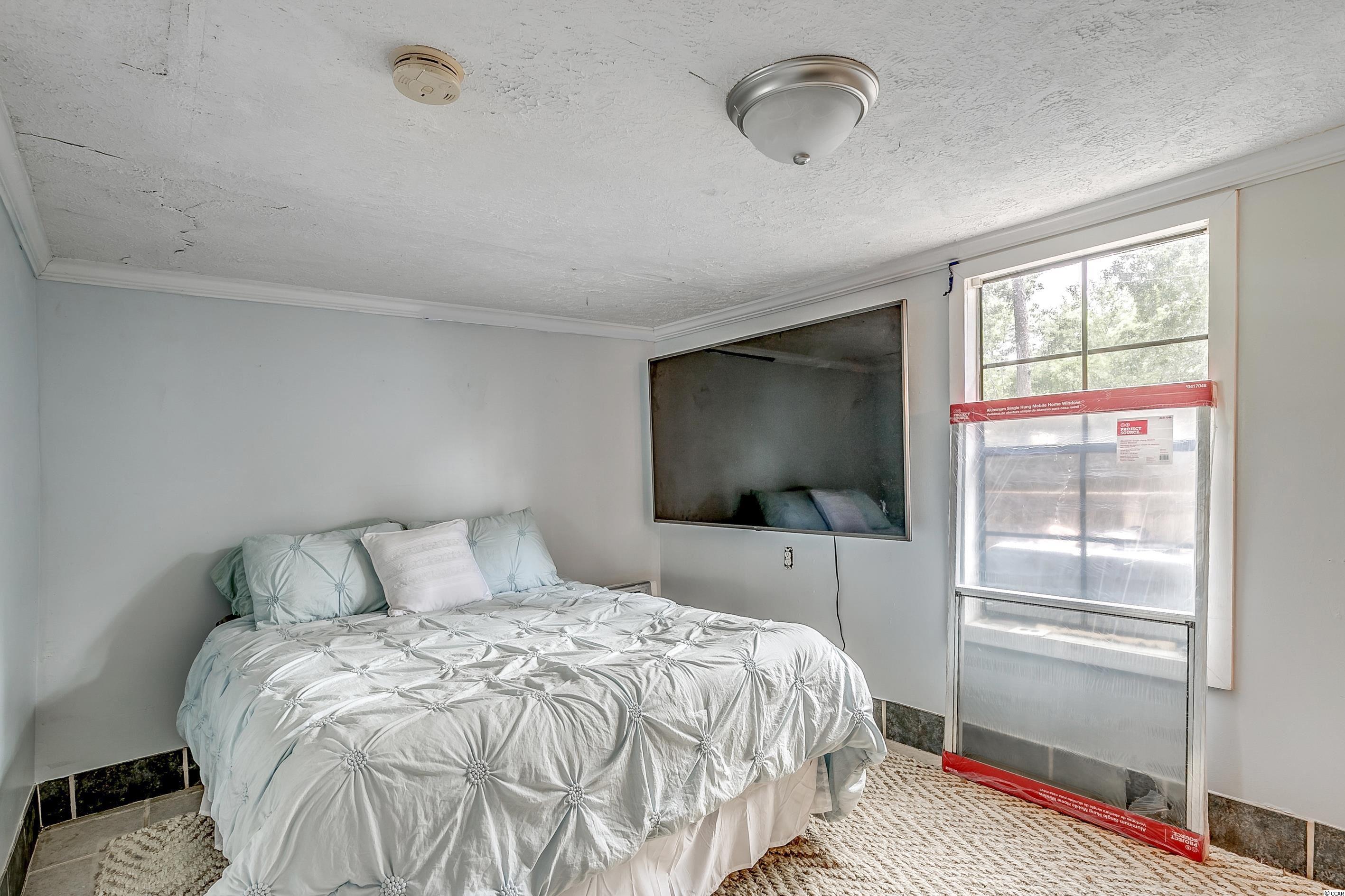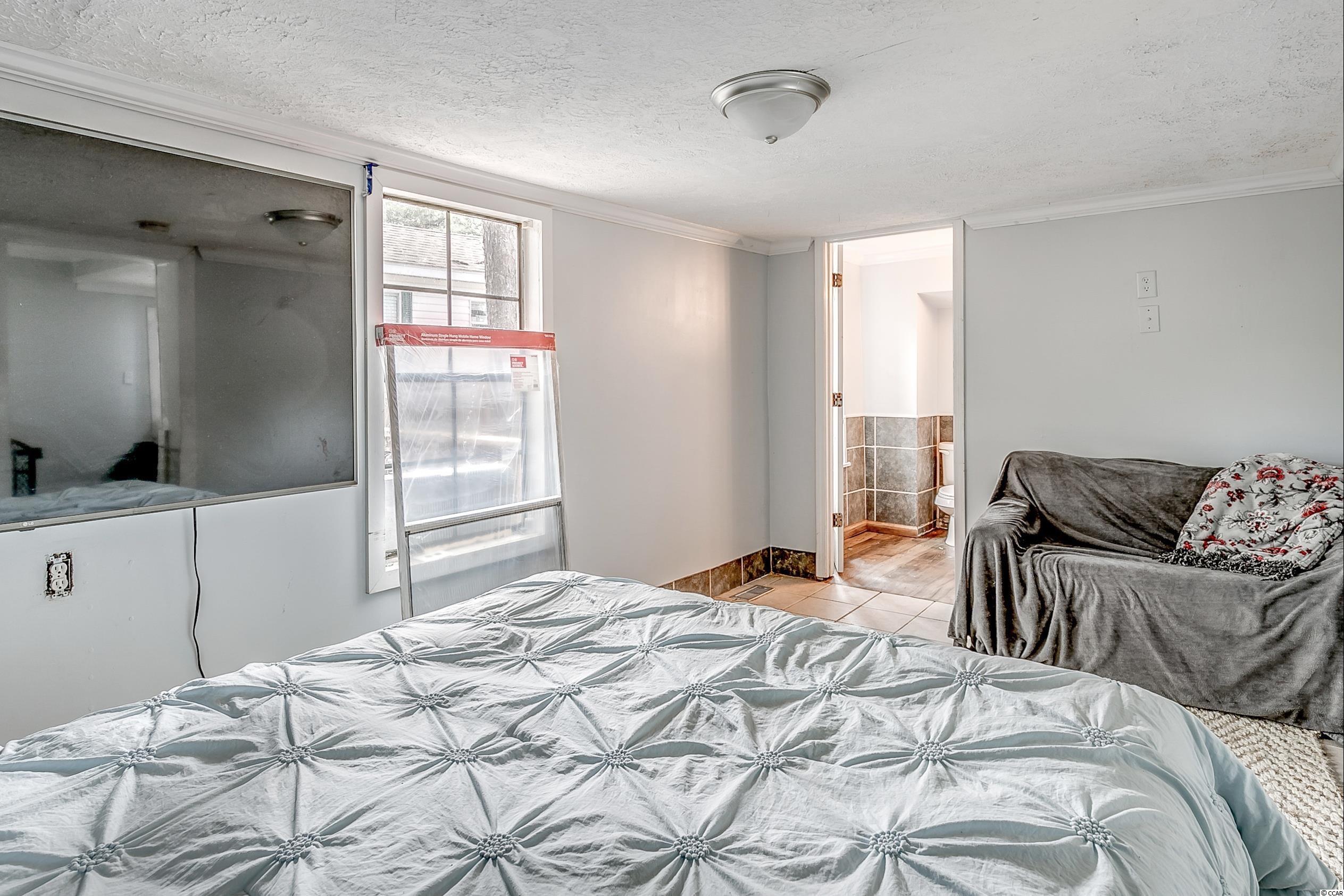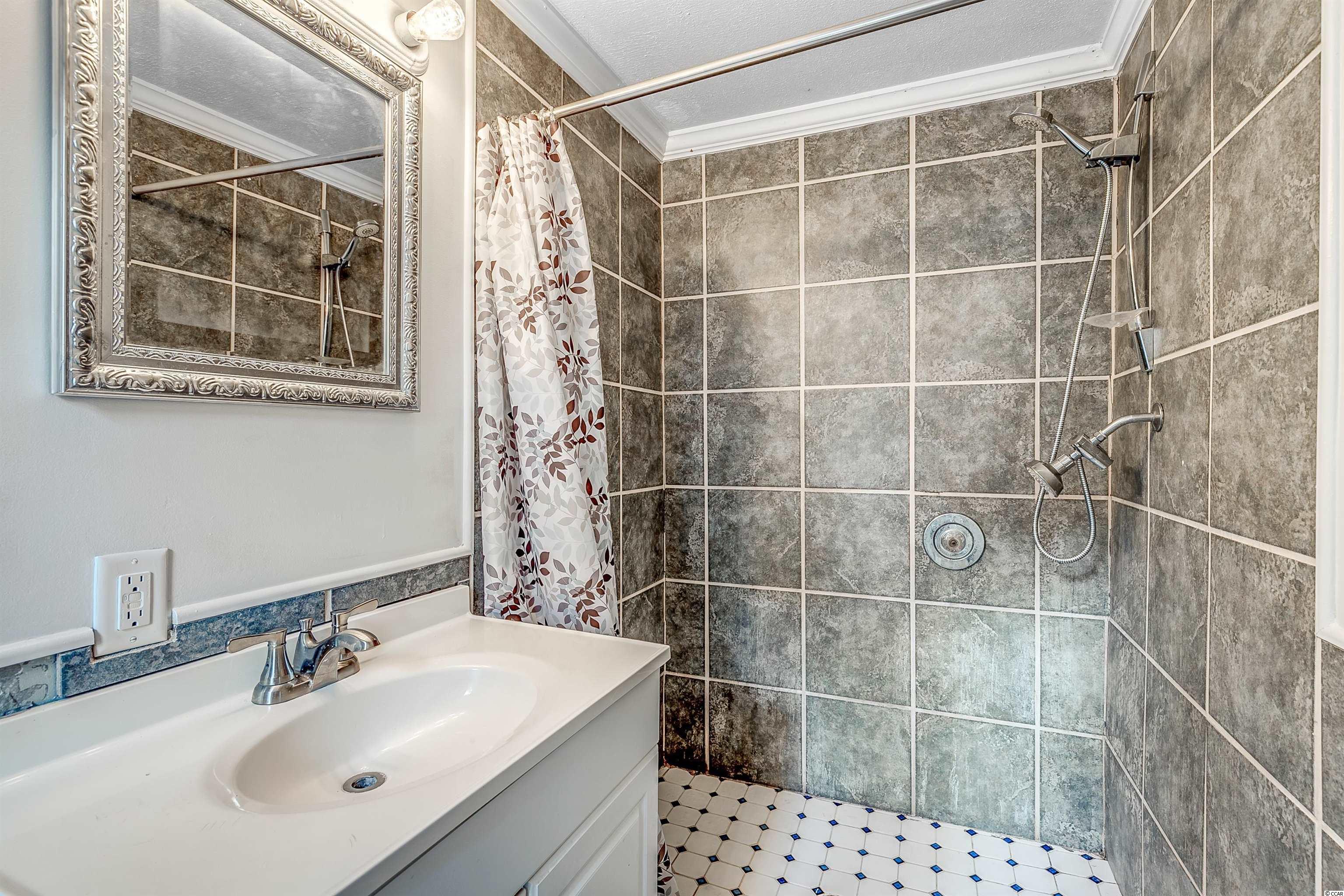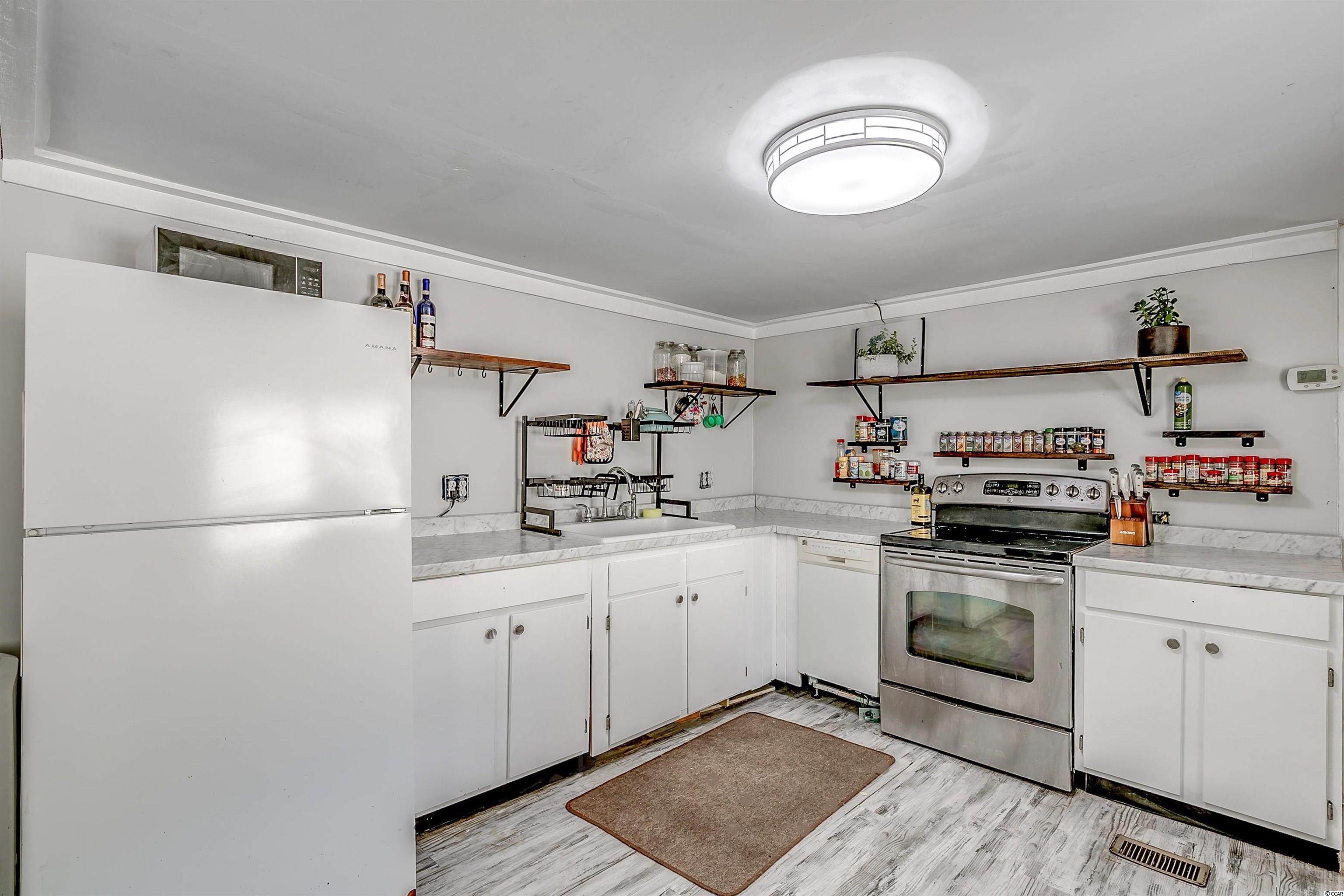 Come ride your golf cart to the beach and Market Common from this lovely home located in Crystal Lake! This spacious open concept provides plenty of room for entertaining, and the kitchen features a movable island along with a pantry! The primary bedroom is quite large with an en-suite bathroom, which has a huge custom tile shower! This beautiful home has a split floor plan with an oversized stainless steel ceiling fan in the living room. The entire home has been freshly painted and a dishwasher was added. This Southern-style kitchen features a farmhouse sink and rustic shelving along with modern countertops. A barn door was recently installed as well. The owners are even offering a home warranty for extra peace of mind. The washer and dryer will convey. The big yard is fenced-in, so it's the perfect place for your furry friends to play. There's also an outdoor storage building where you can store all of your beach necessities. The large front porch is a great place to grill out with your friends. You can even fish, kayak, and paddleboard on the lake! There's a lot of space for you to enjoy your freedom, unlike most condos that are stacked on top of each other. Owners are allowed to have motorcycles, golf carts, and pets! You can also store a boat or an RV in your driveway if it will fit. This neighborhood is conveniently located close to Myrtle Beach State Park, Prestwick Country Club, and Lakewood Elementary. There's even a dog park right down the street! Lot rent includes cable TV with over 100 channels and trash pickup along with recycling. This is a very desirable location, and you don't want to miss out on this one! Schedule your showing today! Square footage is approximate and not guaranteed. Buyer is responsible for verification.