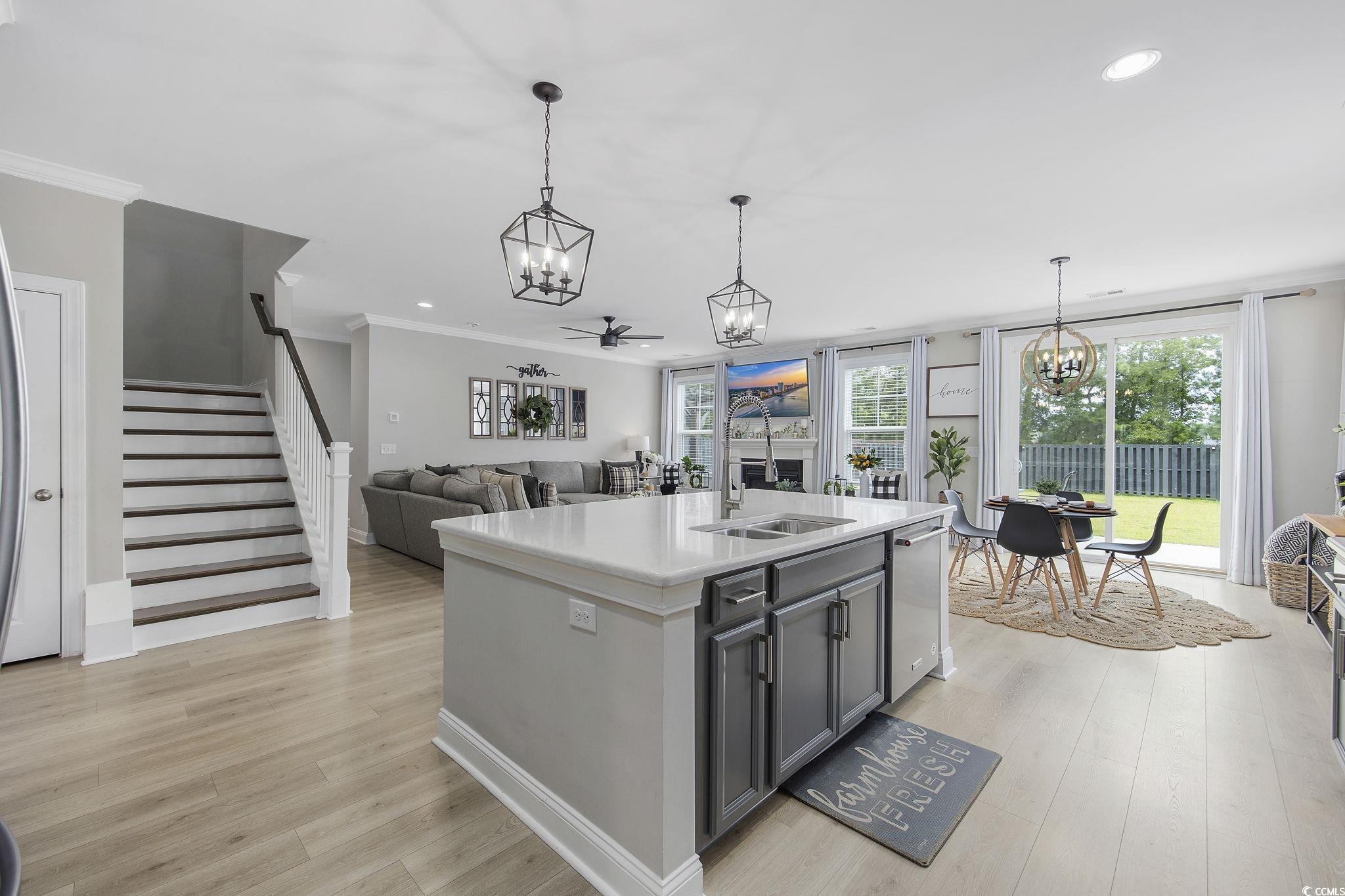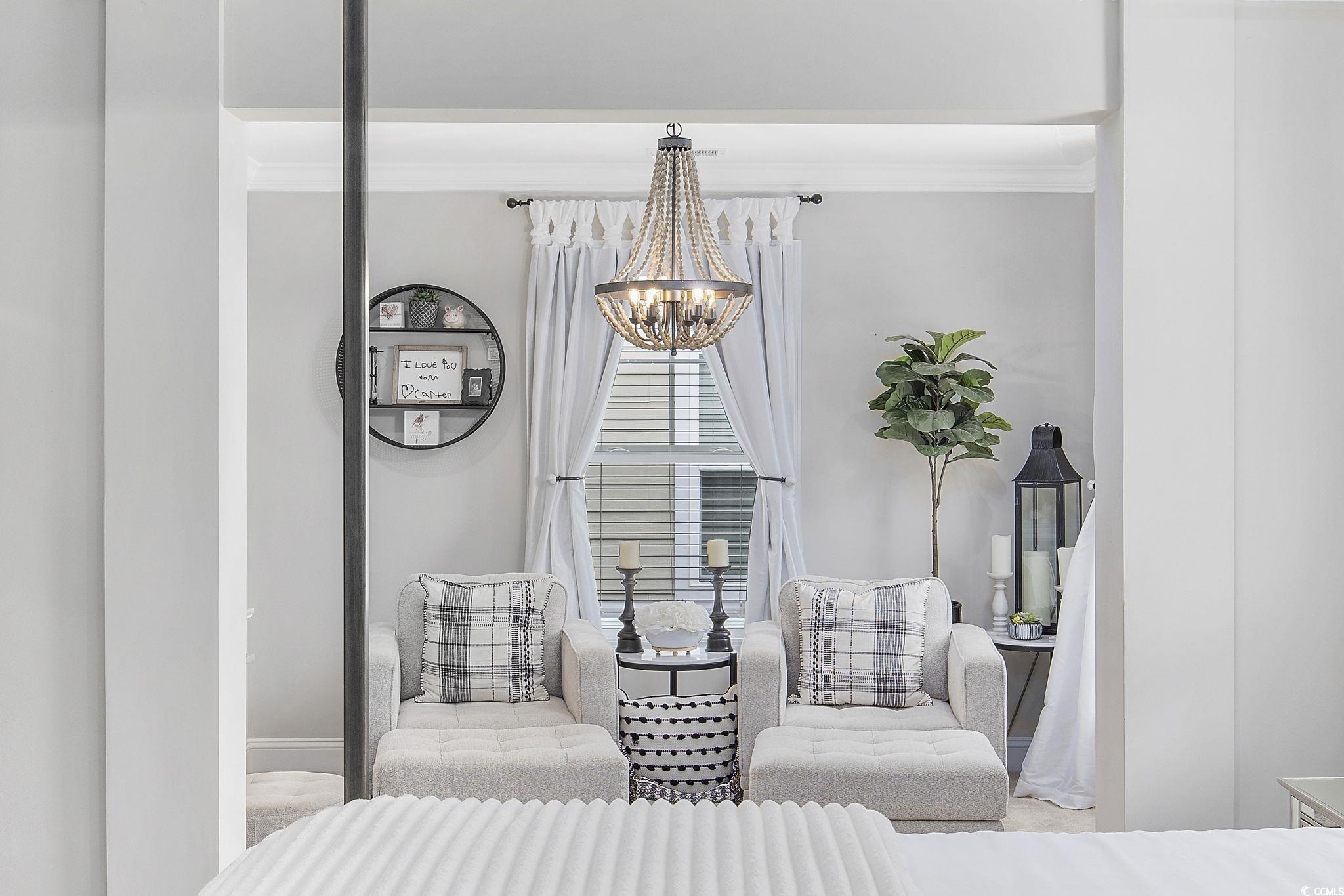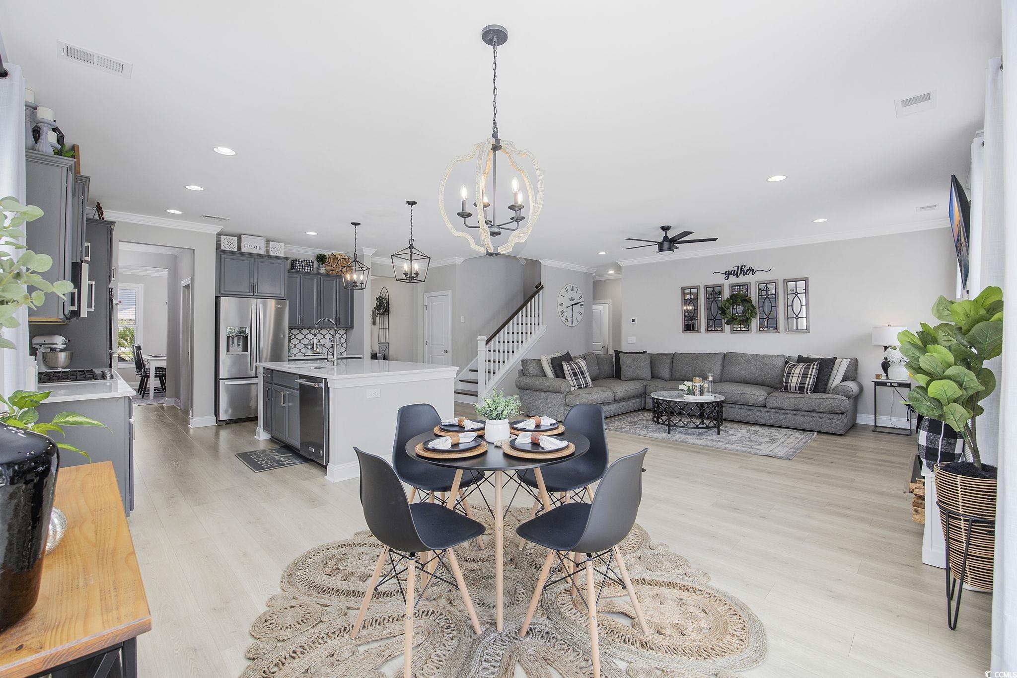 This stunning Charleston-style partially-furnished home with two southern porches is located in The Summit- Meridian near Market Common (Myrtle Beach's Uptown Downtown) and boasts four spacious bedrooms and three full baths. The first-floor main living area features tile-like flooring throughout, custom upgraded lighting, energy efficient tankless hot water heater, security system, Ring doorbell, and living room features a natural gas fireplace.There is also a dining room with French doors (flex room/den/office), butler's panty, huge walk-in pantry, mud room, a private bedroom and full bathroom on the main level. The gourmet kitchen is a chefs delight and the heart of the home overlooking the living and breakfast areas. It features sleek quartz countertops, kitchen island, elegant gray painted cabinets, a stylish backsplash, gas range, double ovens and top-of-the-line Kitchen Aid stainless steel KitchenAid appliances. Upstairs, youll discover a huge loft with a custom electric fireplace the homeowner added. This versatile area is great for movies and play and also features two closets along with a pull-down attic for storage. Two additional bedrooms, a laundry room, and the luxurious primary suite complete the upper level. The primary suite is a true sanctuary with a separate sitting area, a one-of-a-kind closet, and an en suite featuring dual vanities, a tiled spa shower, and a linen closet. Spacious outdoor patio and fenced yard is great for play and more than enough room for a private pool. This home is a perfect blend of style, comfort, and convenience, offering everything you need for modern living. Home is sold partially furnished and furnishings that convey include living room, breakfast area, dining room, and front bedroom upstairs (near the balcony.) You will always have entertainment nearby. Meridian features a large pool, indoor pickleball court, hot tub, fire pit, walking/bike trails, and just a couple of miles to the Atlantic ocean. Market Common features an active lifestyle, endless restaurants with daily specials, Farmer's Market, Culinary Institute, dog park, yoga and dance classes, Billiards and Bowling, Movie Theatre, Wine Tastings, Escape Vault, and Movies under the Stars. Holiday events include fall and spring Taste of Market Common, Holiday Carriage rides, Hometown Halloween, Annual Tree Lighting, and New Year's Eve Ball Drop. There is something for everyone on your list in this fabulous community - Dont miss the opportunity to make this exceptional property yours!