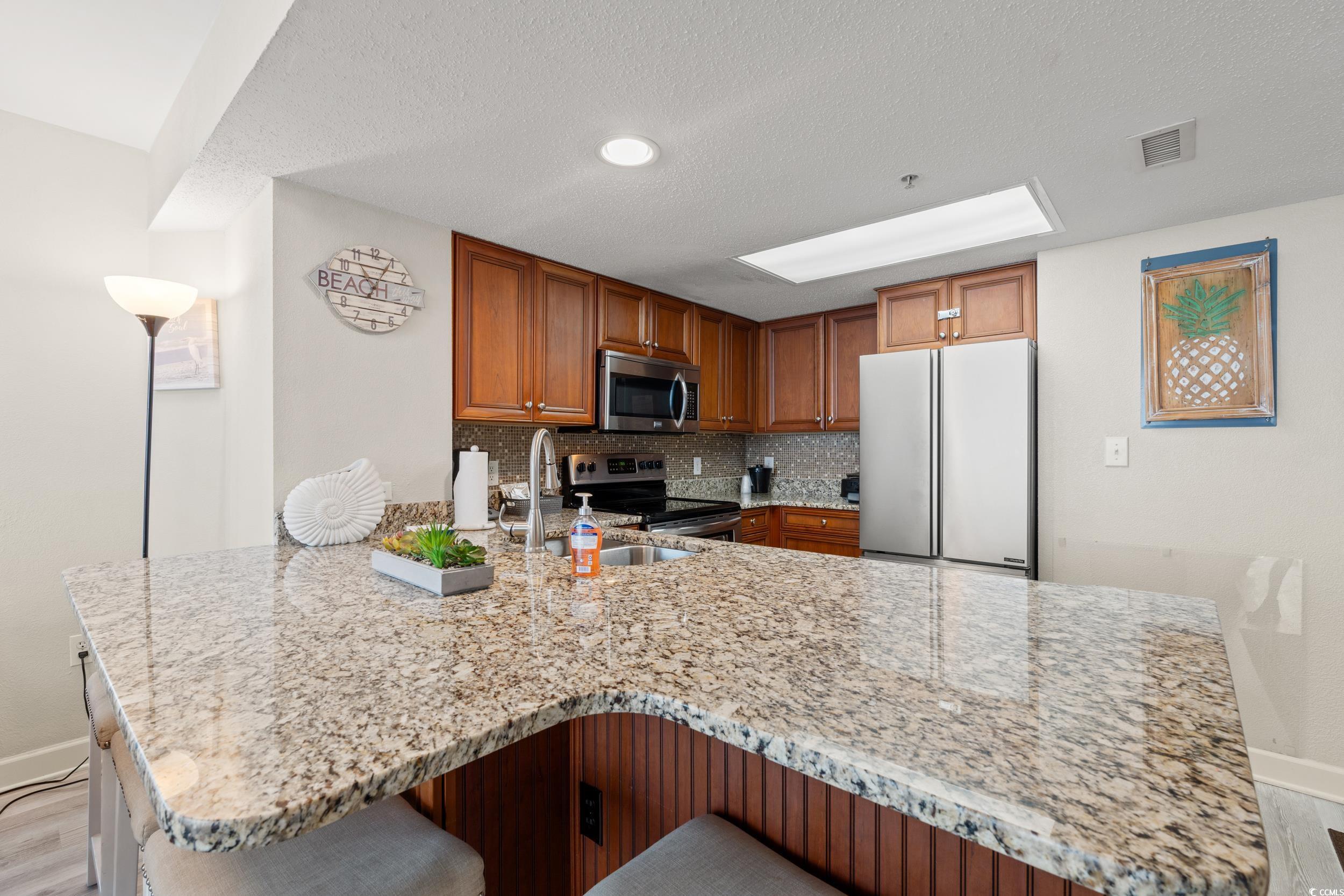 Discover breathtaking ocean views from this 2-Bed/2-Bath Oceanfront end unit on the 17th floor of the highly desirable Bay Watch Resort in North Myrtle Beach. This rare corner unit features a wraparound balcony, plus a private balcony off the guest bedroom, providing unparalleled coastal scenery. Inside, you'll find modern cabinetry, granite countertops, stainless steel appliances, and luxury vinyl plank flooring. This fully furnished condo also includes a washer and dryer for added convenience. Bay Watch Resort is known for its fantastic amenities, including indoor and outdoor pools, lazy rivers, hot tubs, a tiki bar, a sports bar, a full-service restaurant, a fitness center, and a gift shop. Whether you're searching for a vacation home, rental investment, or full-time residence, this oceanfront retreat is perfect for families and friends. Dont miss this opportunity to own a piece of paradise, schedule your showing today!