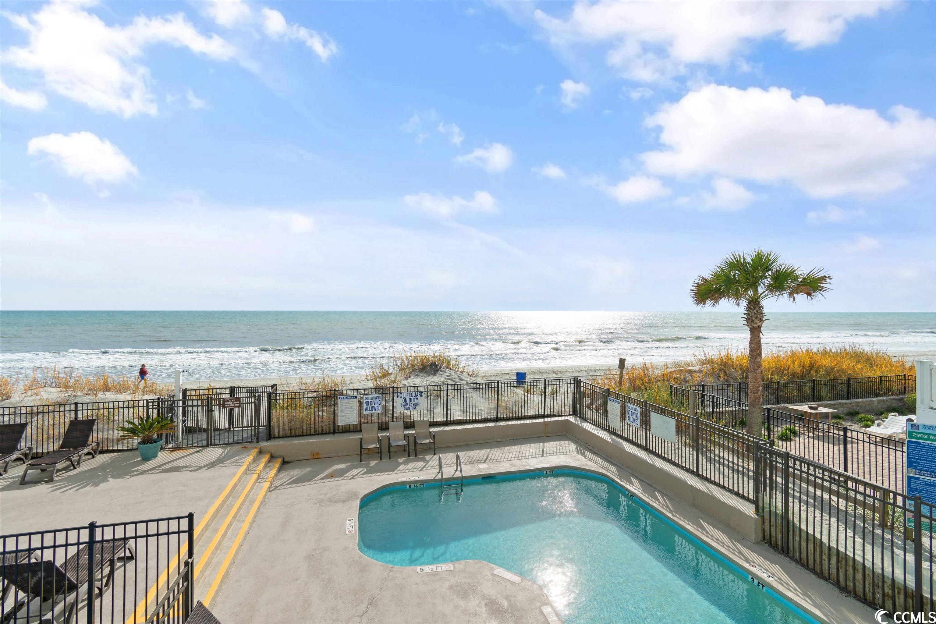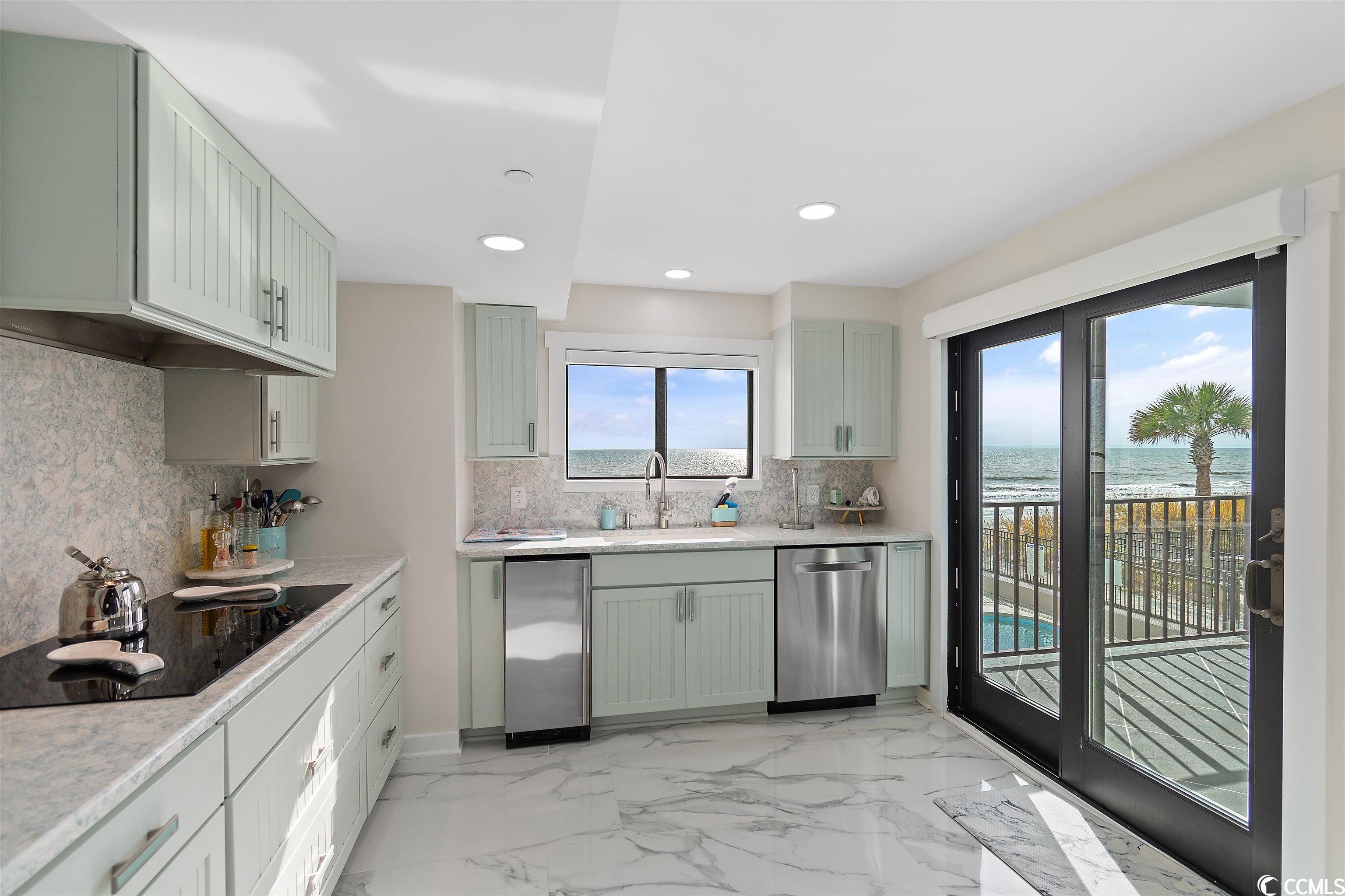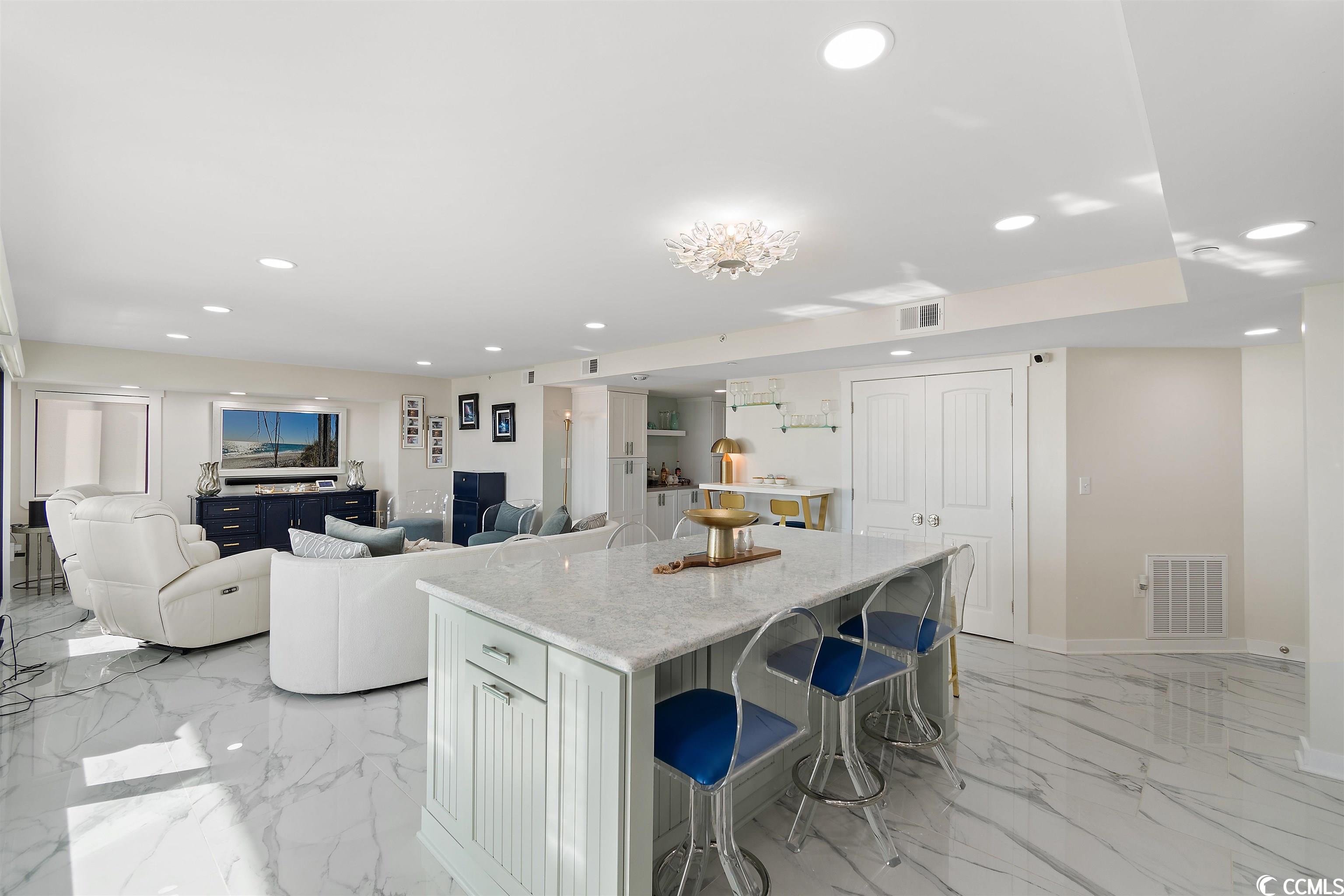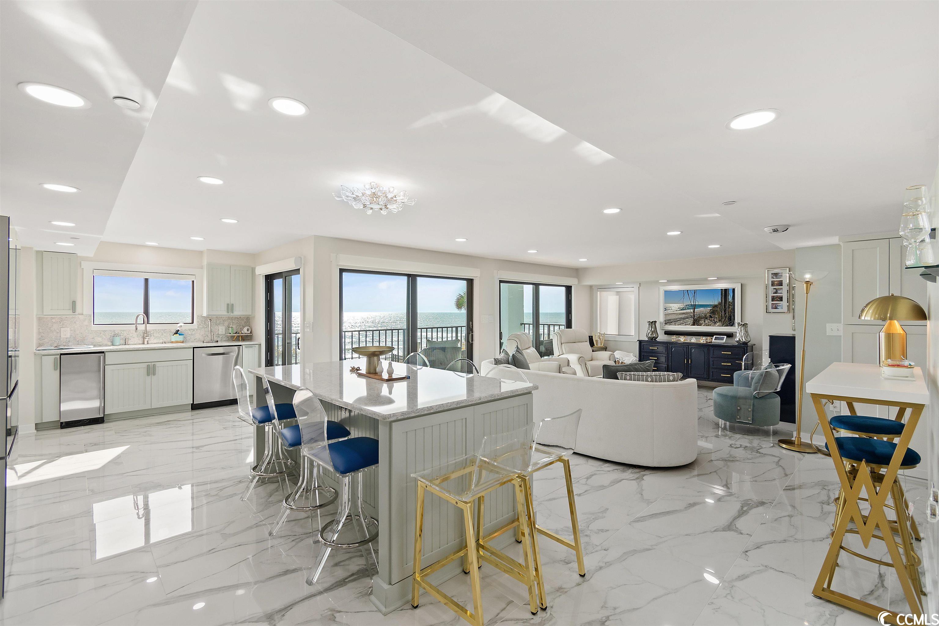 Elegant condo in Cherry Grove with breath taking views from the main living areas. No expense was spared in the renovation in 2021. Marble flooring through out. Exquisite kitchen and oversized island with seating, with built in additional mini fridge and ice maker. Coffee/beverage bar right off the family room. Primary bath with tile shower and double vanity. Guest bath continues the upscale design. Full size laundry. Remote shades throughout. HVAC was replaced as well during the remodeling. Large patio that look over the ocean and cherry grove pier. The Shalimar has an elevator for ease of access to the raised first floor, pool.