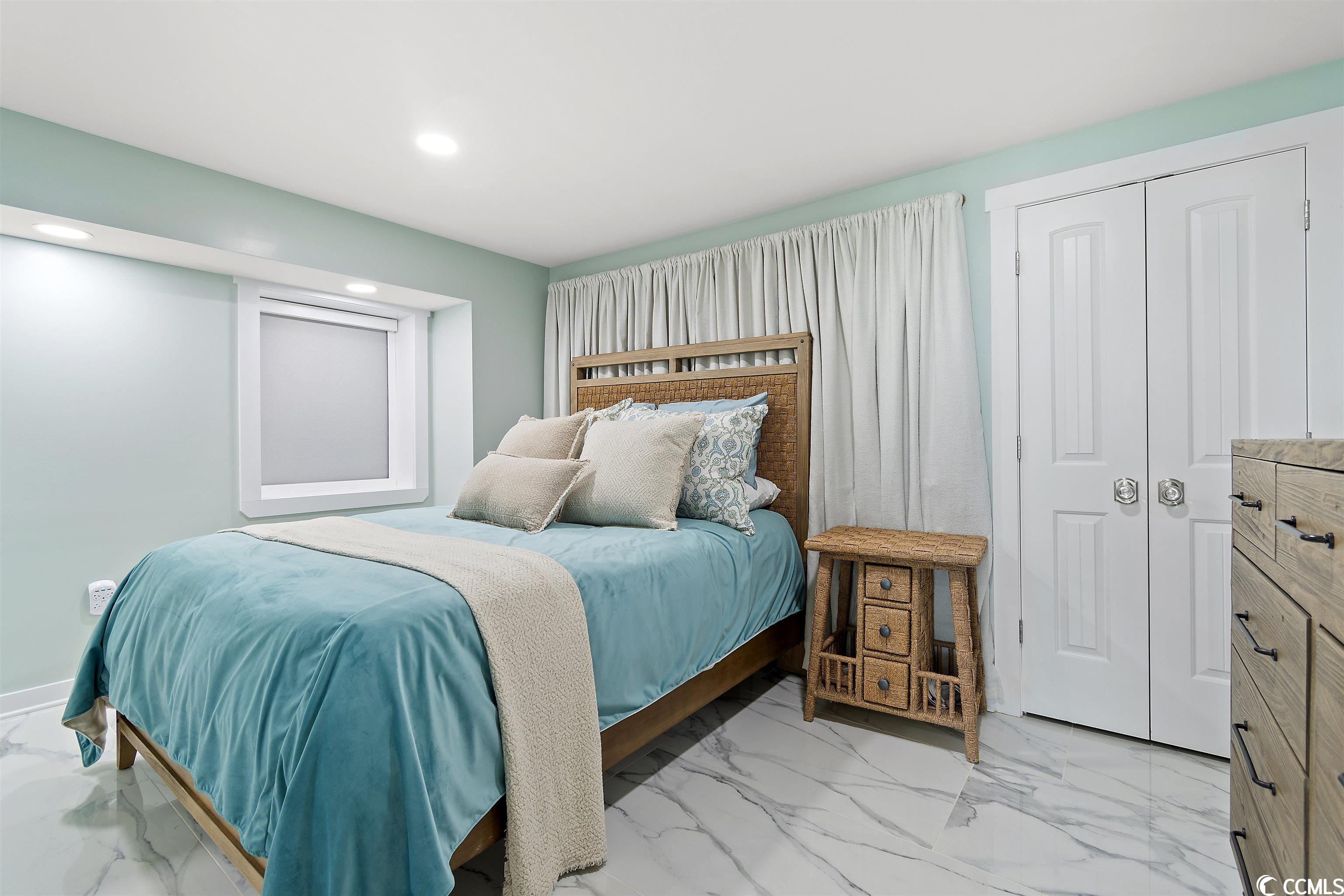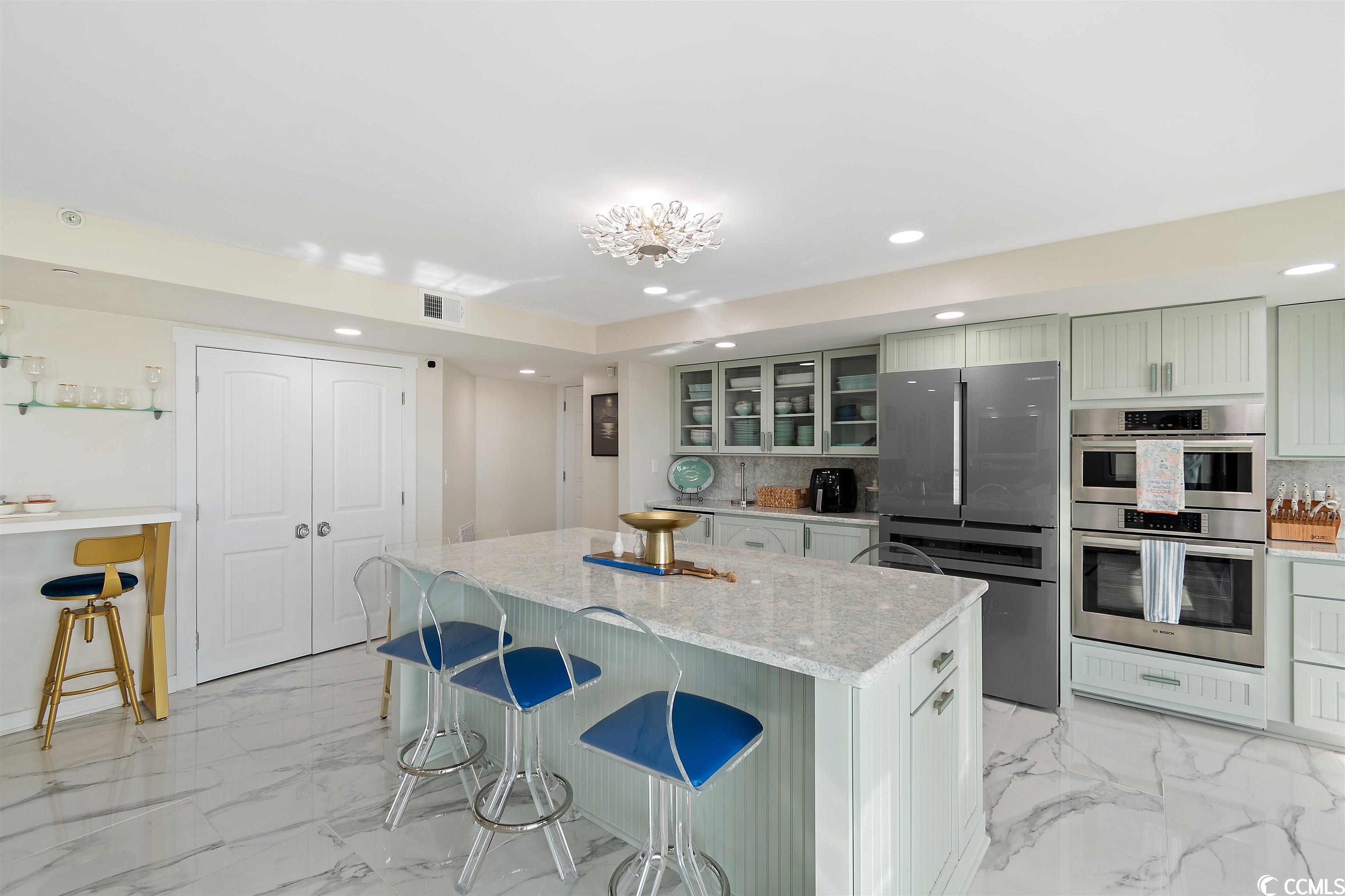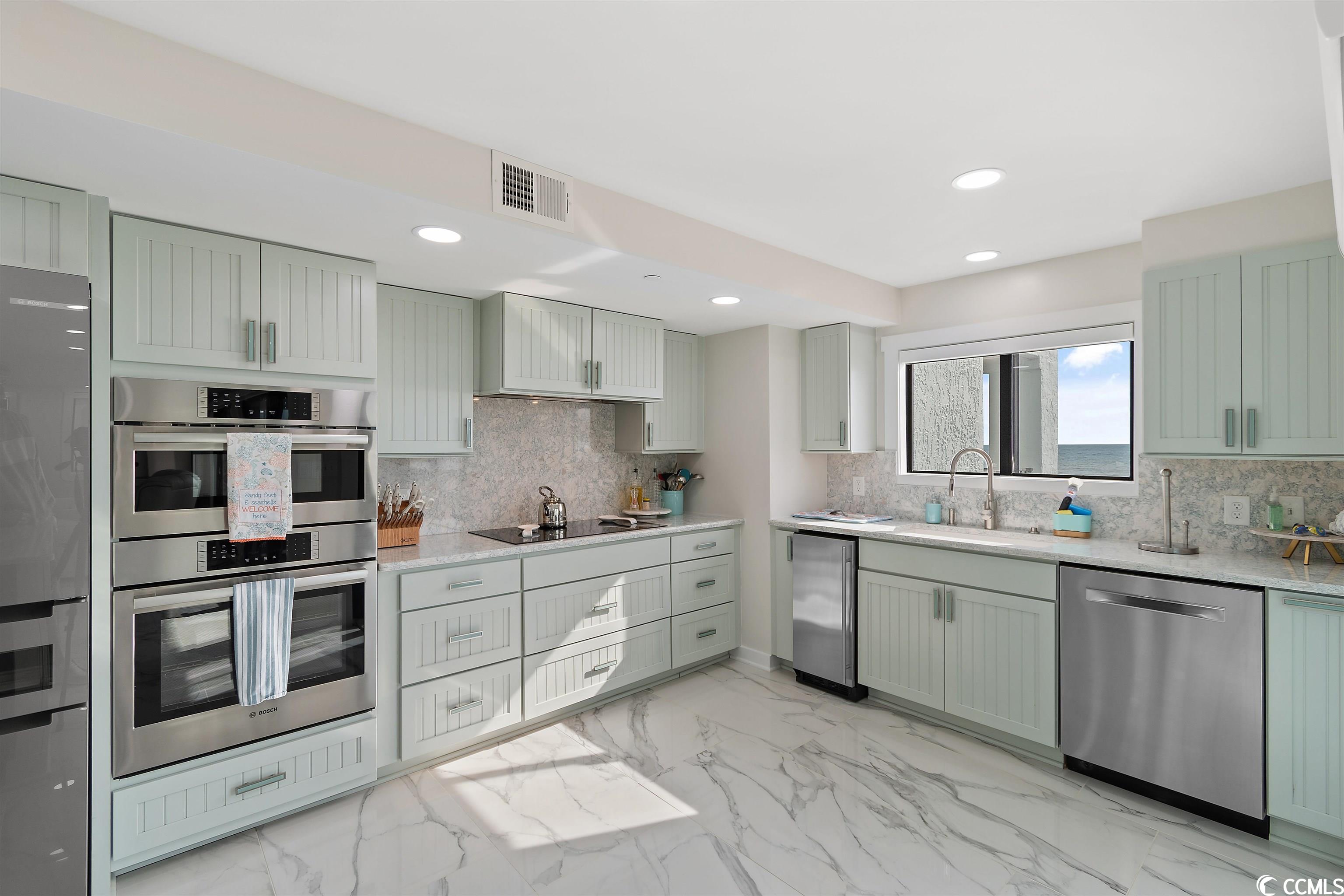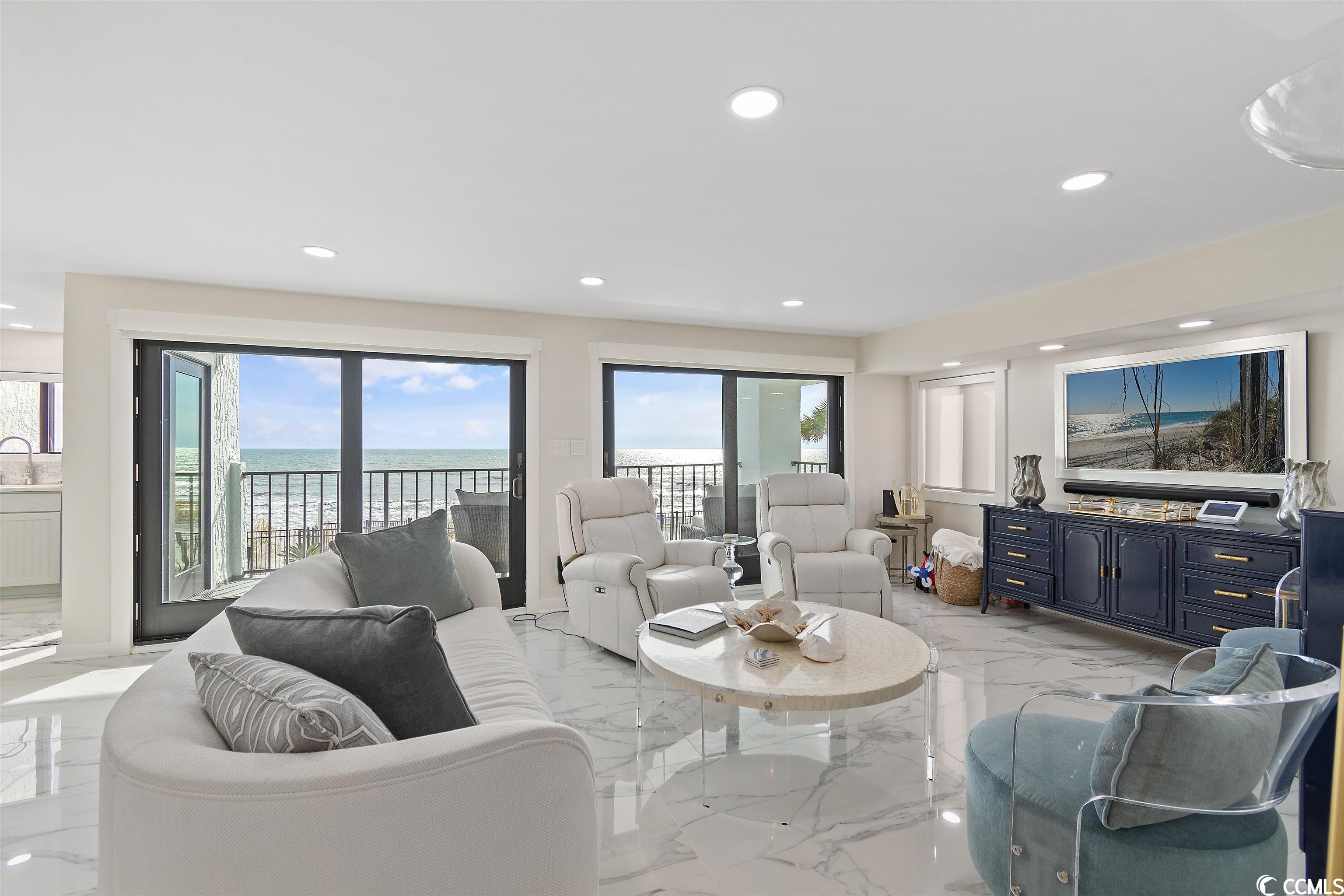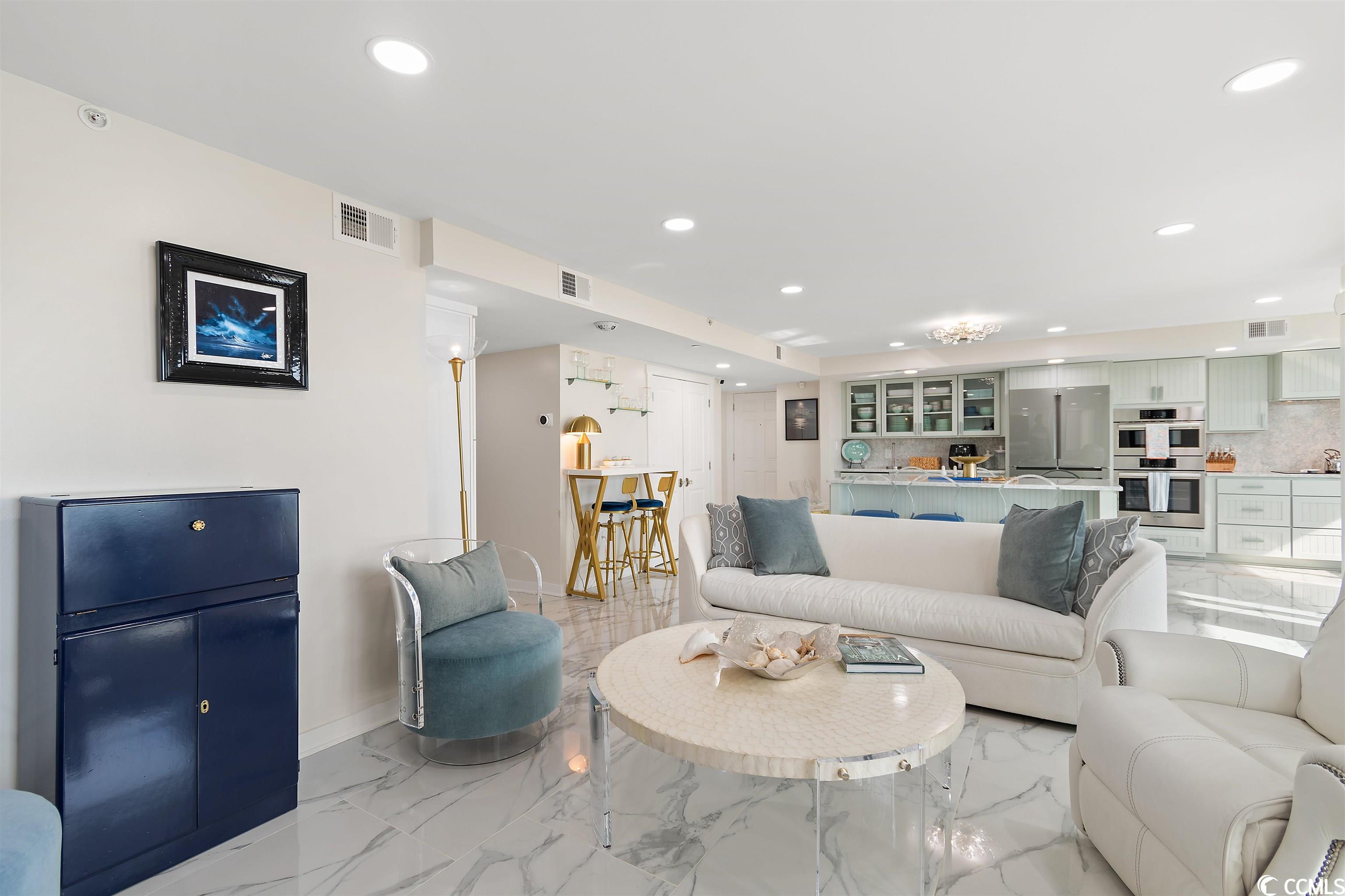 Elegant condo in Cherry Grove with breath taking views from the main living areas. No expense was spared in the renovation in 2021. Marble flooring through out. Exquisite kitchen and oversized island with seating, with built in additional mini fridge and ice maker. Coffee/beverage bar right off the family room. Primary bath with tile shower and double vanity. Guest bath continues the upscale design. Full size laundry. Remote shades throughout. HVAC was replaced as well during the remodeling. Large patio that look over the ocean and cherry grove pier. The Shalimar has an elevator for ease of access to the raised first floor, pool.