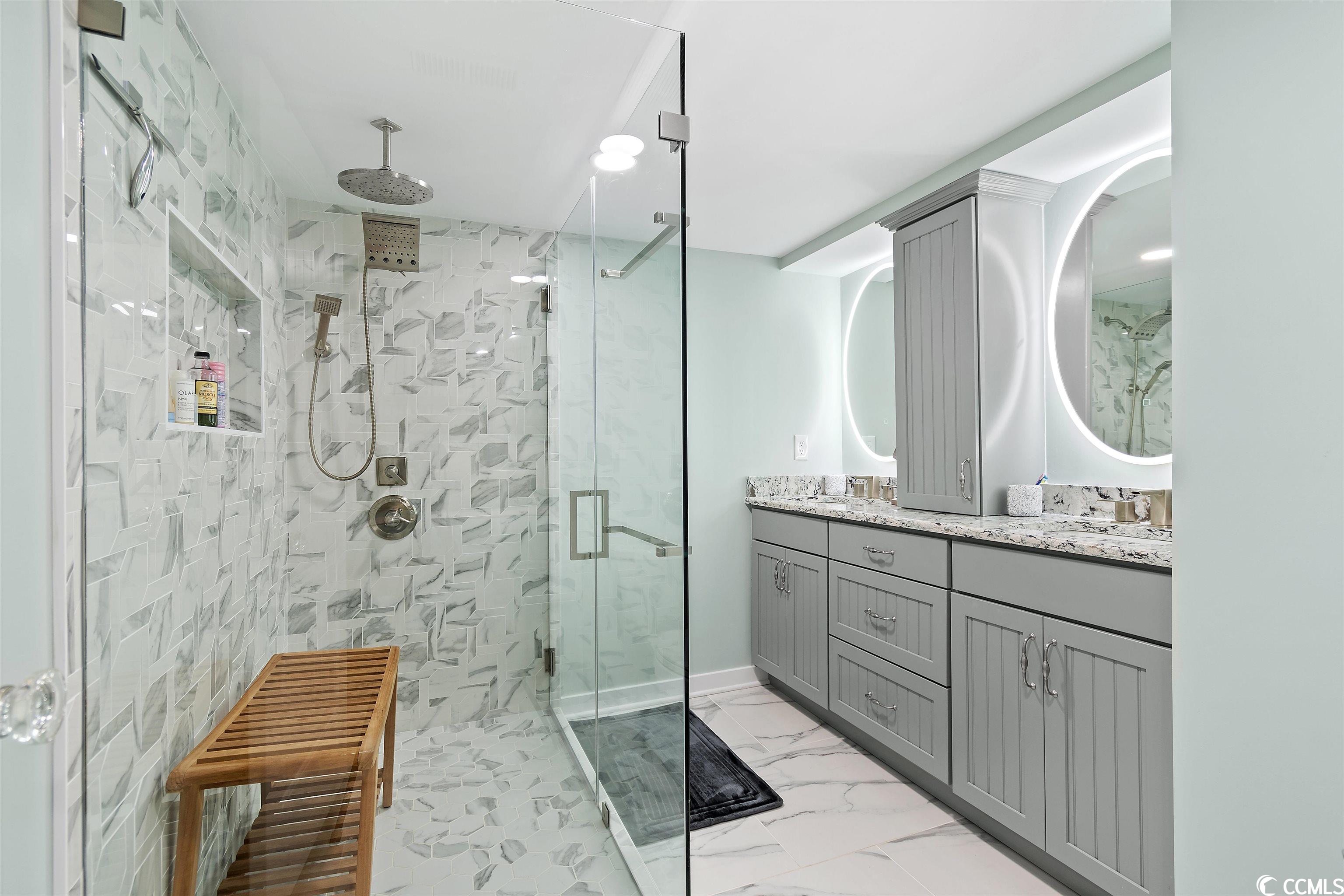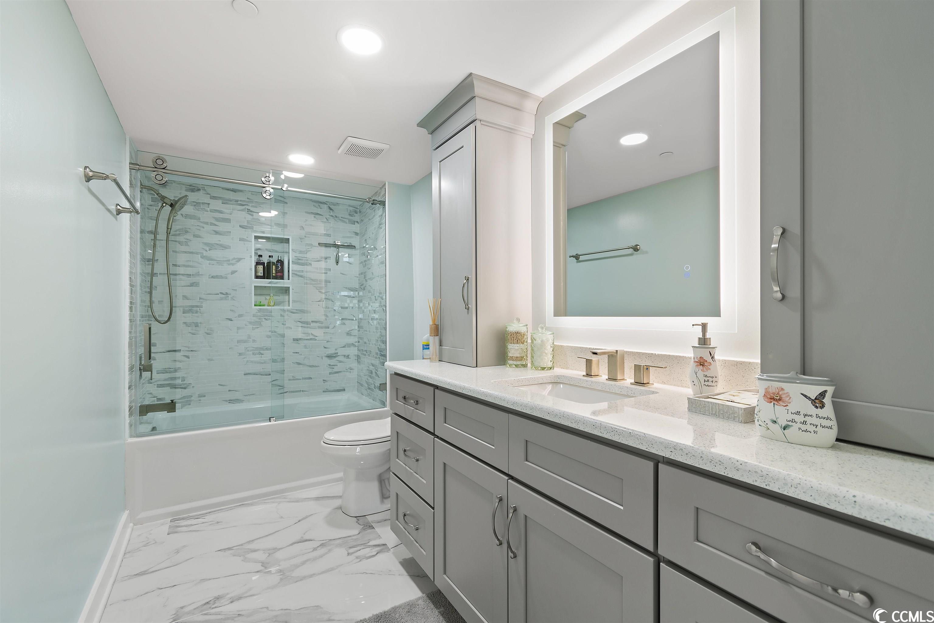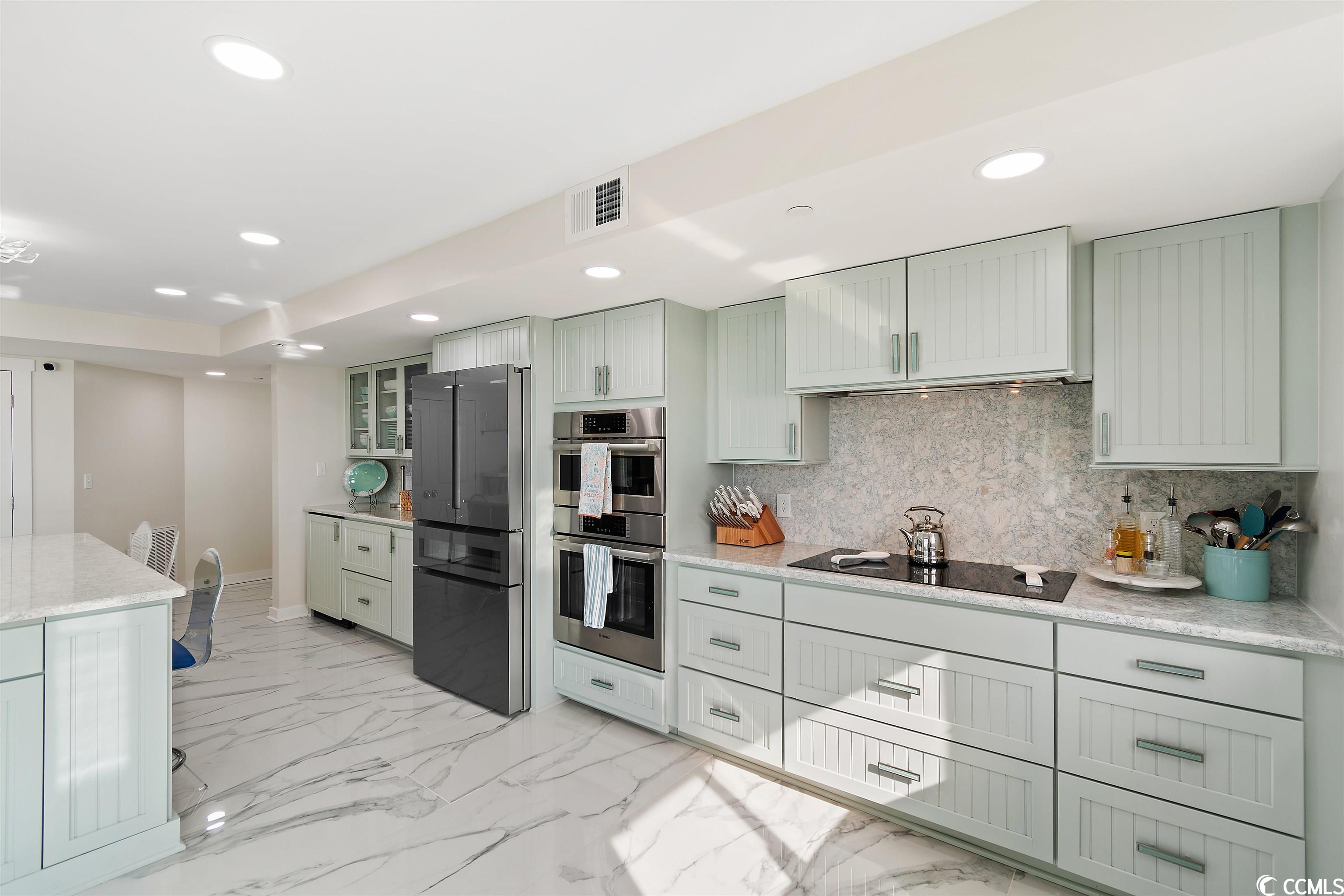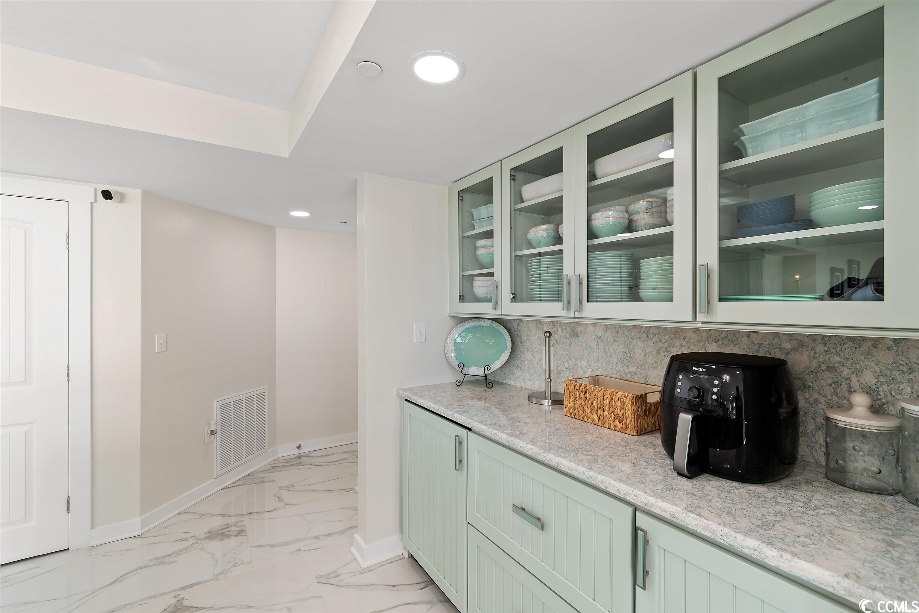 Elegant condo in Cherry Grove with breath taking views from the main living areas. No expense was spared in the renovation in 2021. Marble flooring through out. Exquisite kitchen and oversized island with seating, with built in additional mini fridge and ice maker. Coffee/beverage bar right off the family room. Primary bath with tile shower and double vanity. Guest bath continues the upscale design. Full size laundry. Remote shades throughout. HVAC was replaced as well during the remodeling. Large patio that look over the ocean and cherry grove pier. The Shalimar has an elevator for ease of access to the raised first floor, pool.