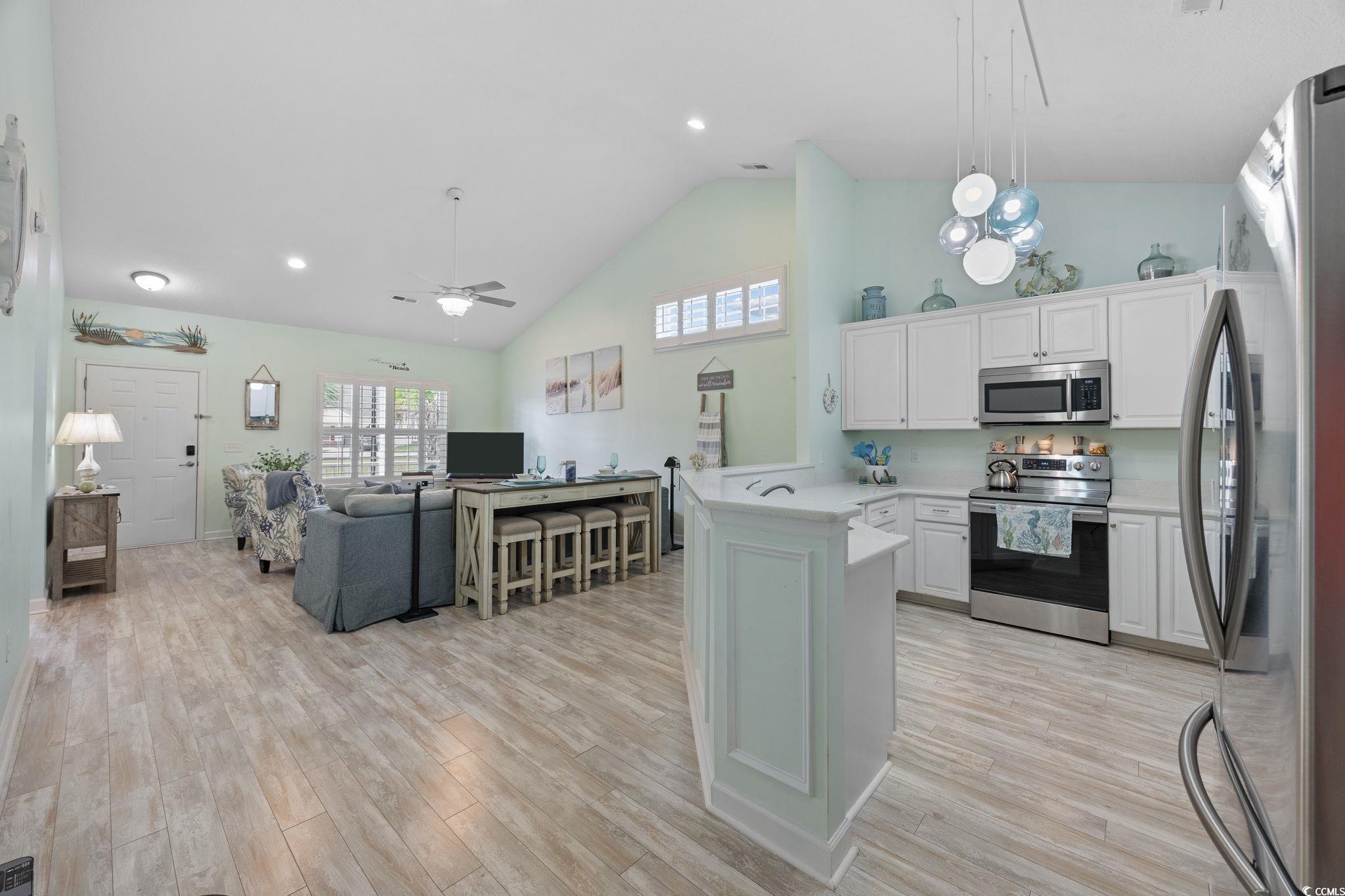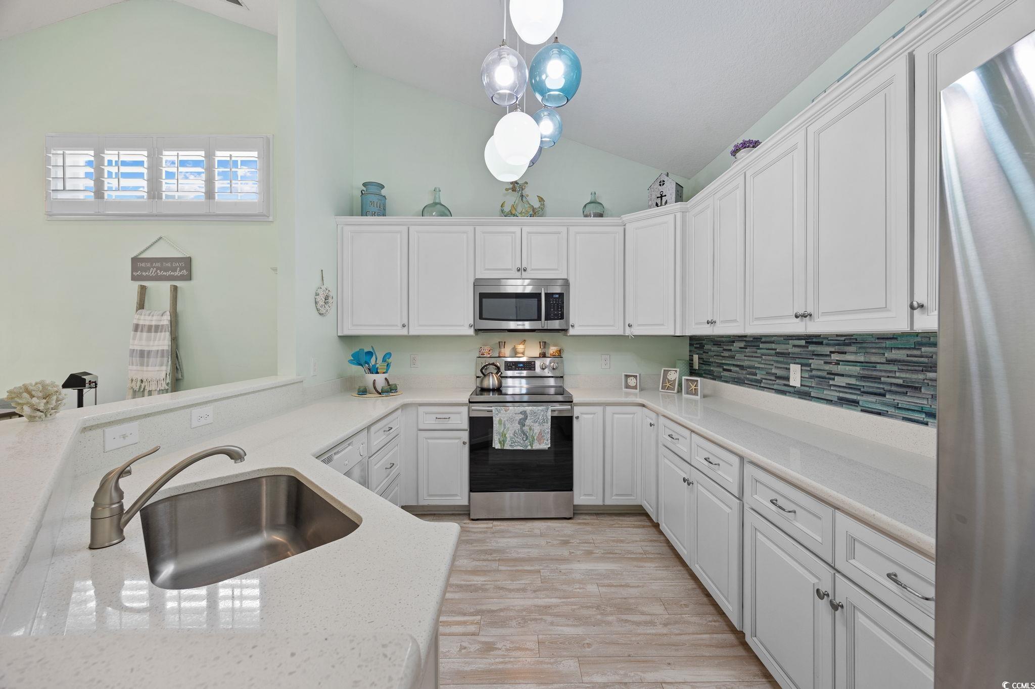 Welcome to this move in ready 3-bedroom, 2-bath home in the charming Palm Cove community. This home is being sold fully furnished; everything conveys except clothing and personal items. Tucked away in a quiet subdivision, this property features a 2-car driveway, charming front porch, and an extended sidewalk leading to the side of the home with detached outdoor storage. Inside, youll find a bright and airy living room with vaulted ceilings, Laminate throughout, plantation shutters, and breezy coastal-inspired paint and dcor. The kitchen is a standout with stainless steel appliances, quartz countertops, abundant cabinetry, and a breakfast bar for casual dining. A dedicated laundry room offers added convenience with the washer and dryer included, cabinets for extra storage, and tile flooring. The spacious primary suite includes a private bath with a large vanity and walk-in shower. Two additional bedrooms and a full guest bath provide plenty of space for family or guests. Step outside to enjoy the screened-in back porch and extended patio, perfect for entertaining or relaxing. The fenced backyard is a true oasis, complete with raised garden beds and plenty of room to play or unwind. Dont miss the chance to make this move-in ready home yours!