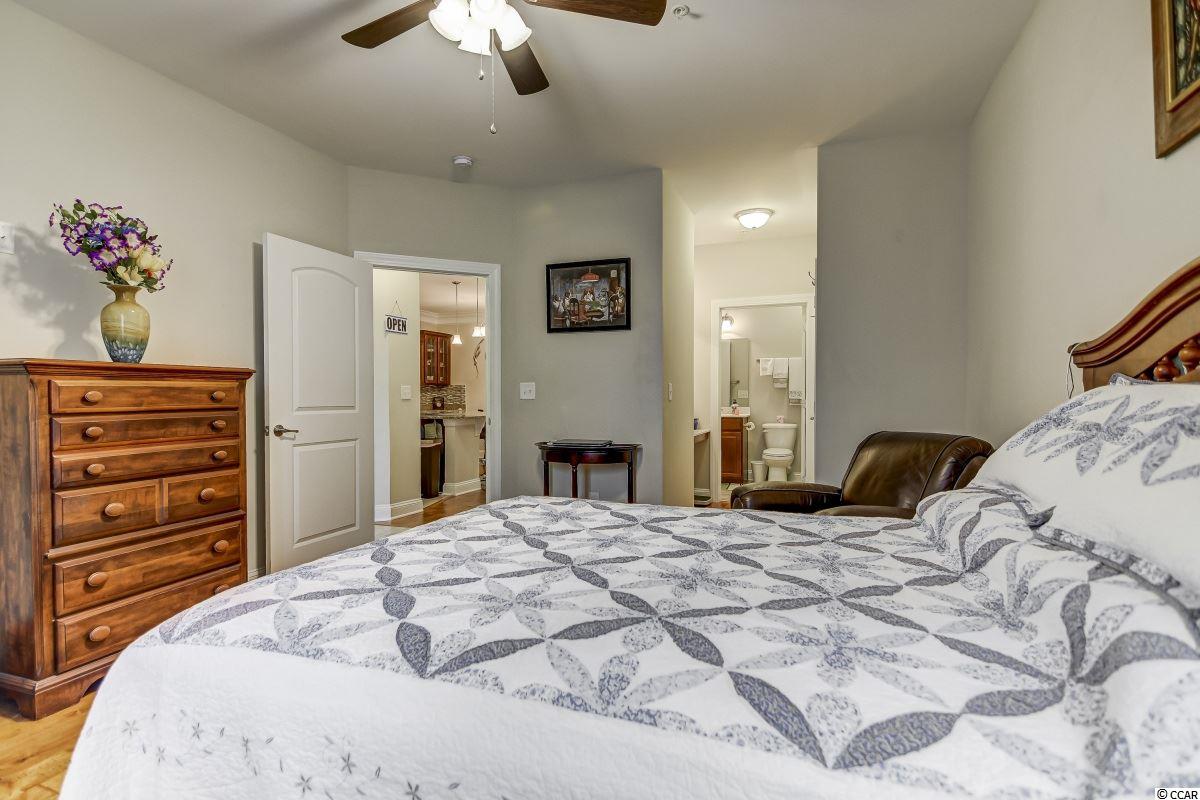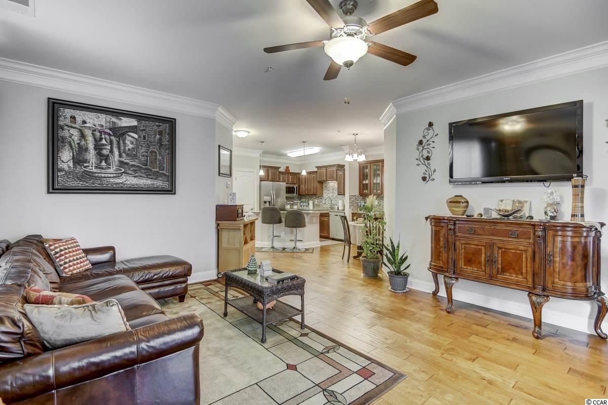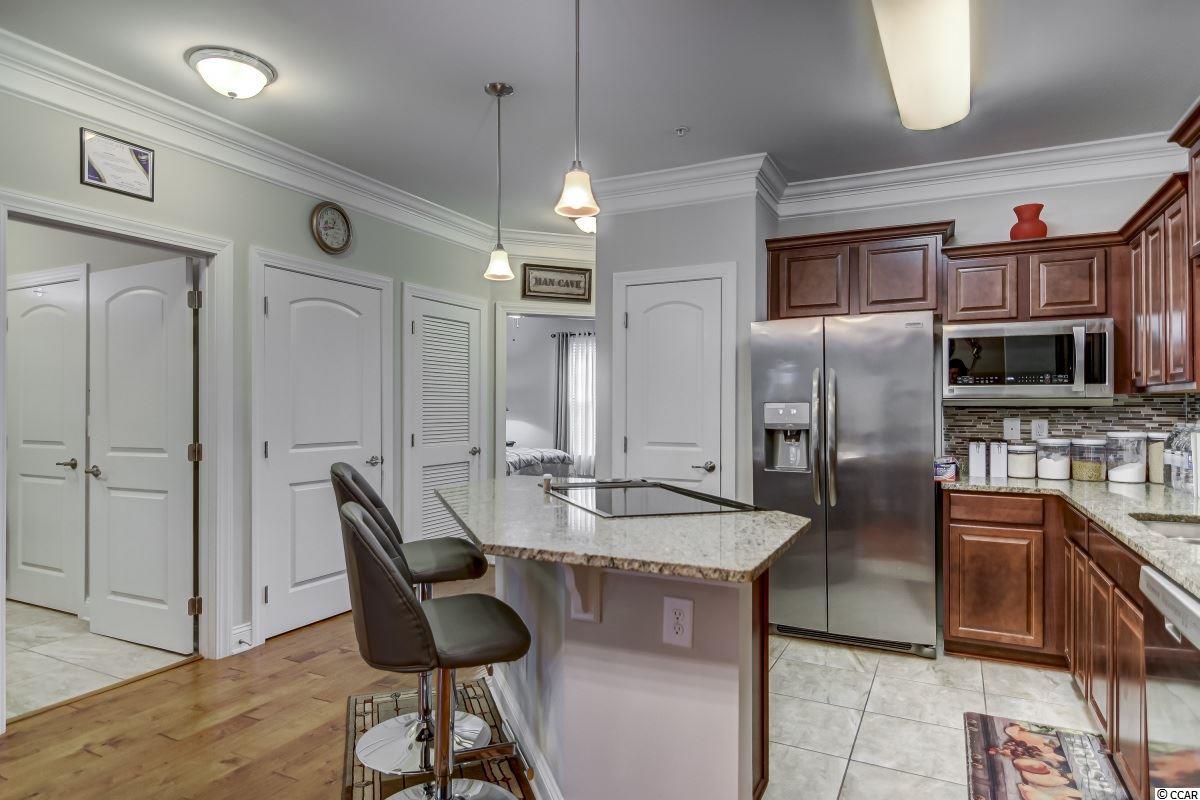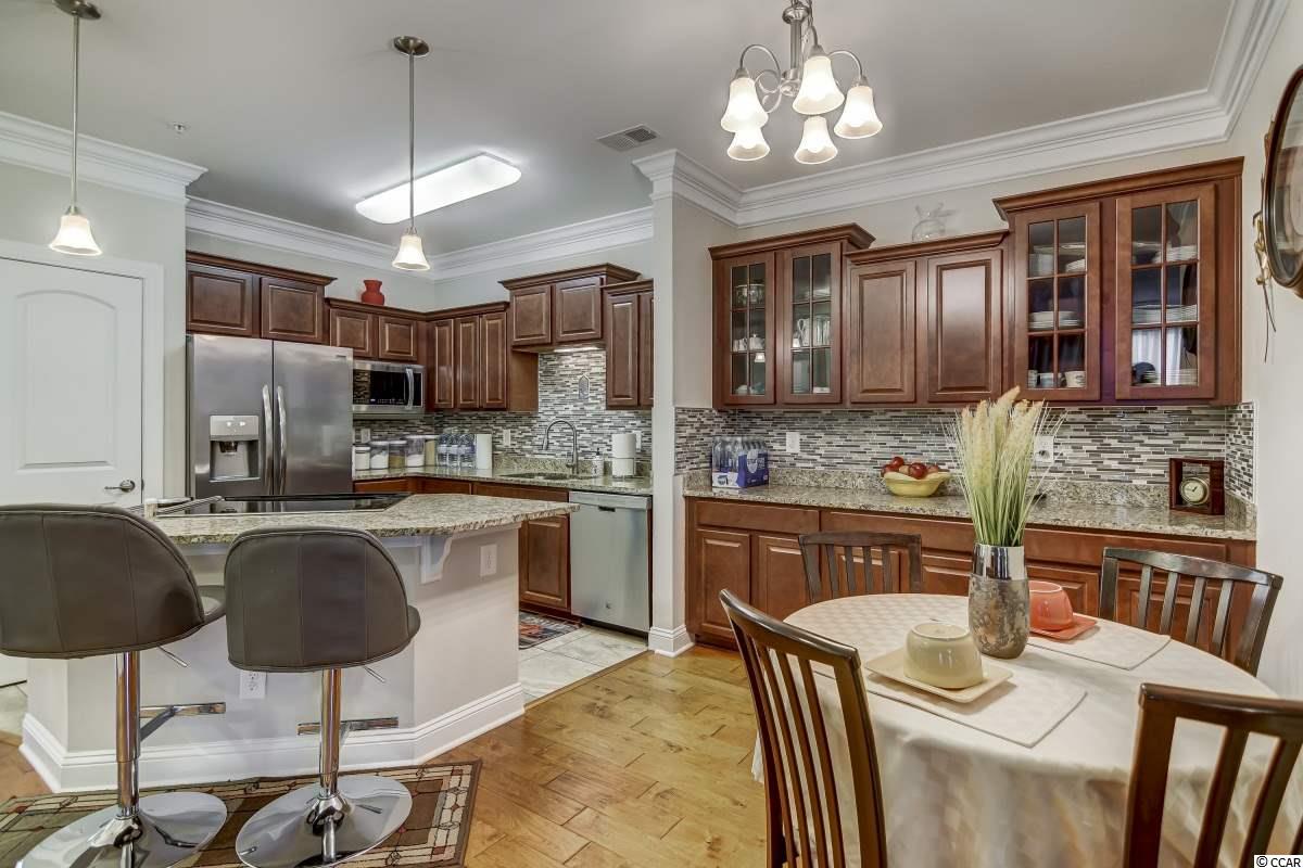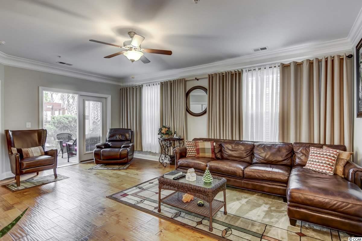 Magnificent 2 bedroom 2 bath, first floor condo in The Village at Queens Harbour II. Stunning hand-scraped engineered hardwood floors run throughout with exception of tile in the kitchen, laundry, and bathrooms. This unit features 9' smooth ceilings throughout and 6 baseboards. The spacious living room has crown molding, a ceiling fan, and french doors that take you out to the screened porch.The delightful screened porch has a ceiling fan and a screened door out to the common area just feet away from the pool! In the kitchen you will find gorgeous granite countertops, custom tile backsplash, stainless steel appliances, a pantry, plenty of cabinet and counter space, as well as an island with pendant lighting and seating for 4! Another great feature of this unit is that this floor plan has 2 master bedrooms and the same square footage as the 3 bedroom model so all the rooms are very large! Double doors off the living room take you into the first big master bedroom that has a double window, a ceiling fan, walk-in closet, and an ensuite bathroom with a glass enclosed shower. The second large master bedroom has a ceiling fan, a closet, and a vanity area outside of the ensuite bathroom. The second master bath has a jetted tub/shower combo and it also has a separate door out to the main living space so guests dont have to come through the bedroom to get to it. There is also an additional laundry room in this unit and a separate storage unit just outside the front door. This particular building also has an elevator to all floors. The Village at Queens Harbour II has a fabulous resort style community pool with a hot tub surrounded by new palm trees with a clubhouse with a grilling area for owners to enjoy! The Village at Queens Harbour II has low HOA fees and unlike Phase I this has no additional assessment! Conveniently located off HWY 17 Bypass close to tons of restaurants and shopping! Less than 10 minutes from Market Common and less than 15 minutes from the Beach!!