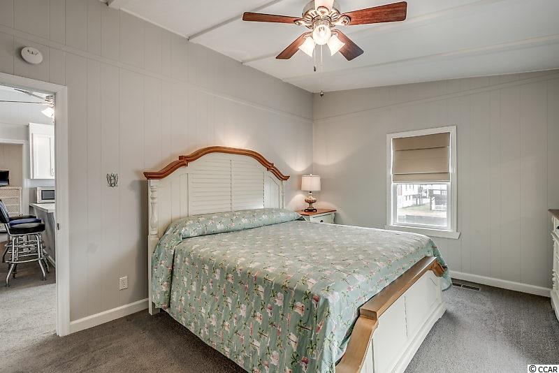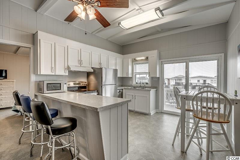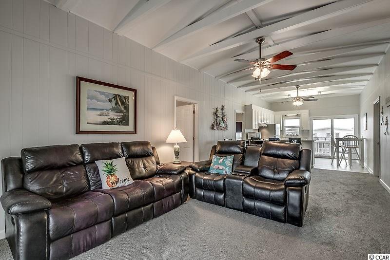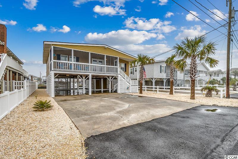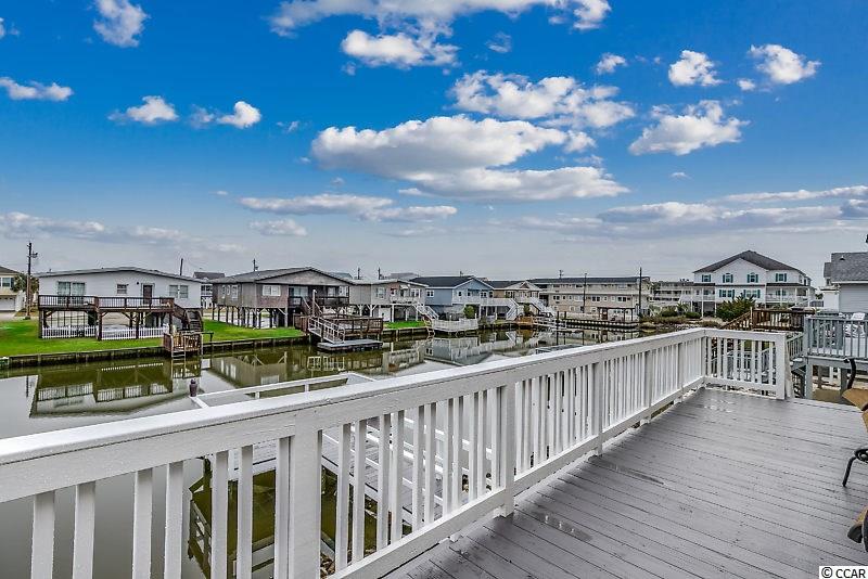 Beautiful 4 bedroom 2 bathroom home in Cherry Grove on a deep channel with water views surrounding this home. Walking in from the screened porch to a charming open great room, wonderfully decorated and furnished. This home comfortably sleeps 10-12. Step out from the kitchen to the back deck that overlooks the fixed dock and channel, notice below the party deck area big enough for games, bbq space, chairs and tables! This home has only had 2 owners and has been very gently used. It has not been in a rental program, but homes around are popular rentals as it is less than a block to the beach. Under the home there is expansive parking space and a locking area to keep your golf cart along with a huge raised storage area with a full size washer and dryer. Landscaping is just about maintenance free! Square footage is approximate and not guaranteed. Buyers responsible for verification.