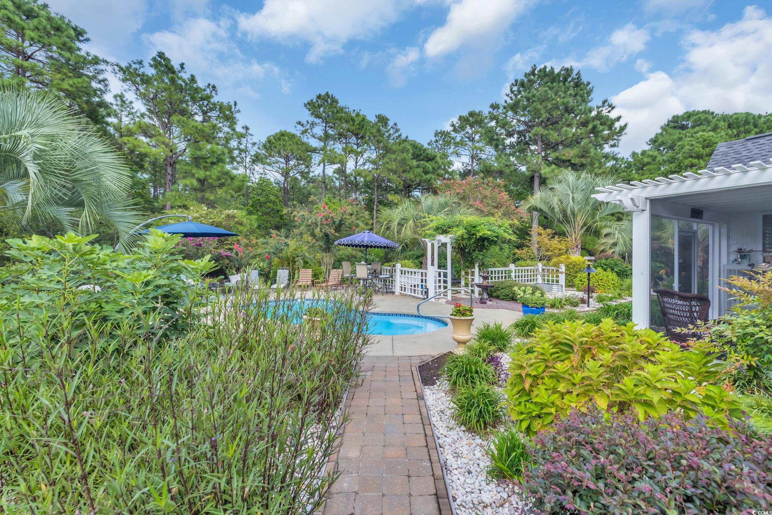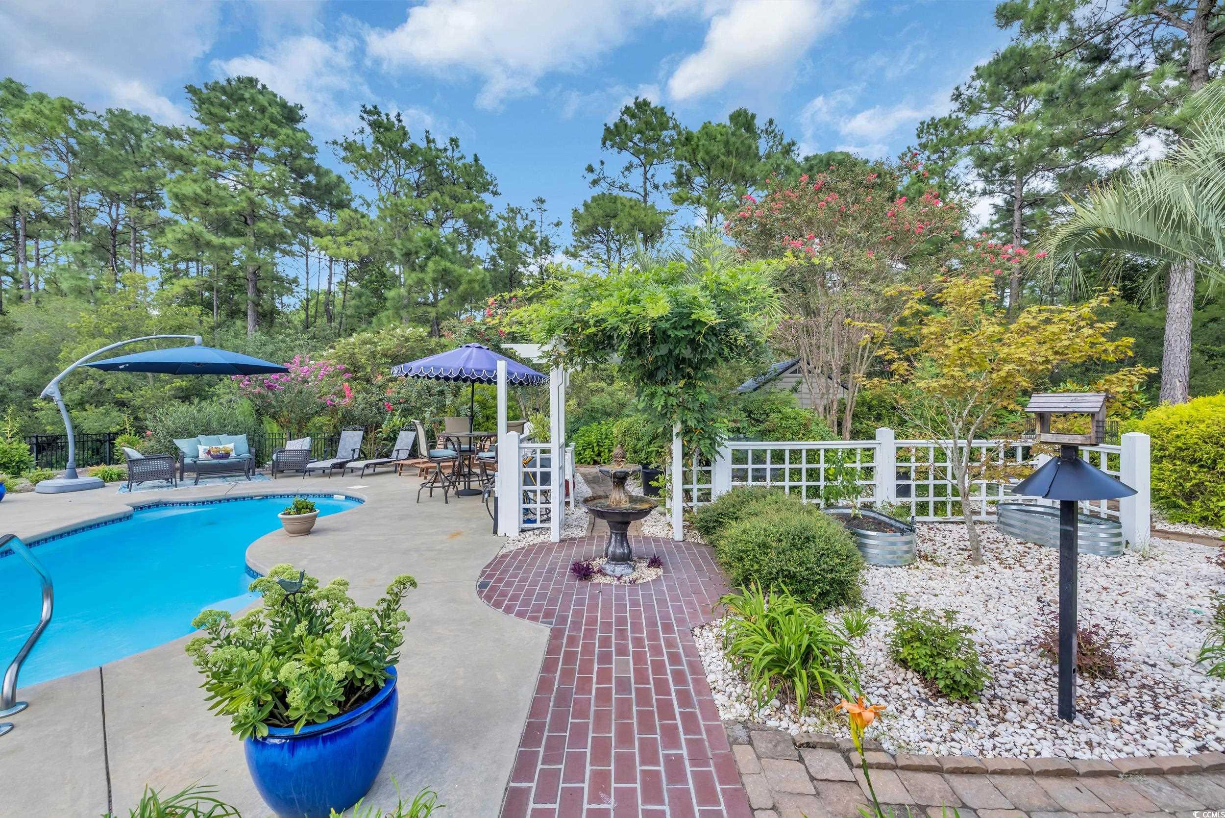INGROUND POOL & LUXURIOUS LANDSCAPING. This brick-front home features 4 bedrooms and 3 baths, surrounded by lush gardens and timeless charm. Thoughtful upgrades are evident throughout, blending elegance with comfort. From the moment you arrive, the extended driveway, enchanting greenery climbing up the brick facade along with the landscaped grounds create the feeling of stepping into the pages of ""Better Homes & Gardens."" Inside, youll find it to be carpet-free with tray and vaulted ceilings, wainscoting, plantation shutters throughout, and an updated kitchen with granite countertops and marble backsplash. The spacious master suite features a beautifully renovated bathroom with a walk-in shower, his/her separate sinks and your washer & dryer. The two additional bedrooms and bathroom include a pocket door for added privacy and a suite-like feeling. A cozy living room with fireplace (propane hookup) opens to a custom addition family room, creating the perfect TV or gathering space. Upstairs, the large bonus room, used as a bedroom, has its own full bath and a Mr. Cool, mini-split A/C unit for year-round personal comfort. Access the backyard from either the primary bedroom or the screened-in lanai off the family room. Outdoors, the property is nothing short of breathtaking. A sparkling pool is framed by lush gardens, an iron gated fence, and mature landscaping. Relax in the screened-in patio or enjoy the privacy of your beautifully landscaped backyard, complete with a storage shed, irrigation system, and even some patio furniture that conveys. New exterior lights and ceiling fans throughout add to the many thoughtful details. In the gardens youll be greeted by emerald zoysia grass, azaleas galore, hydrangeas, a fig tree, Mexican petunias, butterfly bushes, crepe myrtles, Japanese maple, palm trees, daylilies, roses, cactus, loquat, a charming trellis draped with wisteria plus more. Located in Waterford Plantation, this home offers almost 2400 heated sq. ft. If youve been searching for a home that blends elegance, character, and natural beauty, this one-of-a-kind property is the epitome of refined living. This community offers true resort-style living with an outdoor pool, clubhouse, fitness center, basketball courts, tennis courts, and walking sidewalksplus community events for all ages. HVAC (2020), Roof (2021), Water Heater (2021), and a 6-zone irrigation system. Community Amenities: Pool, tennis courts, basketball courts, walking trails, and more. Conveniently located near top-rated Carolina Forest schools, shopping, dining, golf, hospitals, Myrtle Beach International Airport, and the world-famous beaches of the Grand Strand. All measurements and square footage are approximate and not guaranteed. Buyers are responsible for verification of all information, including HOA info.