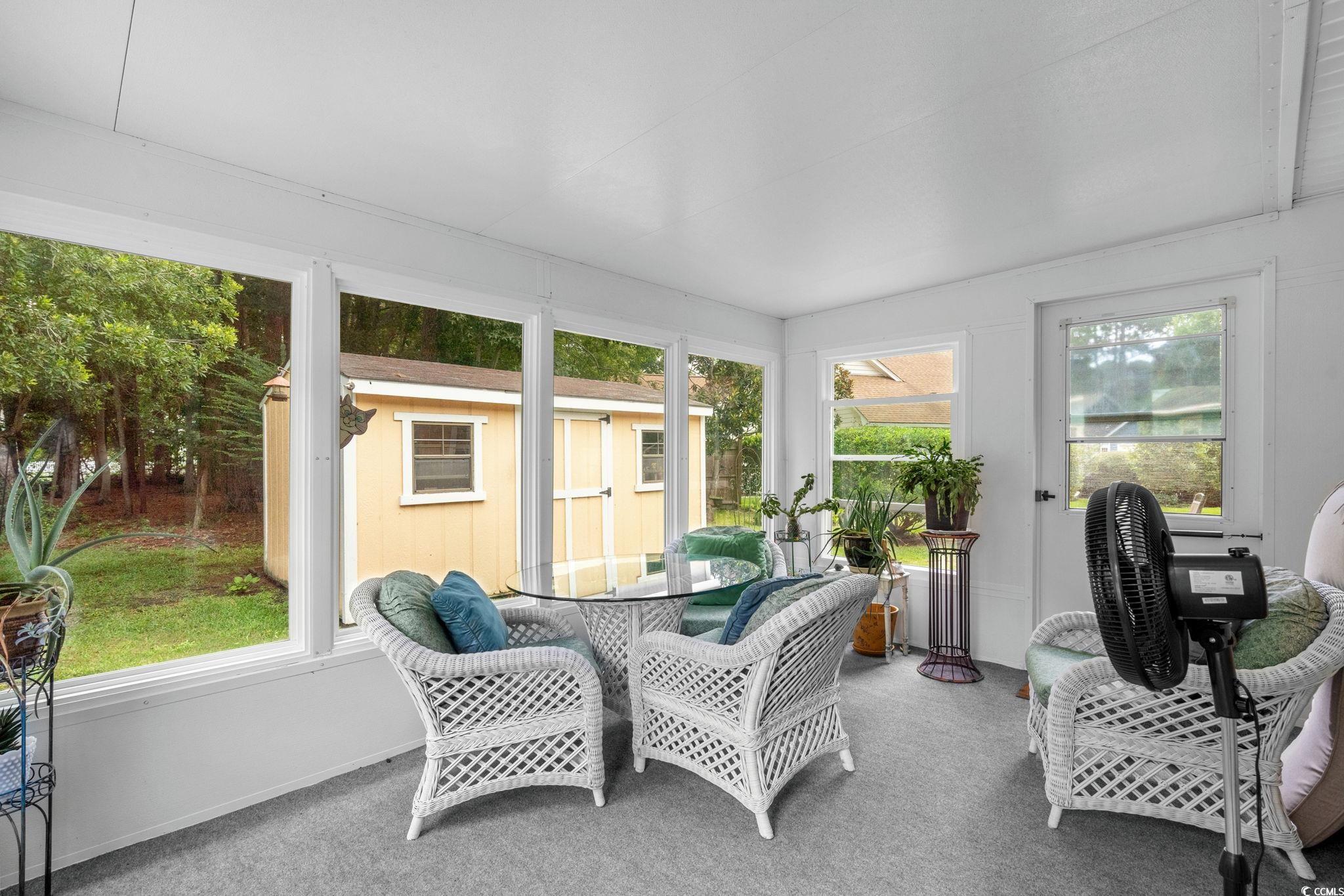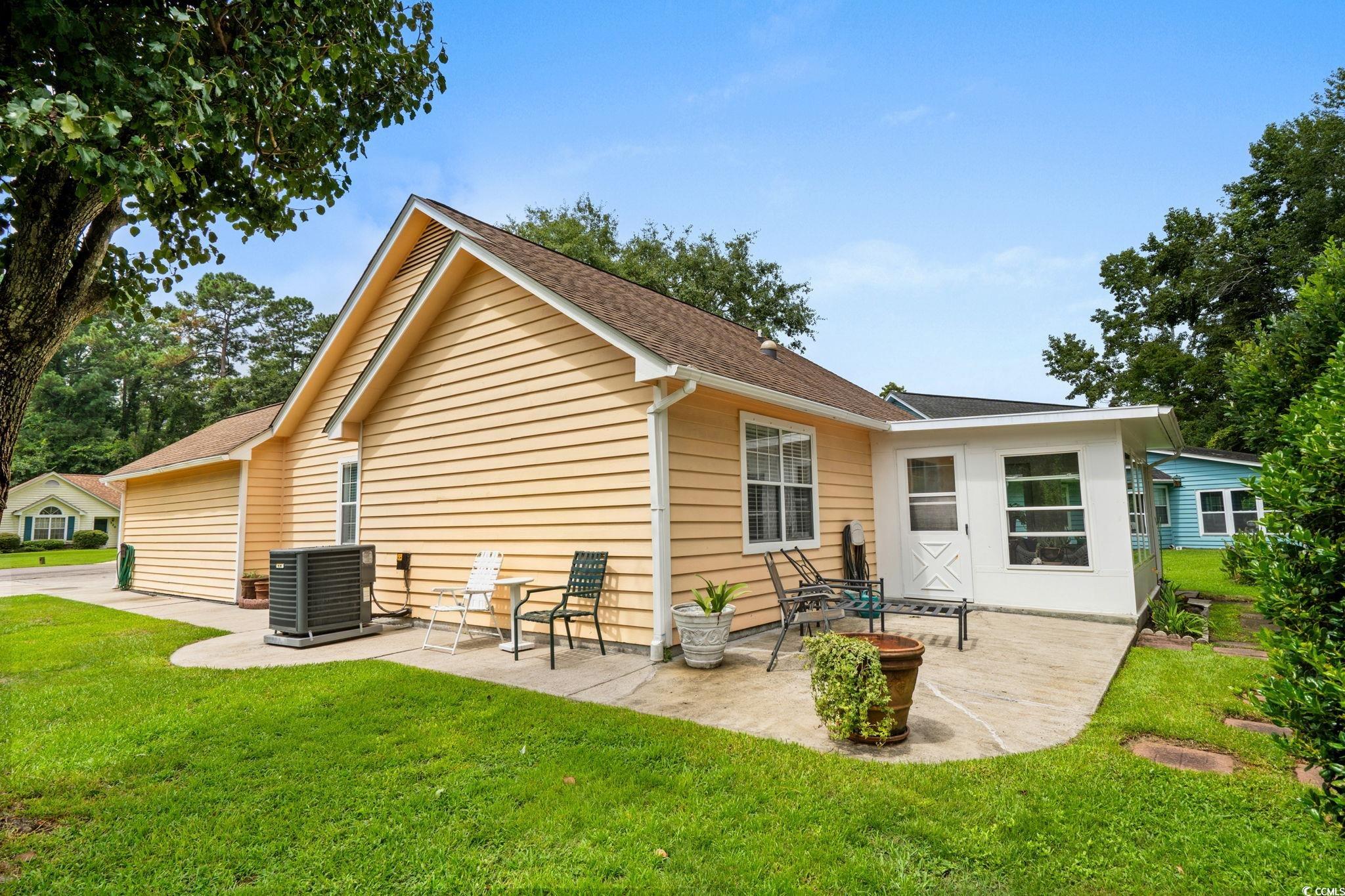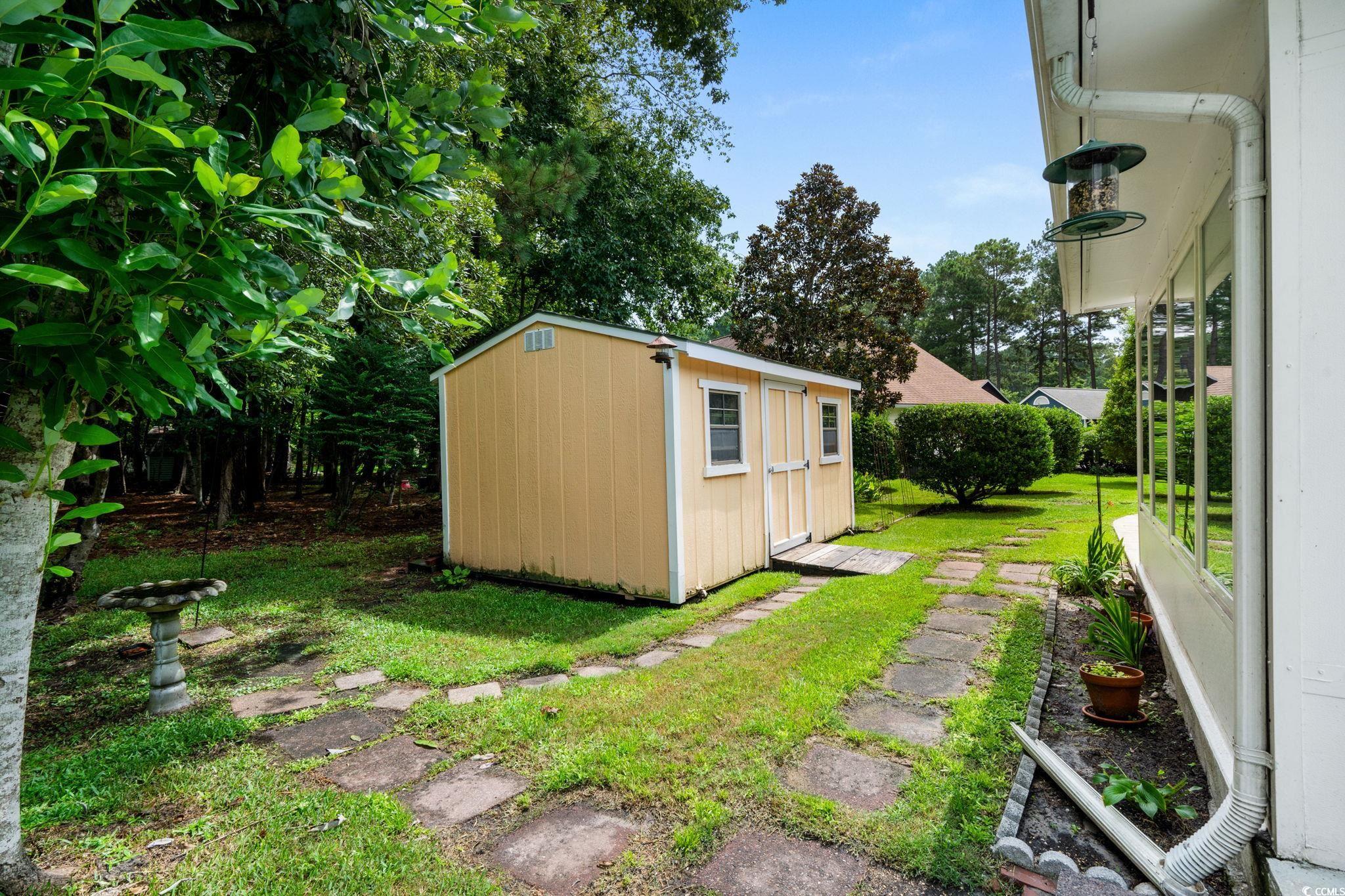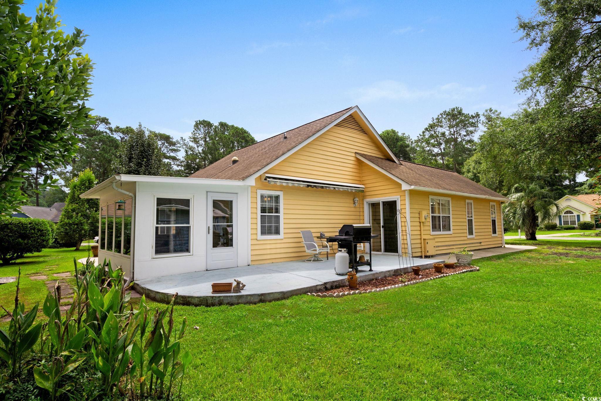 Charming coastal cottage in The Preserve, Little River! This cheerful 3BR/2BA home has a versatile third room thats perfect as a guest bedroom, home office, or den. A wide driveway and single-car garage welcome you home, while mature trees and a large, green yard create a peaceful setting. Inside, vaulted ceilings and an arched picture window flood the living area with natural light. Easy-care wood flooring carries through the open living/dining space to an efficient kitchen with granite counters, breakfast bar seating, and crisp white appliances. The primary suite features a roomy walk-in closet; a second bedroom and full bath are nearby, plus the flexible third room for whatever you need. Enjoy year-round living in the bright Carolina room overlooking the backyard, then step out to the extended patiocomplete with retractable awningfor effortless outdoor dining and grilling. A generous storage shed keeps tools, beach gear, or hobbies neatly tucked away, and the indoor laundry area offers extra shelving and cabinet space. The home also comes with the added bonus that is includes a whole home propane generator! Never worry about having the rigght power to keep things up and running! Tucked on a large lot in an established, tree-lined neighborhood, this home puts you minutes from marinas, golf, waterfront dining, and the beaches of the Grand Strand. Low-maintenance exterior, comfortable layout, and terrific outdoor spaceseverything you want for relaxed coastal living in Little River.