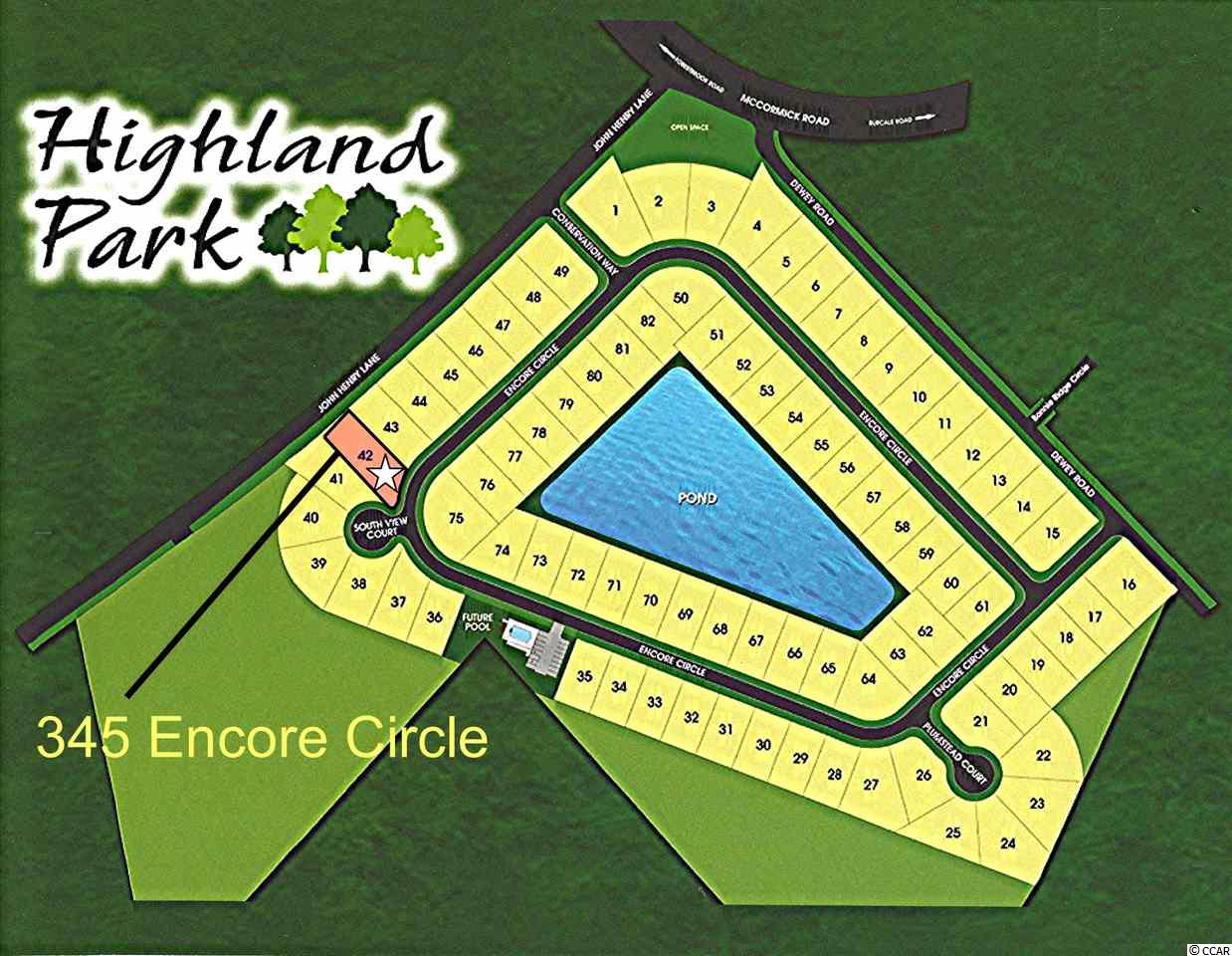Highland Park is not on most maps at this time but Encore Circle is in most GPS coordinates. From Forestbrook Road turn on to McCormick Rd. Turn right on to John Henry Rd then the first left on to Conservation Way. Go right at the stop sign on to Encore Circle. 8th house on the right.Courtesy of Exit Coastal Real Estate Pros